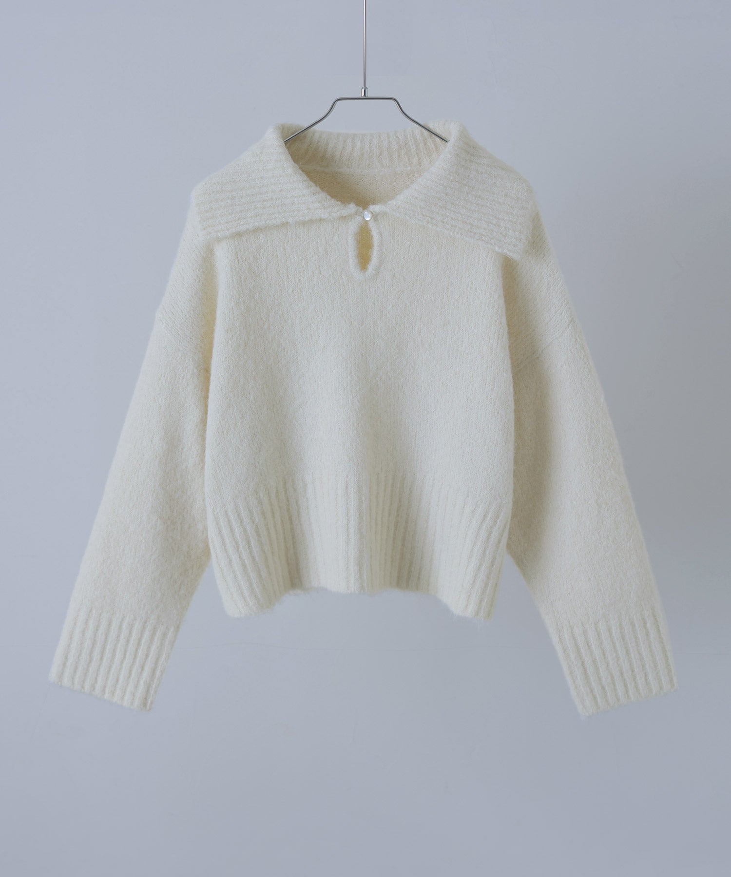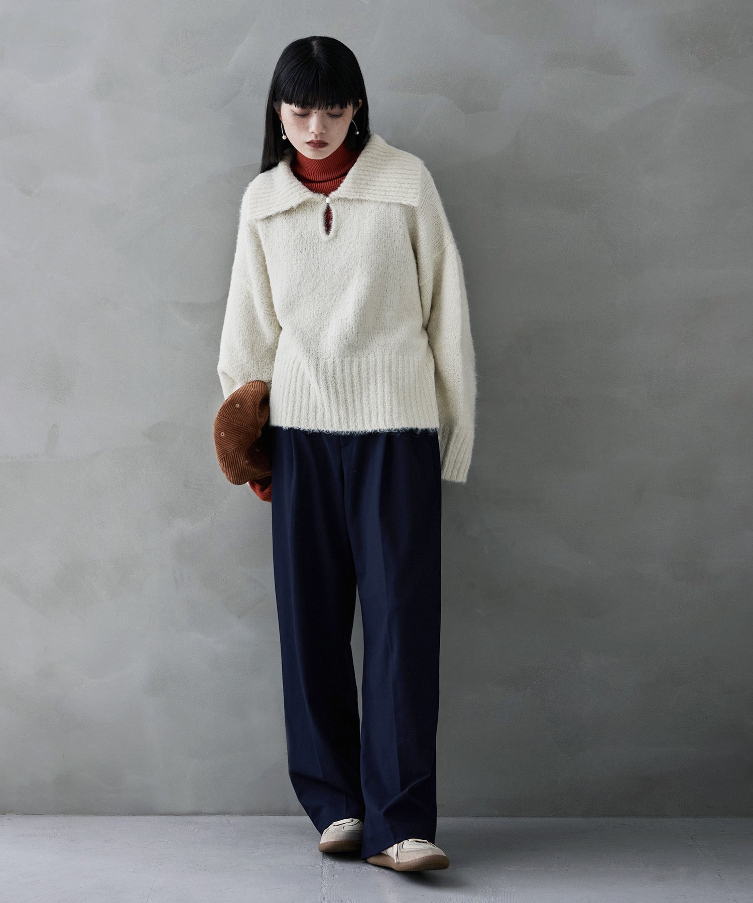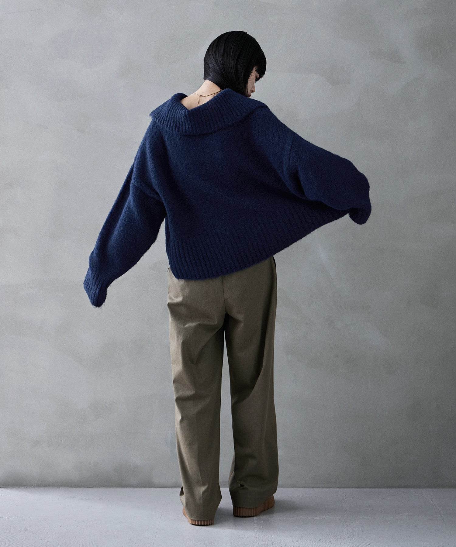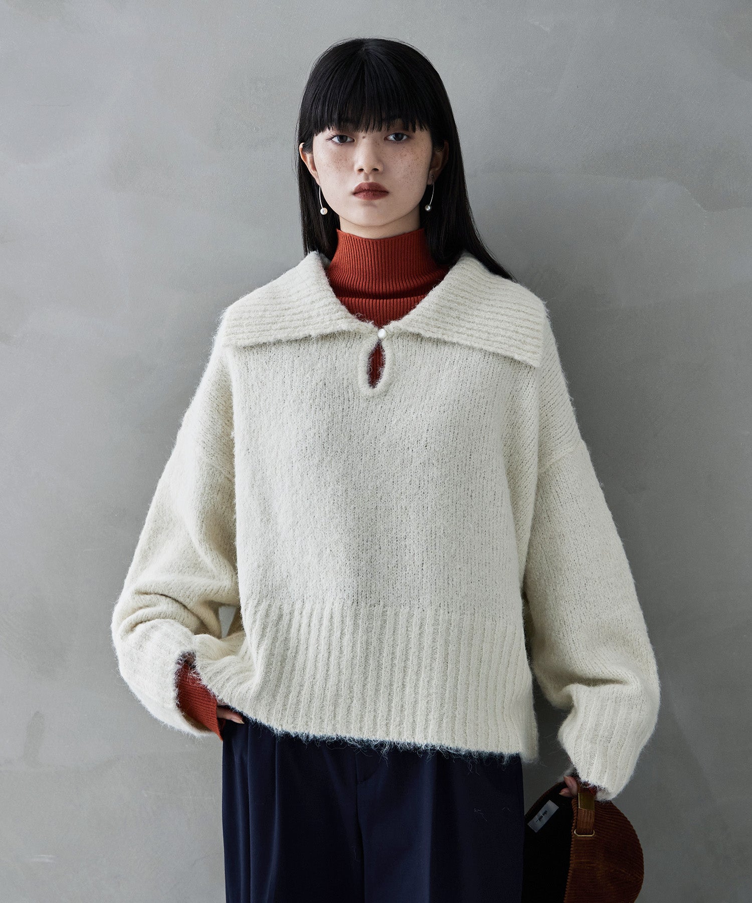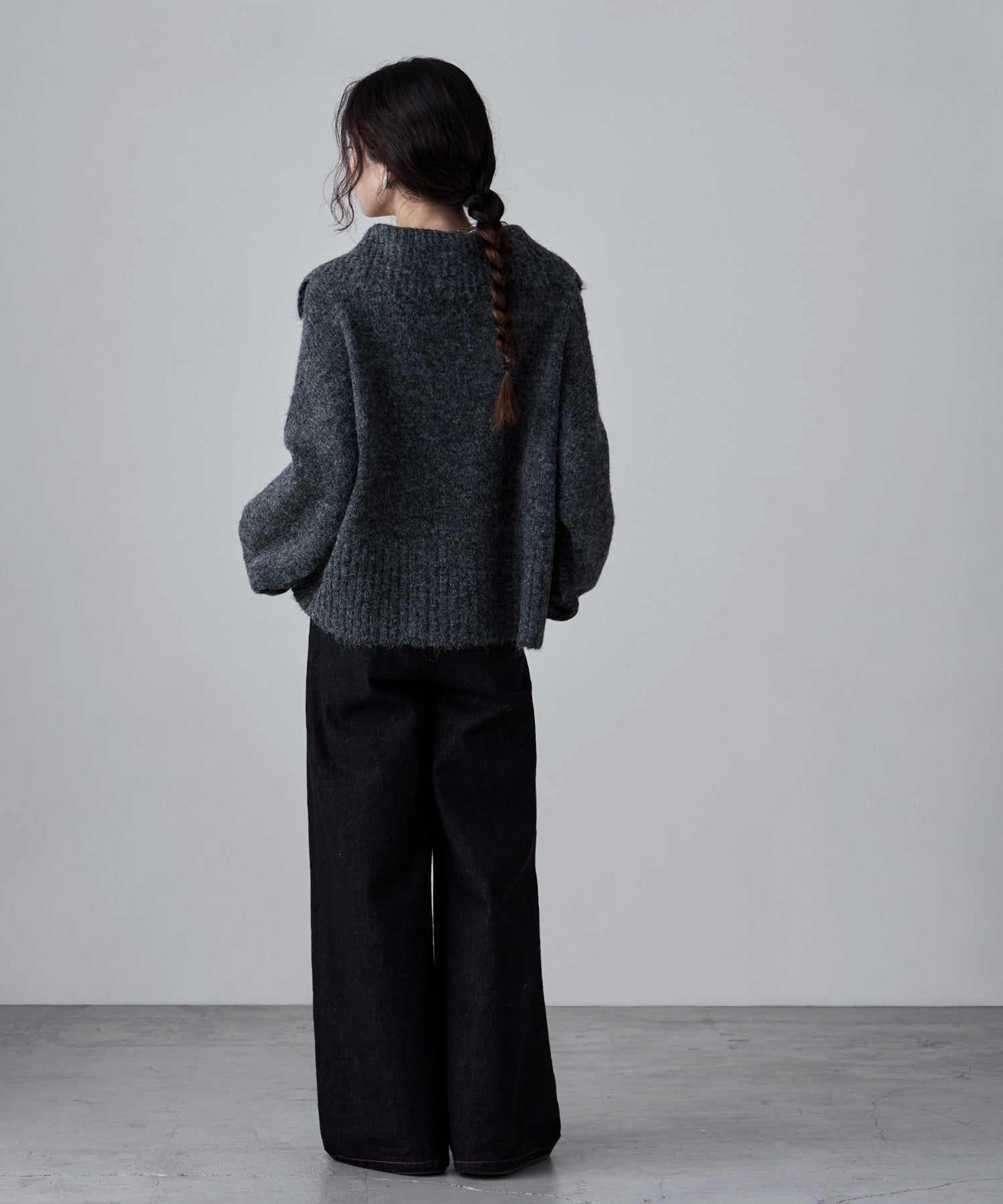 Rname アルパカタッチビッグカラーニット トップス ニット セーター 長袖 ウール混 プルオーバー リブニット セーラーカラー ウールミックス 起毛 ミドル丈 ワイドスリーブ ビッグシルエット ゆったり レイヤード 重ね着 オーバーサイズ 無地