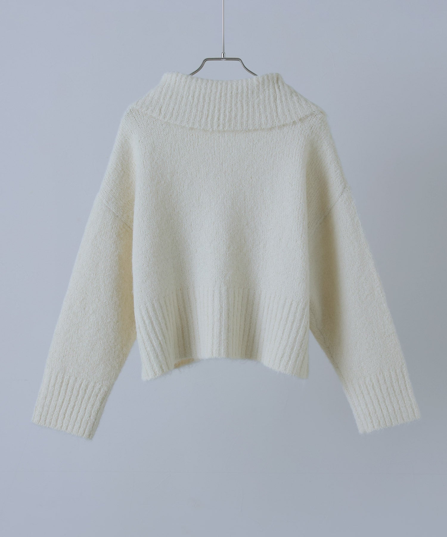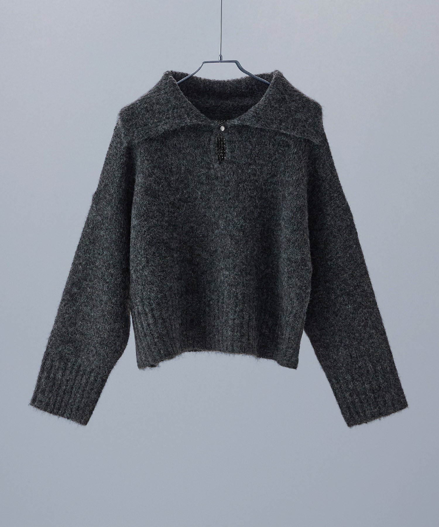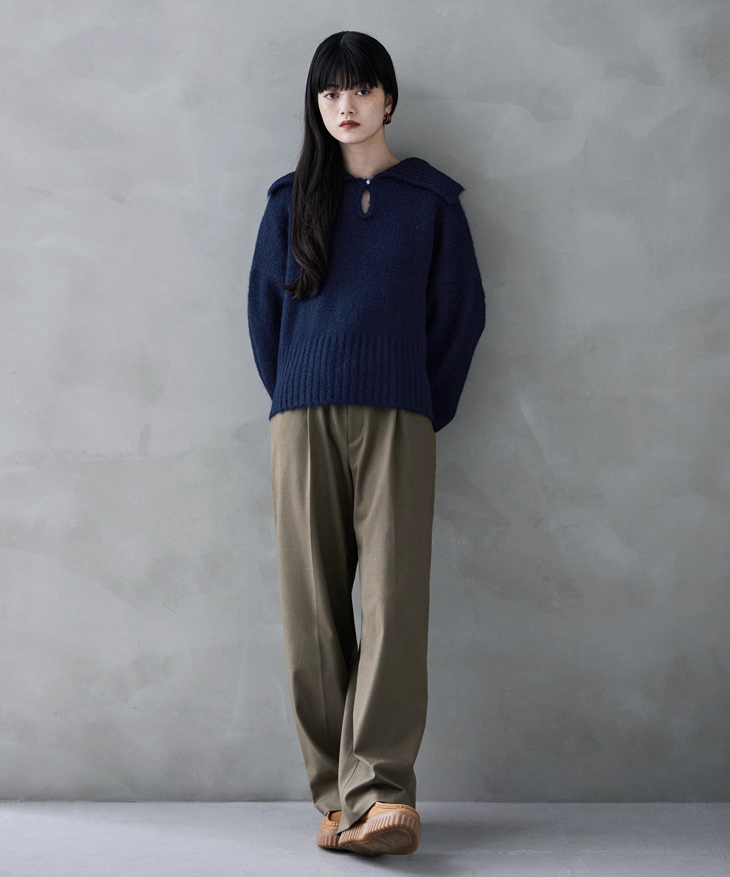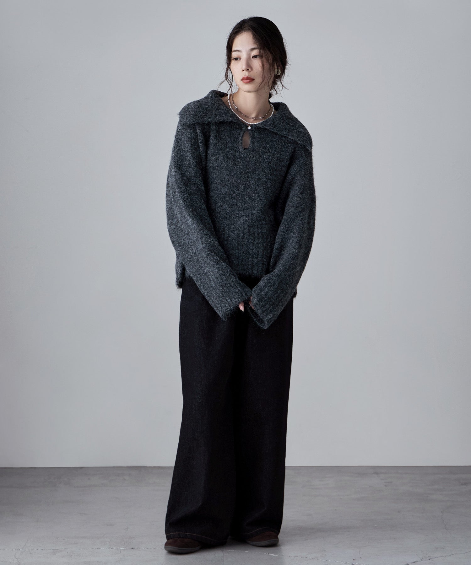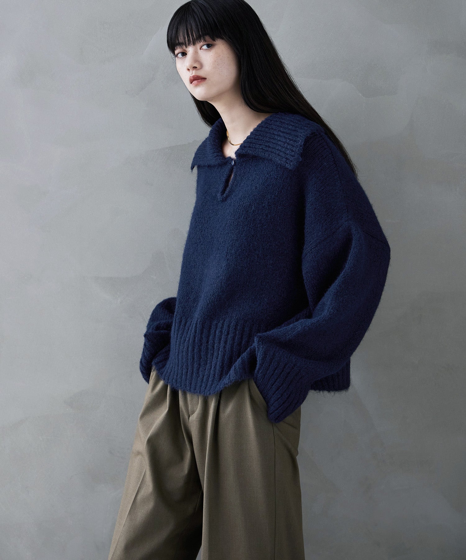 Rname アルパカタッチビッグカラーニット トップス ニット セーター 長袖 ウール混 プルオーバー リブニット セーラーカラー ウールミックス 起毛 ミドル丈 ワイドスリーブ ビッグシルエット ゆったり レイヤード 重ね着 オーバーサイズ 無地