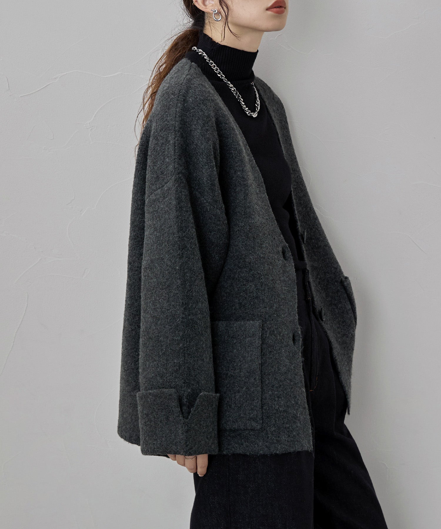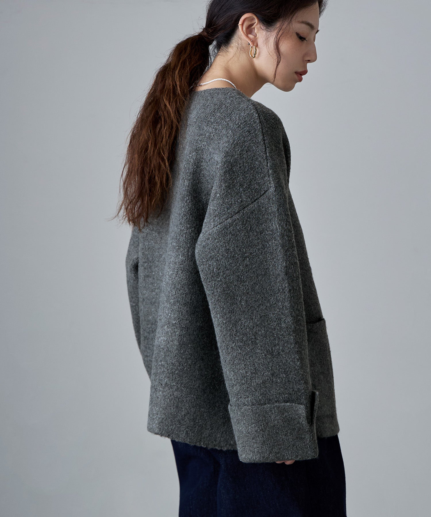安心感のあるほどよい厚みのため、気軽に羽織れるノーカラージャケットとしても◎。