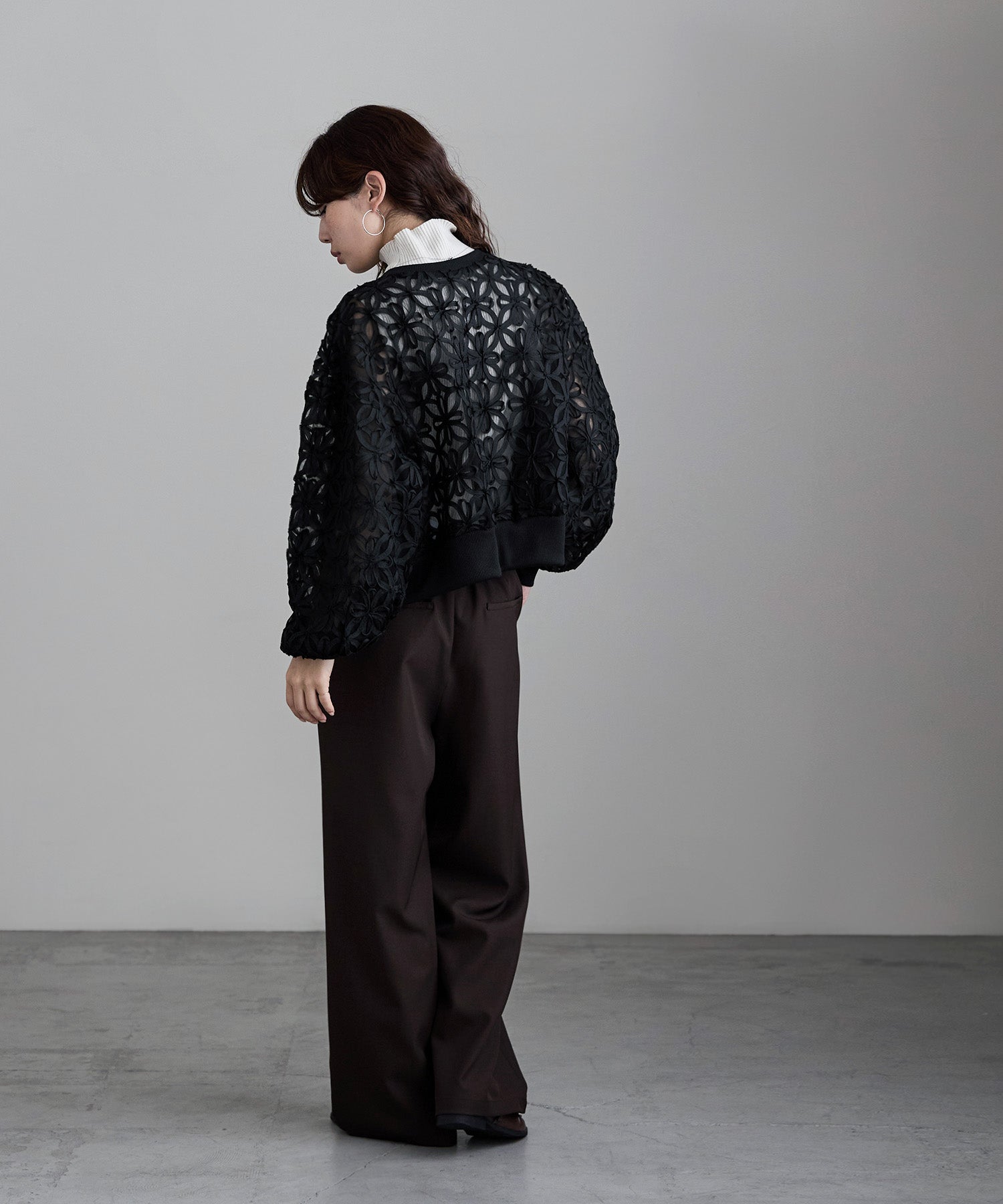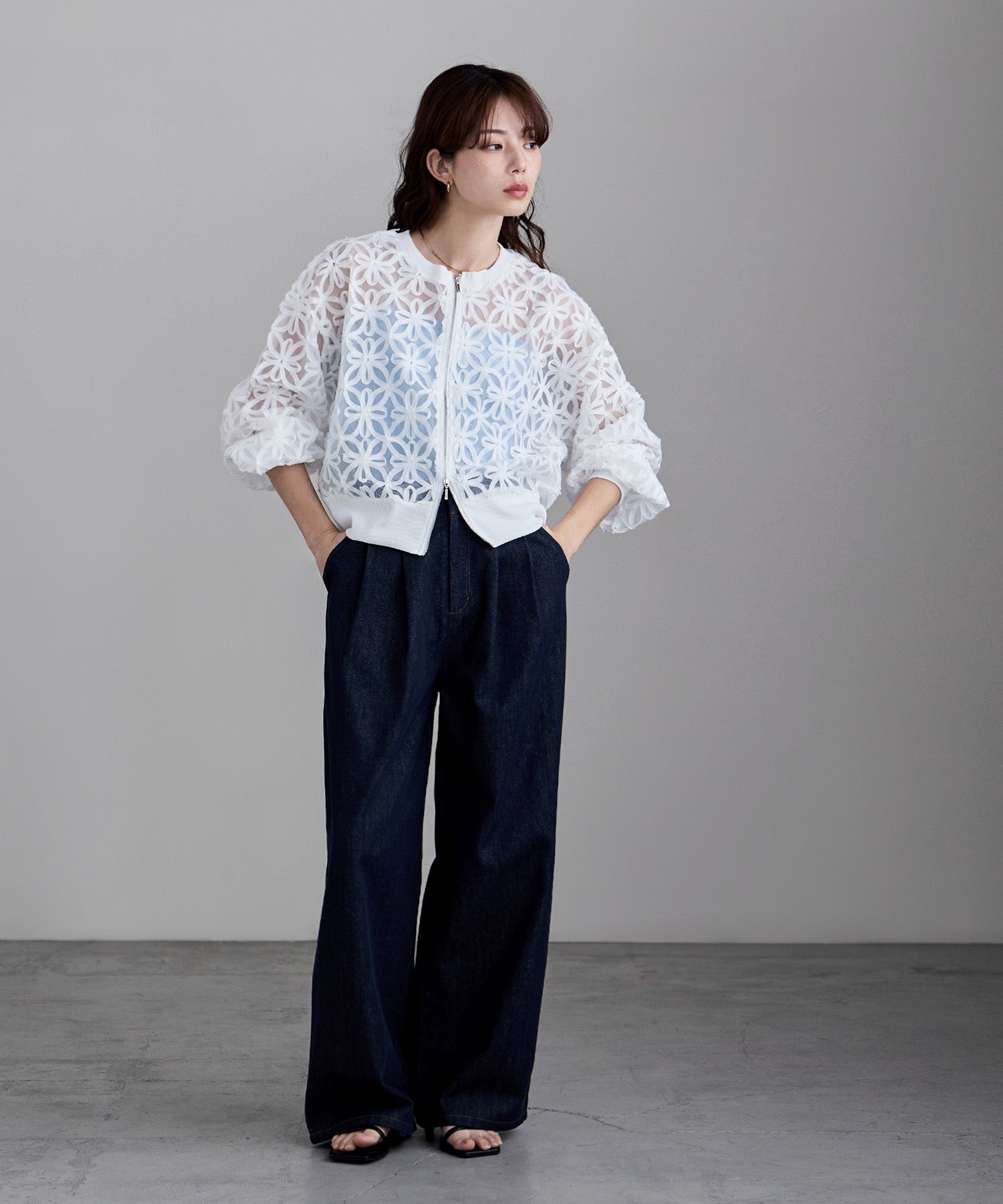 インナーを透けさせて着る、肌感たっぷりな長袖は季節の変わり目にもおすすめなライトアウターです。