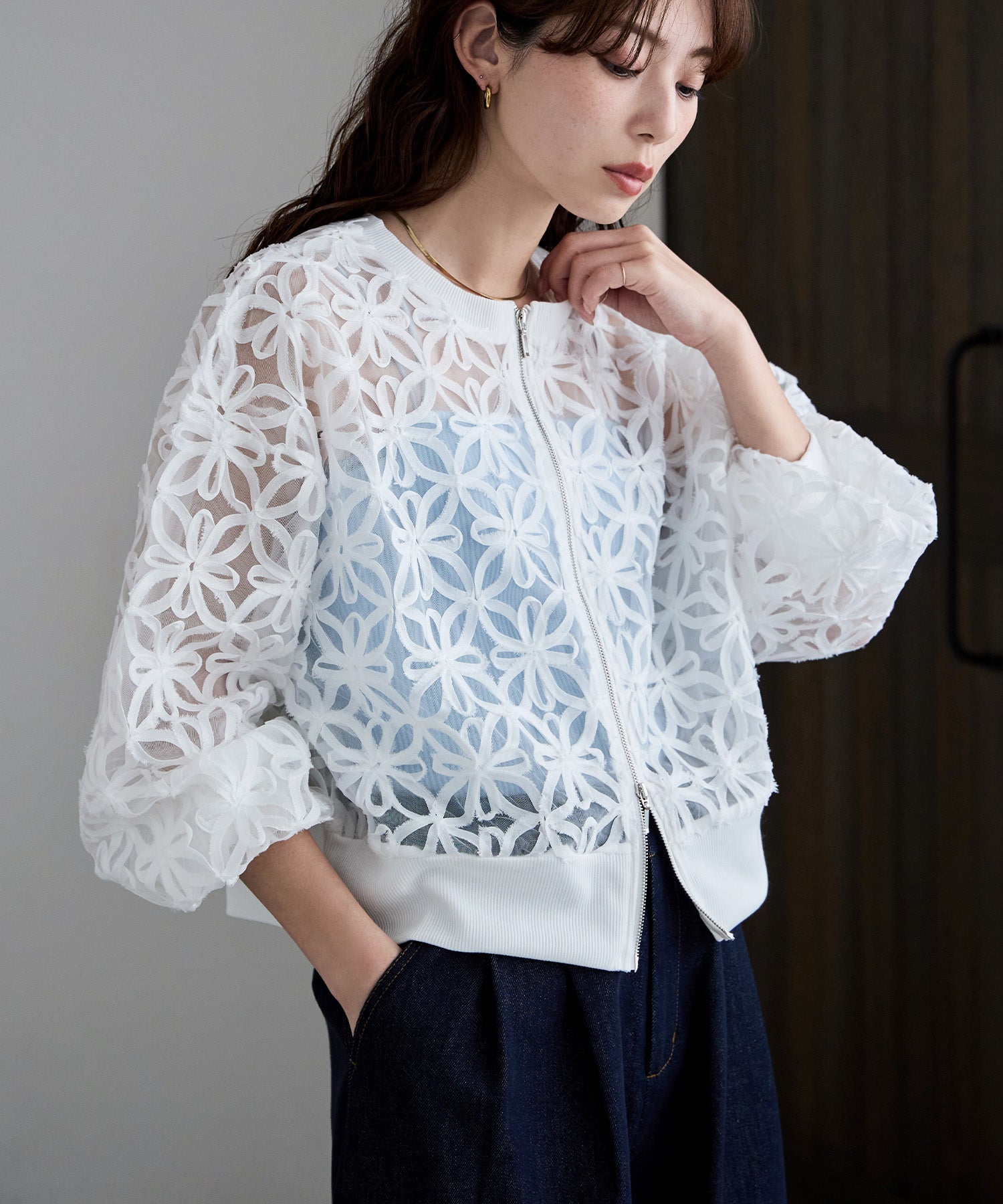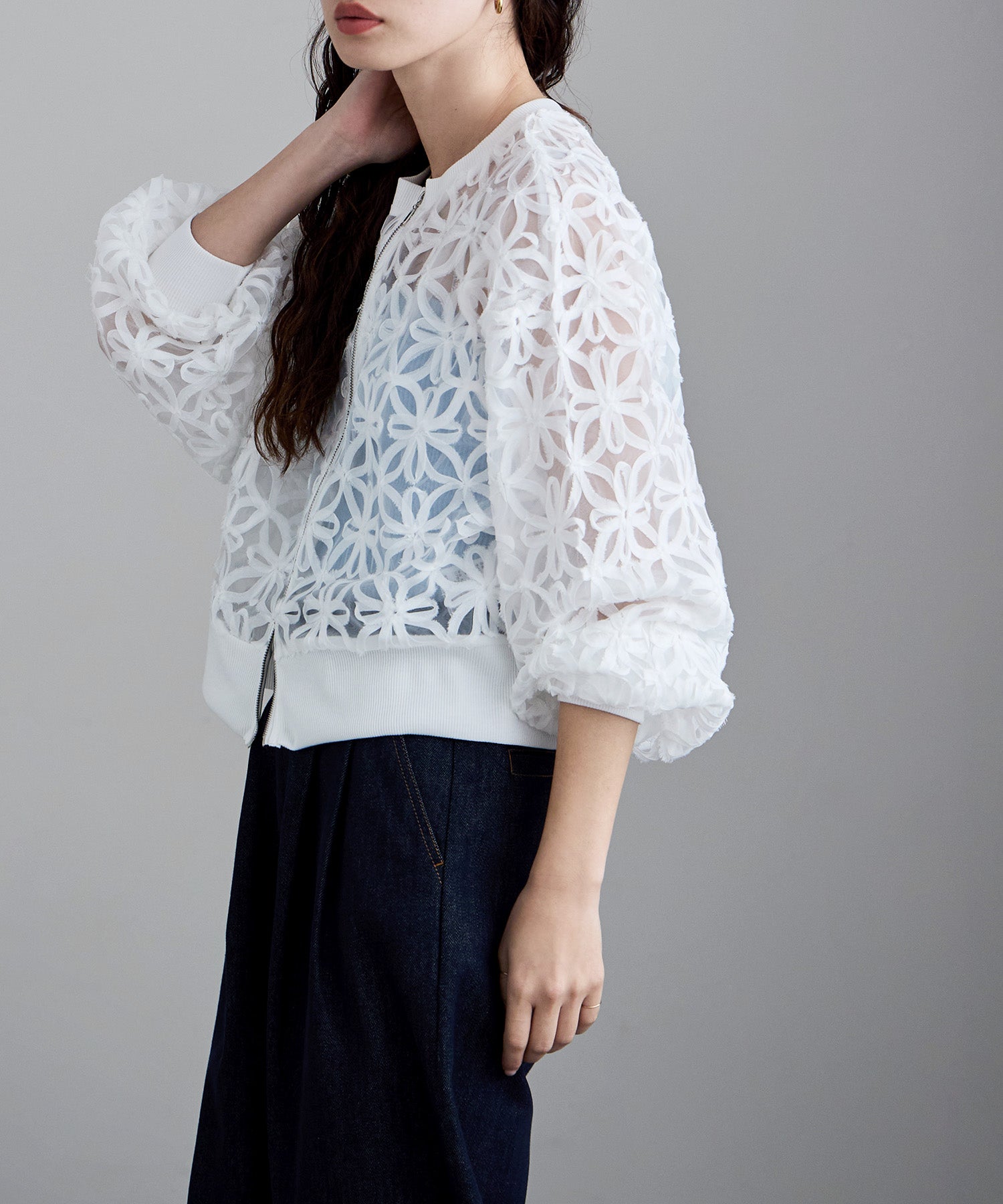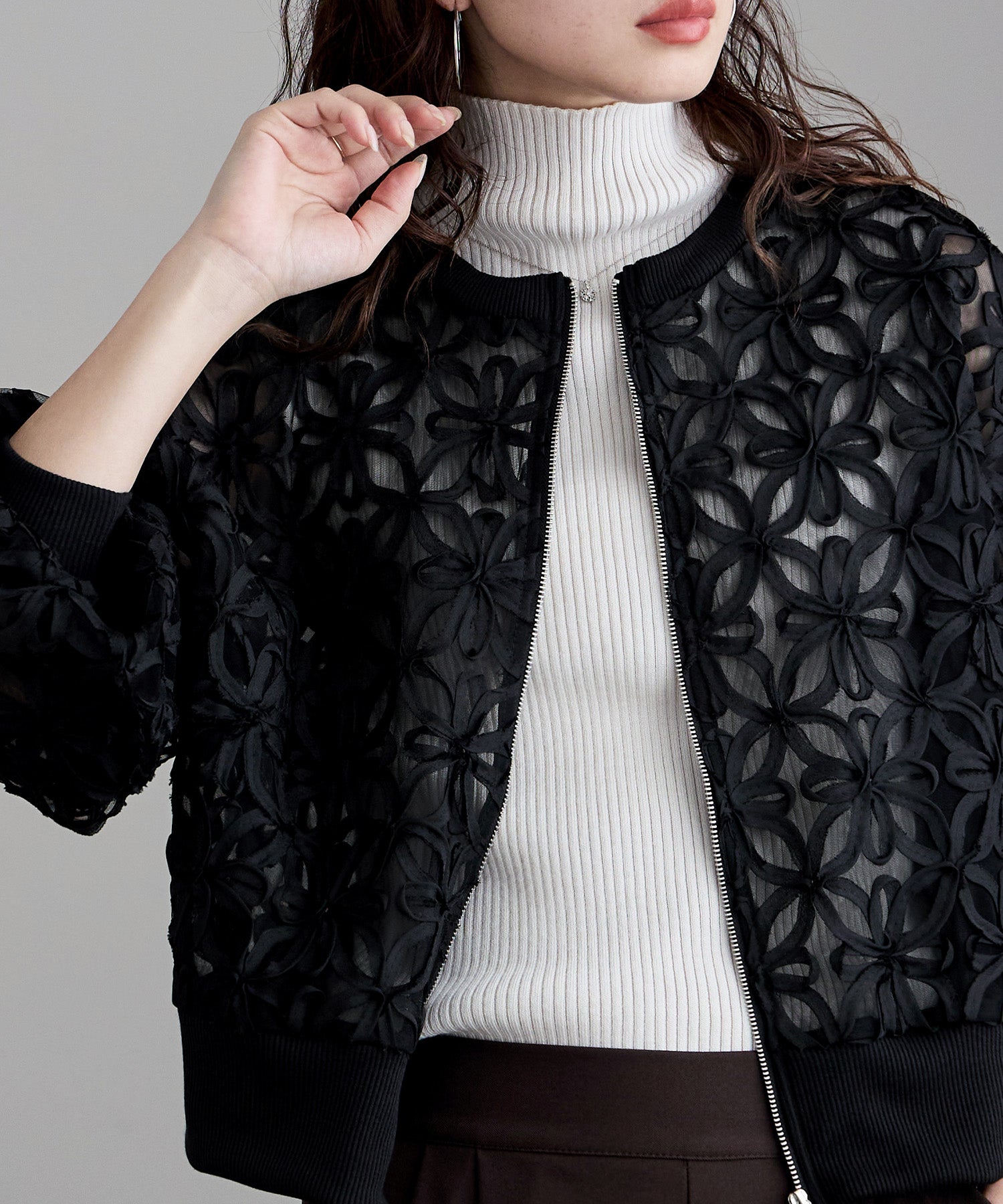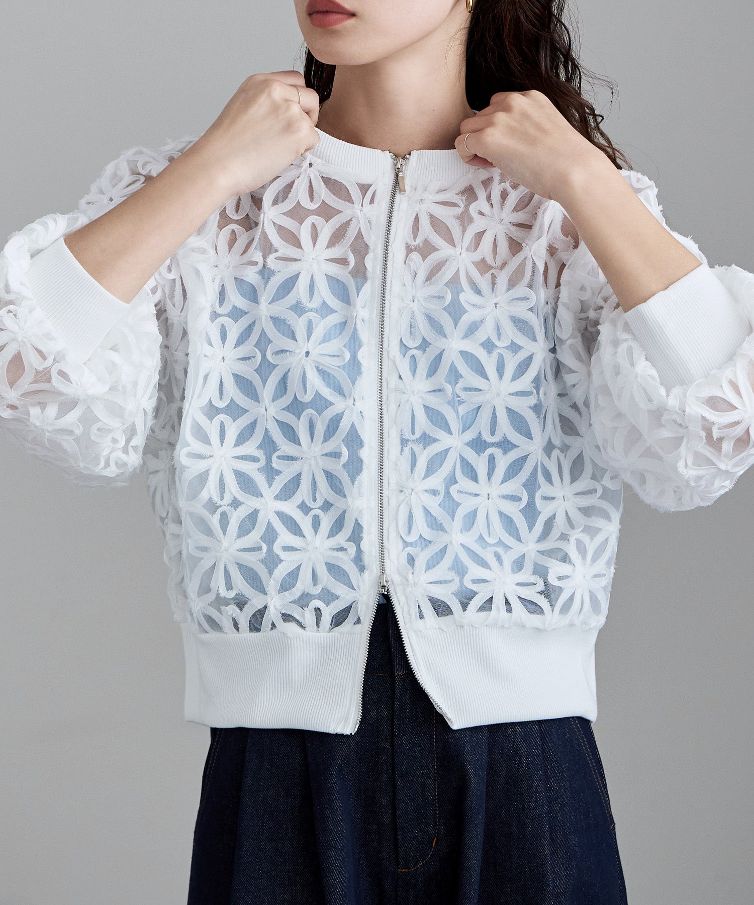 軽やかなチュール素材のダブルジップブルゾン。