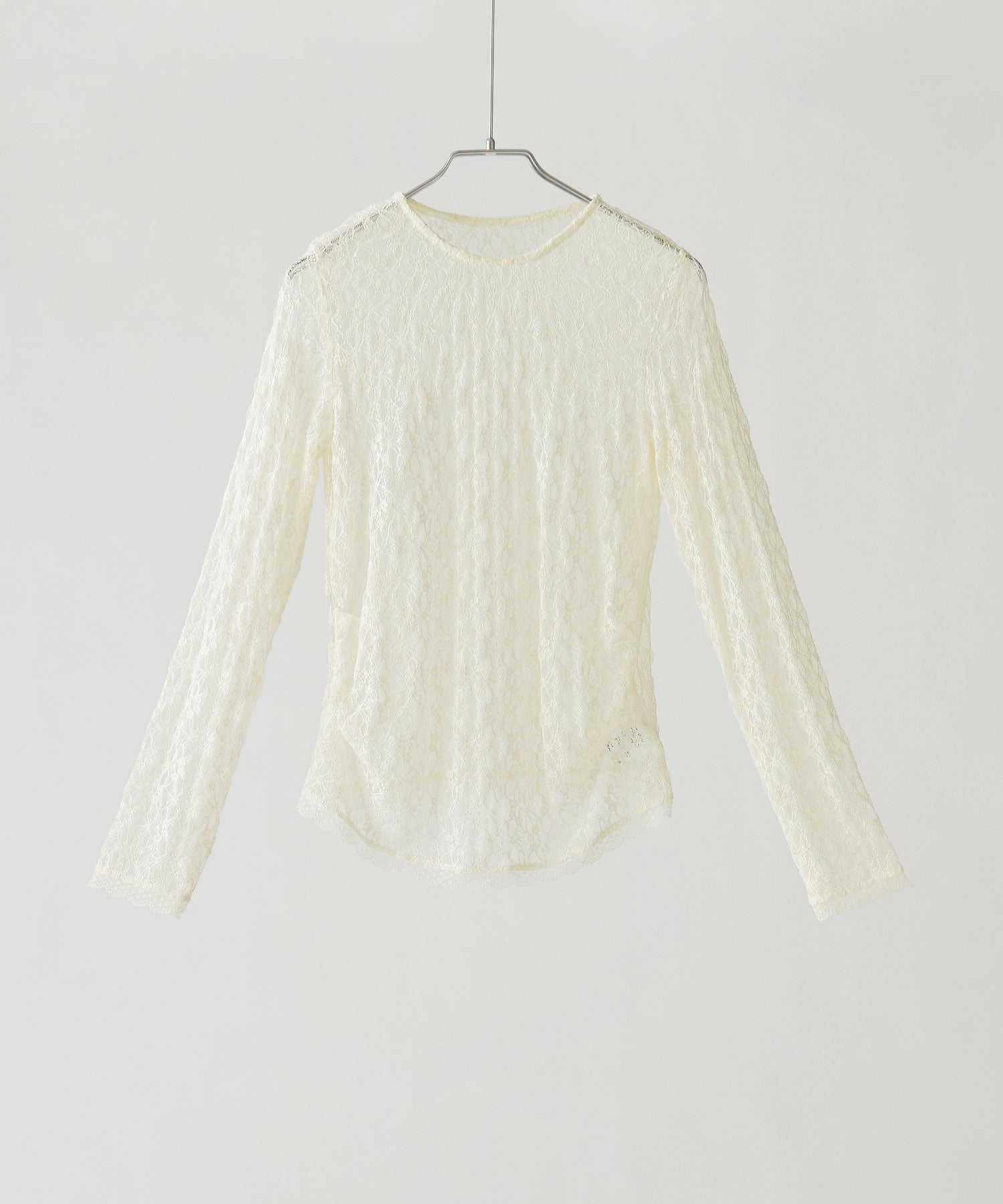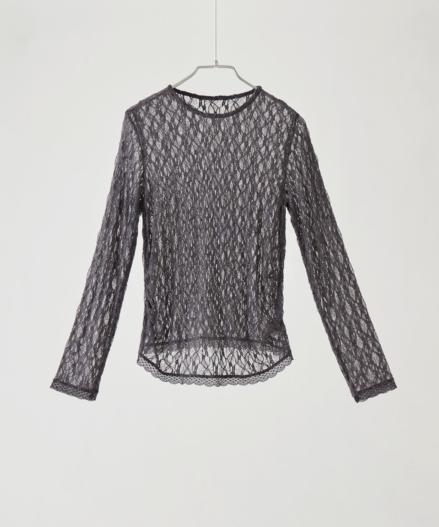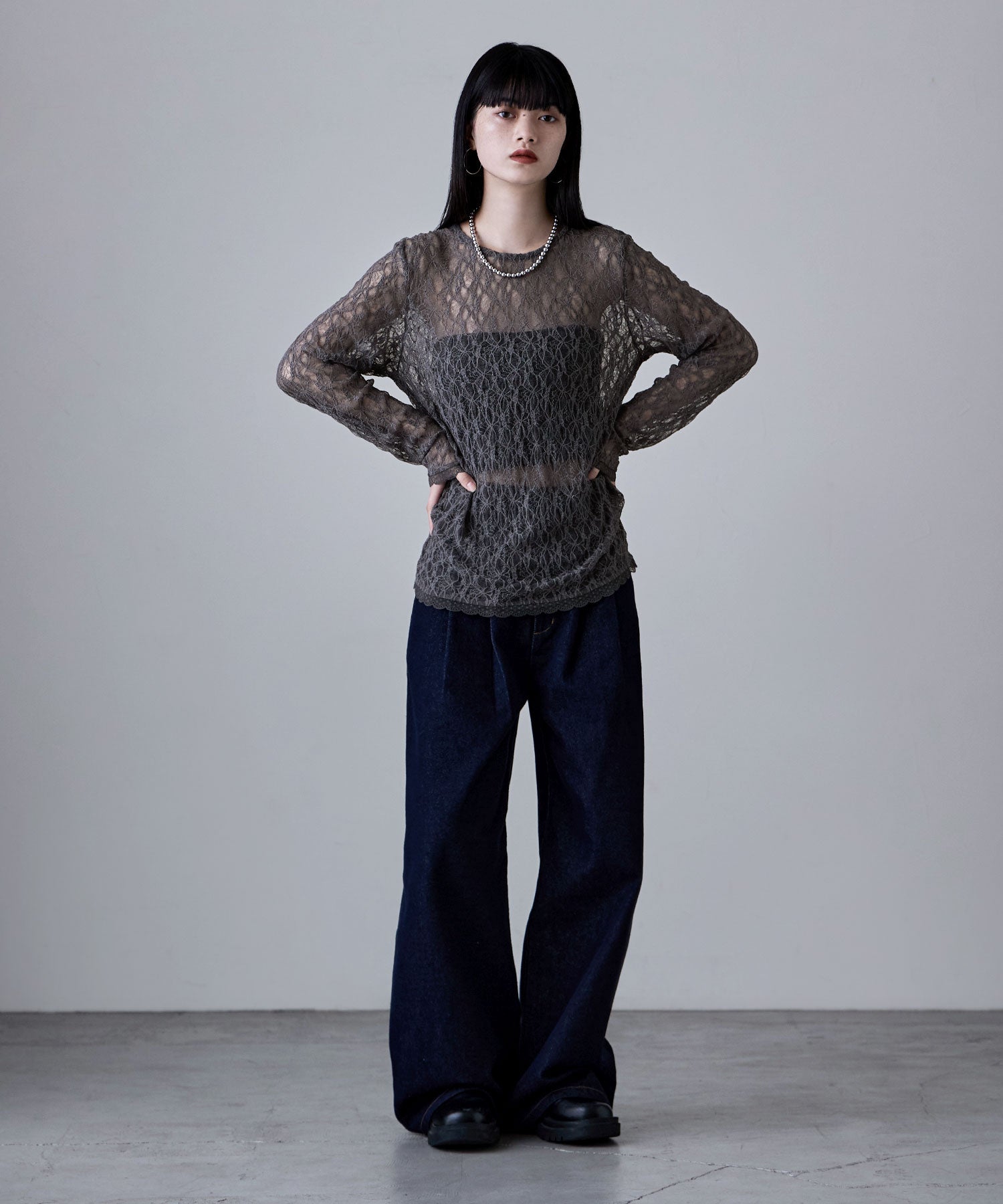 Rname レースサイドタックドレープトップス トップス カットソー 長袖 プルオーバー レース タック インナー シアー クルーネック 肌見せ 花柄 レイヤード