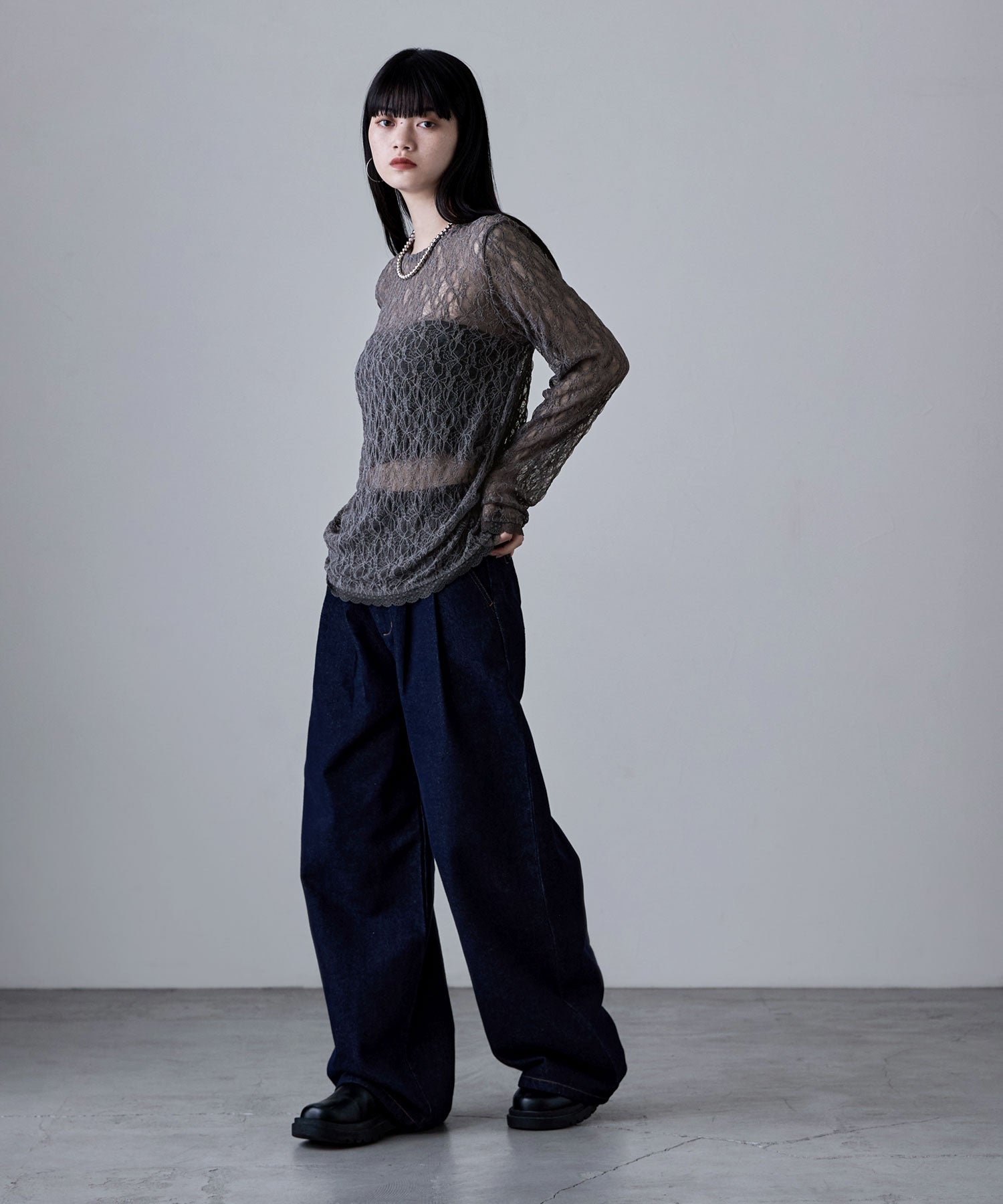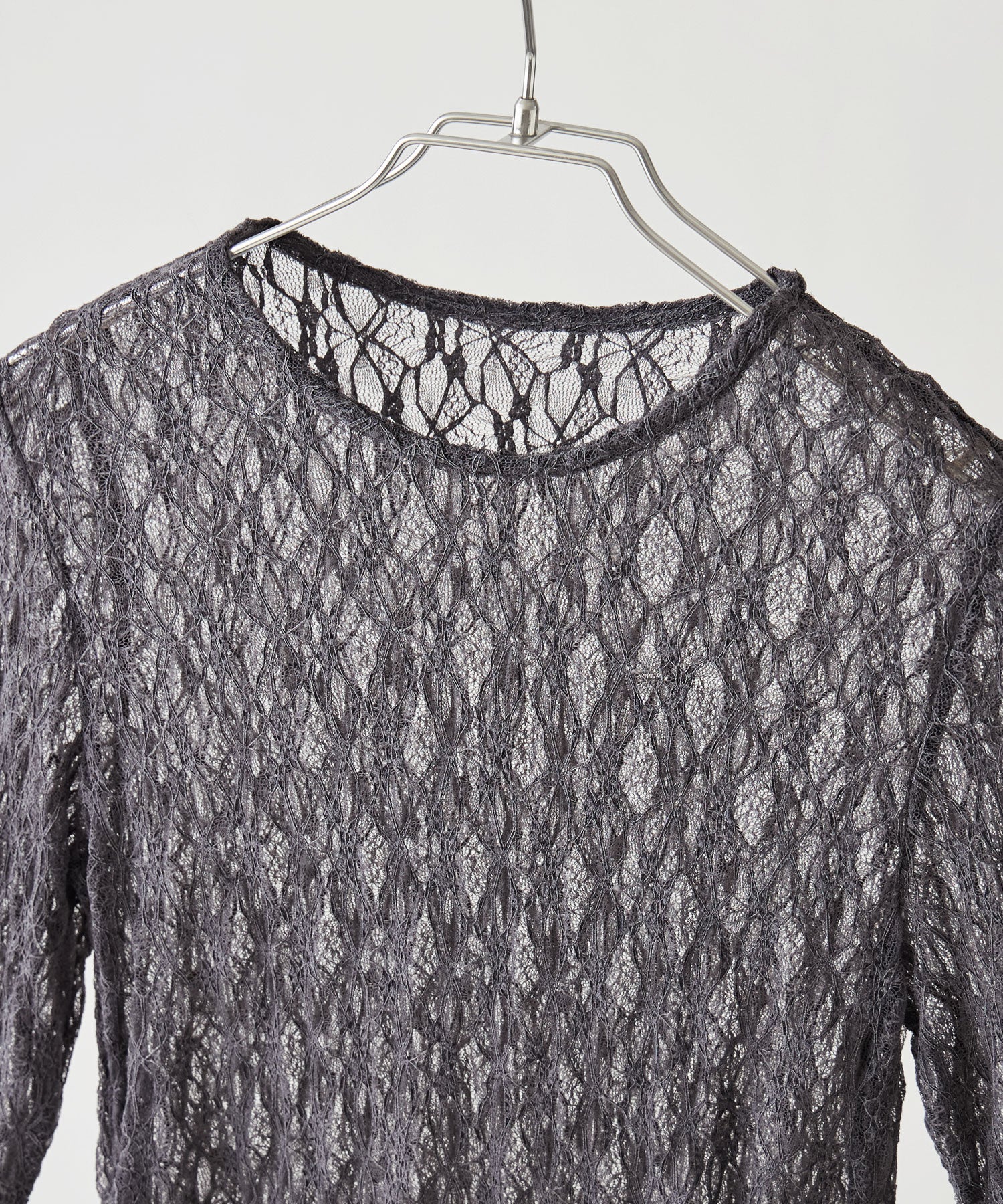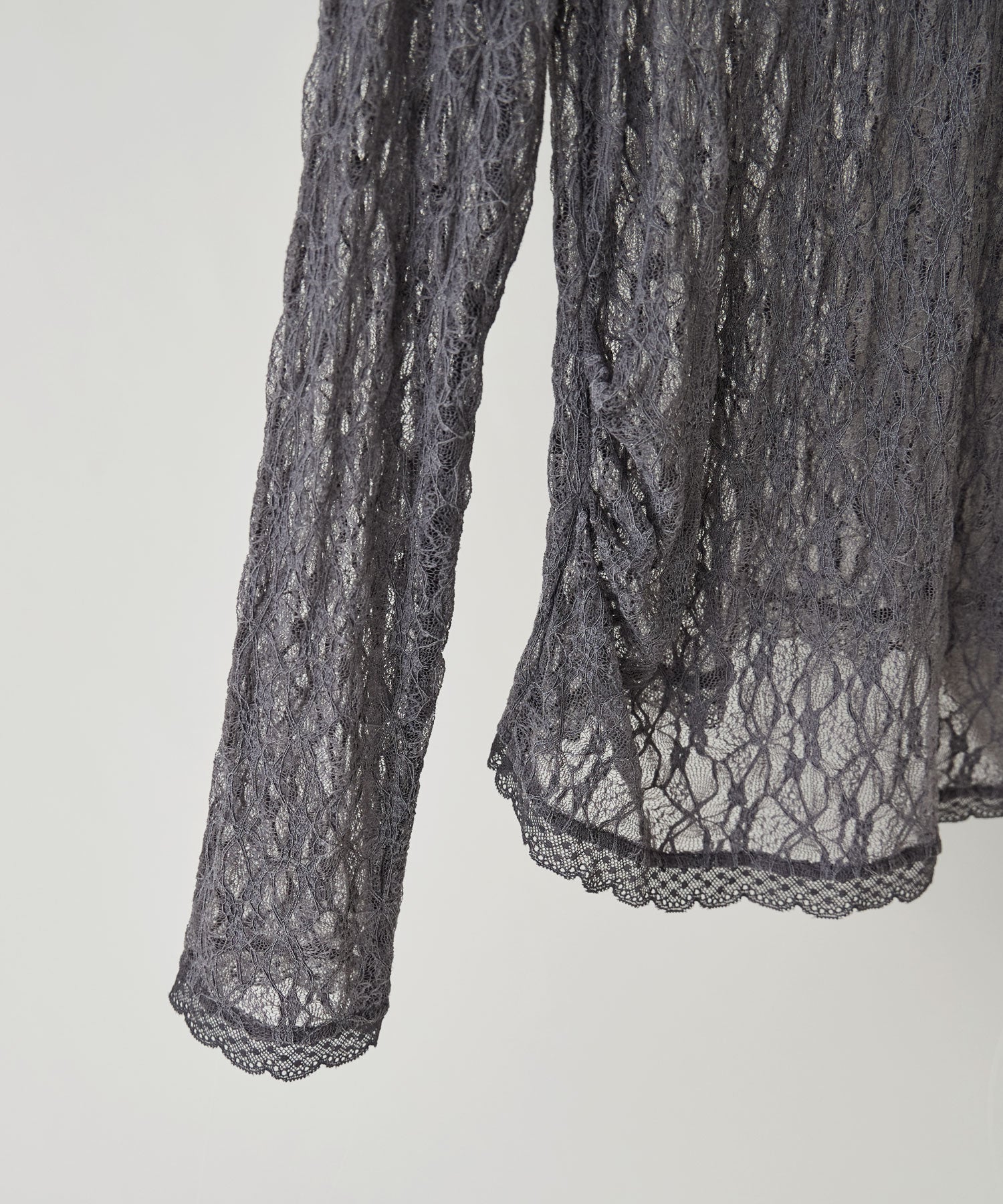 Rname レースサイドタックドレープトップス トップス カットソー 長袖 プルオーバー レース タック インナー シアー クルーネック 肌見せ 花柄 レイヤード