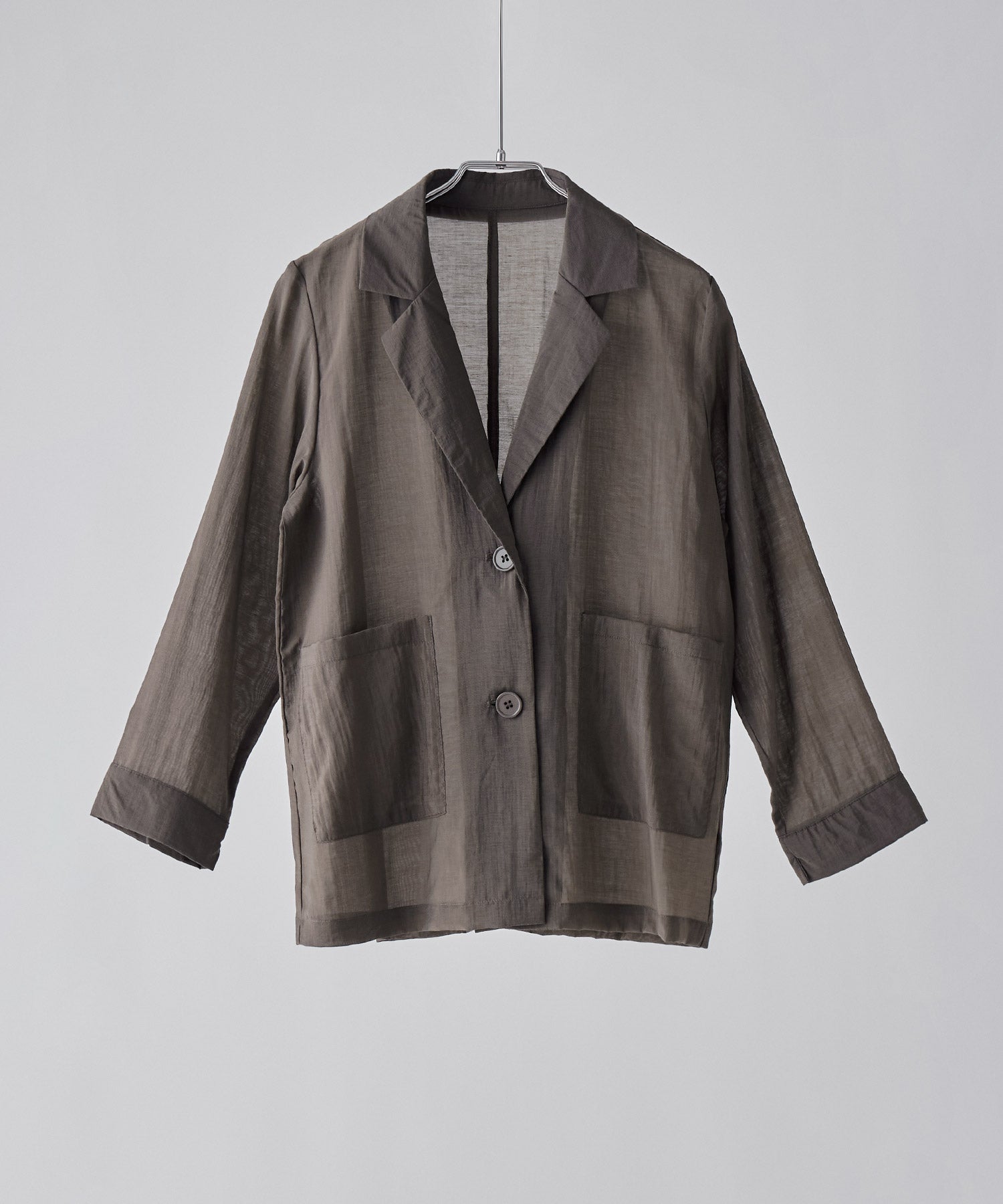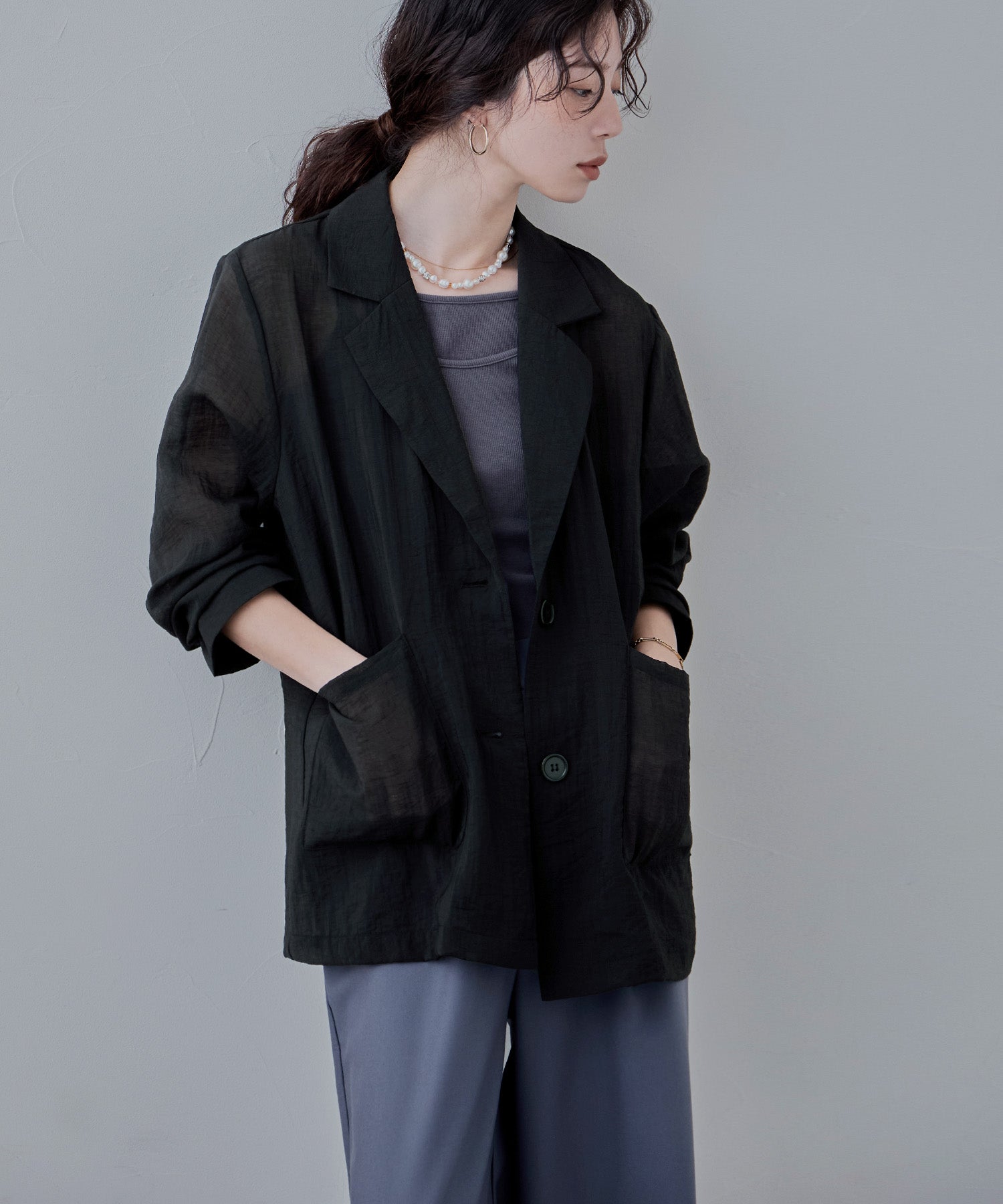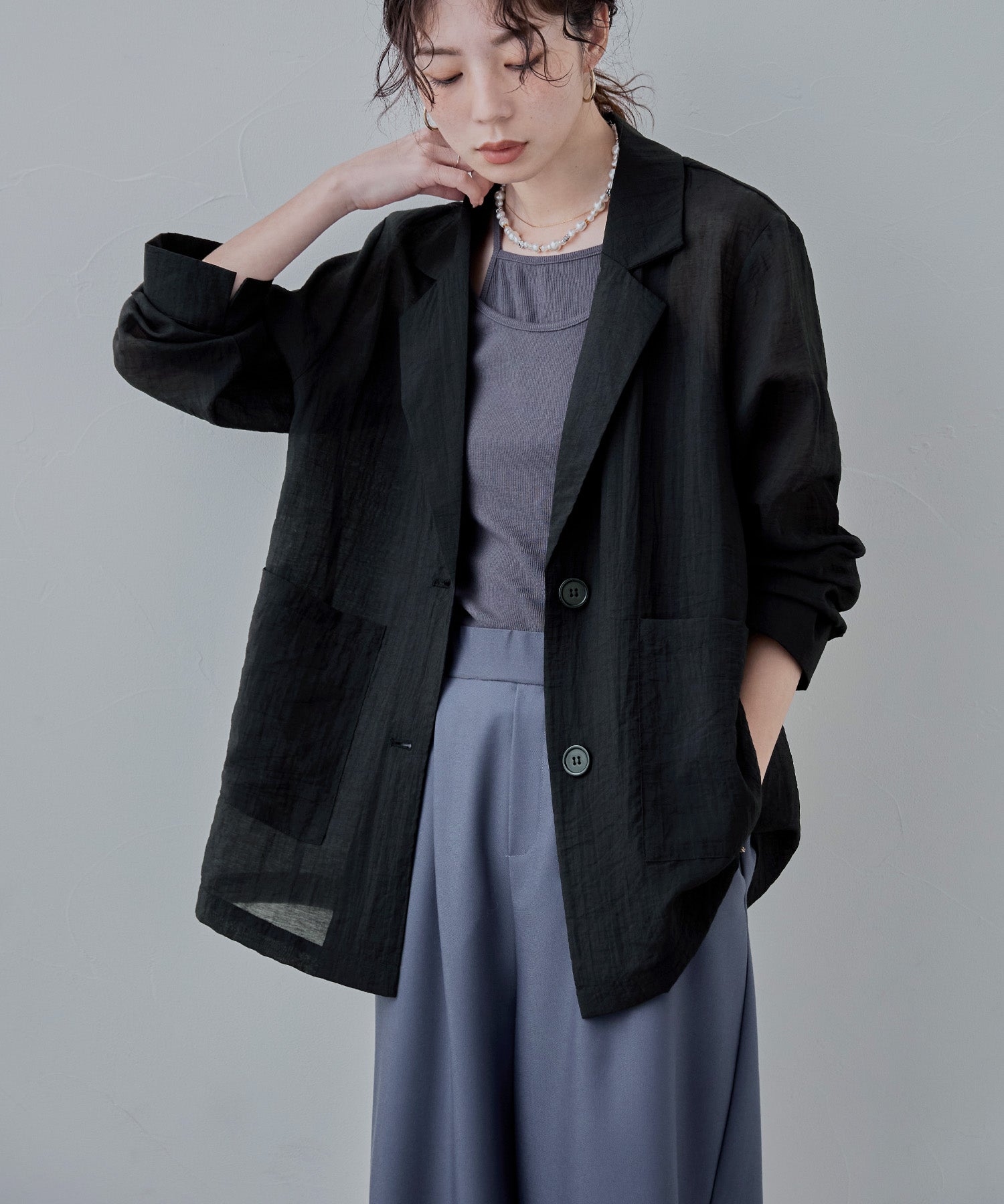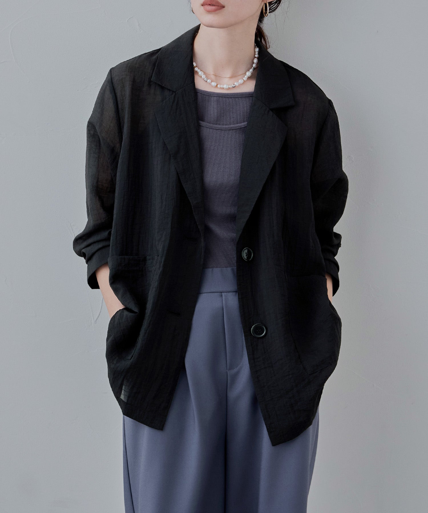 シアー素材で軽やかに、シャツ感覚で着られるシングルテーラードジャケット。