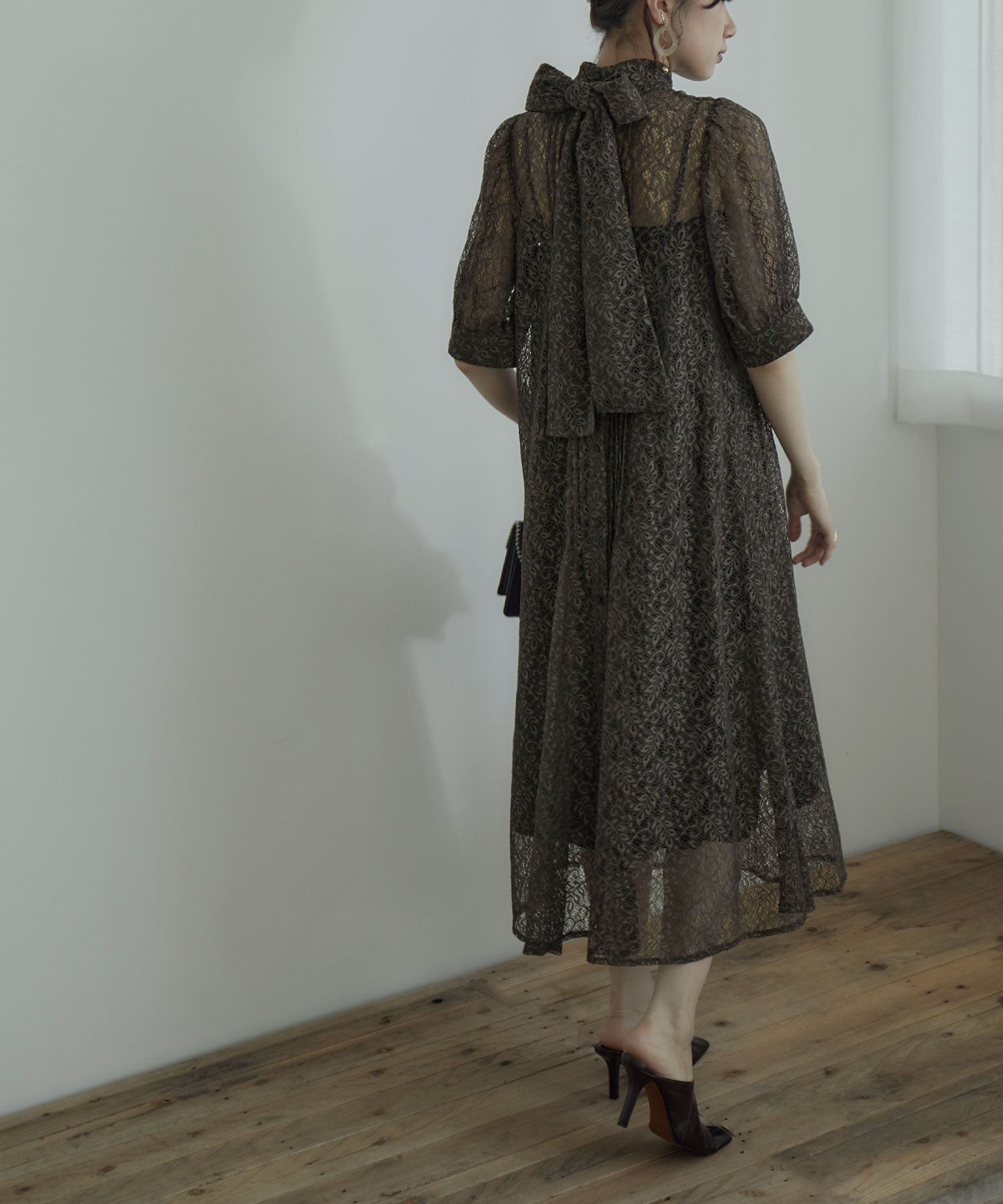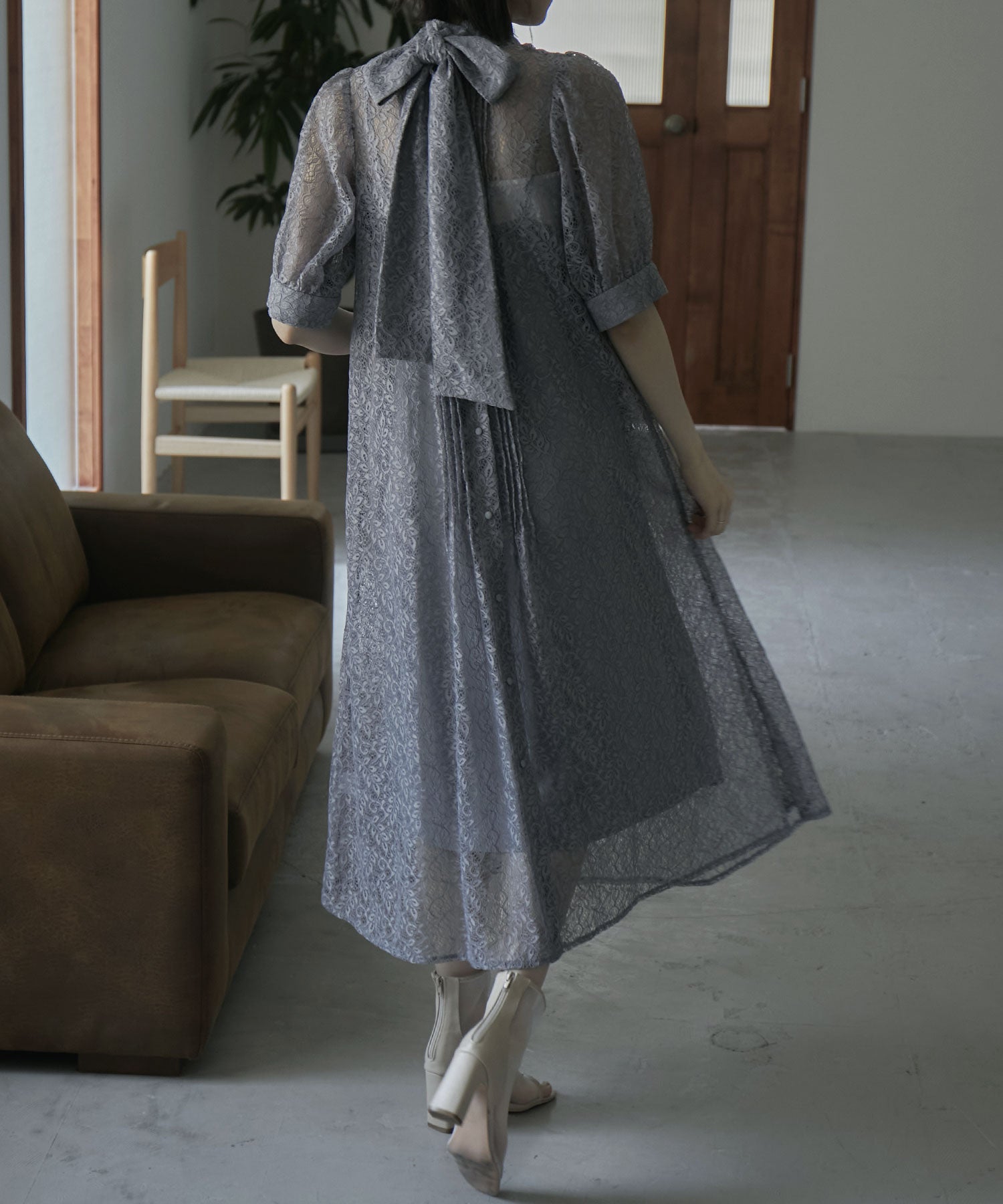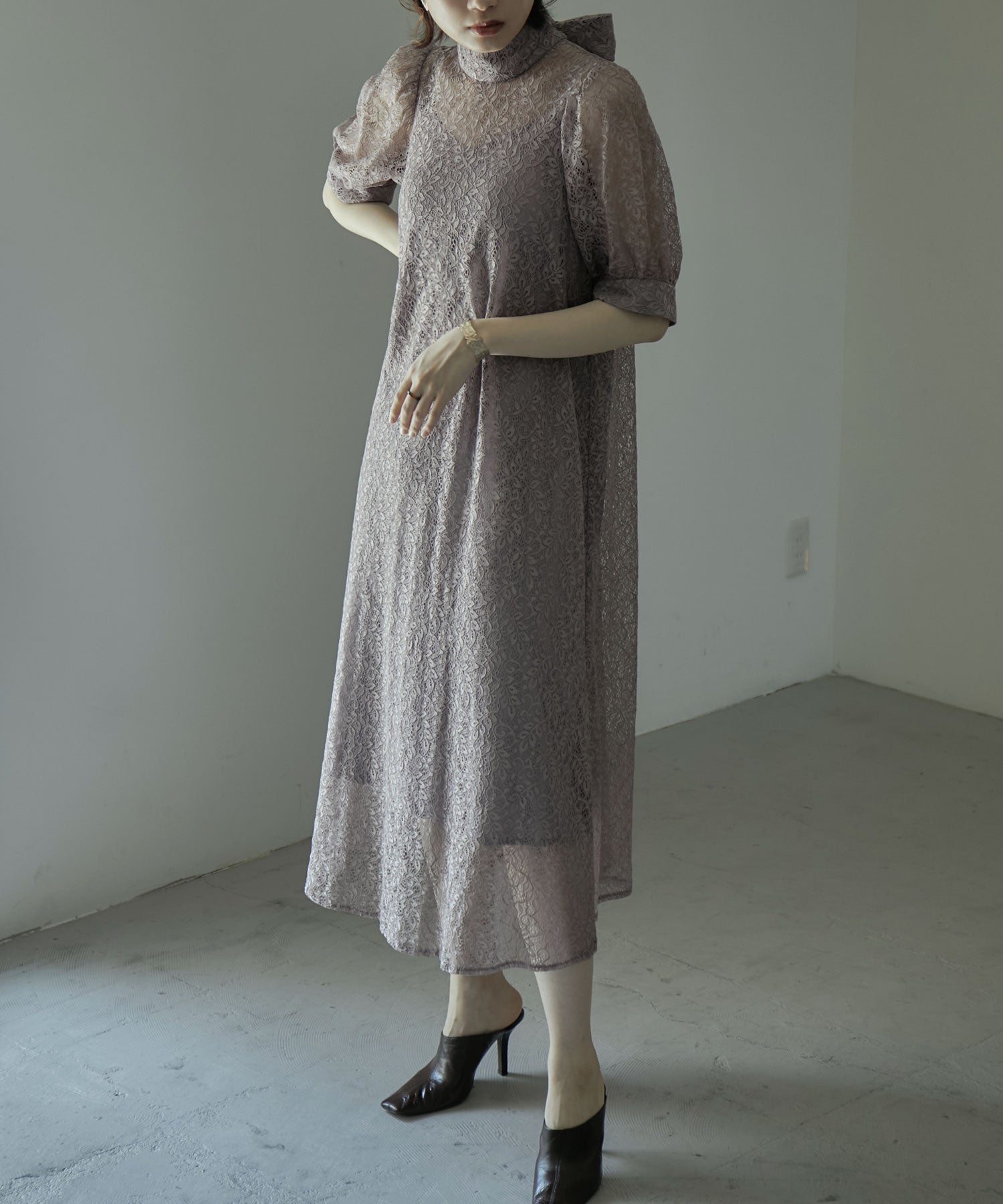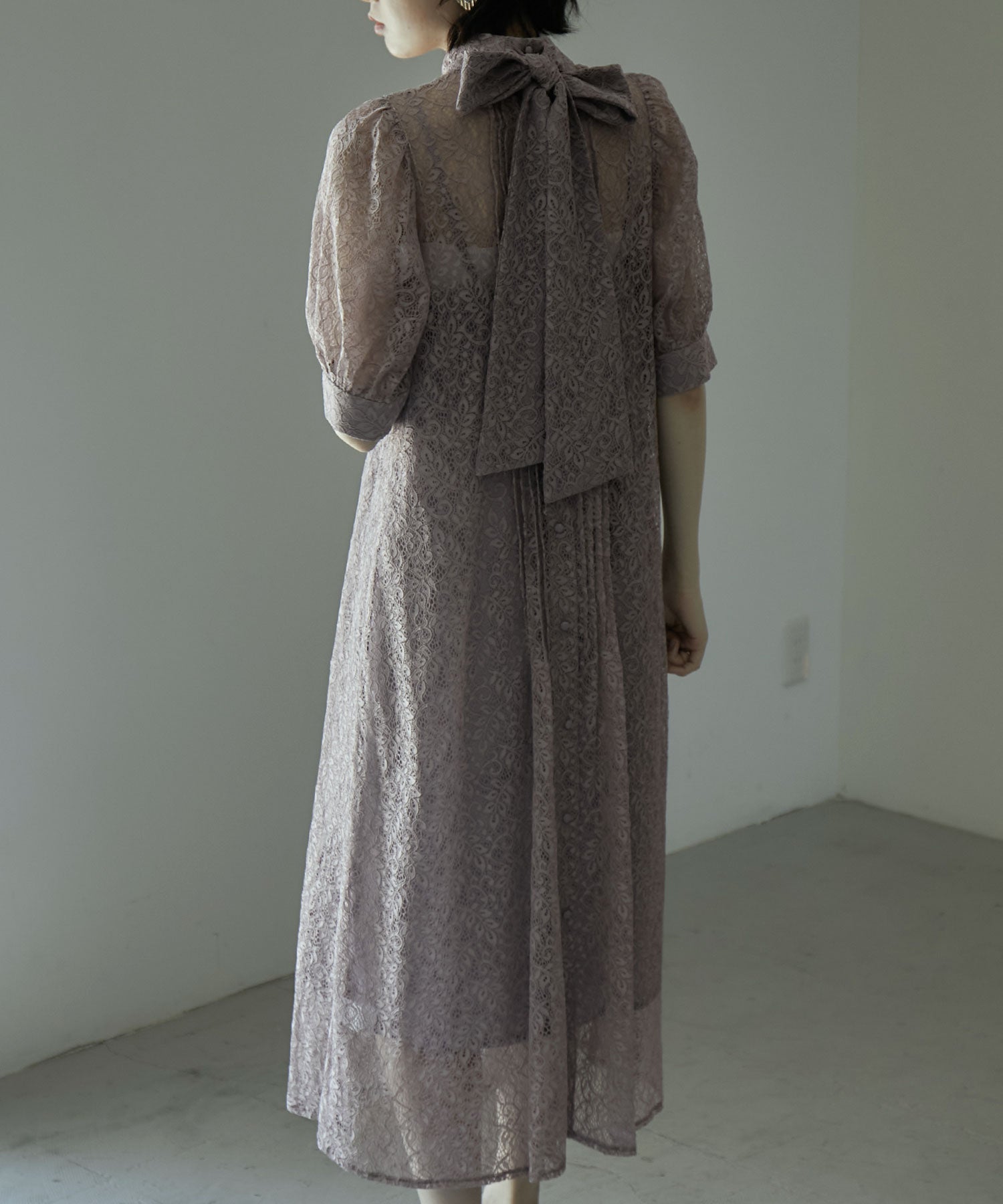 Rname インナー付きバックリボンレースドレス ドレス ワンピース ワンピ オケージョン オケワンピ レース 五分袖 結婚式 二次会 パーティー 重ね着 レイヤード セット 透け感 ピンタック リボン ハイネック スタンドカラー フォーマル
