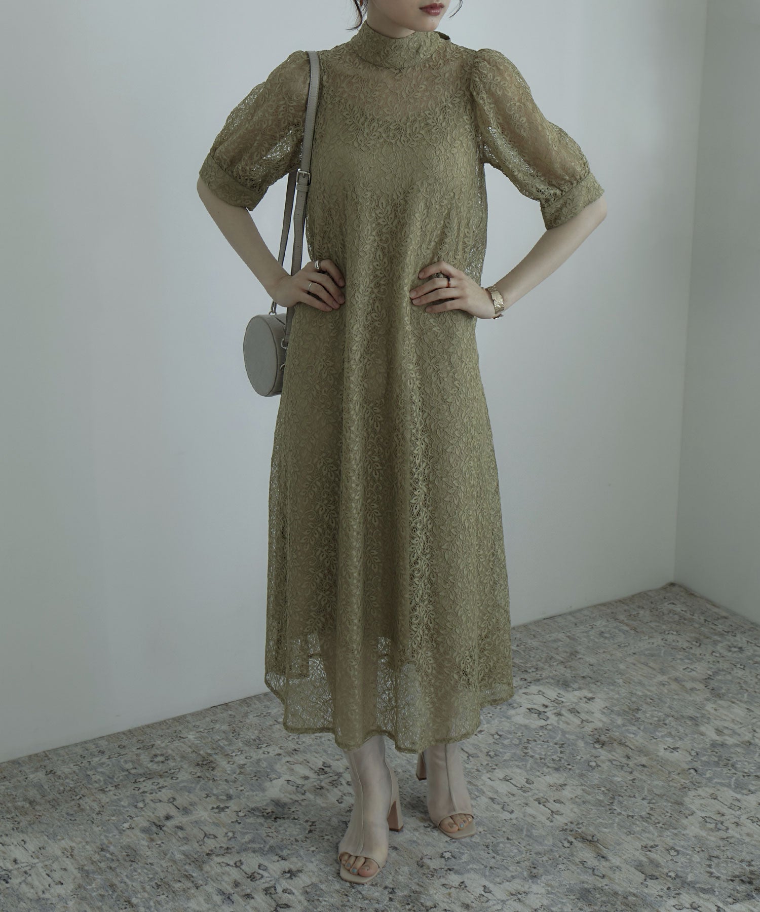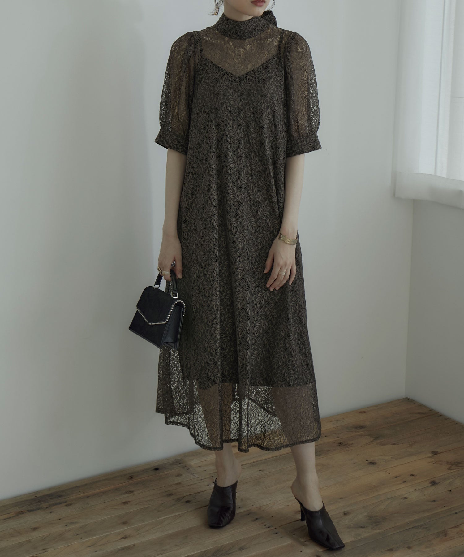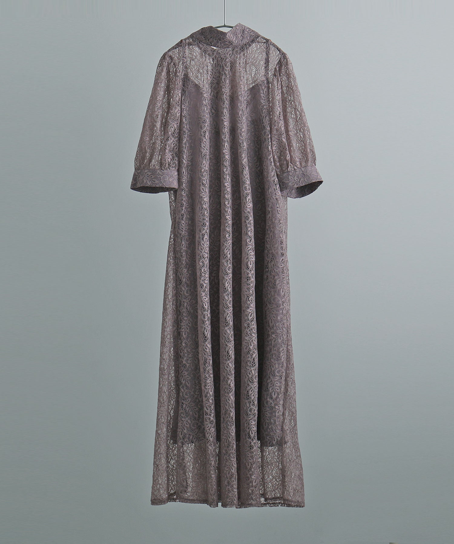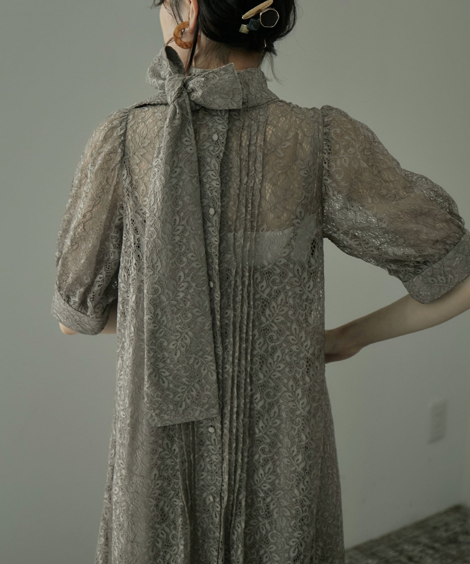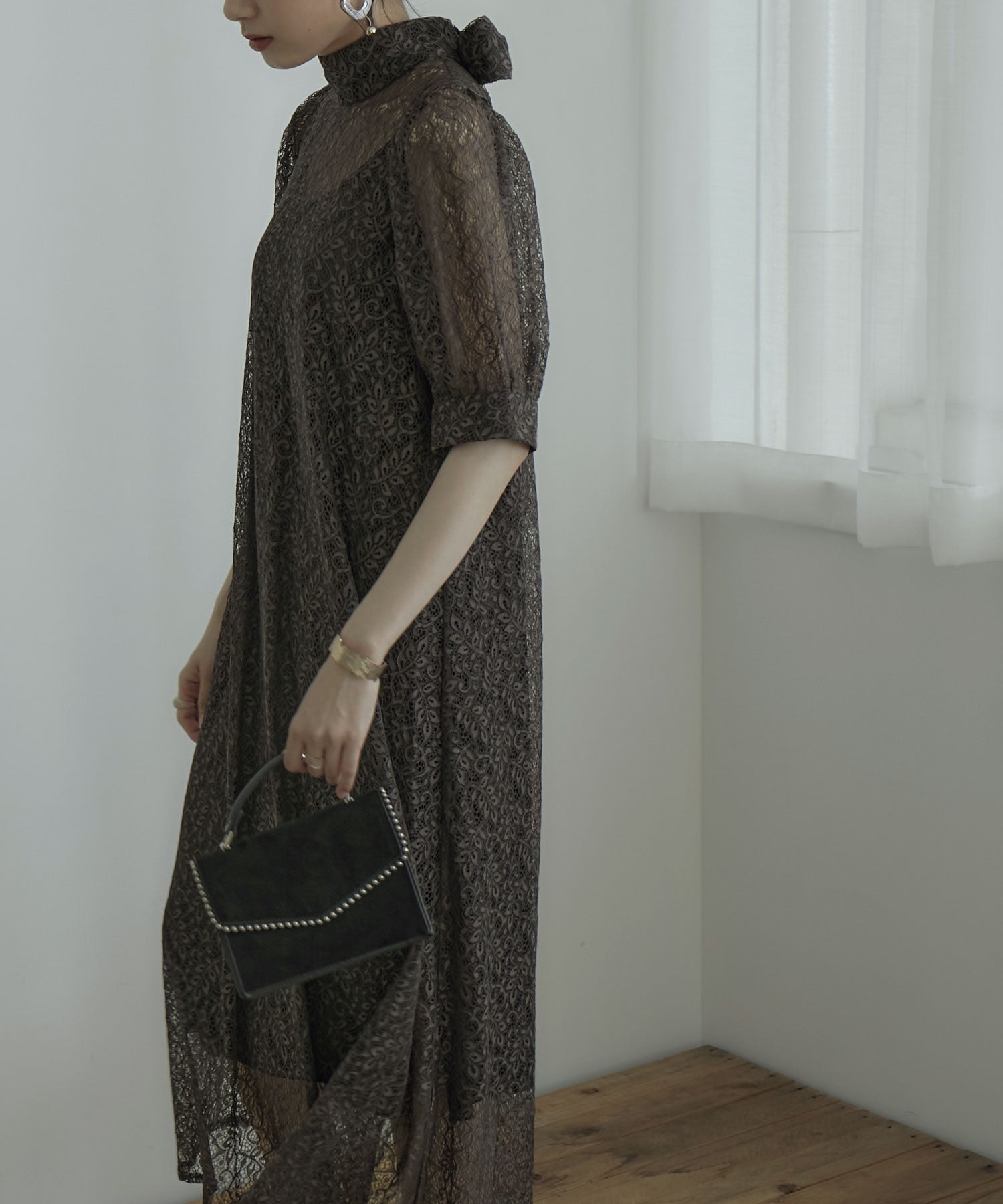 Rname インナー付きバックリボンレースドレス ドレス ワンピース ワンピ オケージョン オケワンピ レース 五分袖 結婚式 二次会 パーティー 重ね着 レイヤード セット 透け感 ピンタック リボン ハイネック スタンドカラー フォーマル