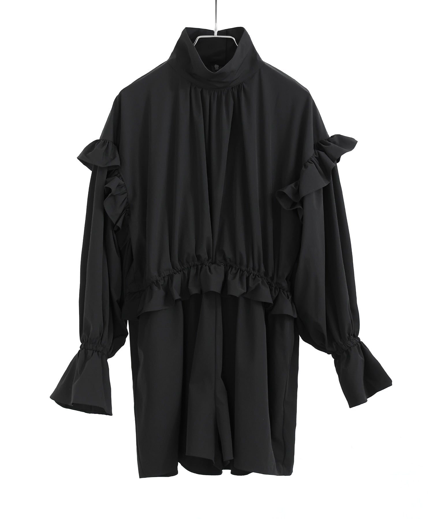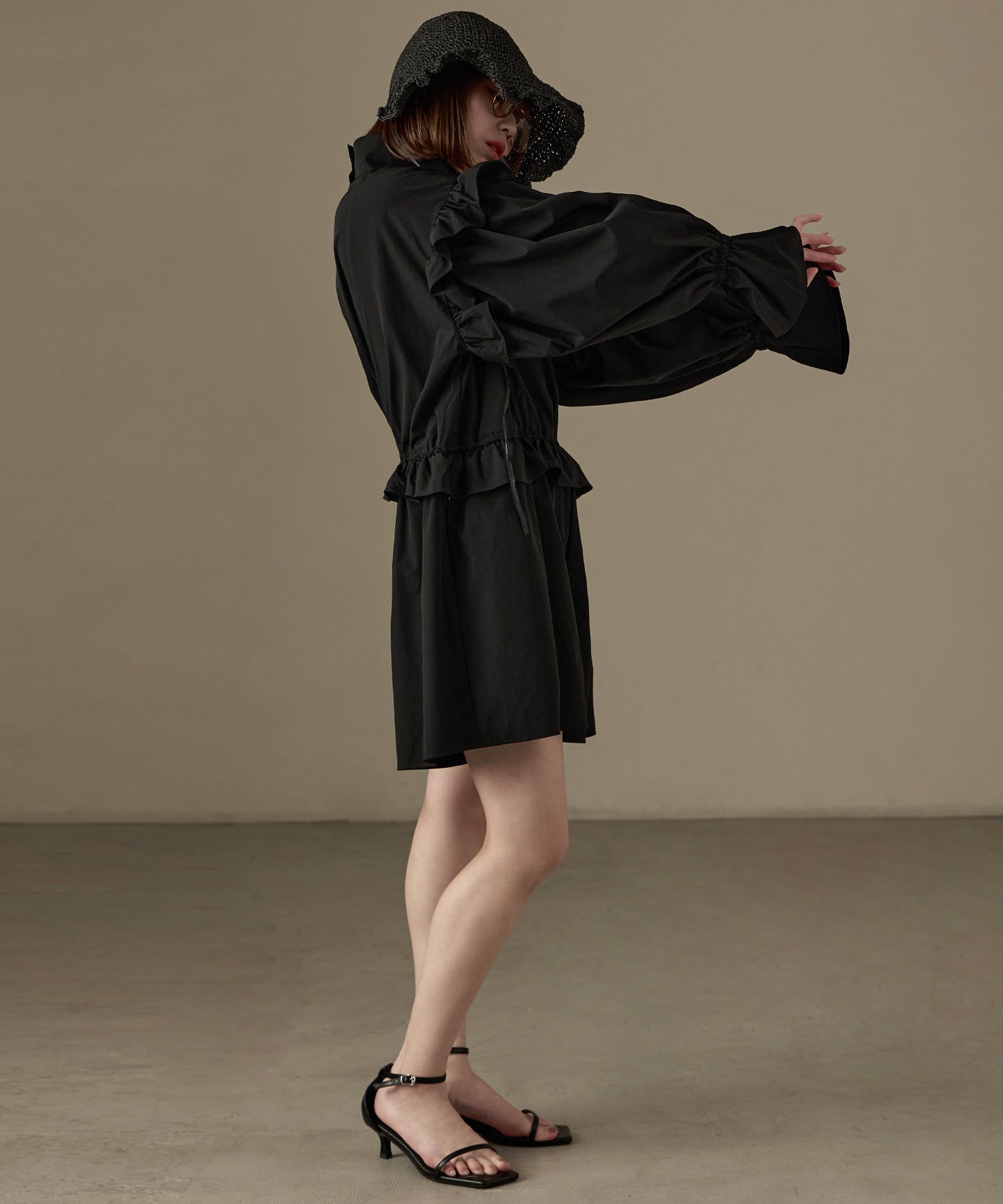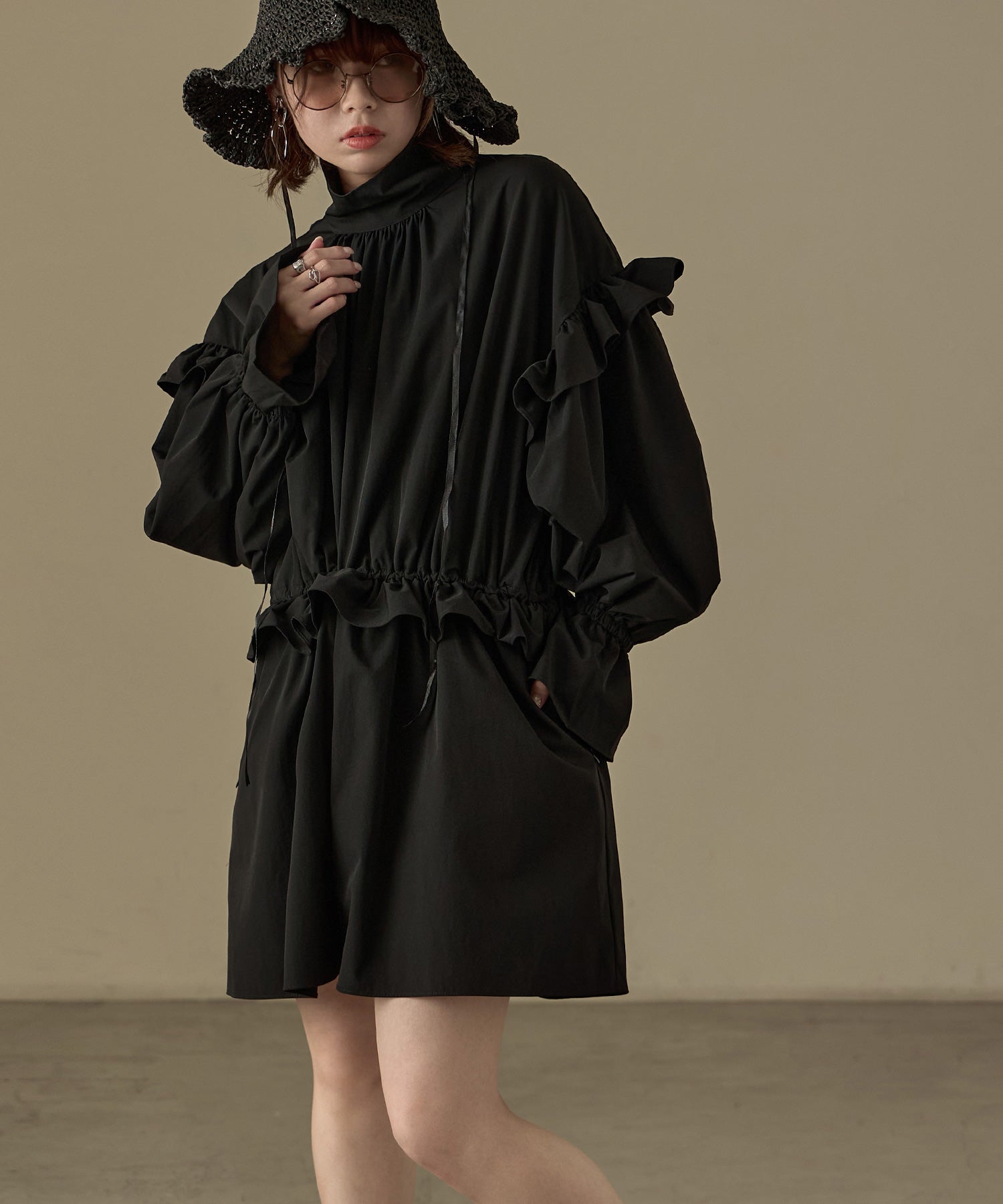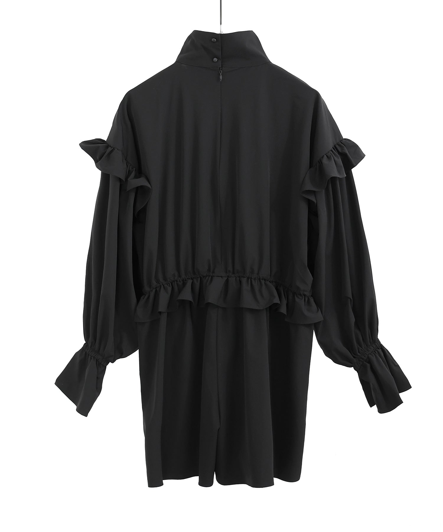 袖とウエストのフリルが大人可愛いロンパースタイプ。
