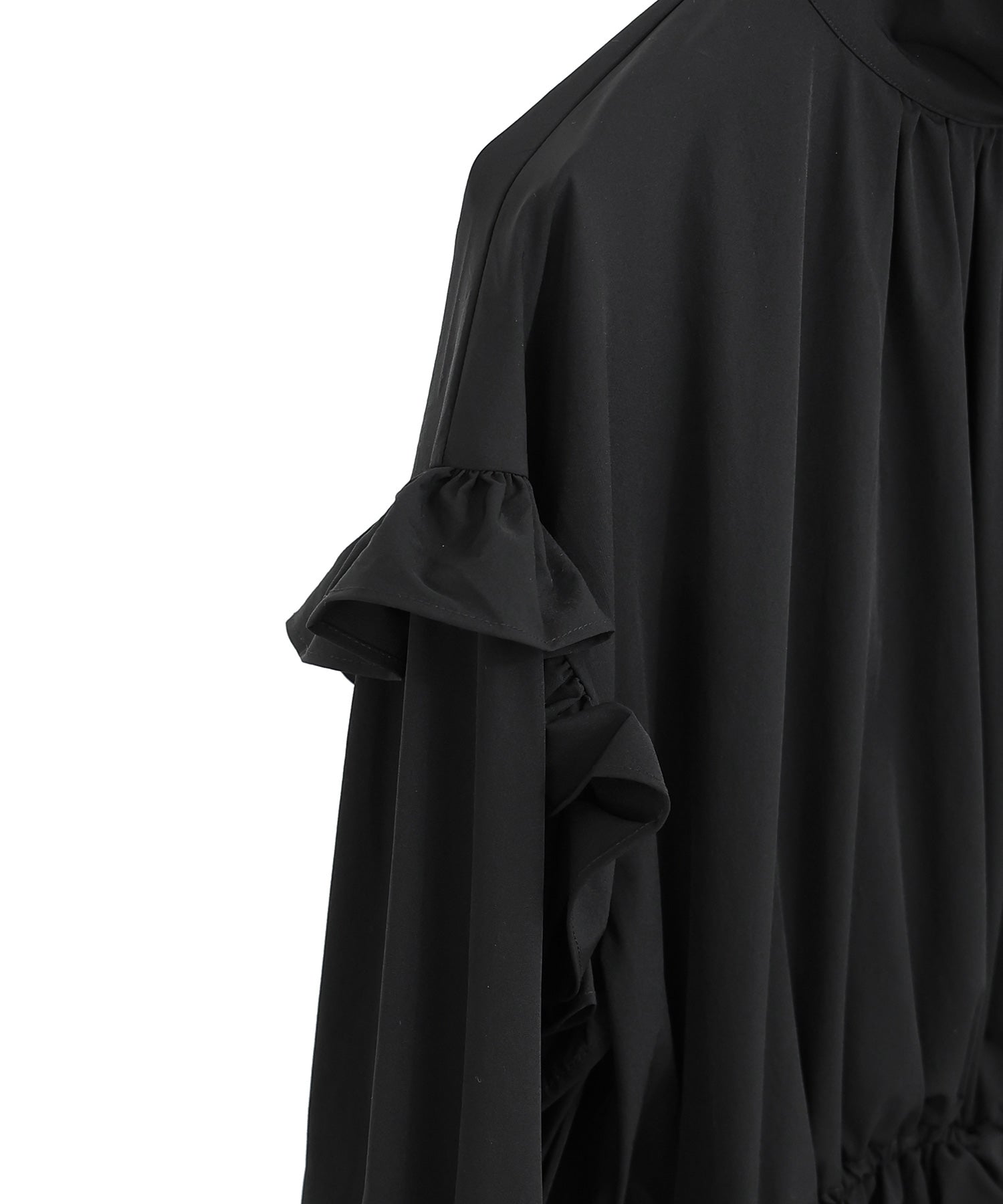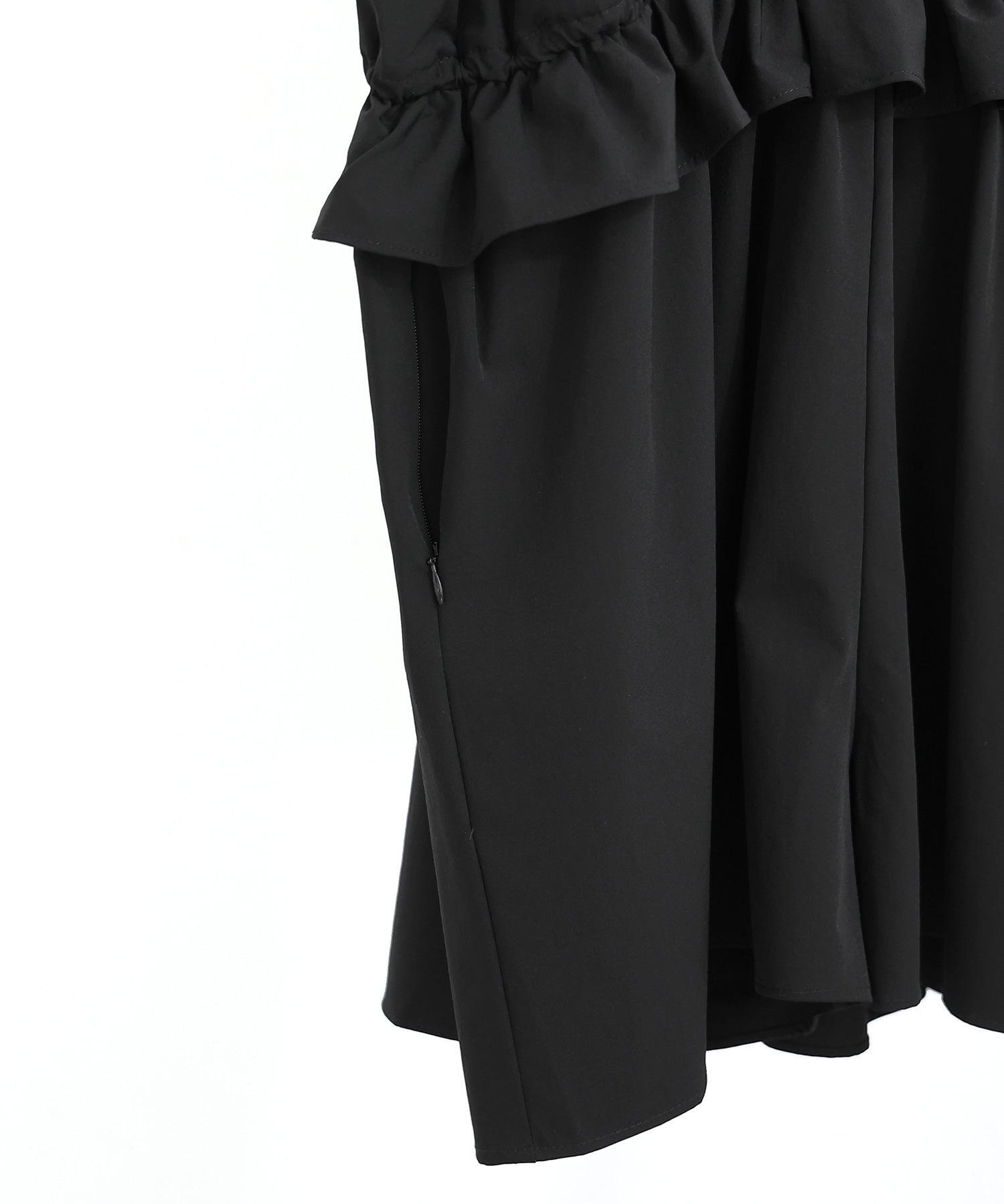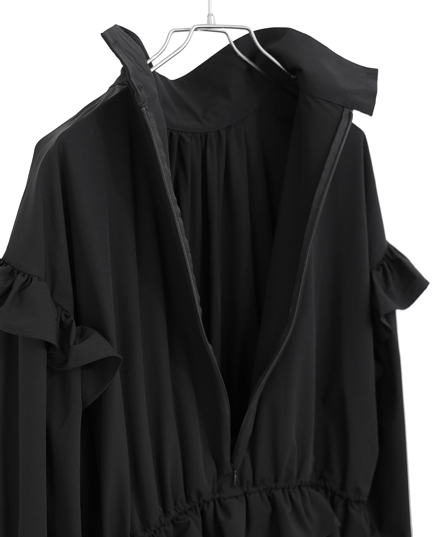 袖とウエストのフリルが大人可愛いロンパースタイプ。
