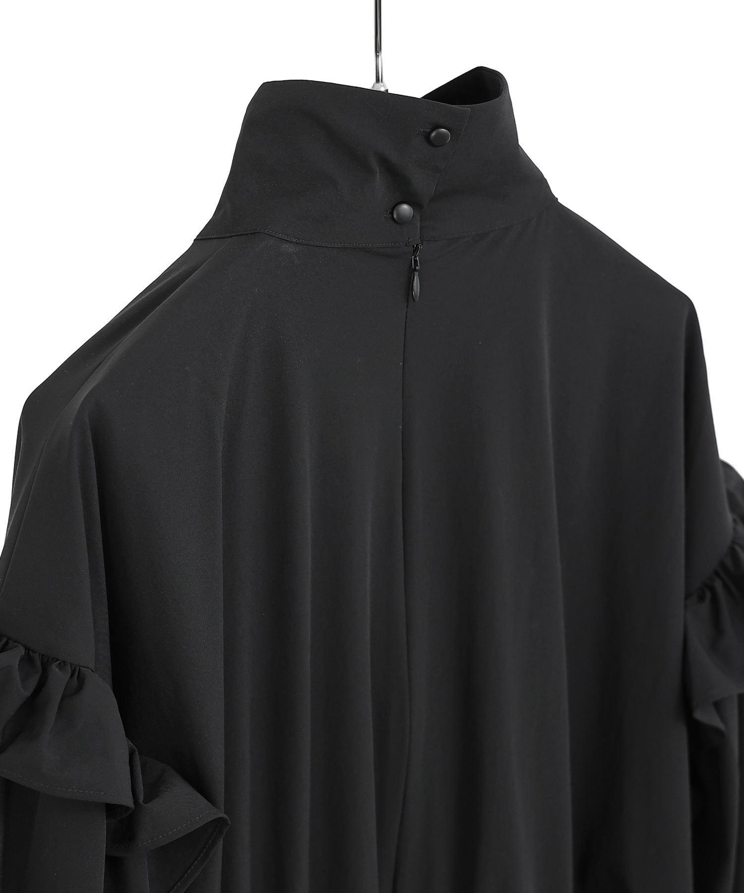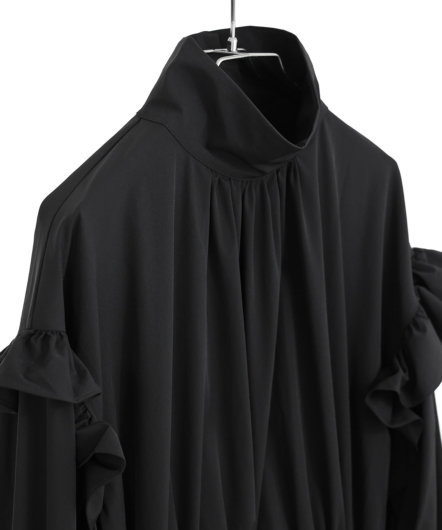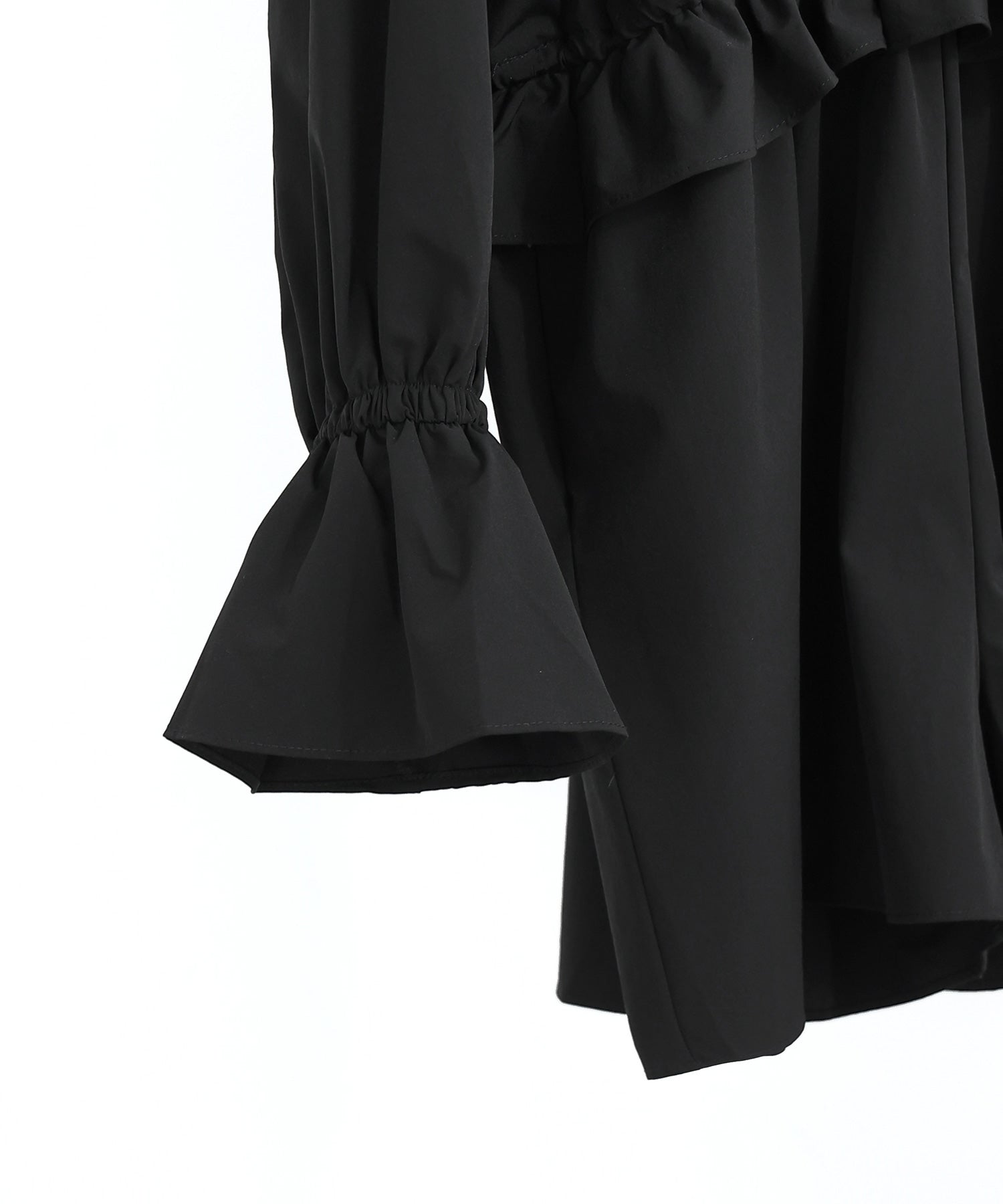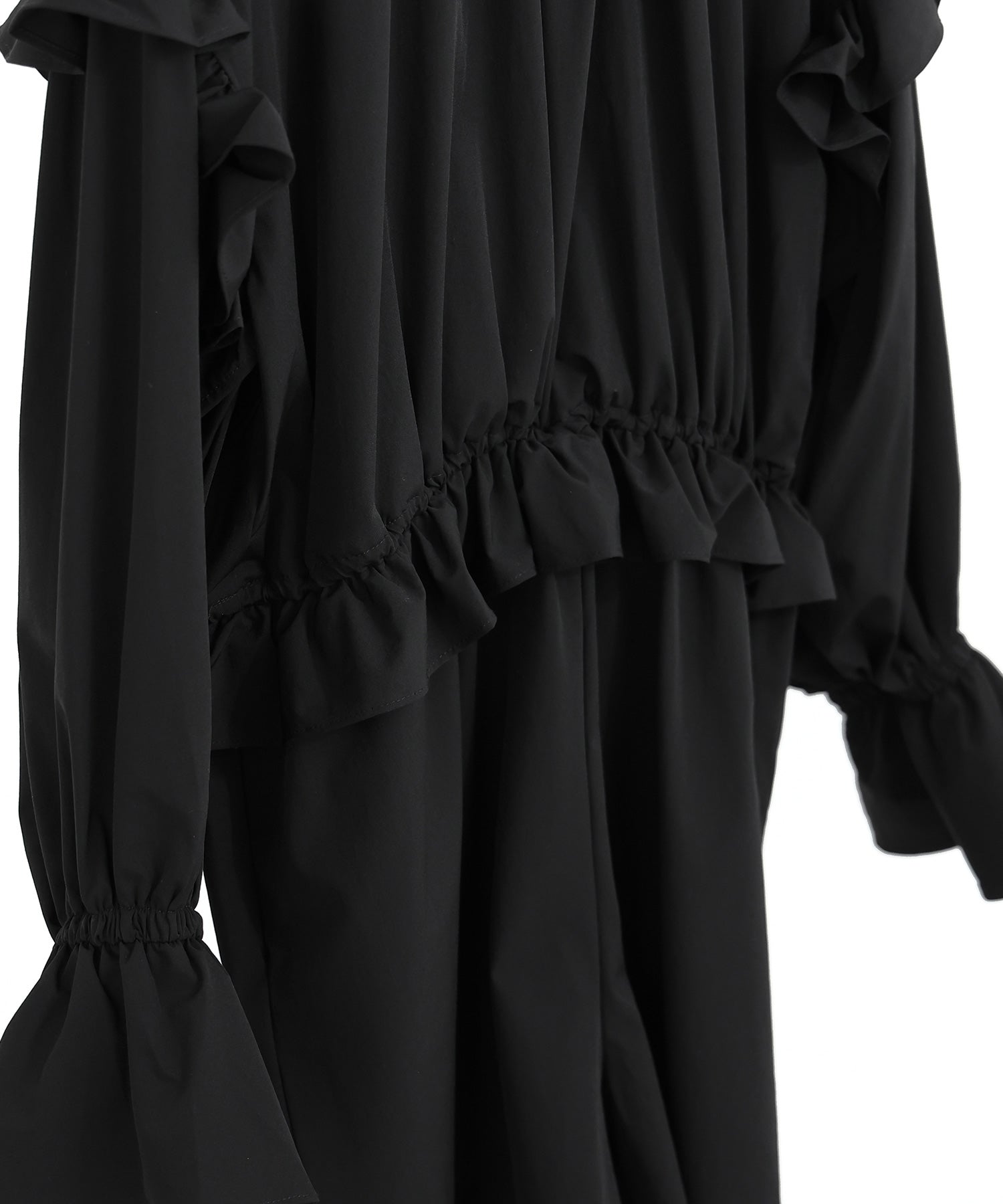 袖とウエストのフリルが大人可愛いロンパースタイプ。
