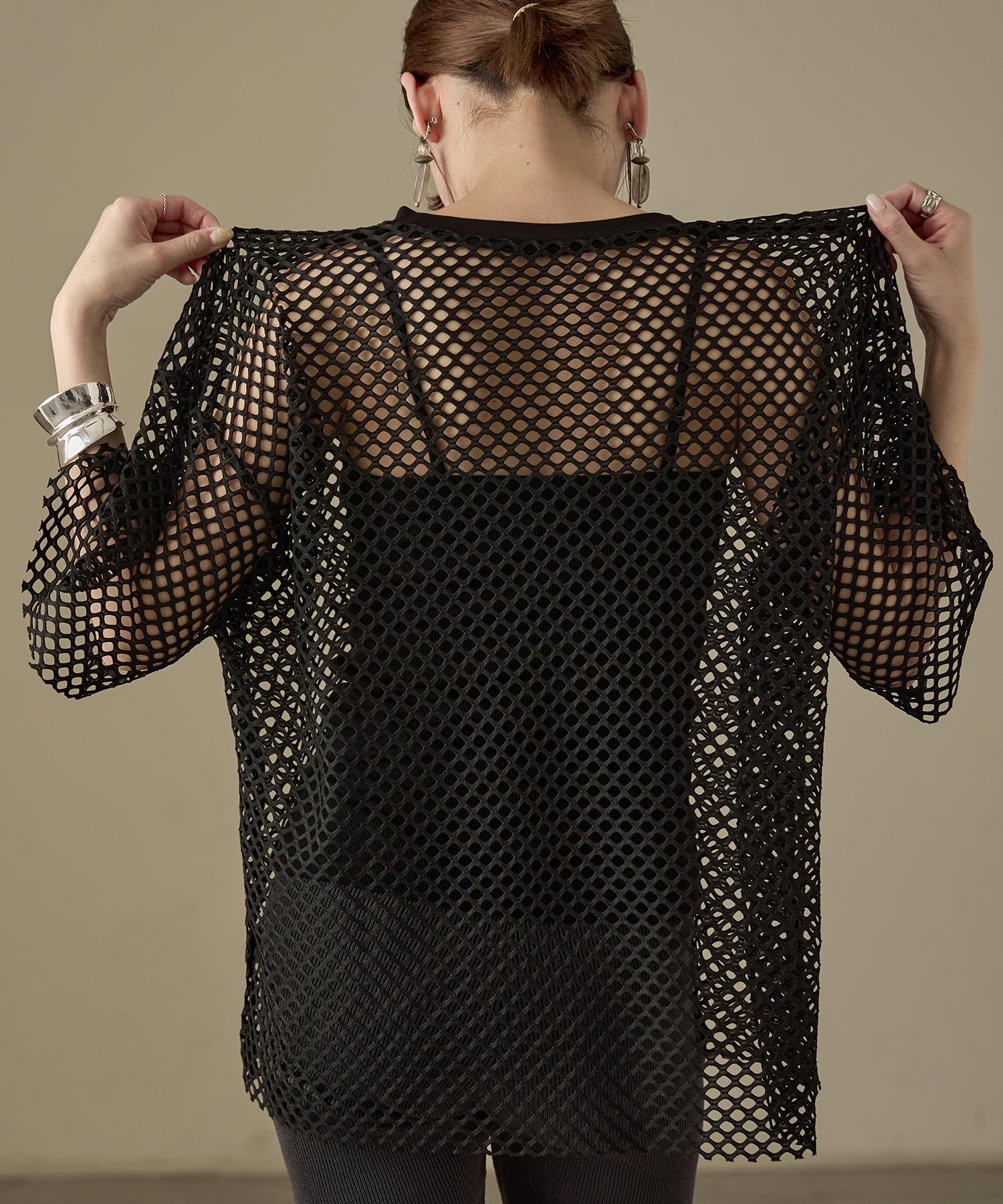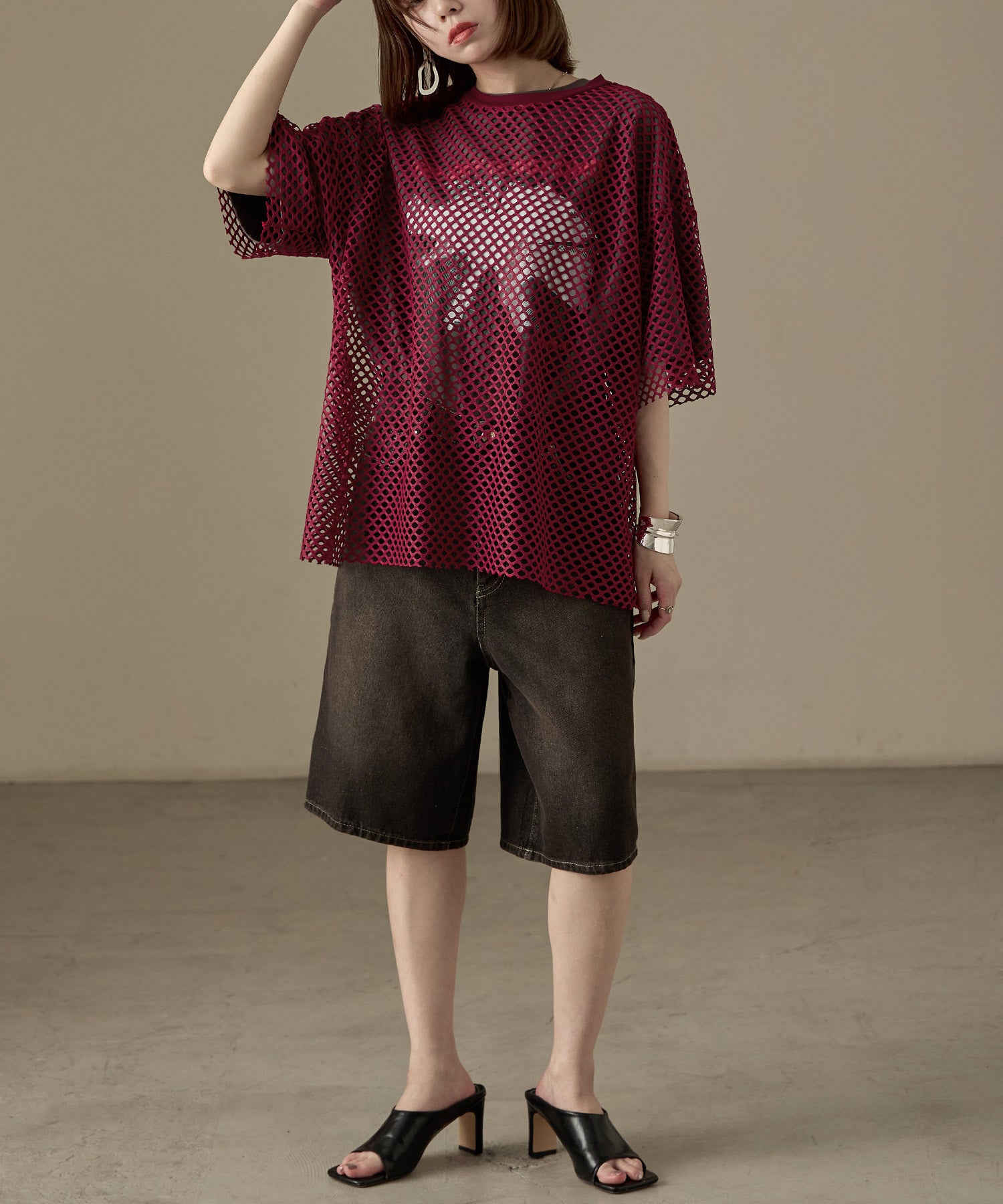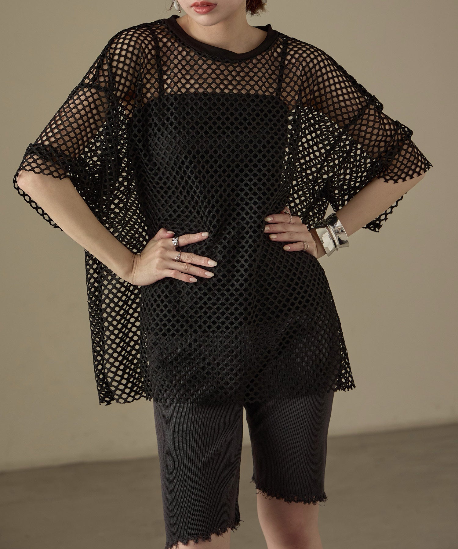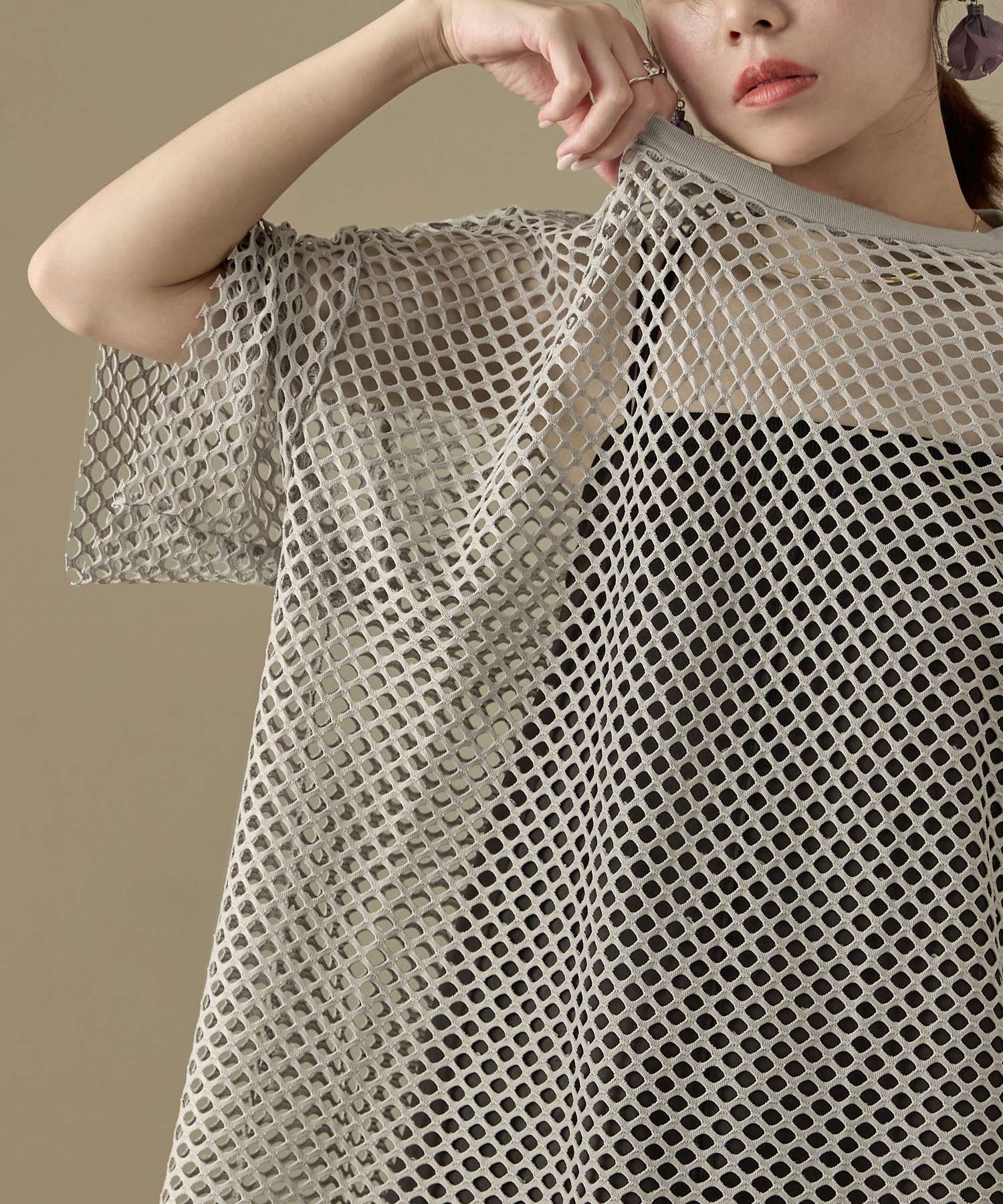 Rname シアーメッシュ オーバーサイズTシャツ カットソー ゆったり ビッグサイズ 大きめ 無地 トップス レディース シアー 半袖 5分袖 五分袖 韓国ファッション 大人 低身長 高身長 レイヤード ママコーデ 無地 メッシュニット