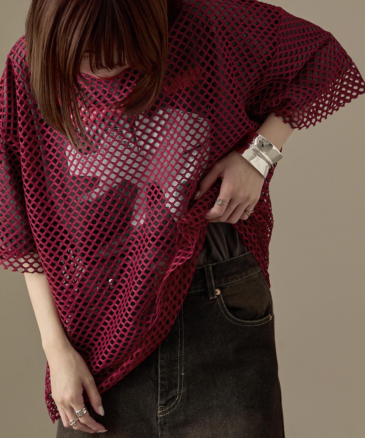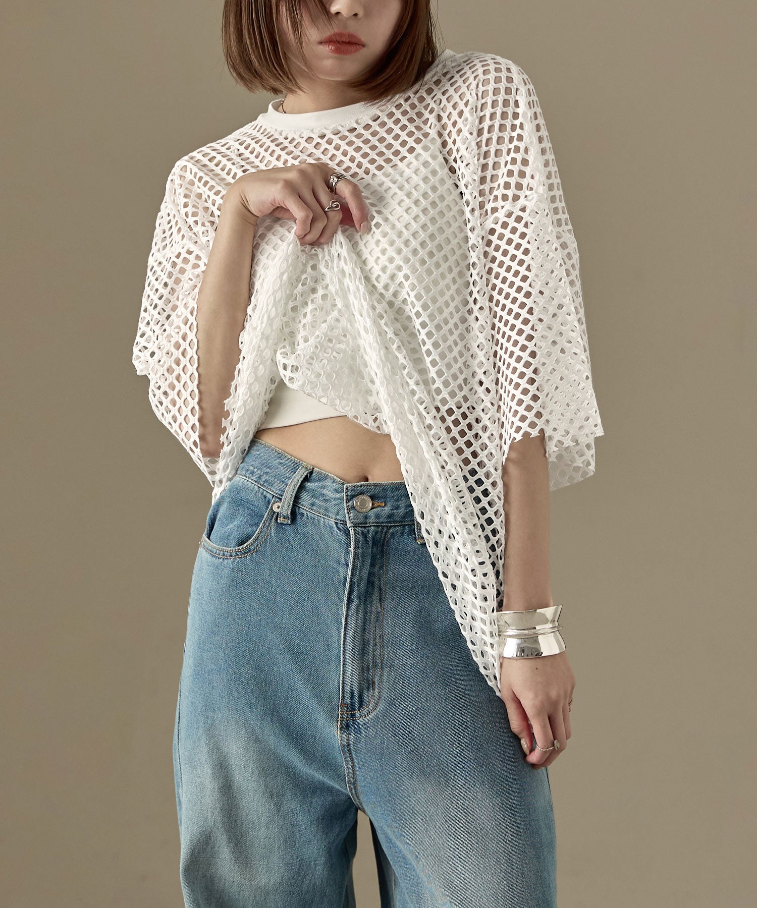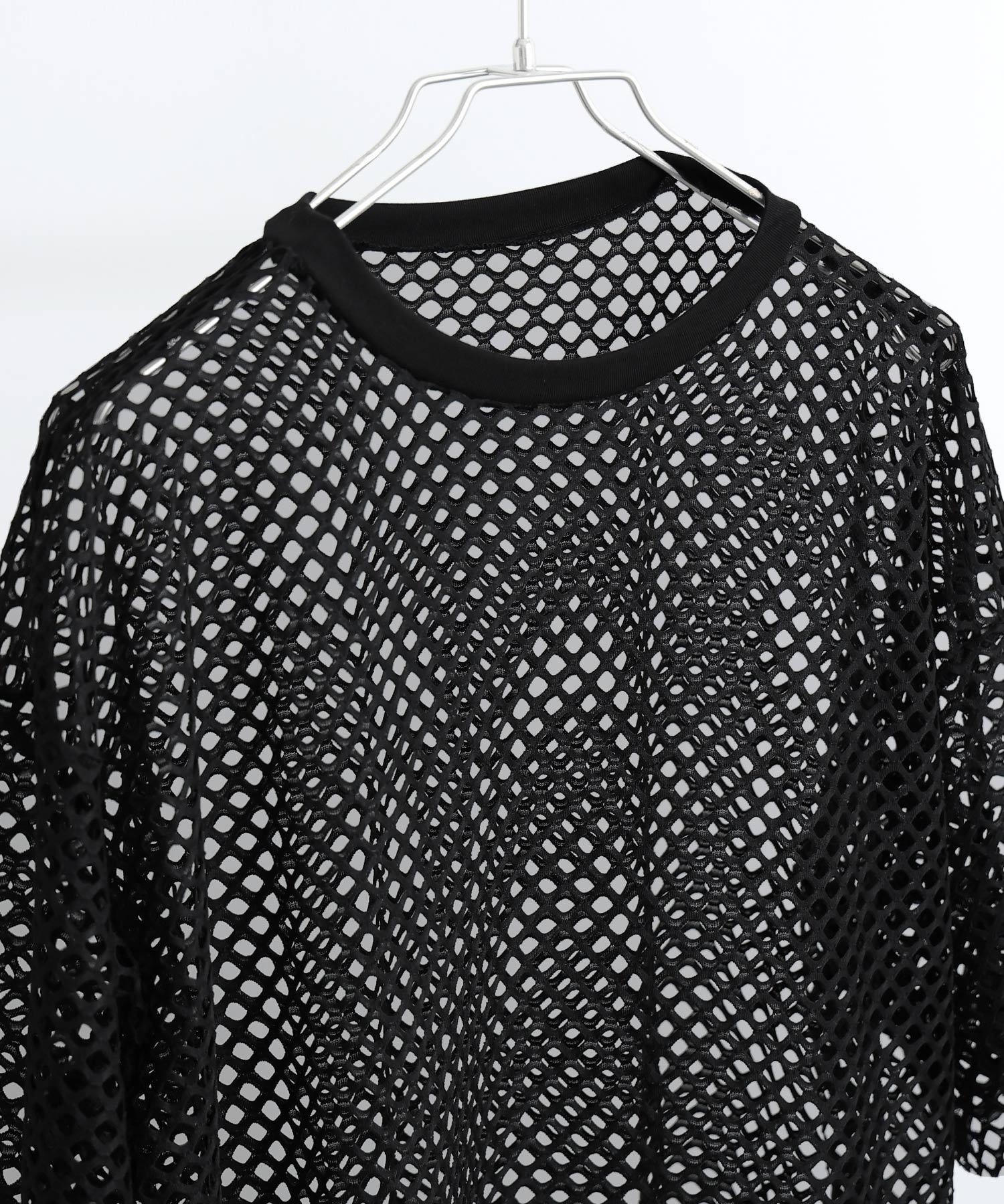 Rname シアーメッシュ オーバーサイズTシャツ カットソー ゆったり ビッグサイズ 大きめ 無地 トップス レディース シアー 半袖 5分袖 五分袖 韓国ファッション 大人 低身長 高身長 レイヤード ママコーデ 無地 メッシュニット