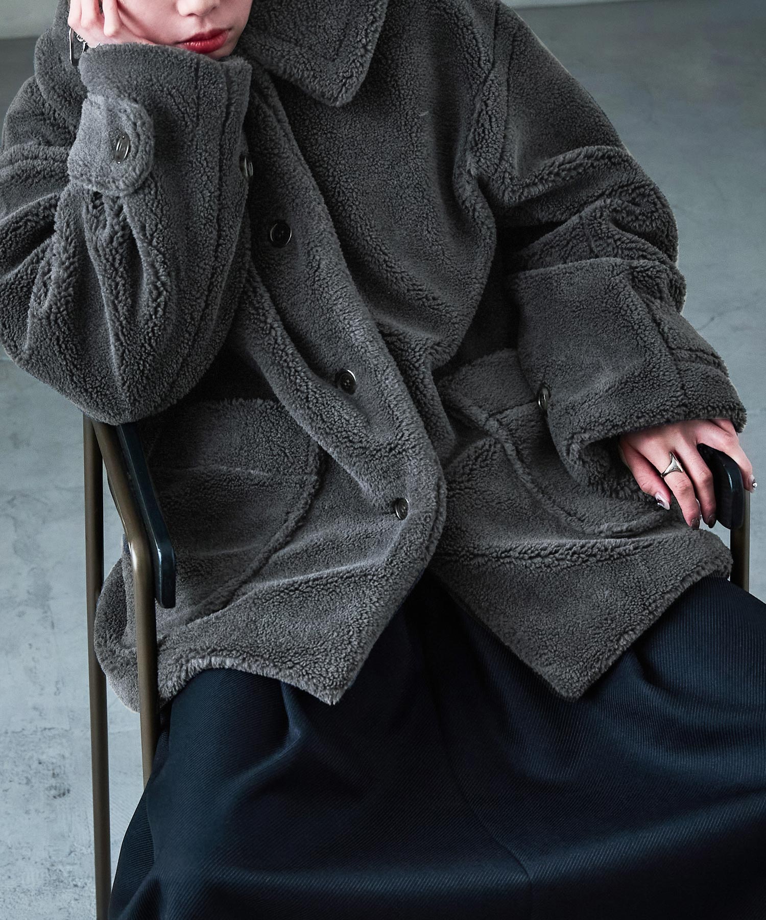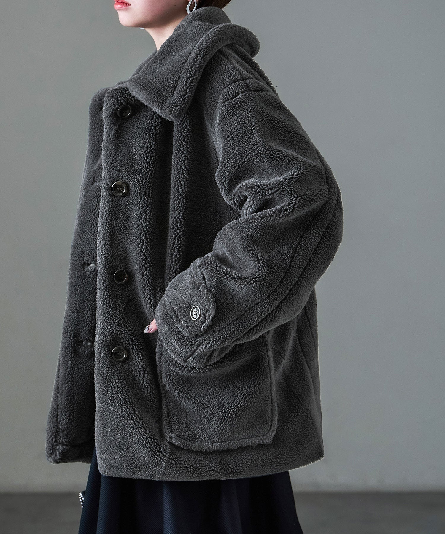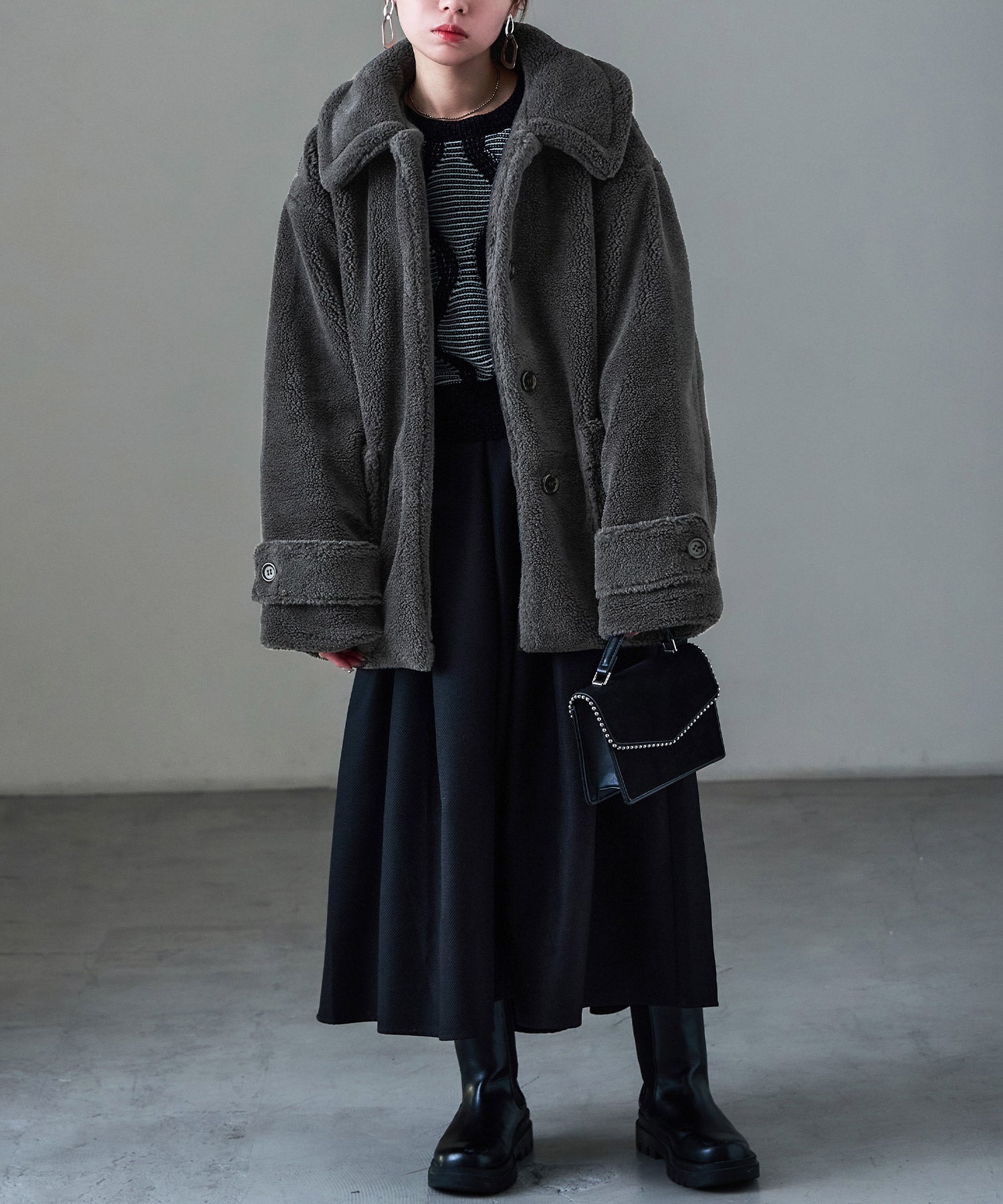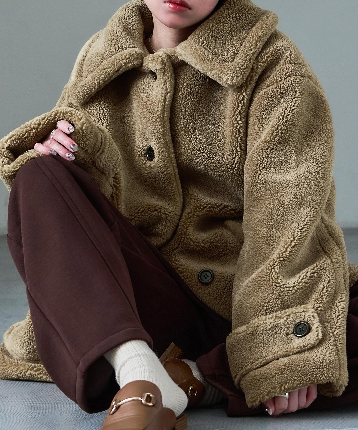 Rname ミドル丈 テディボア ステンカラーコート テディコート ショートコート ジャケット ブルゾン ボア ゆったり ロング丈 韓国ファッション 低身長 高身長 あったか アウター ママコーデ きれいめ