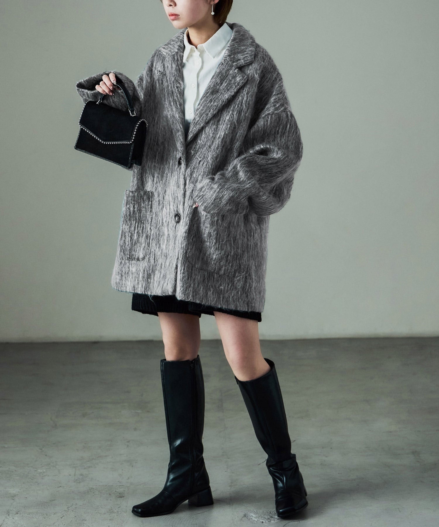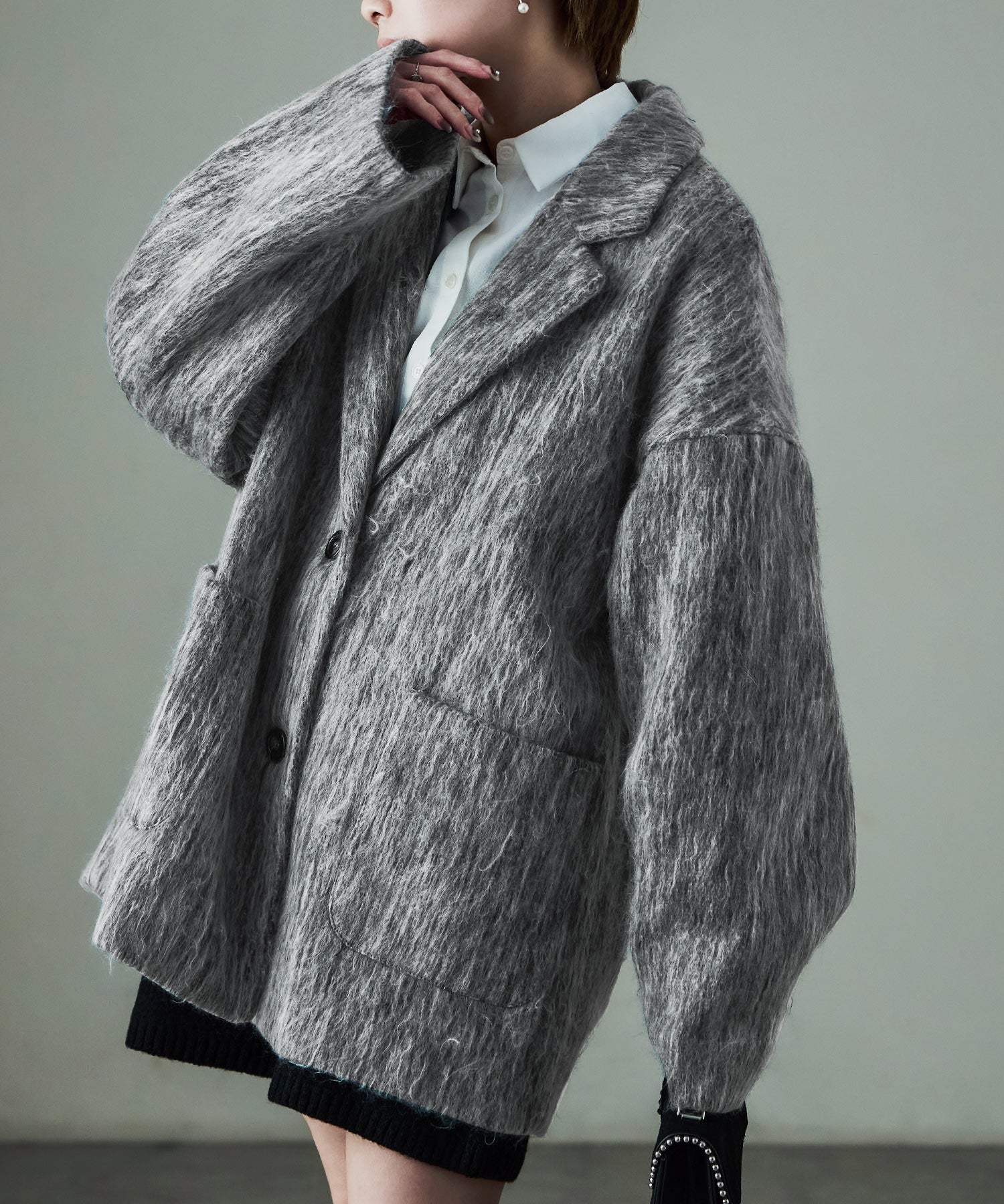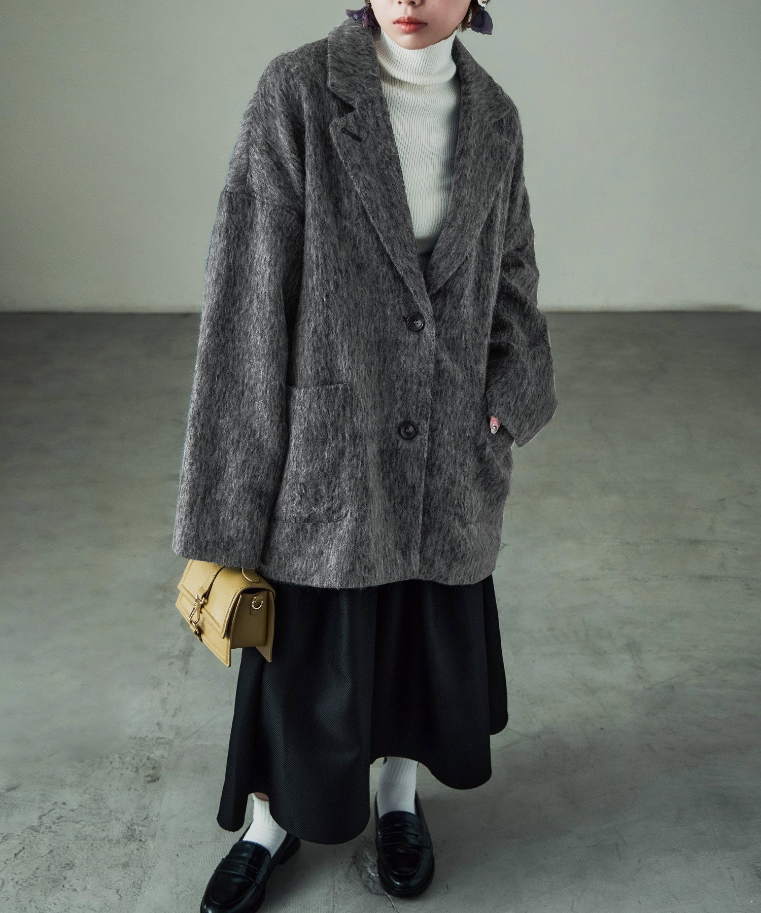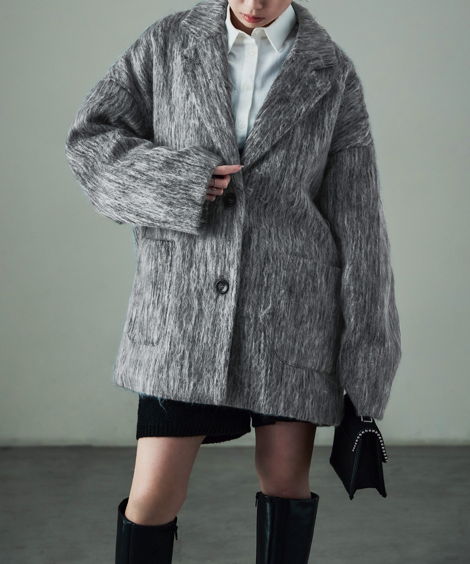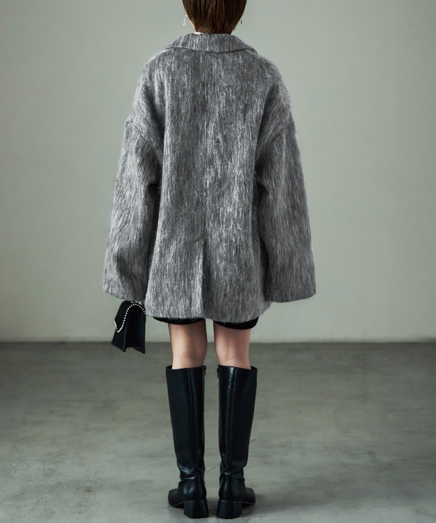 雰囲気抜群、肌触りの良いフェザーのようなシャギー素材のジャケットコート。