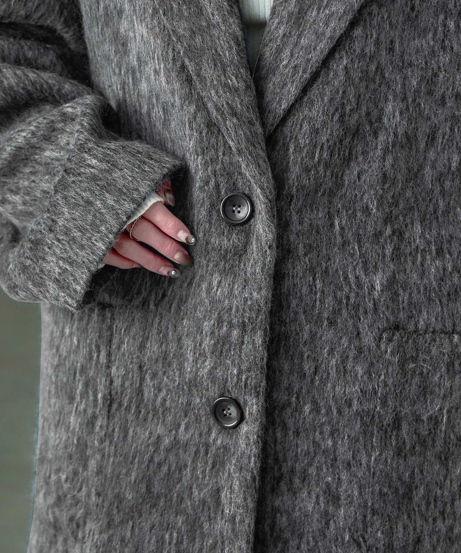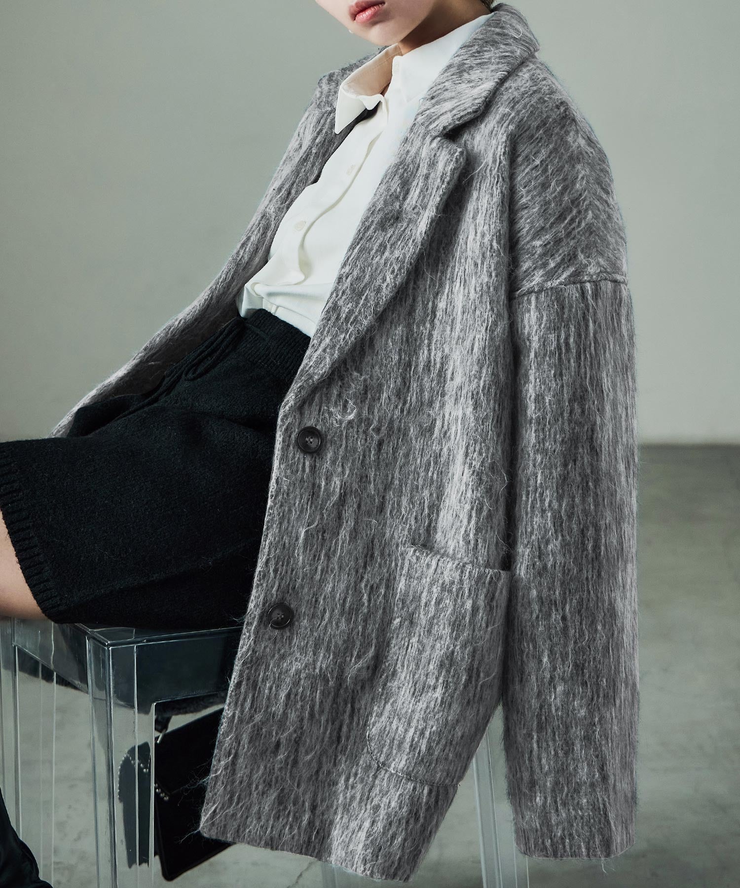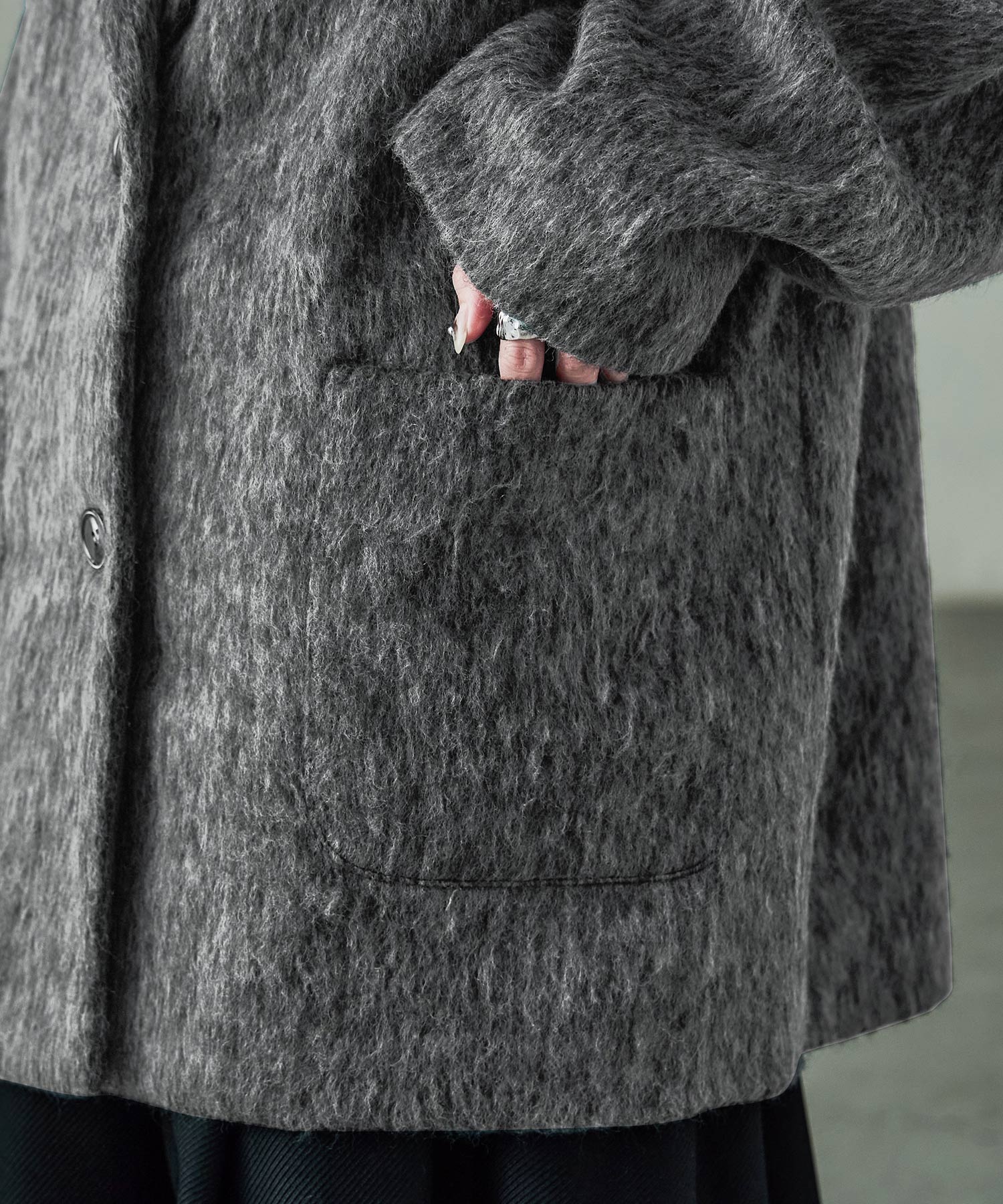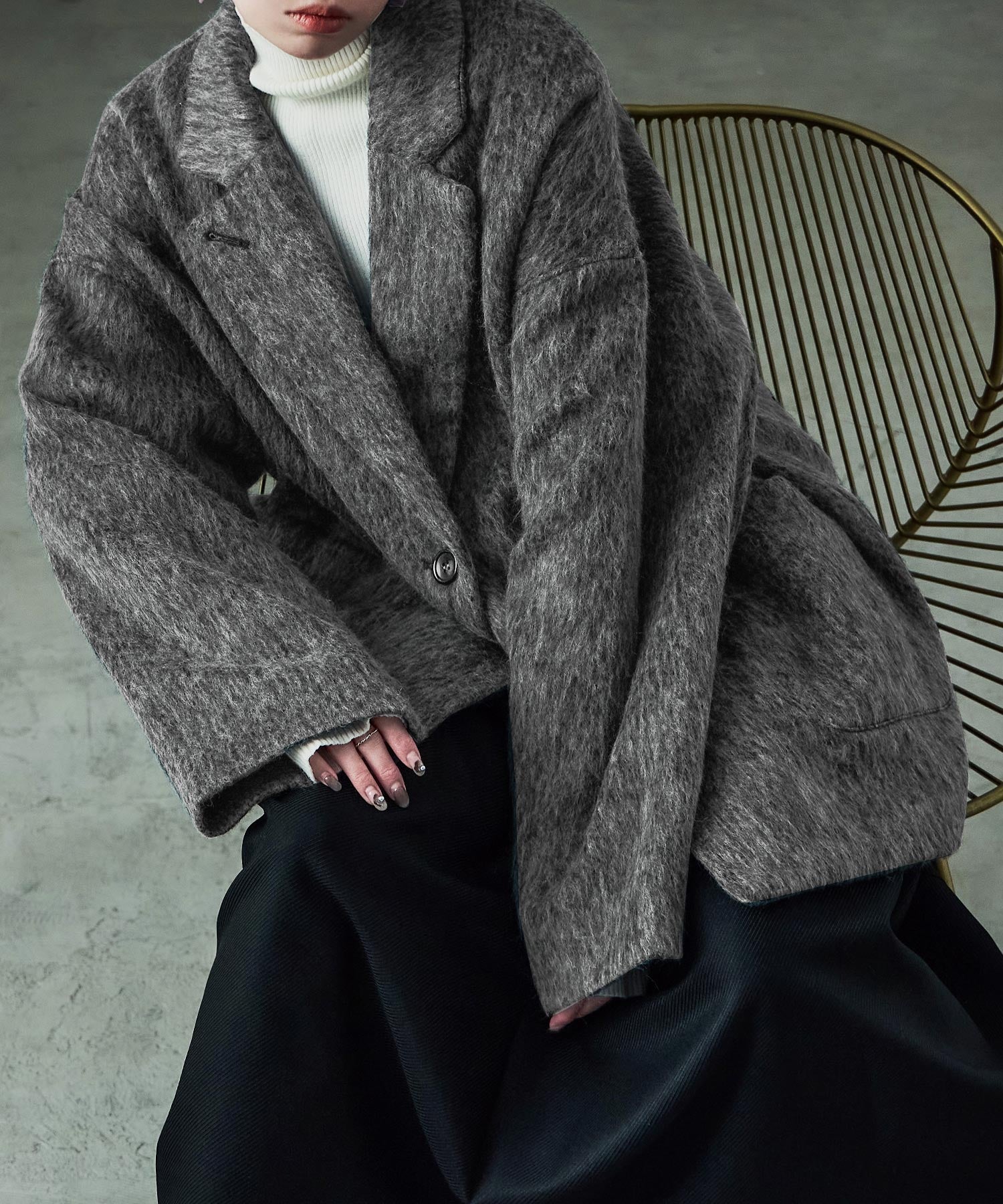 雰囲気抜群、肌触りの良いフェザーのようなシャギー素材のジャケットコート。