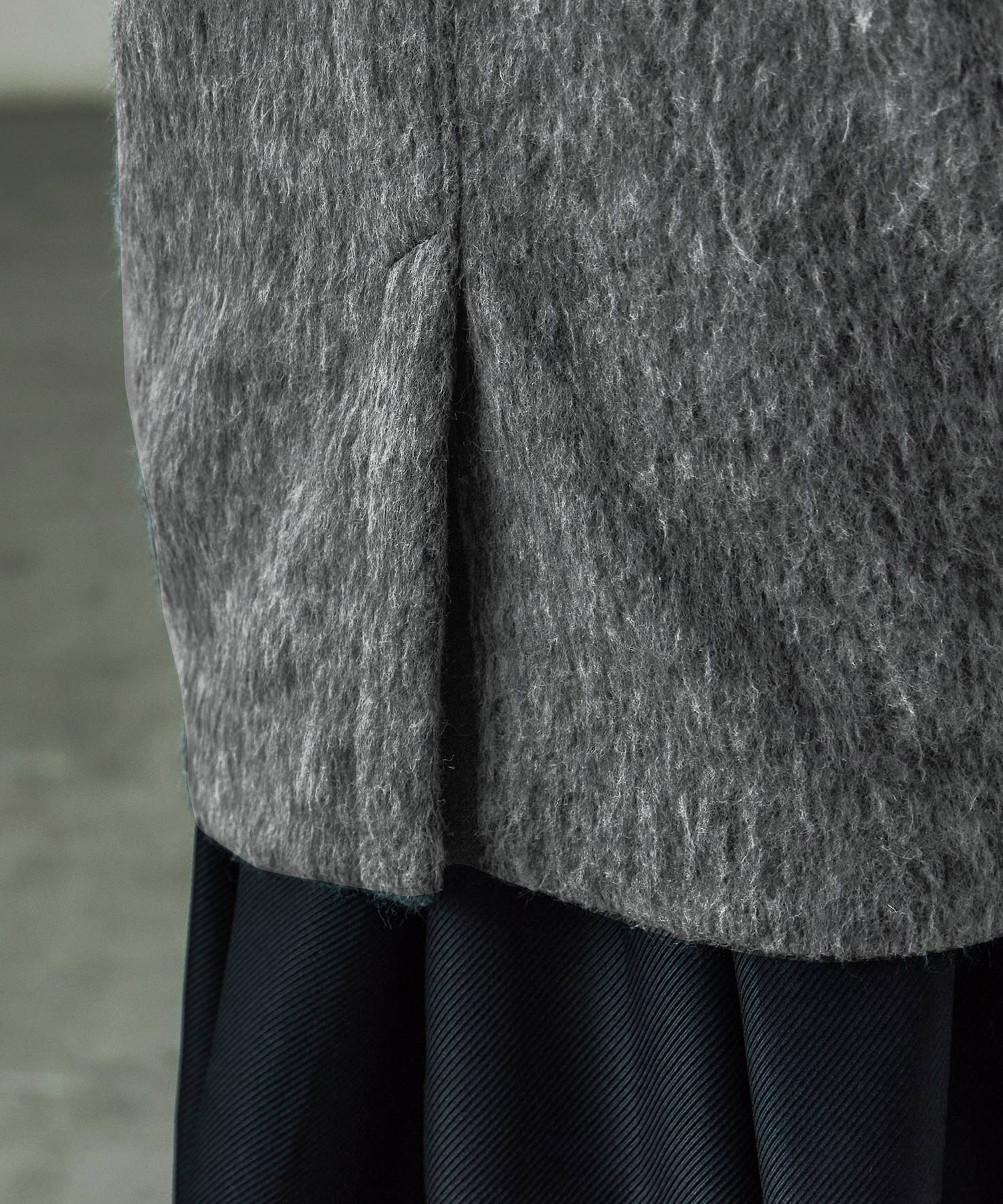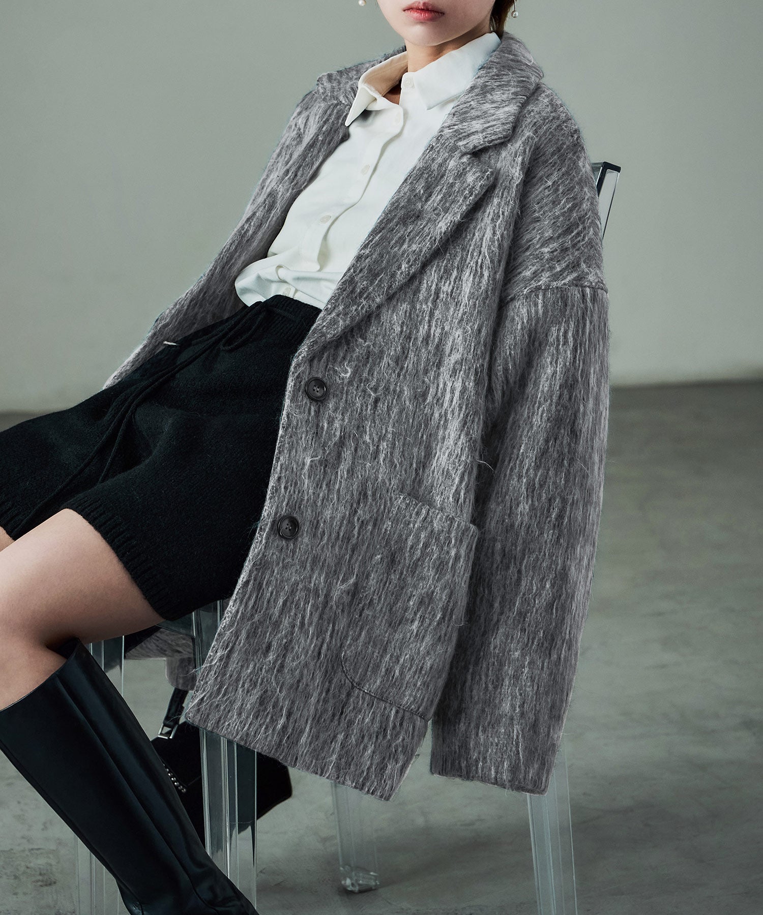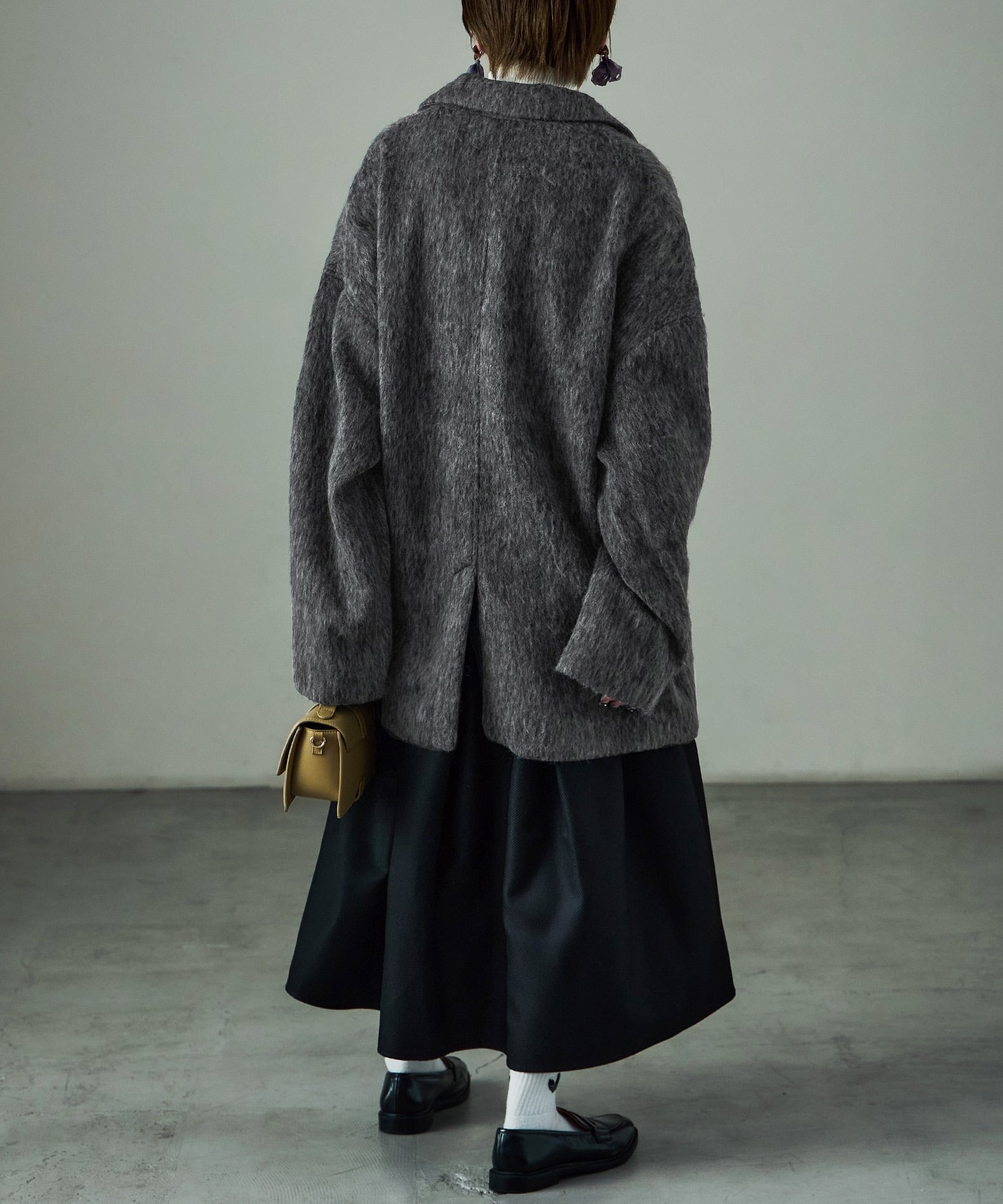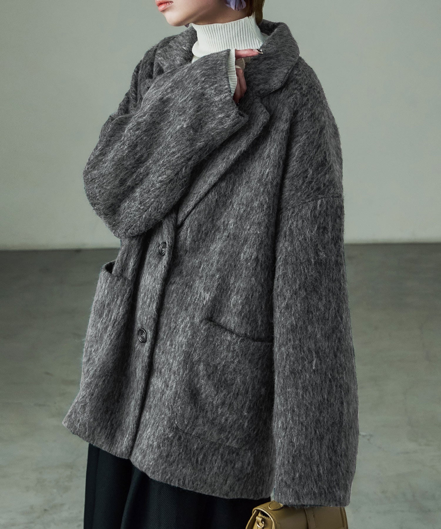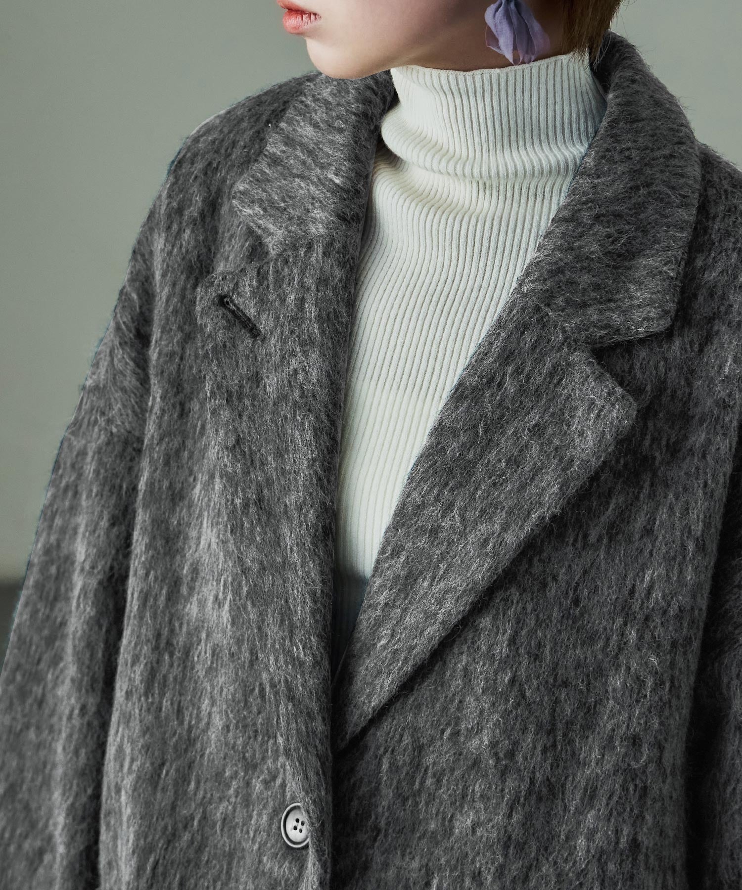 雰囲気抜群、肌触りの良いフェザーのようなシャギー素材のジャケットコート。