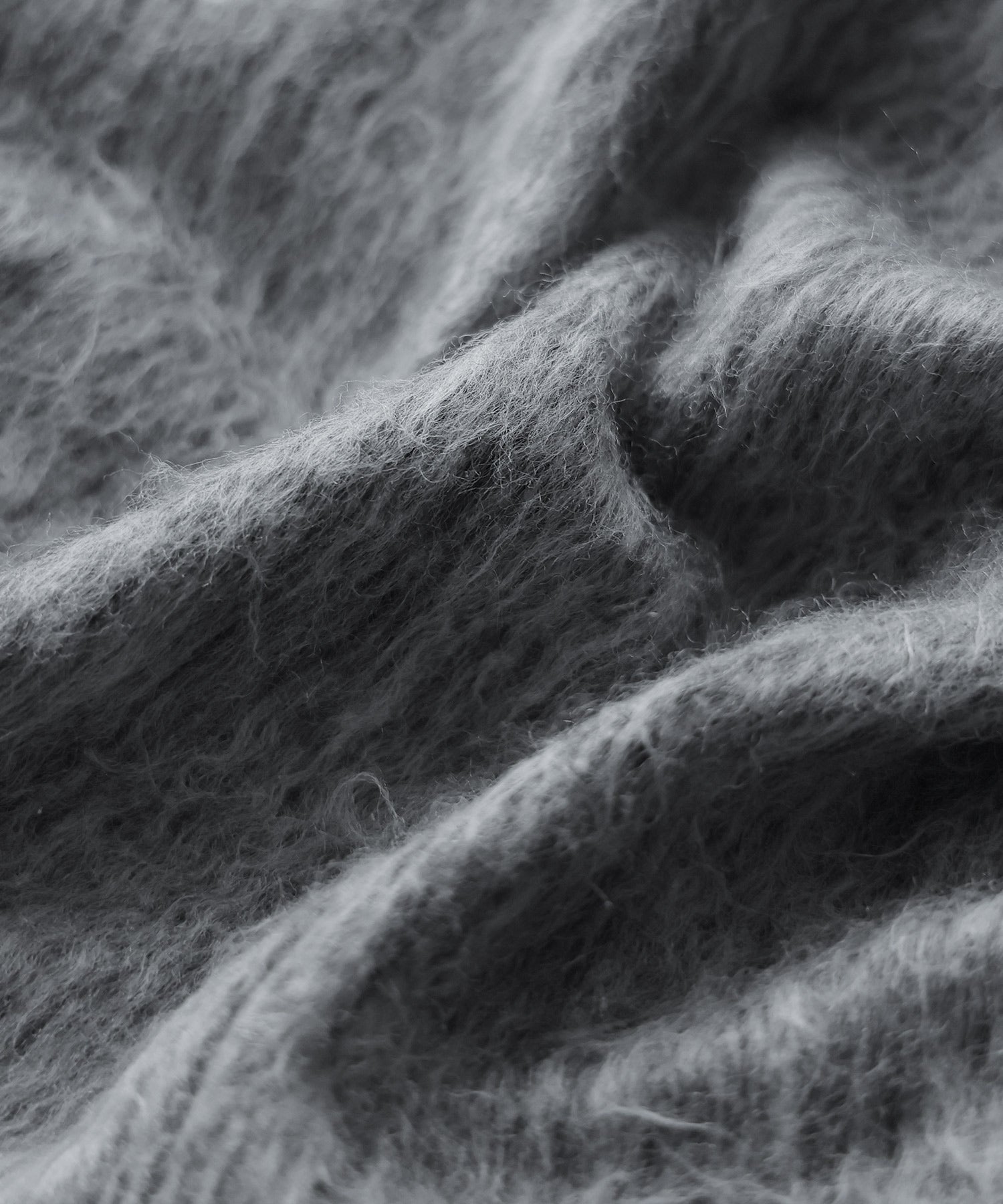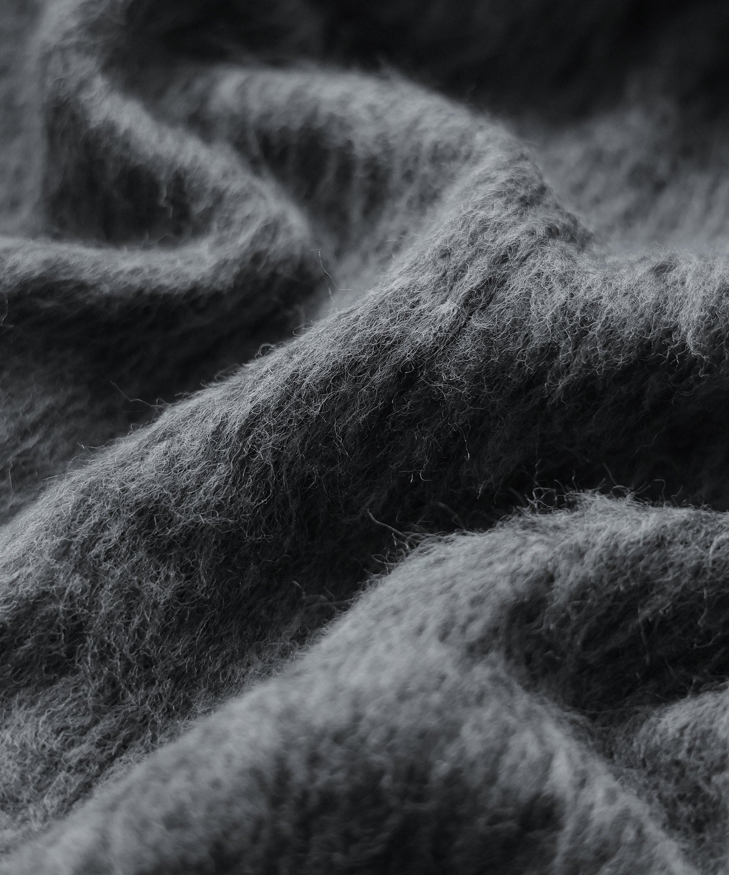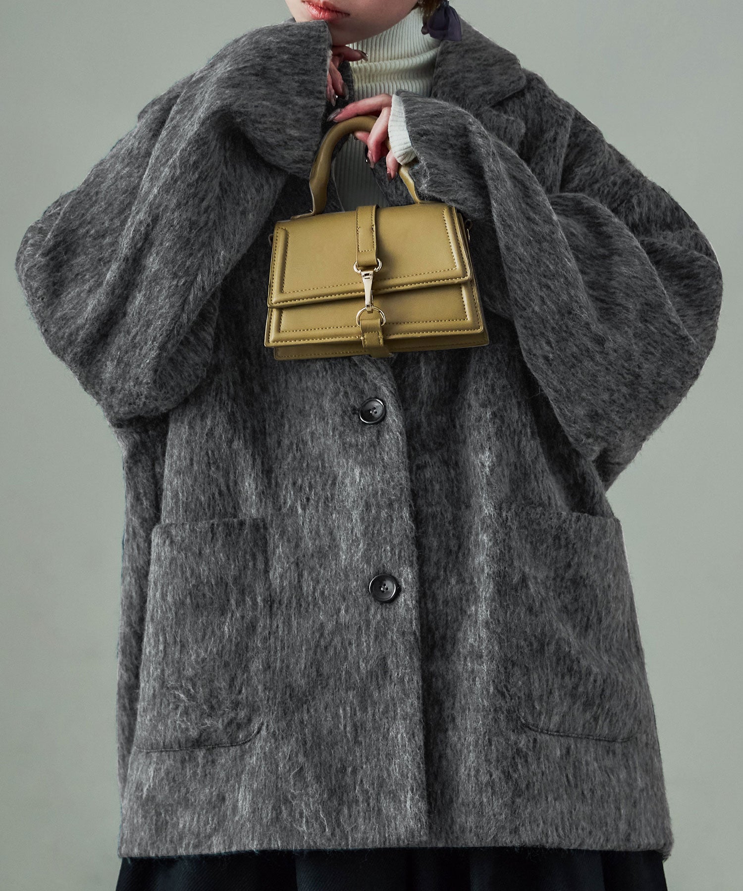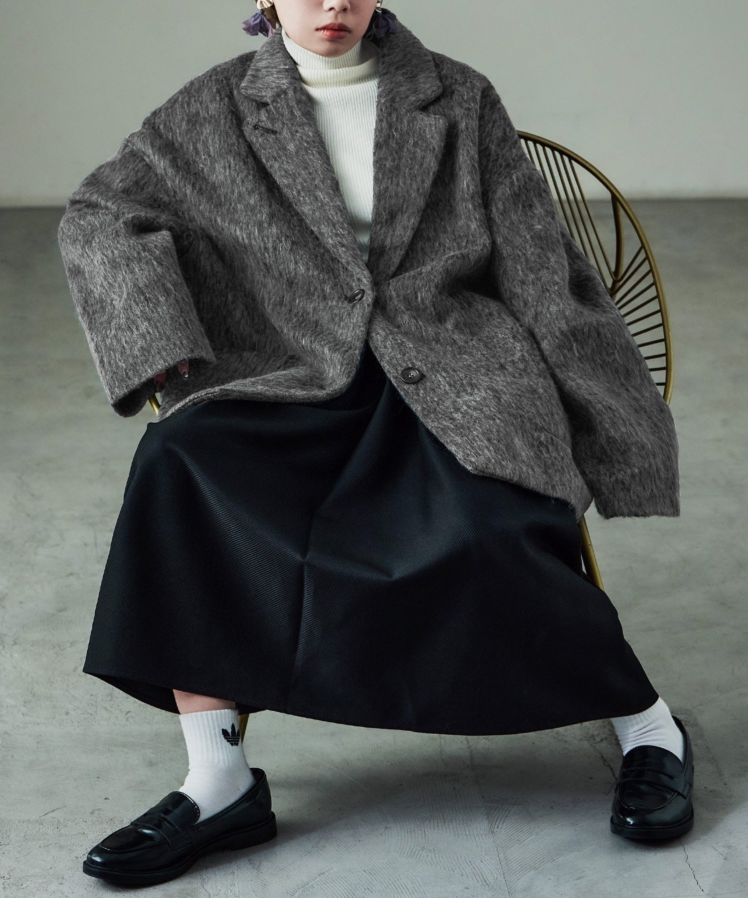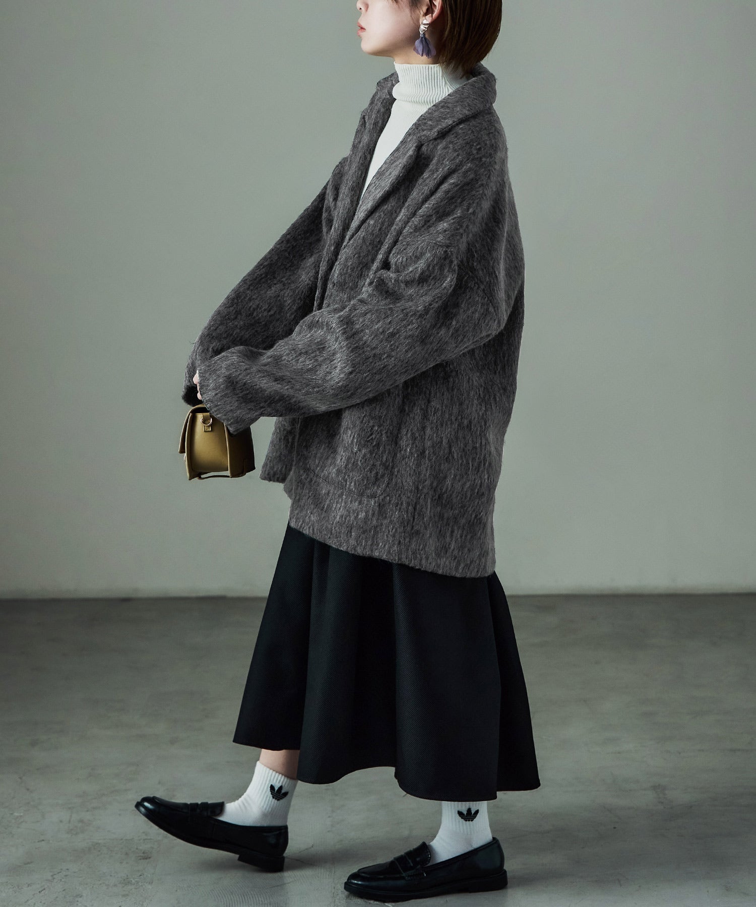雰囲気抜群、肌触りの良いフェザーのようなシャギー素材のジャケットコート。
