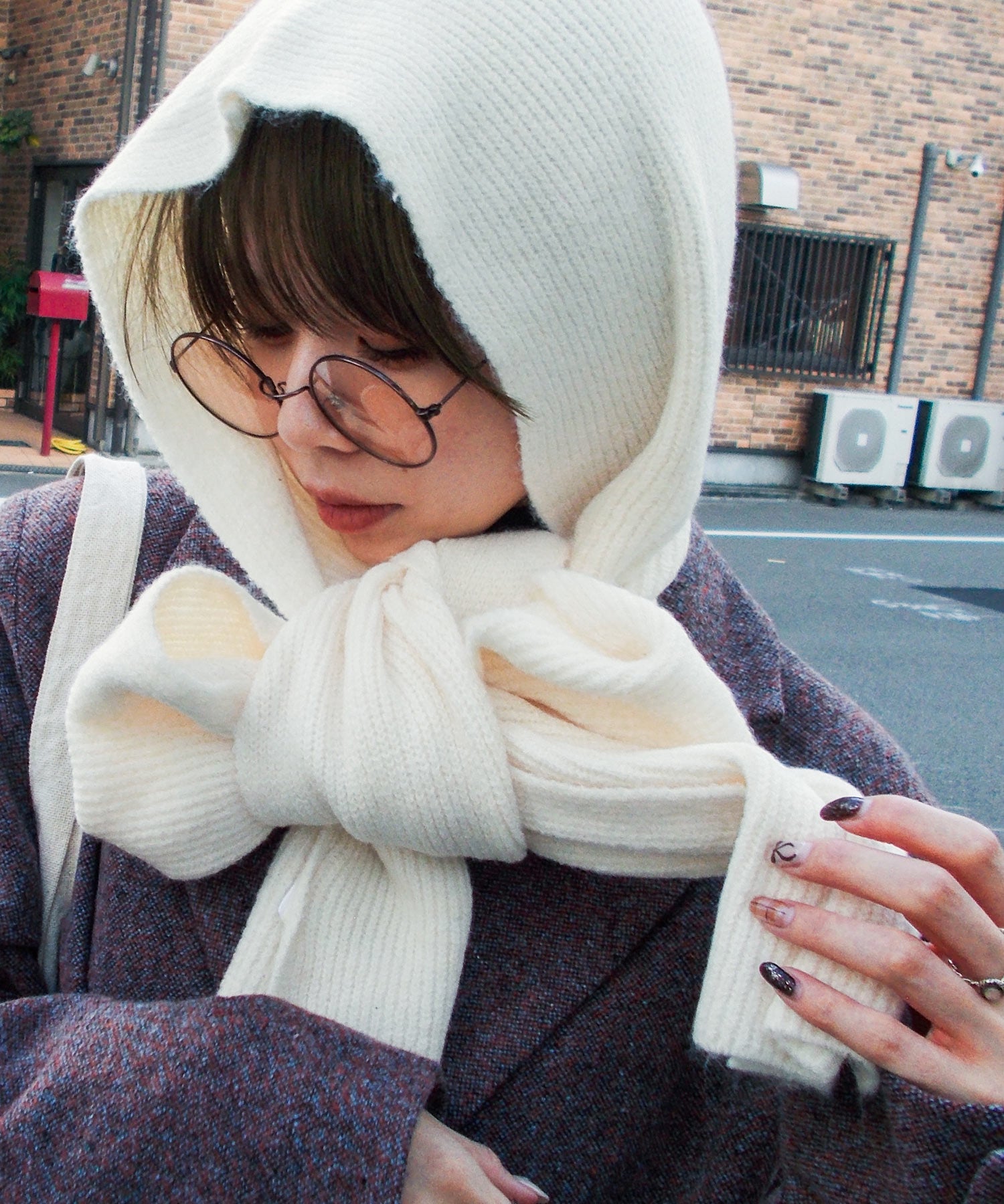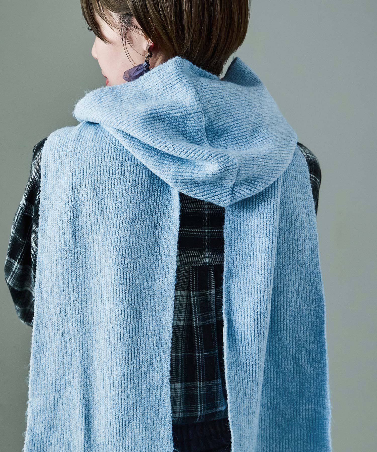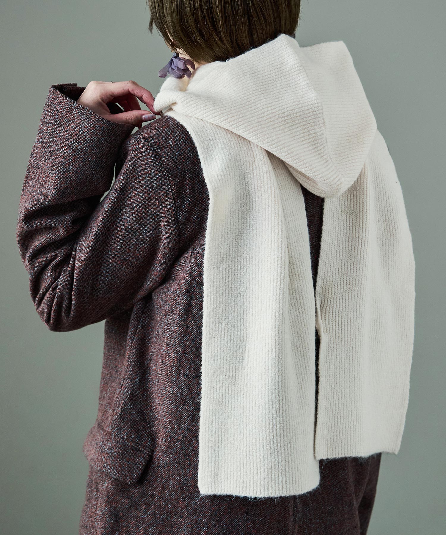 ふわふわ、もちっとした肌触りが心地いいフード付きのマフラー。
