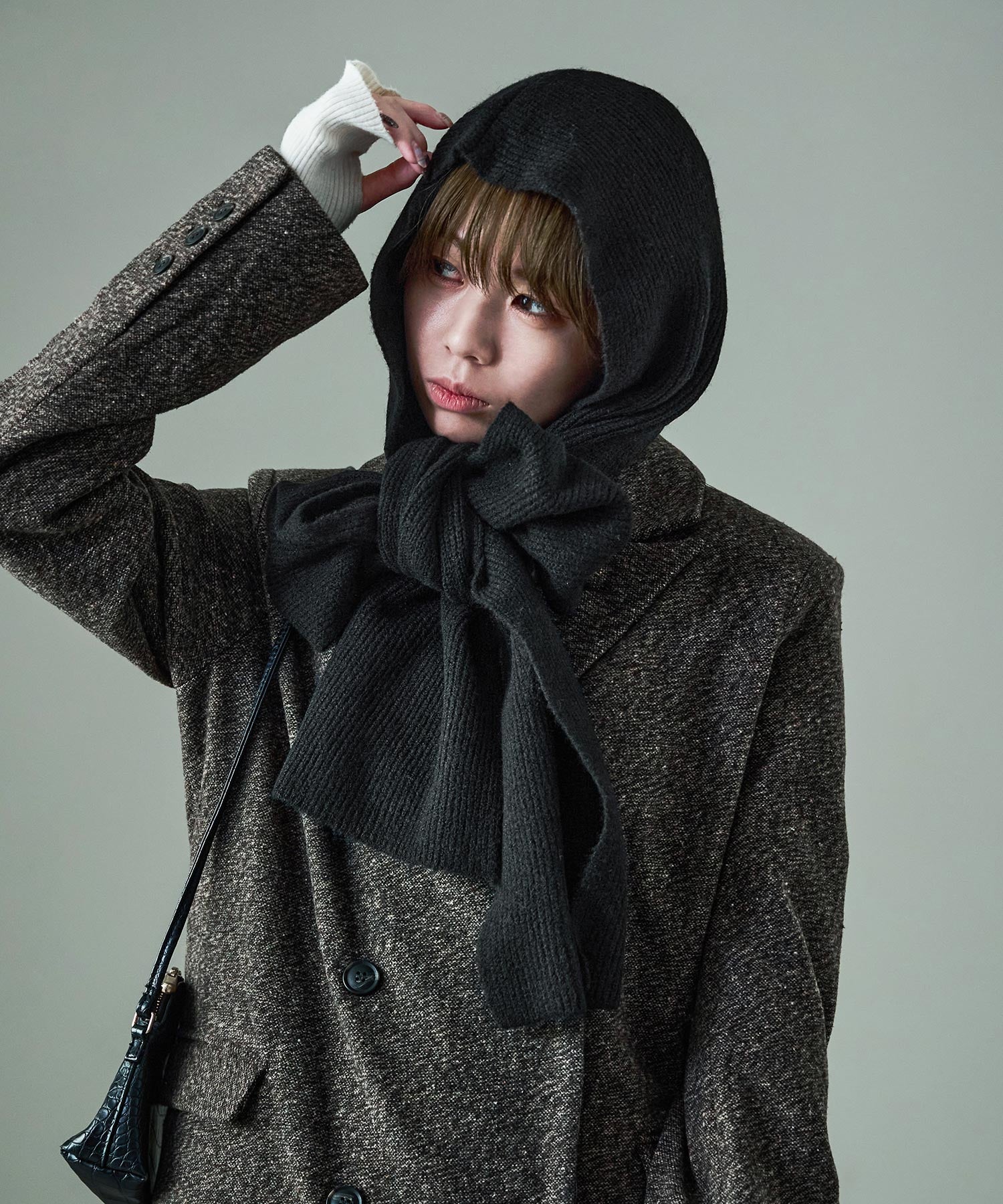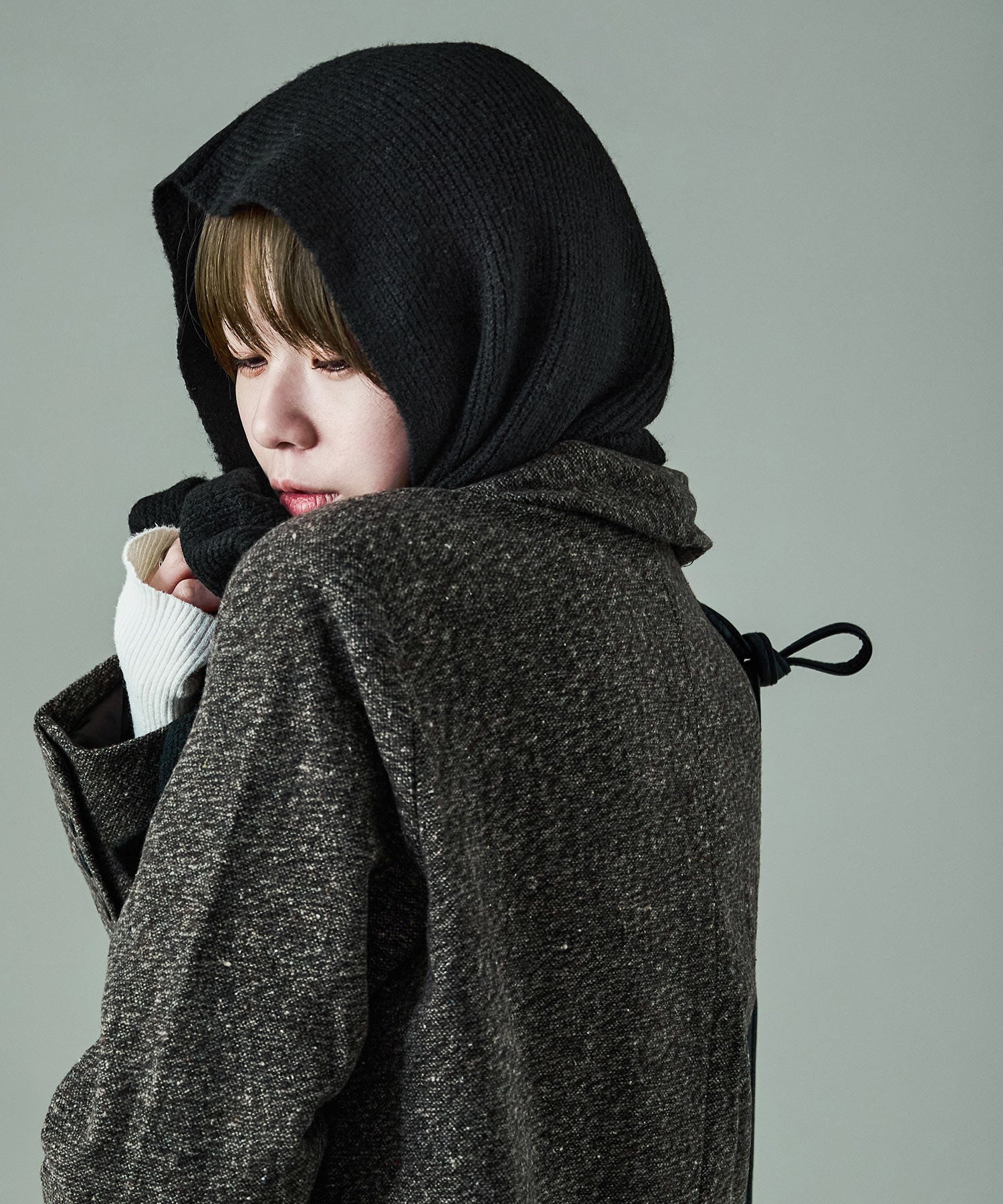 バブーシュカっぽくスタイリングして韓国風にも、あえてフードは下ろした状態でストリート風のコーデも楽しめる。