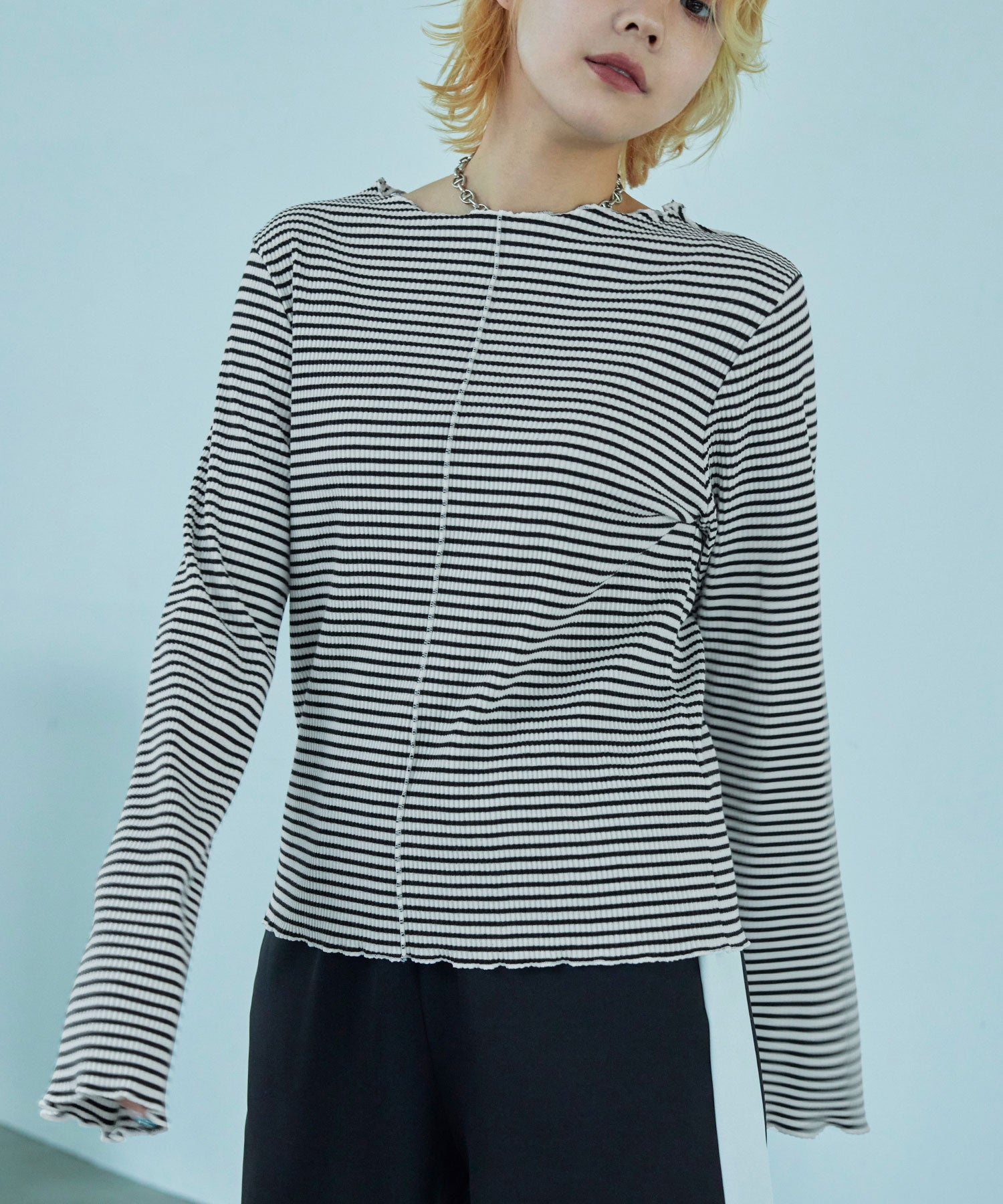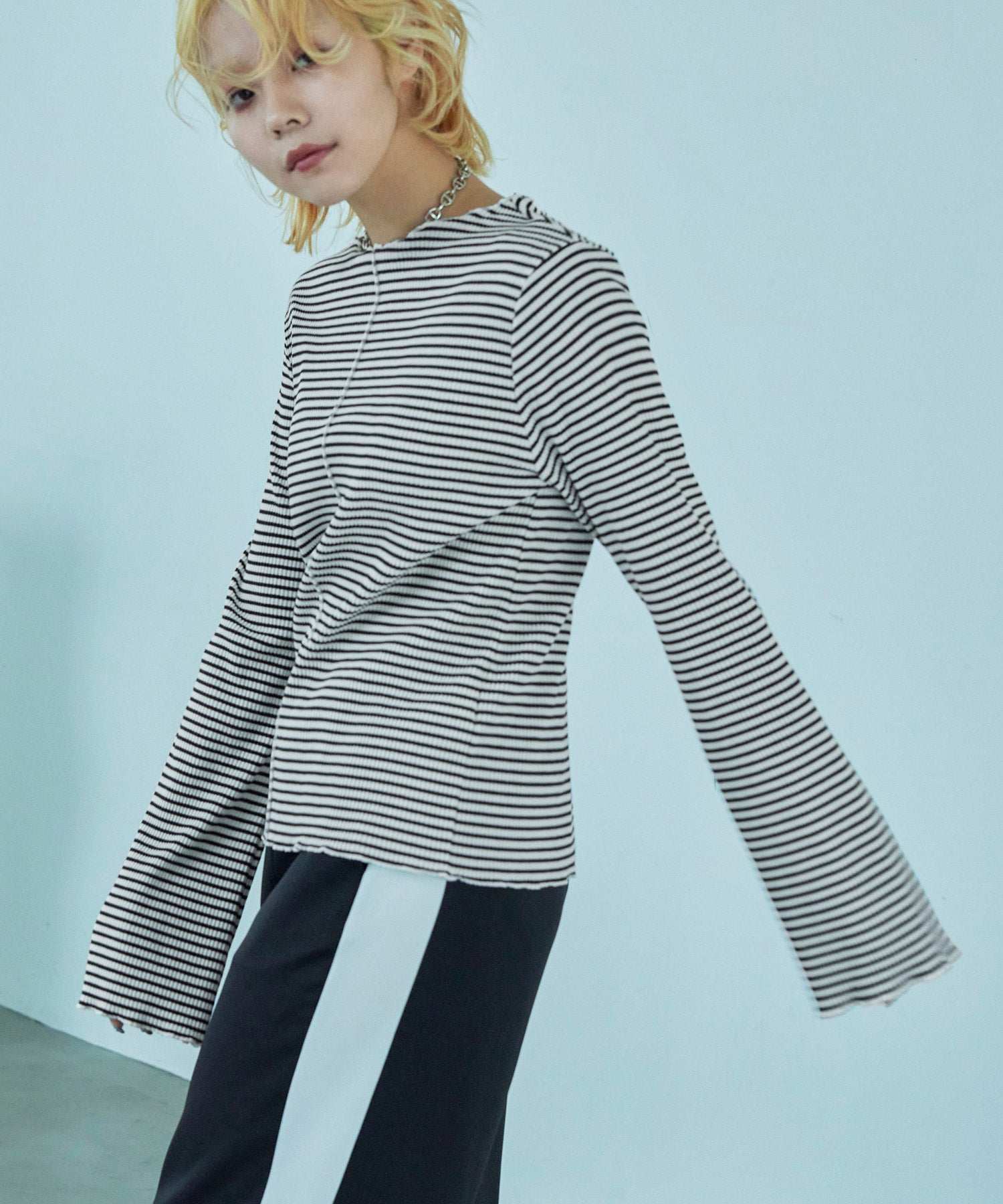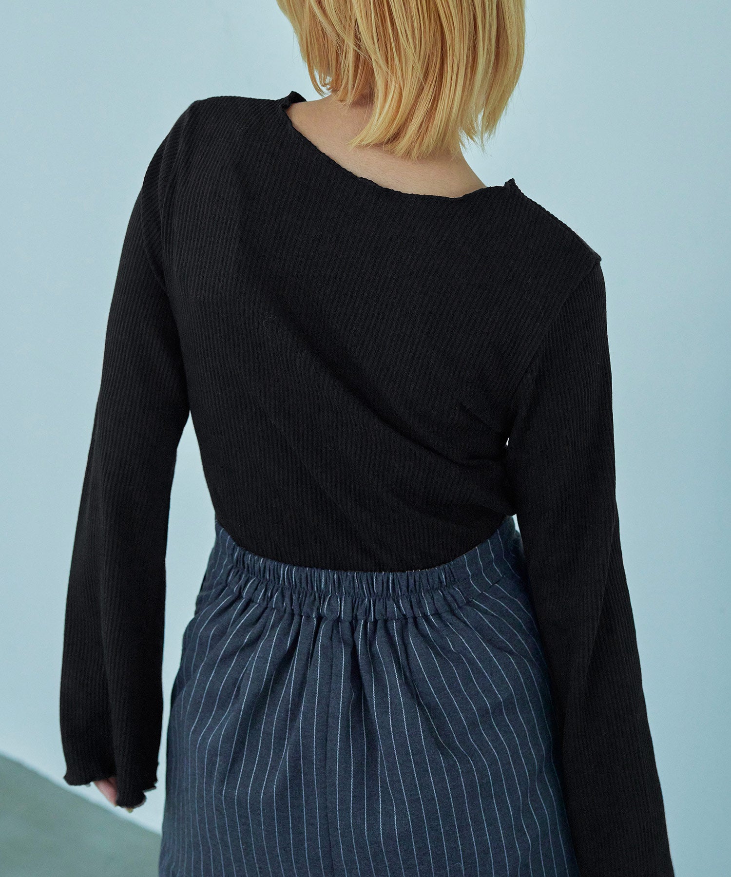 Rname 前後2way メロウリブ プルオーバー トップス カットソー ロンT リブ ベルスリーブ 長袖 Tシャツ 秋 冬 ボーダー ストライプ インナー 韓国ファッション ベーシック