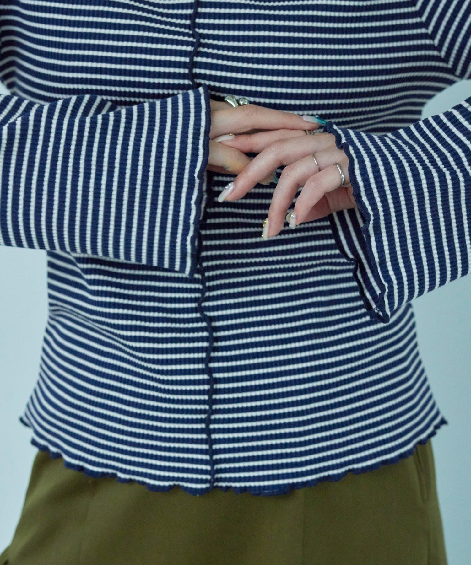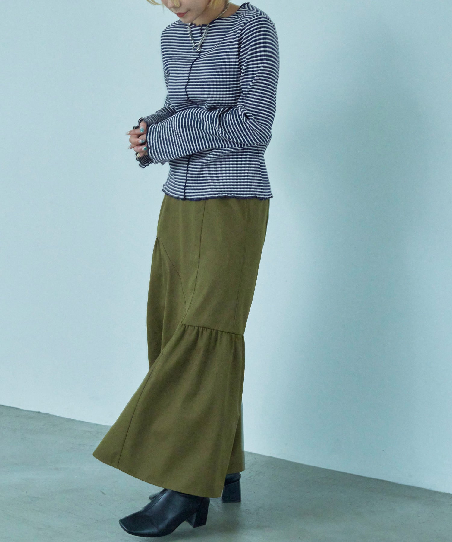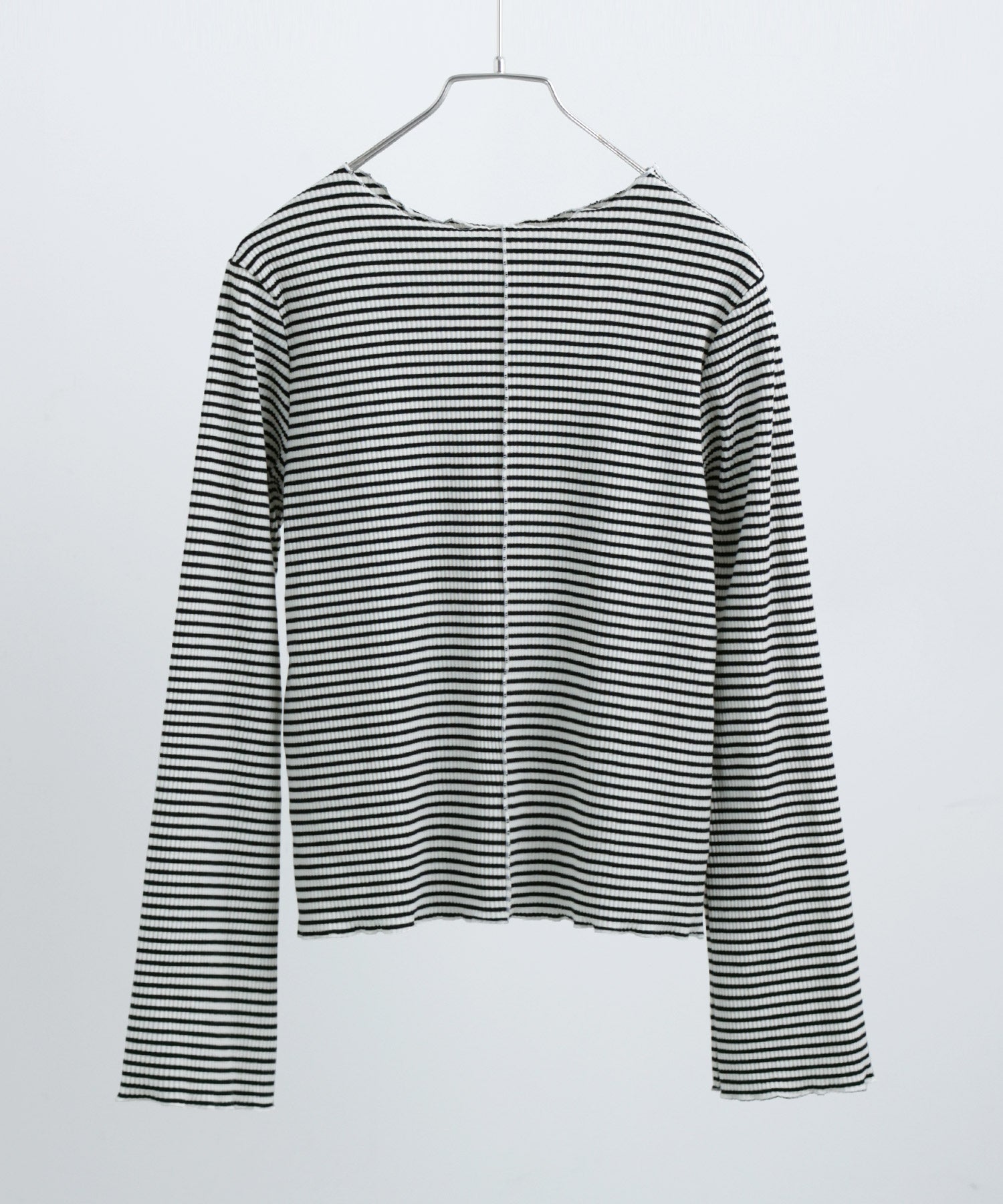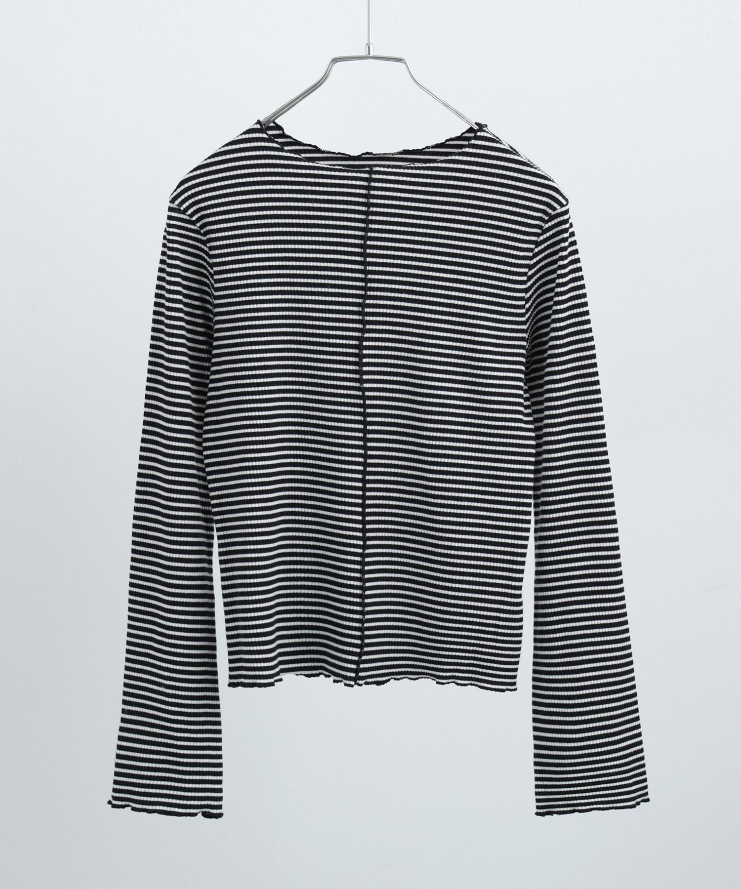 Rname 前後2way メロウリブ プルオーバー トップス カットソー ロンT リブ ベルスリーブ 長袖 Tシャツ 秋 冬 ボーダー ストライプ インナー 韓国ファッション ベーシック