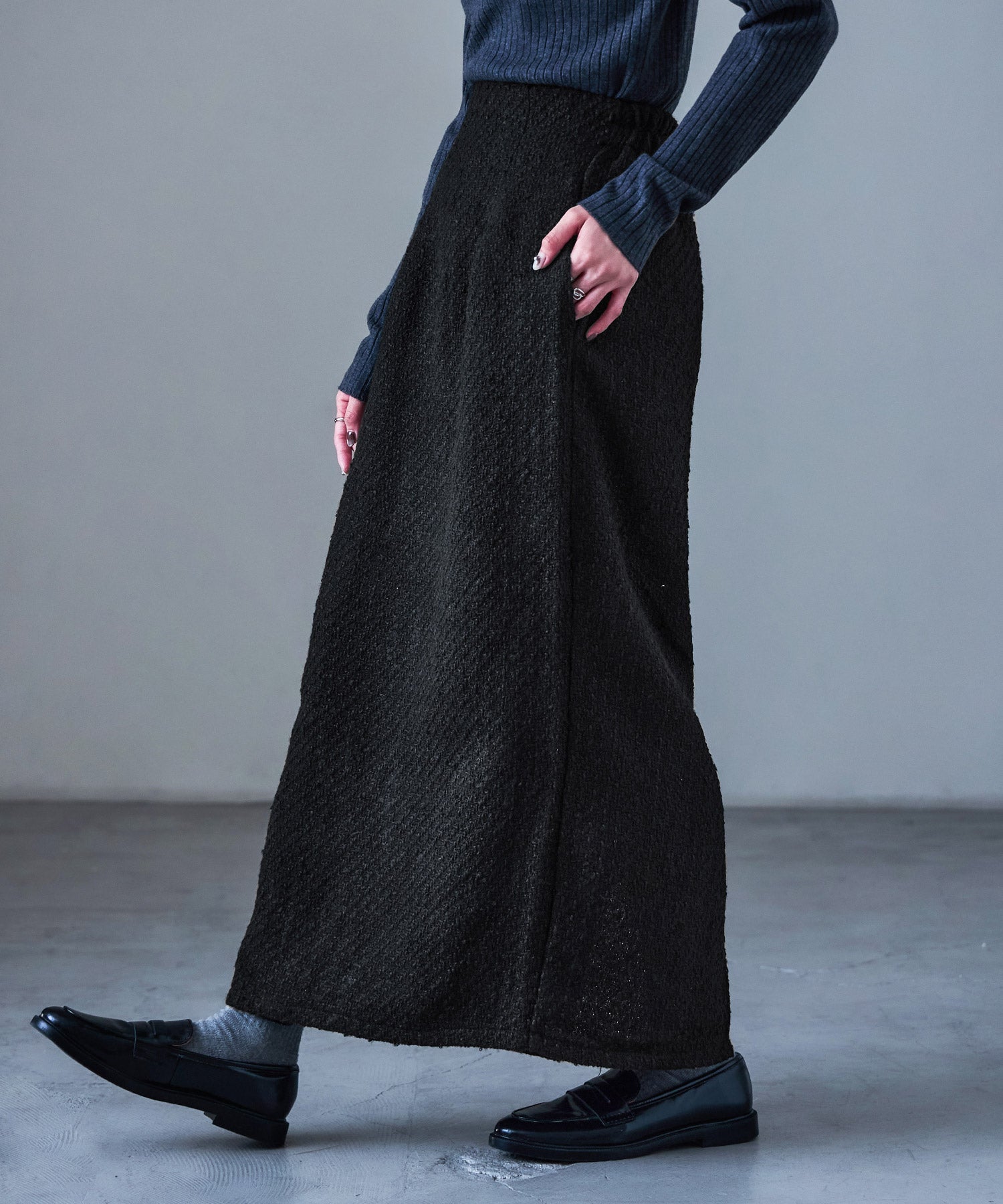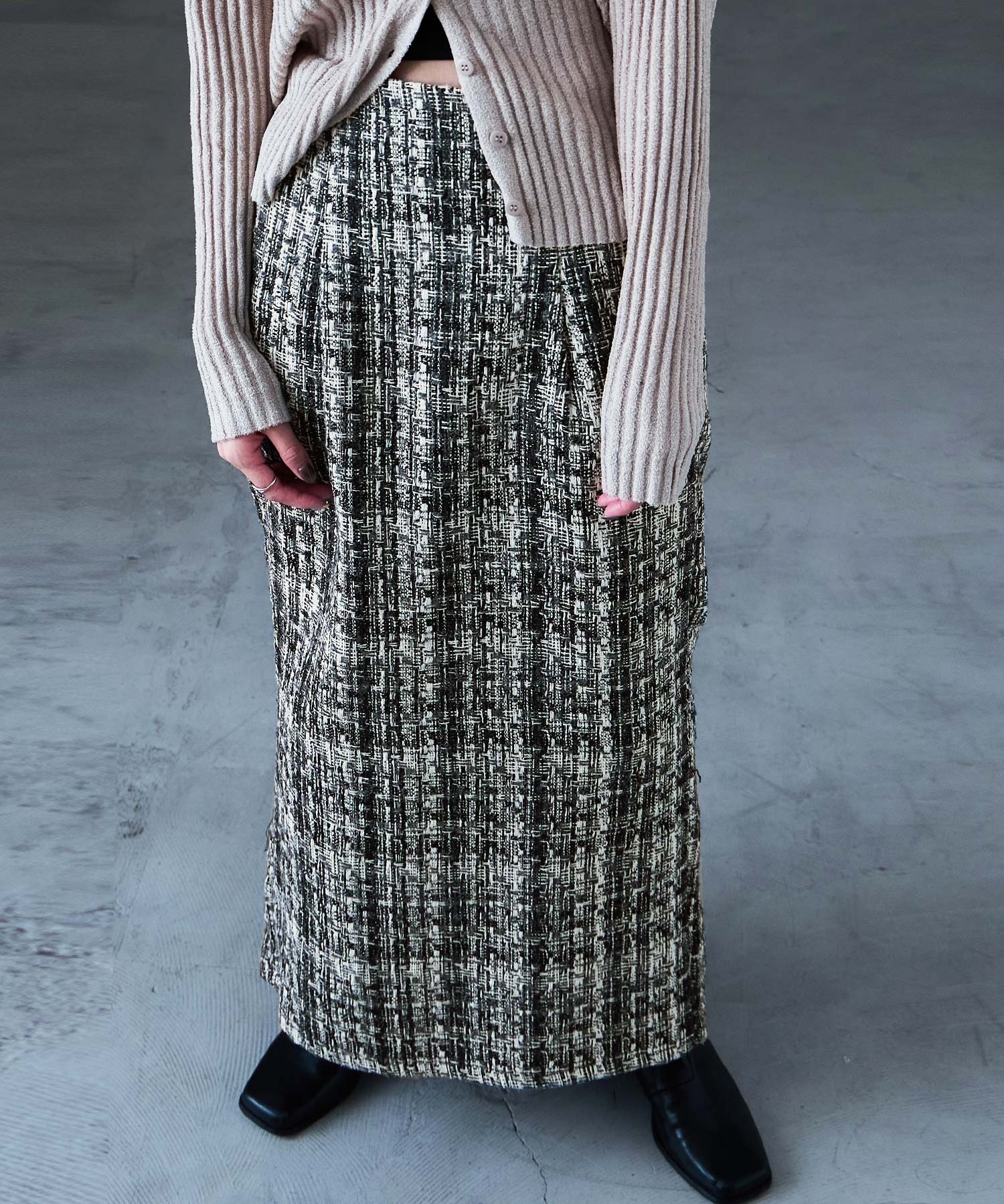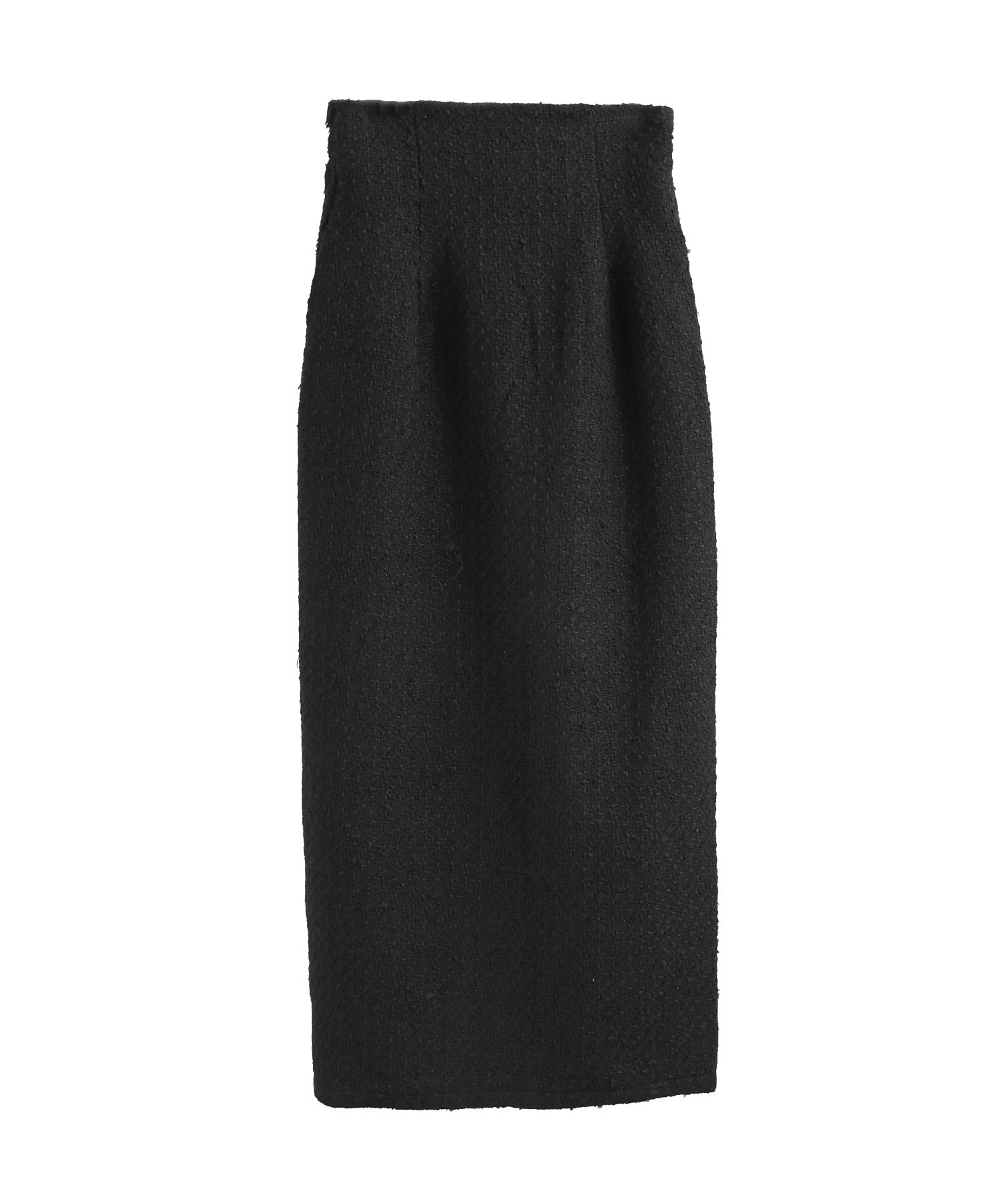 雰囲気抜群、フェミニンかつモードなツイード素材のロングタイトスカート。