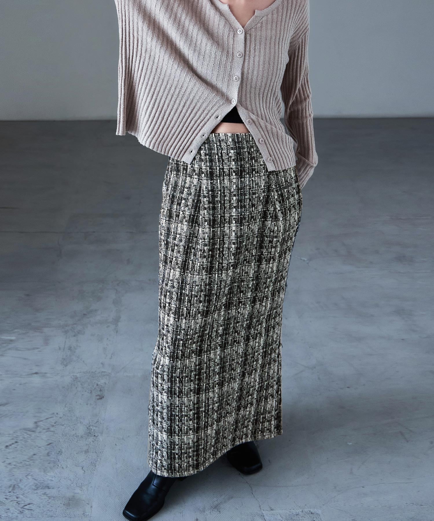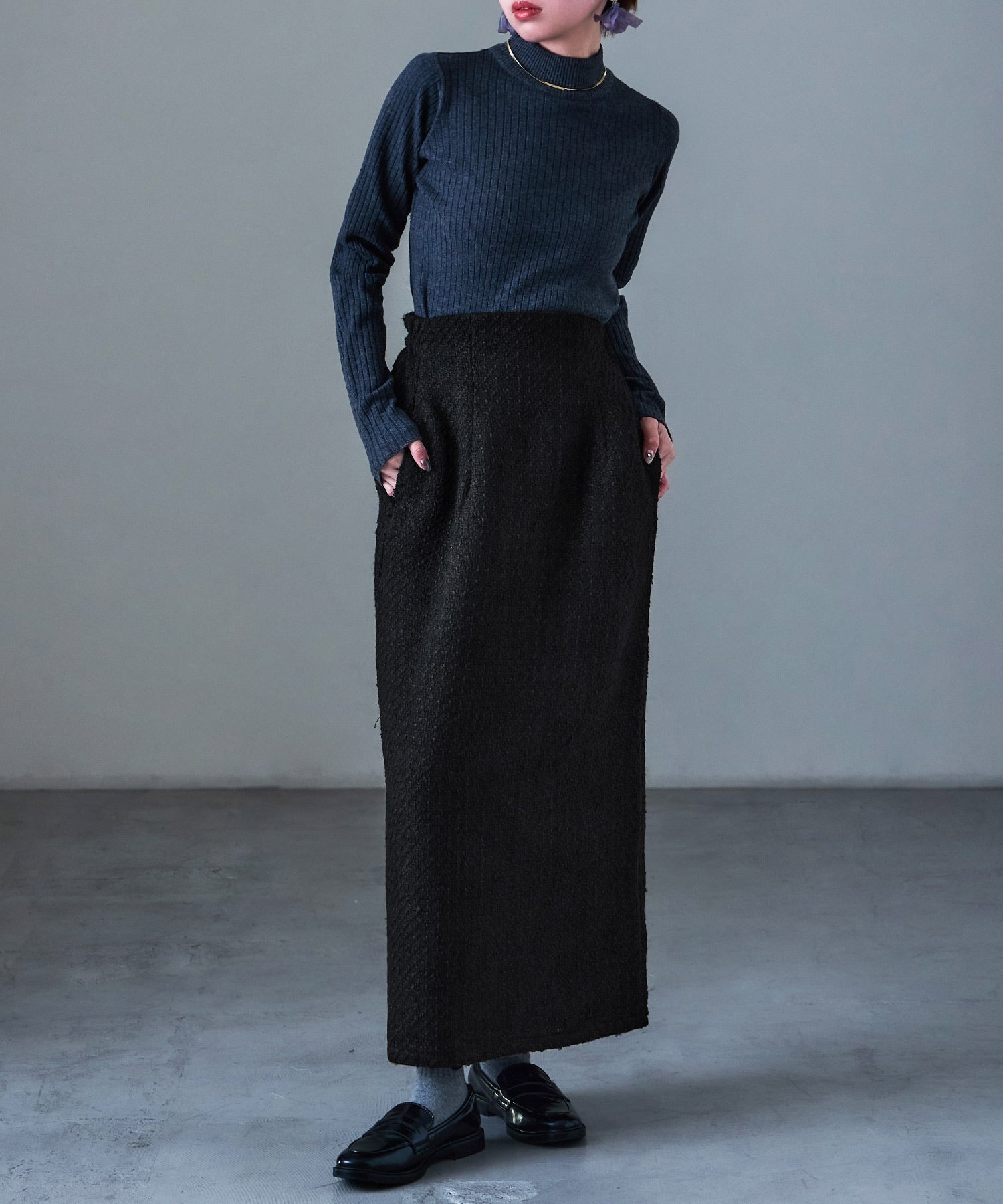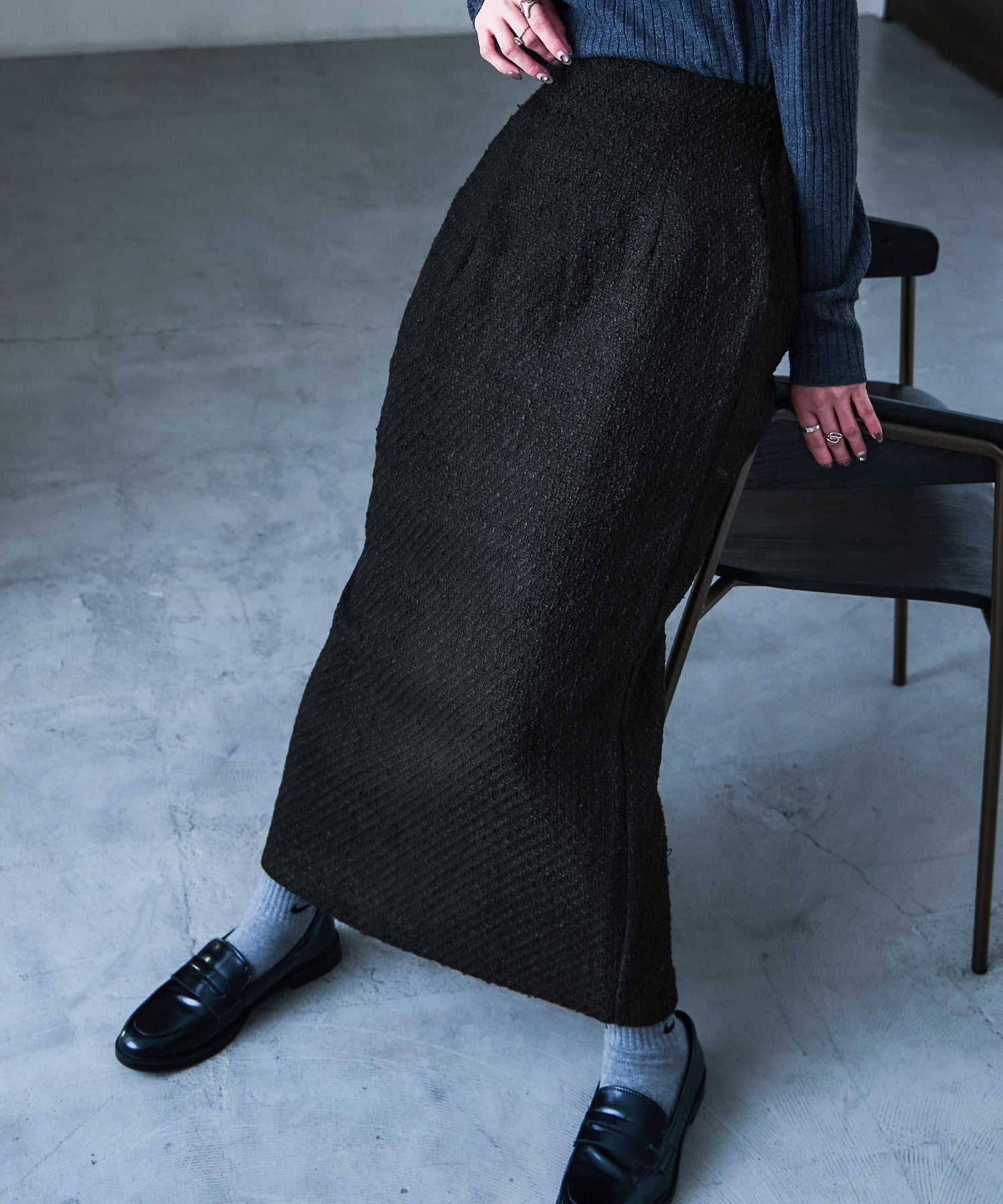 雰囲気抜群、フェミニンかつモードなツイード素材のロングタイトスカート。