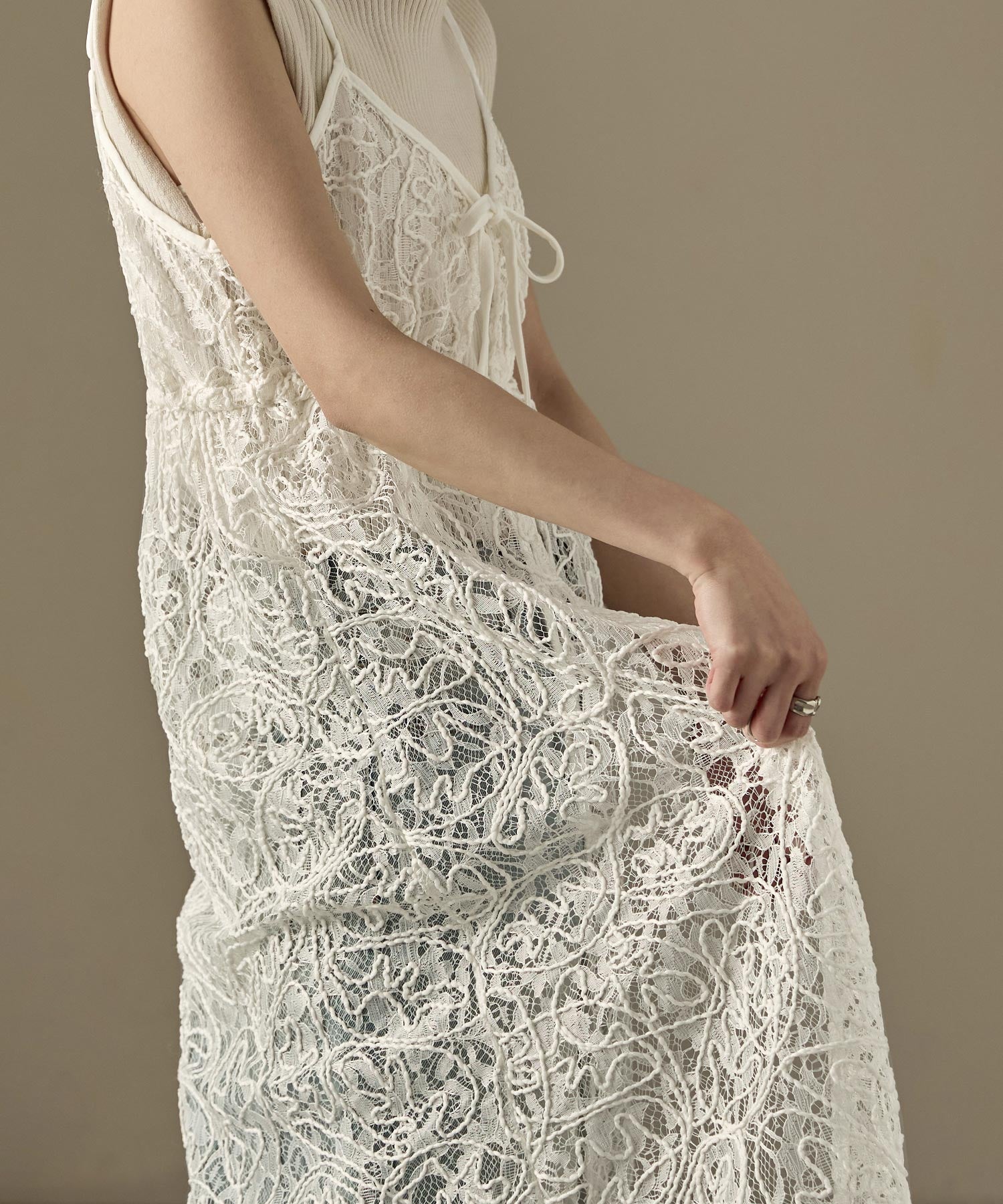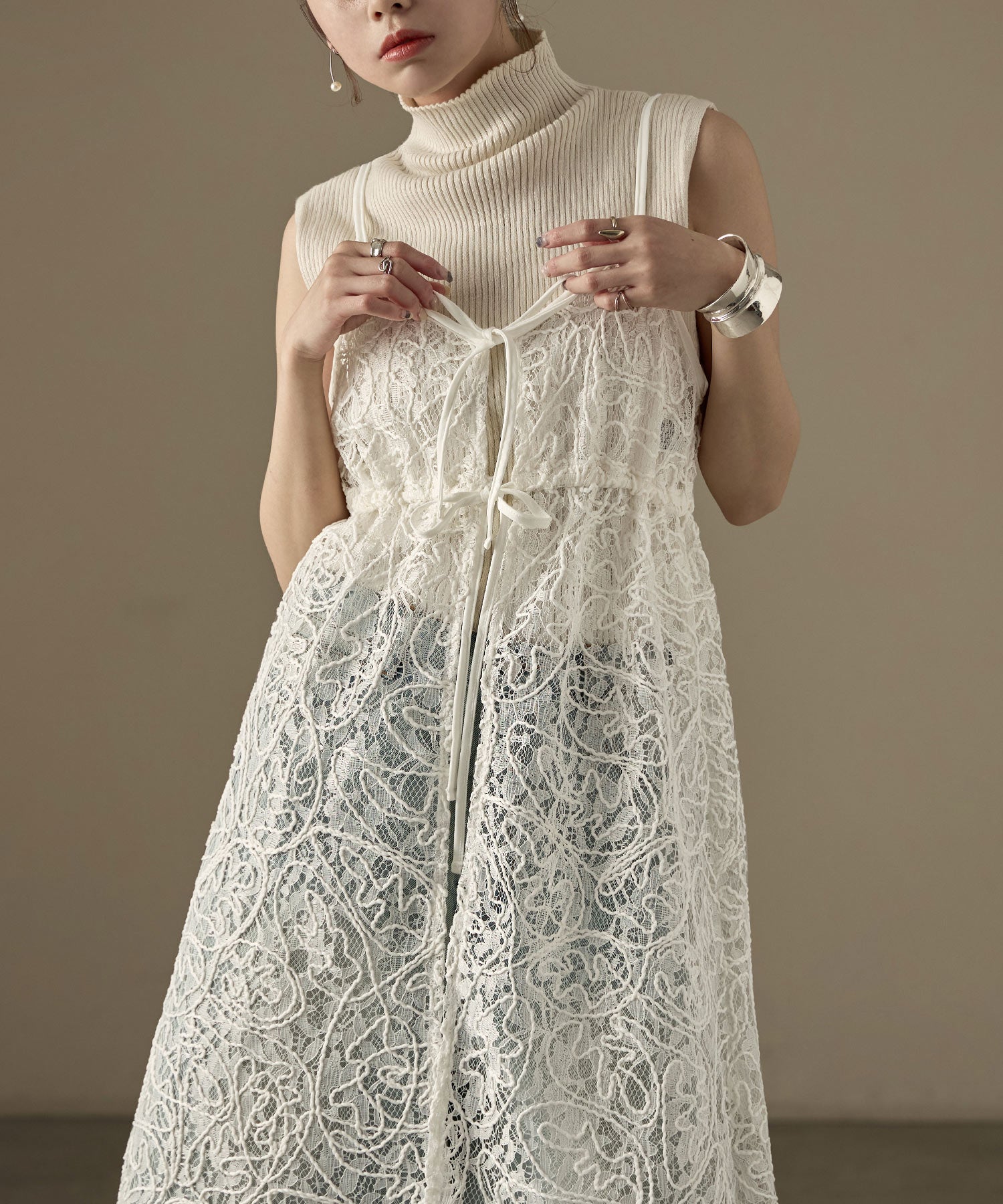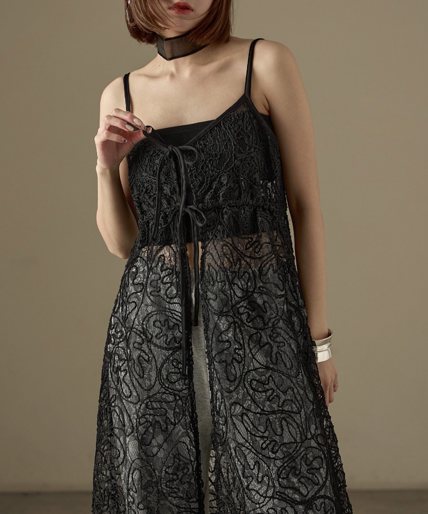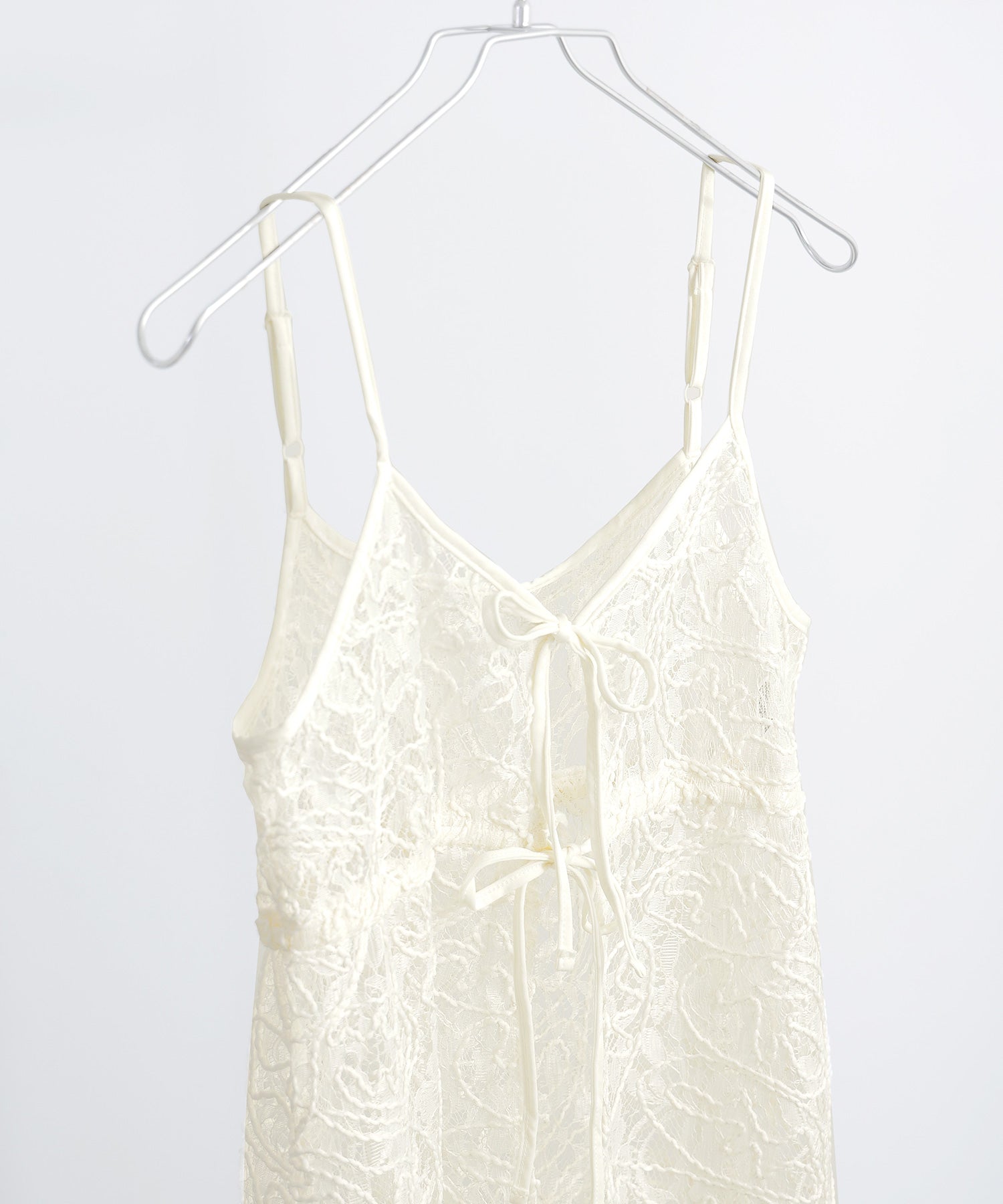 Rname コードレース キャミワンピース 総レース キャミソール ドレス レディース フロントリボン ロング丈 チュール シアー ロングスカート リゾート キャミワンピ オケージョン ノースリーブ ジレ ベスト 高身長 低身長 フェス 海コーデ