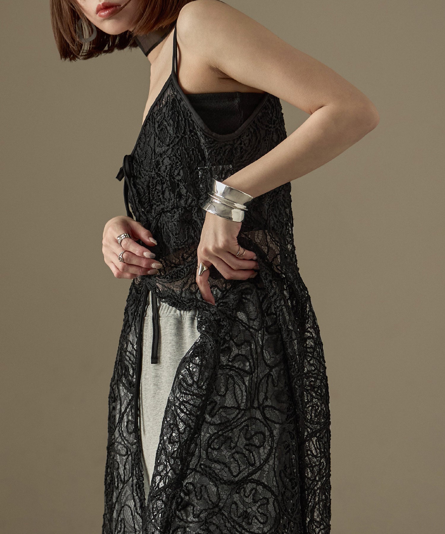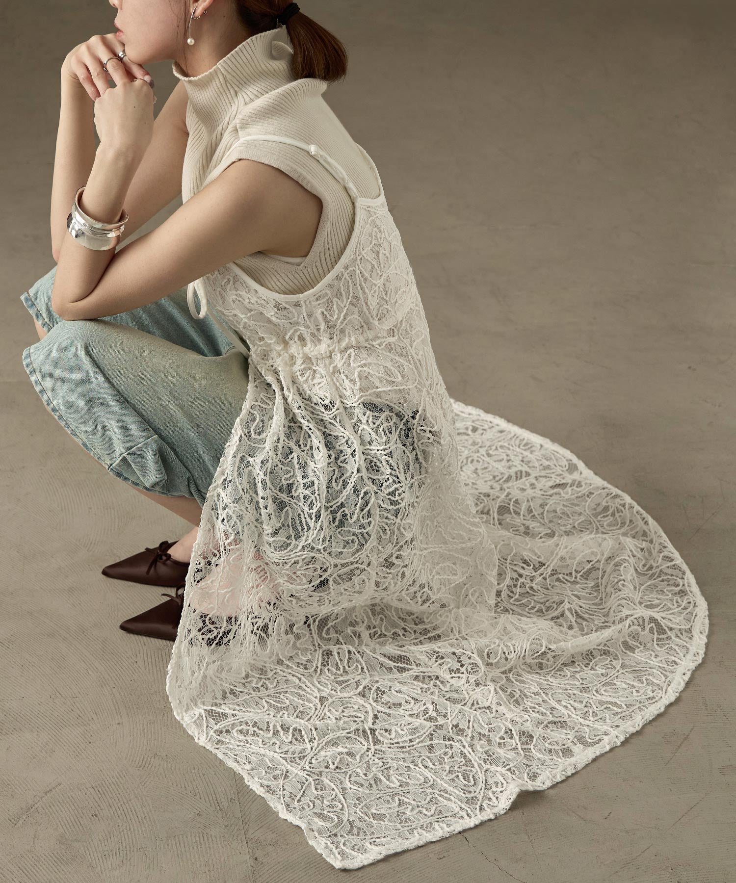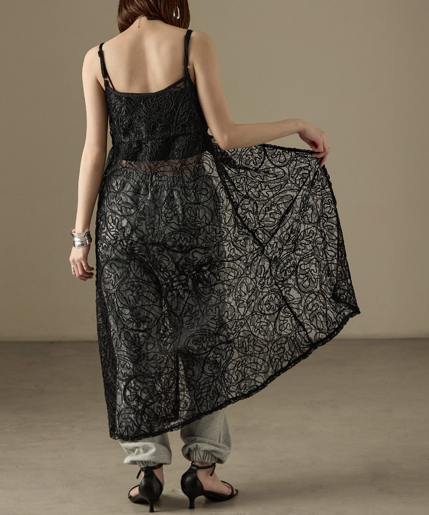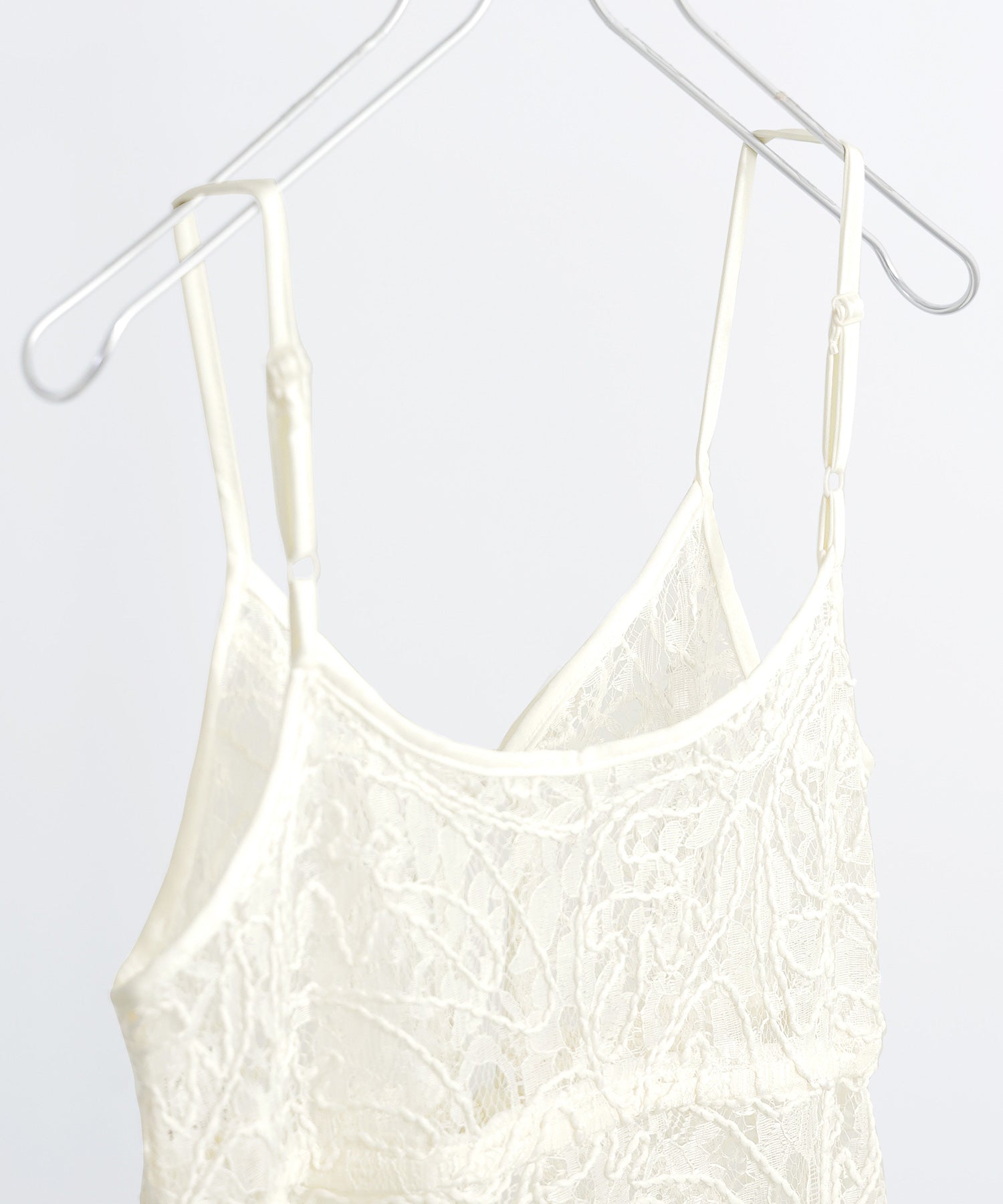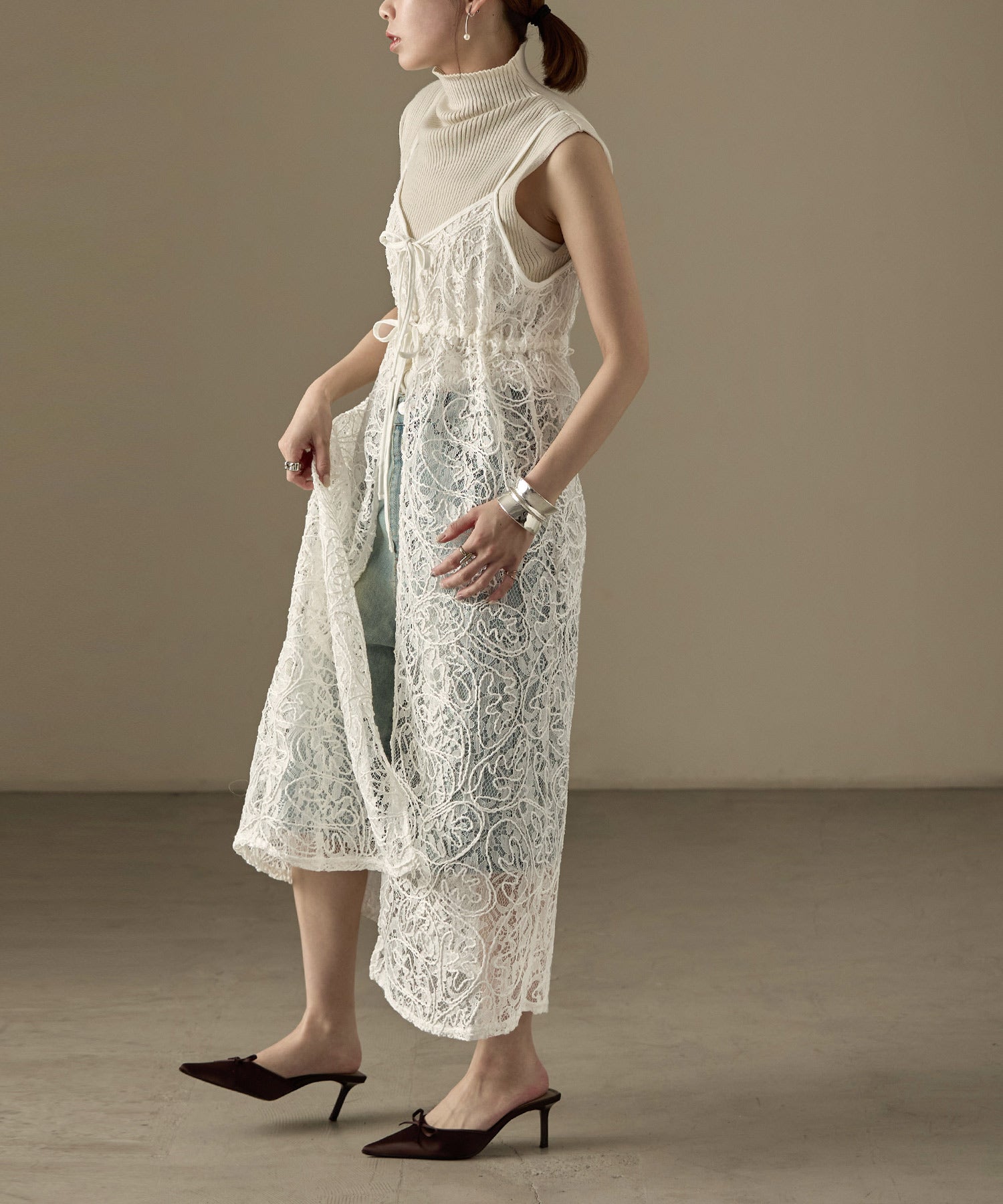 Rname コードレース キャミワンピース 総レース キャミソール ドレス レディース フロントリボン ロング丈 チュール シアー ロングスカート リゾート キャミワンピ オケージョン ノースリーブ ジレ ベスト 高身長 低身長 フェス 海コーデ