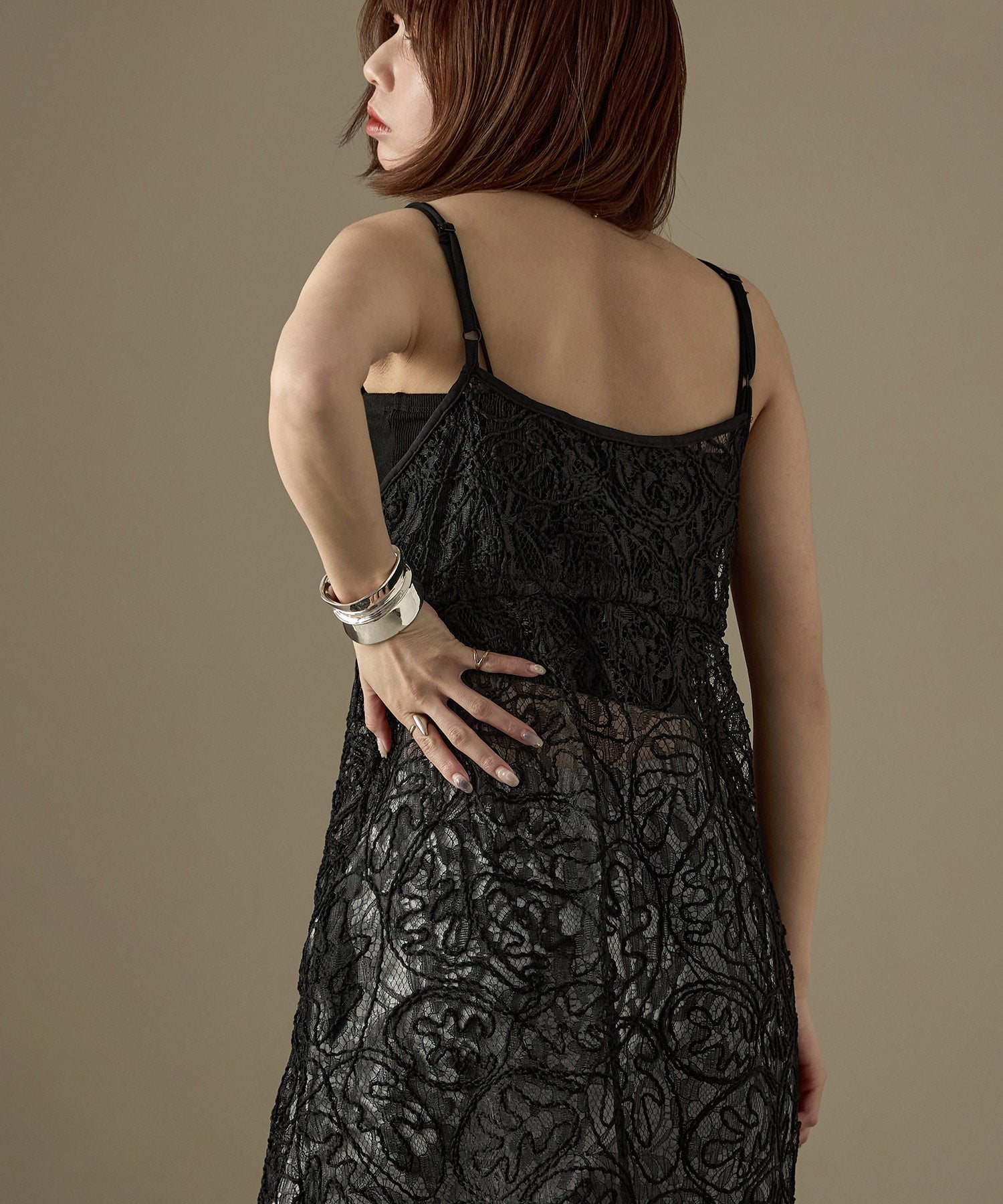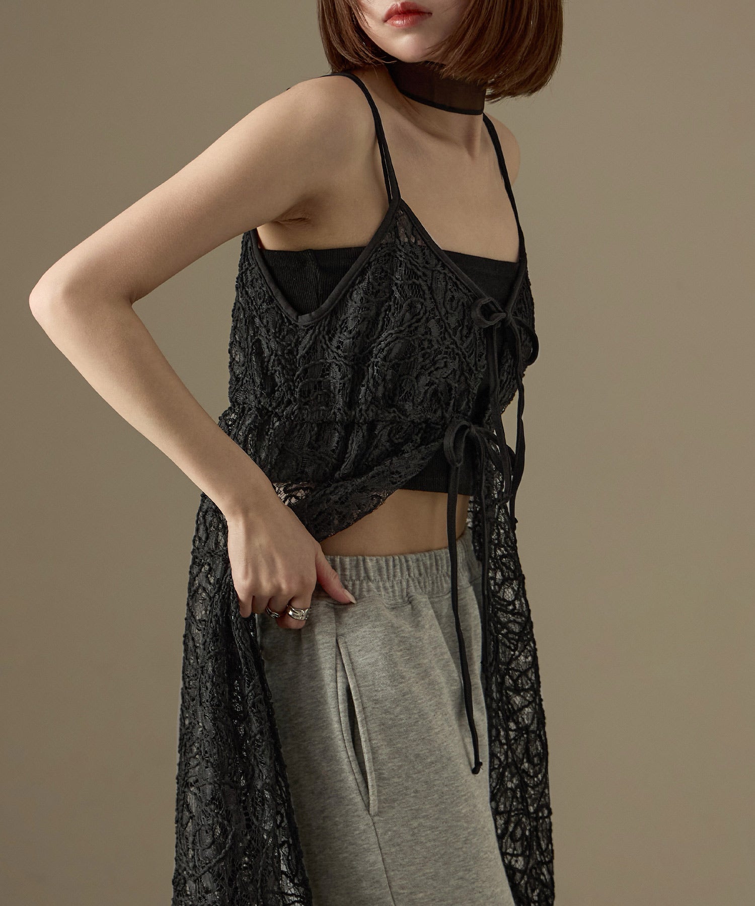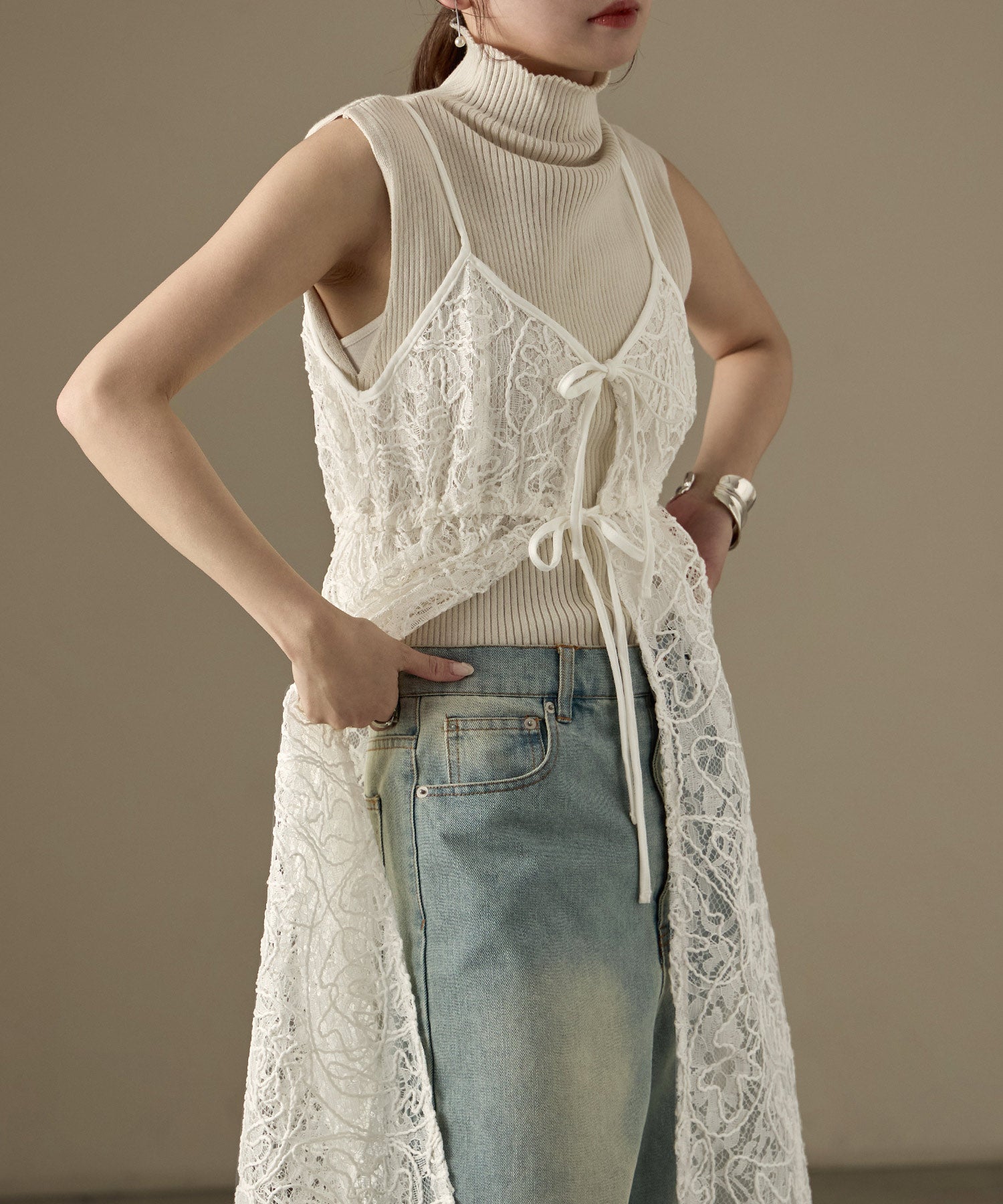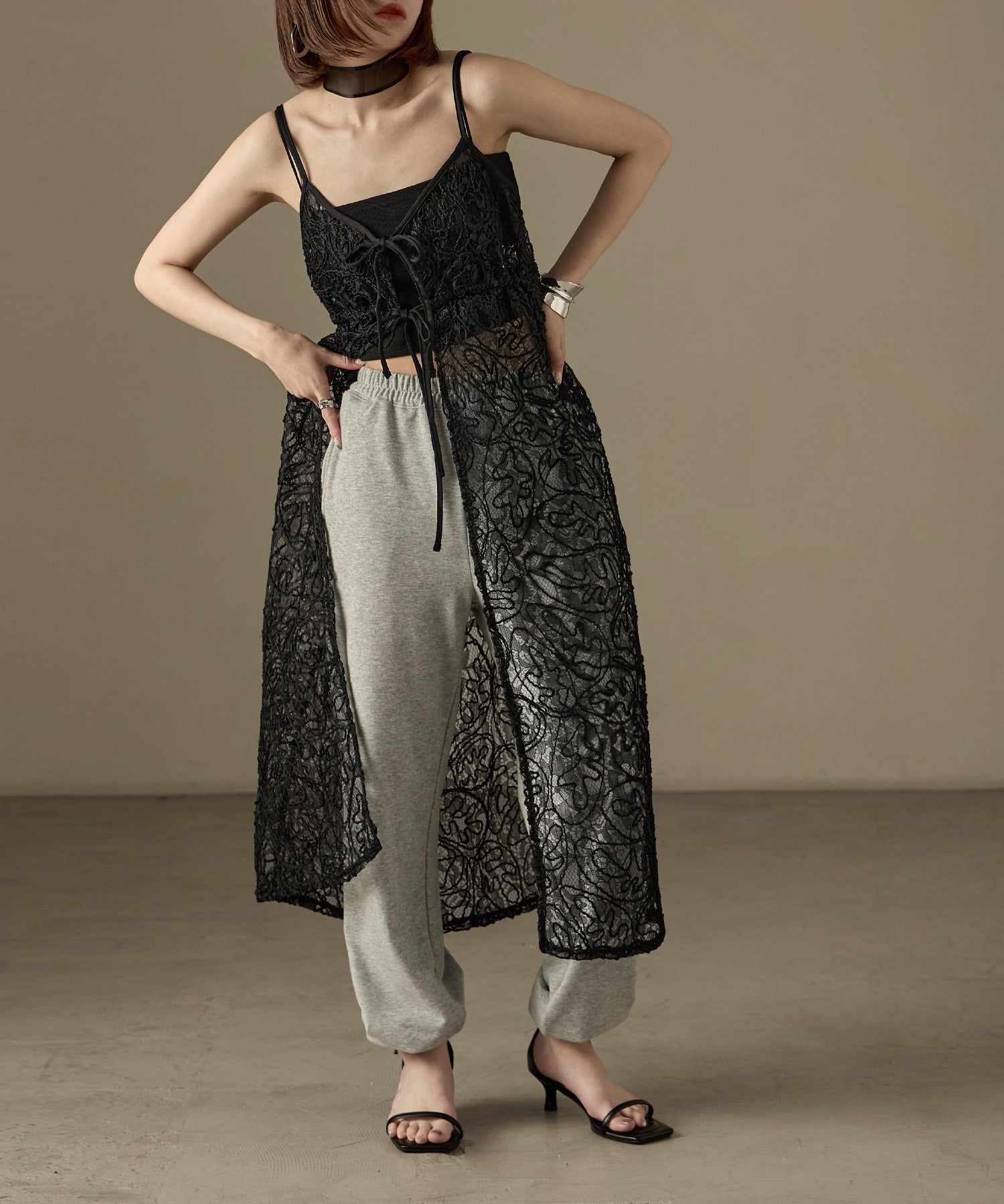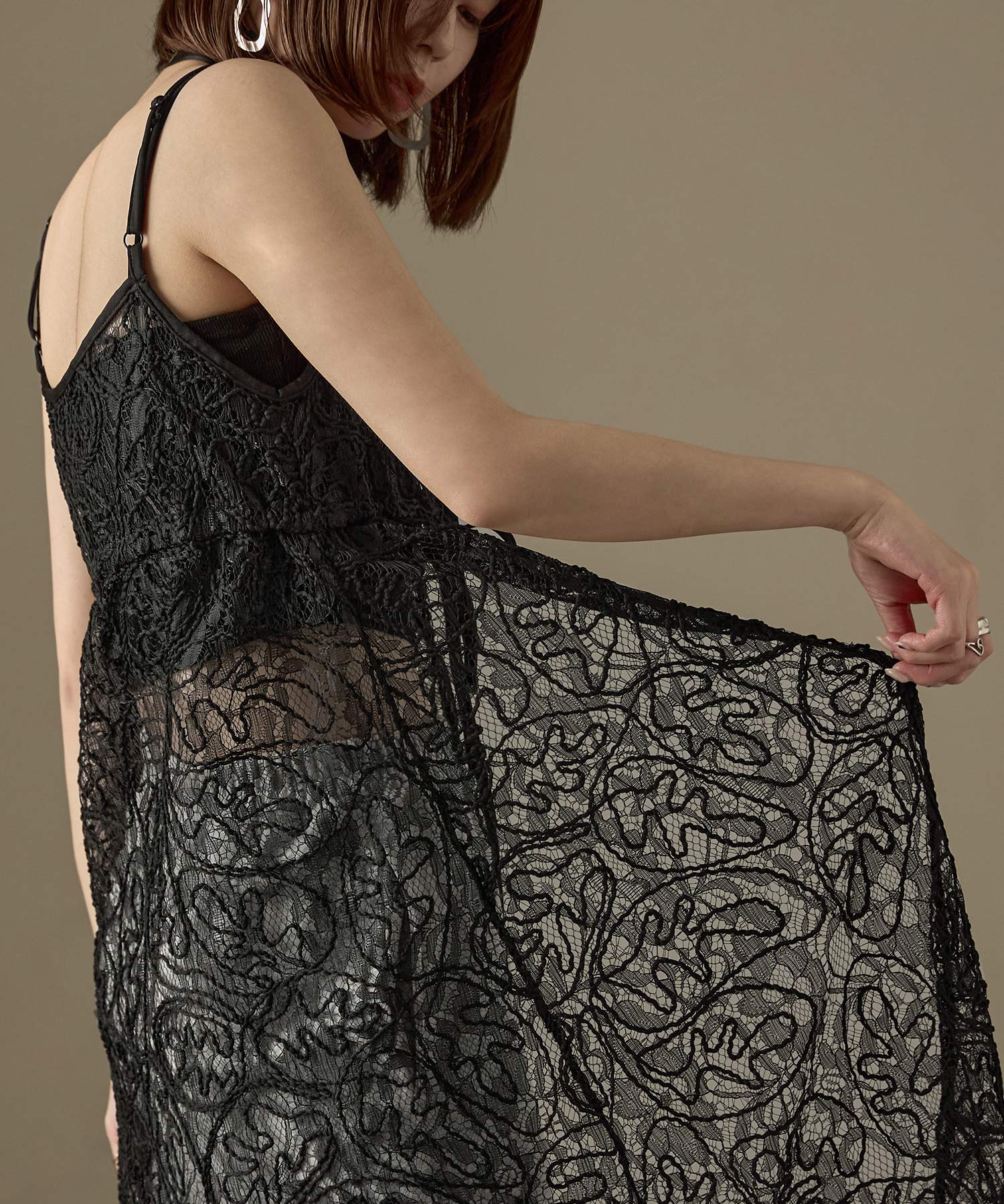 Rname コードレース キャミワンピース 総レース キャミソール ドレス レディース フロントリボン ロング丈 チュール シアー ロングスカート リゾート キャミワンピ オケージョン ノースリーブ ジレ ベスト 高身長 低身長 フェス 海コーデ