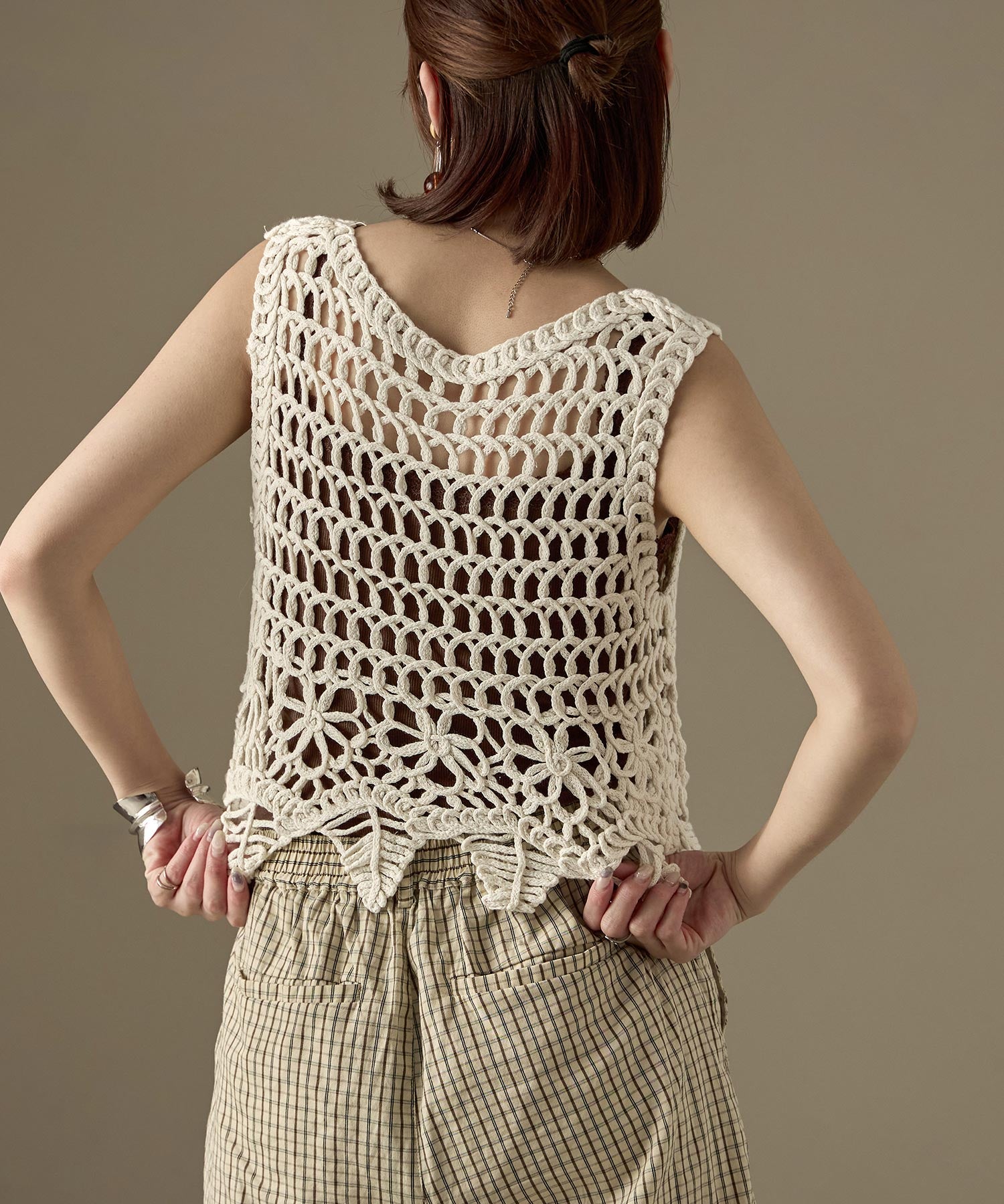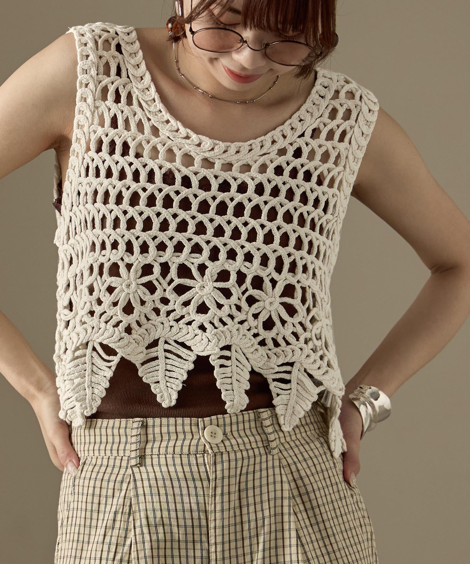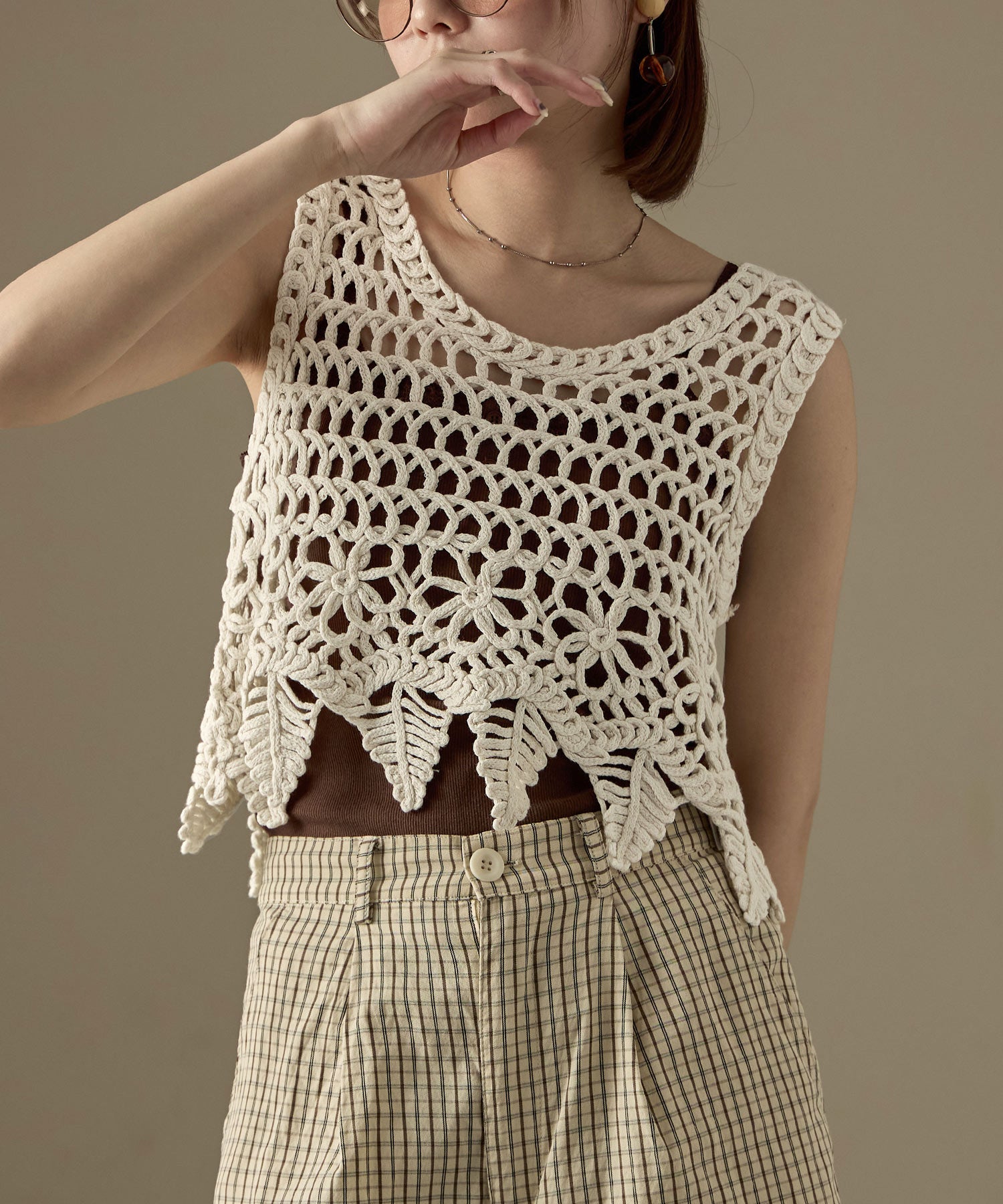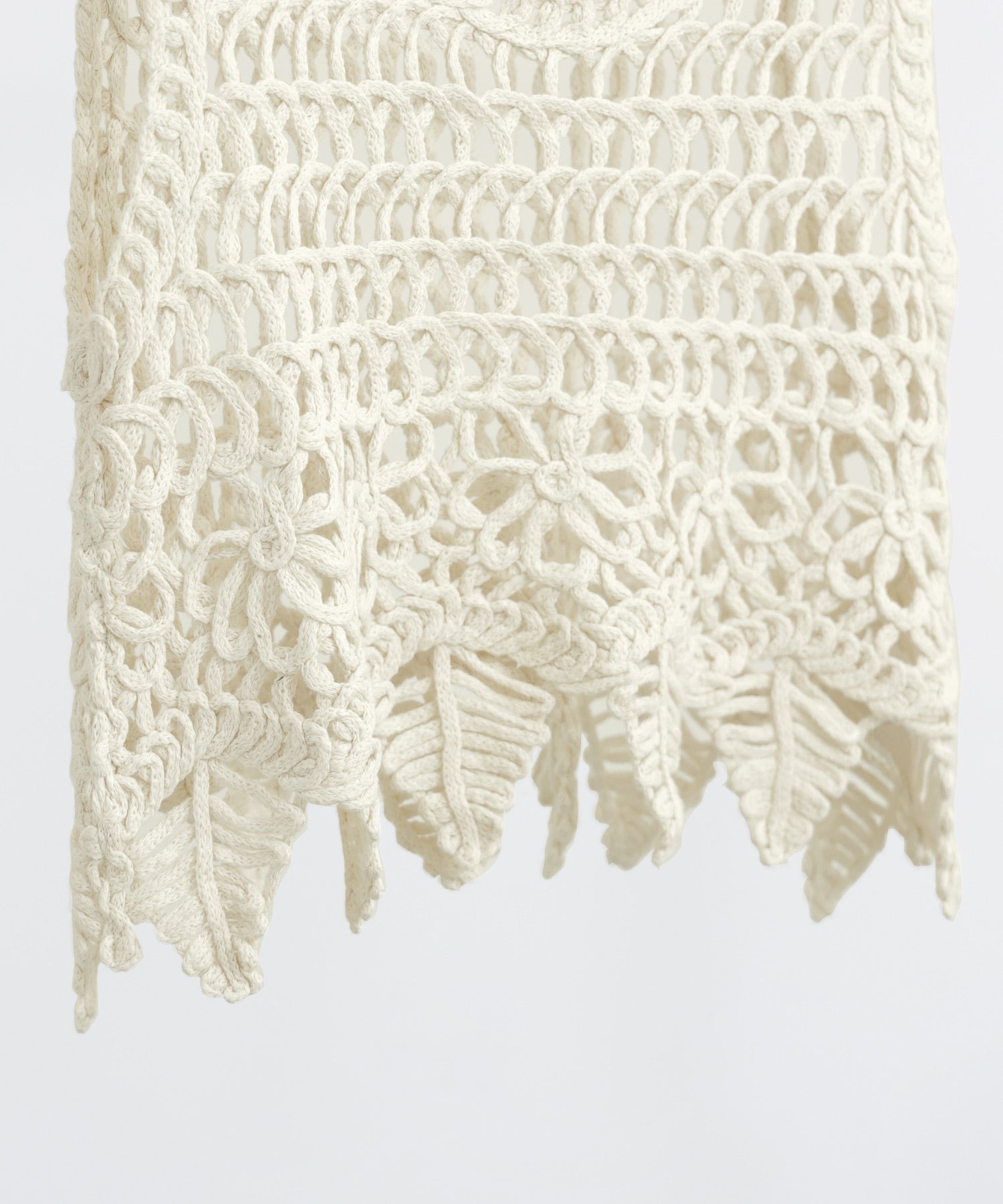 シンプルながらも花柄のかぎ針編みと裾のスカラップデザインでフェミニンな雰囲気。