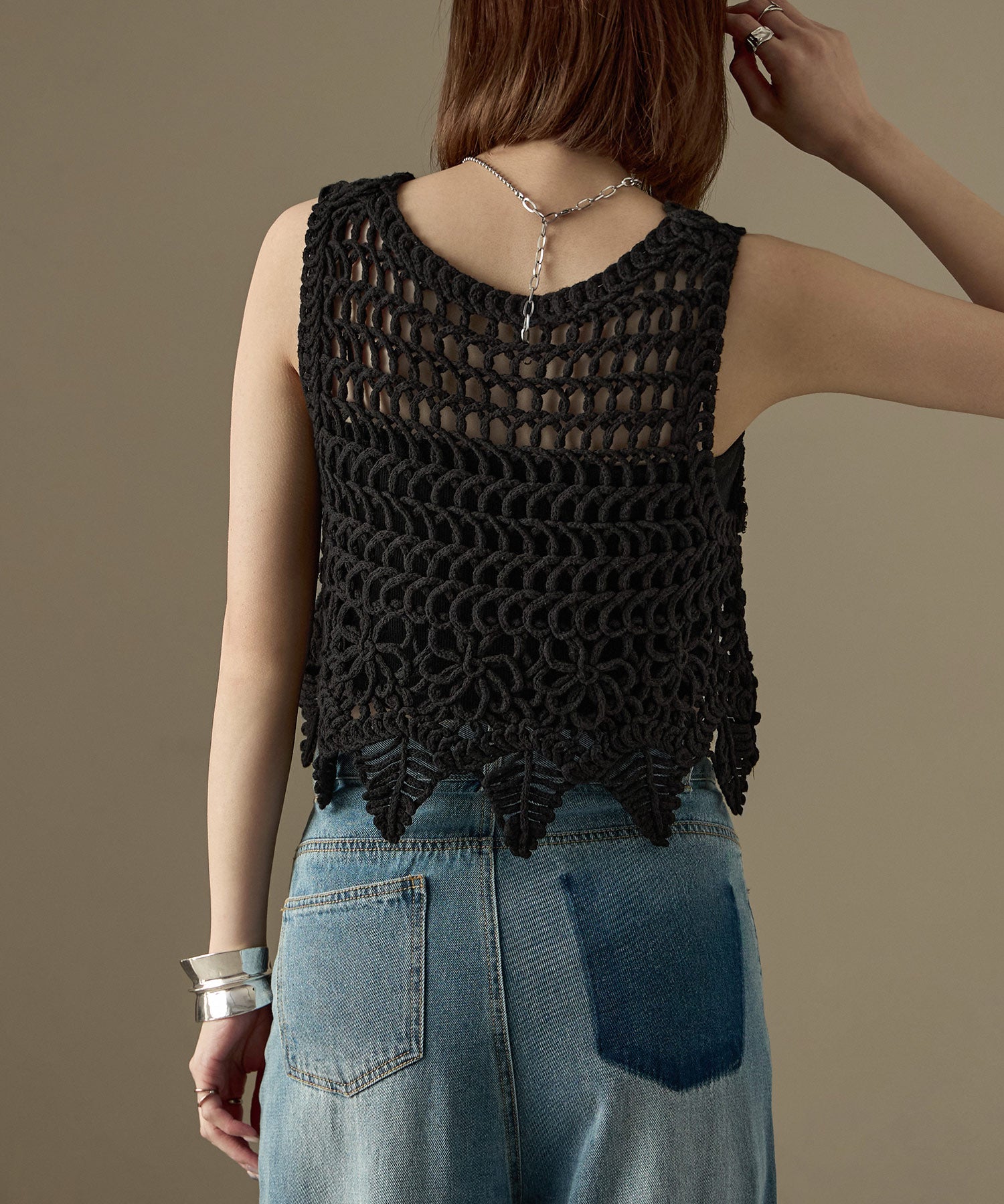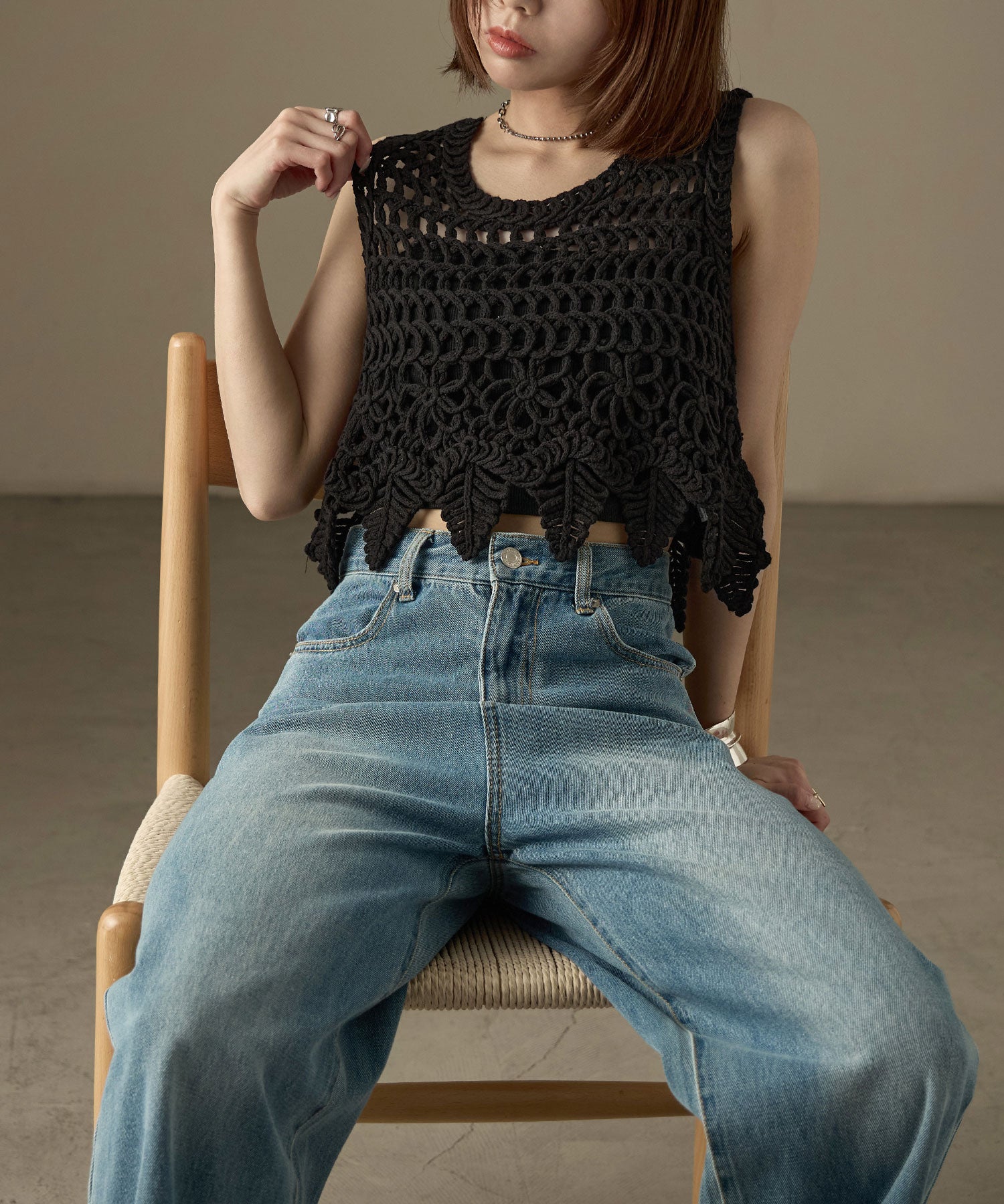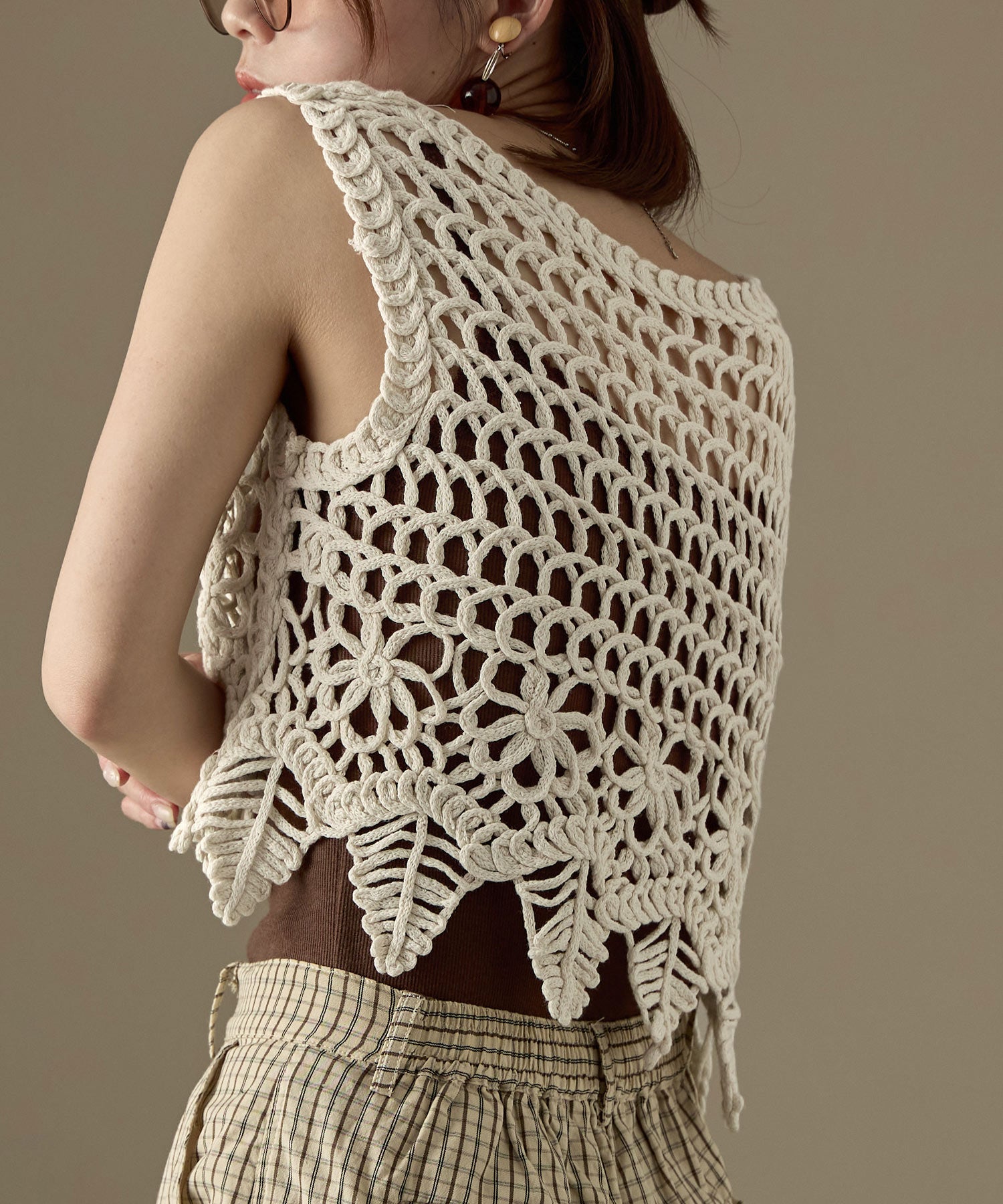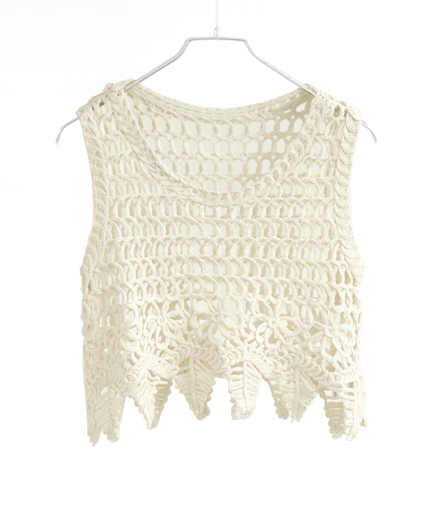シンプルながらも花柄のかぎ針編みと裾のスカラップデザインでフェミニンな雰囲気。
