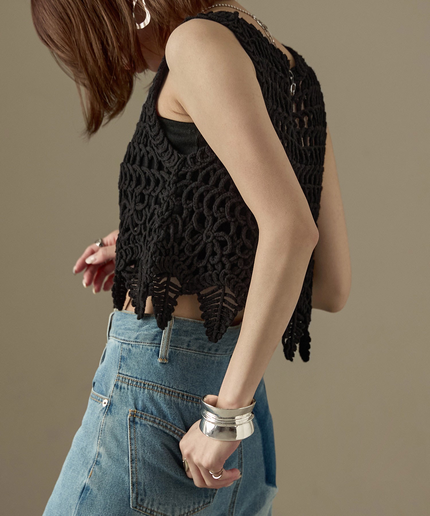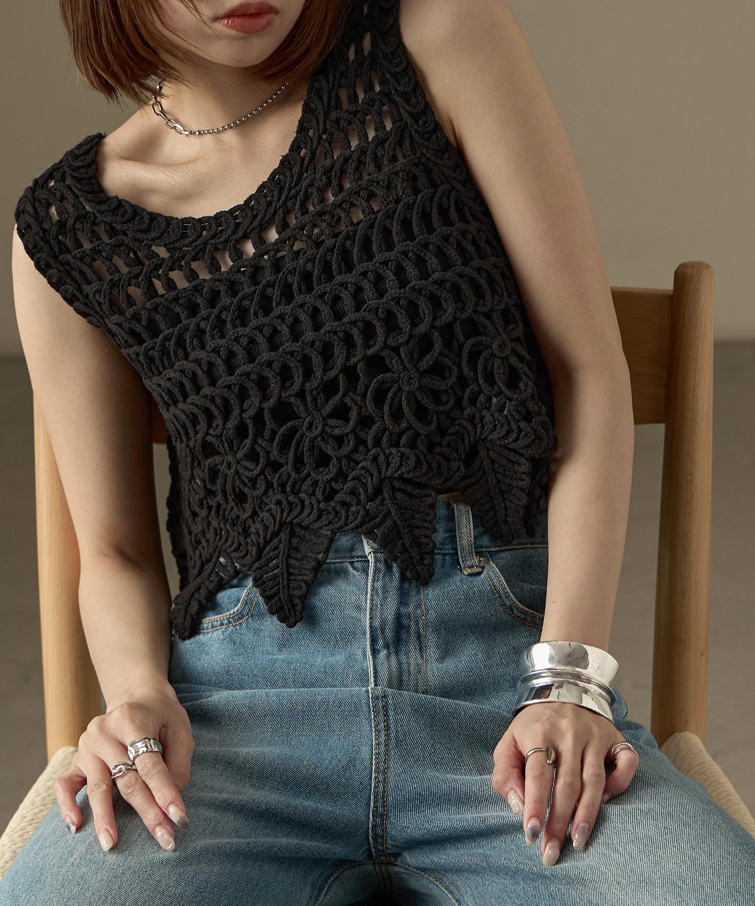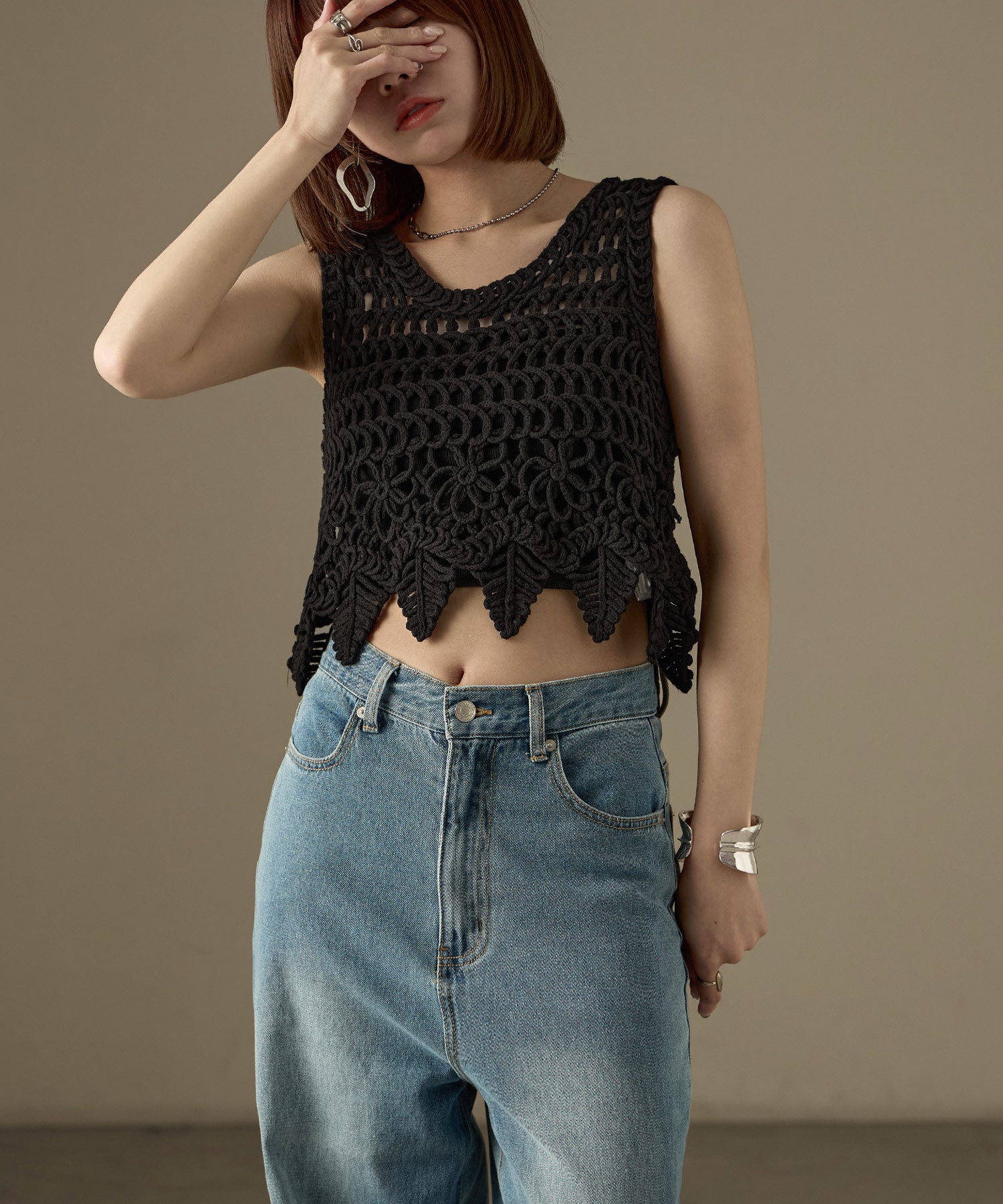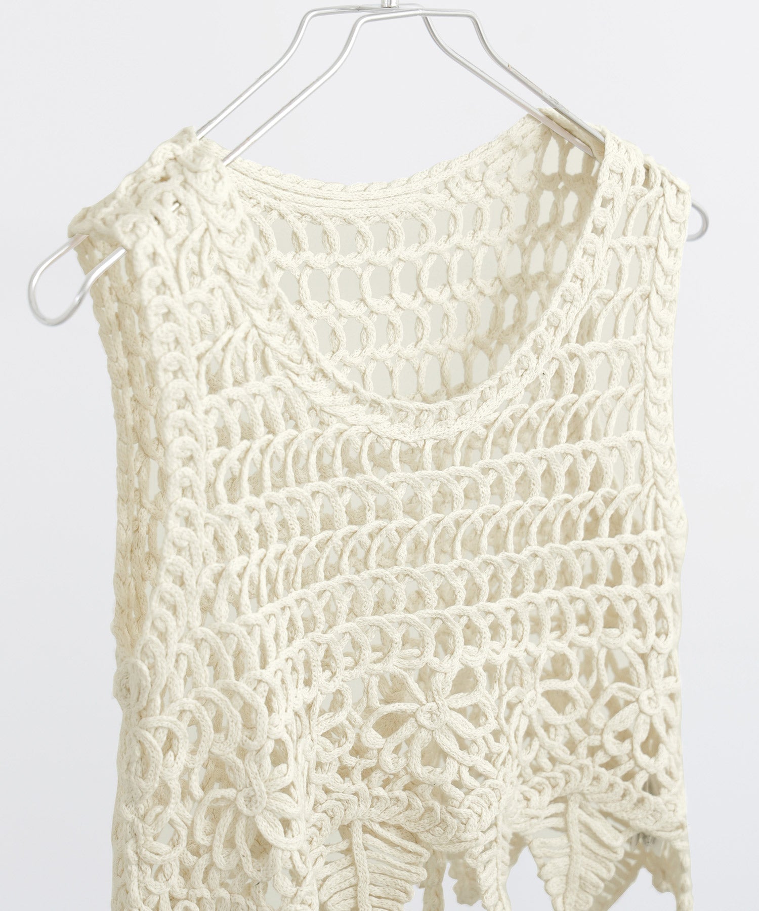 シンプルながらも花柄のかぎ針編みと裾のスカラップデザインでフェミニンな雰囲気。