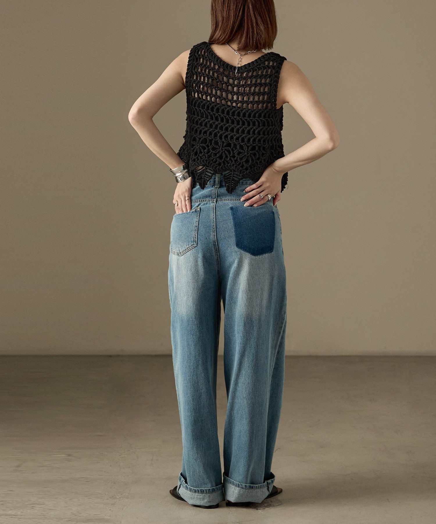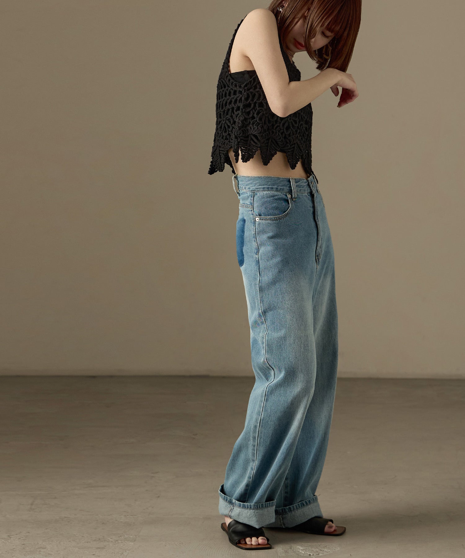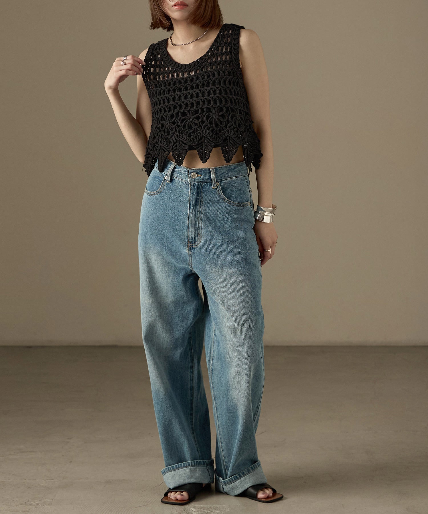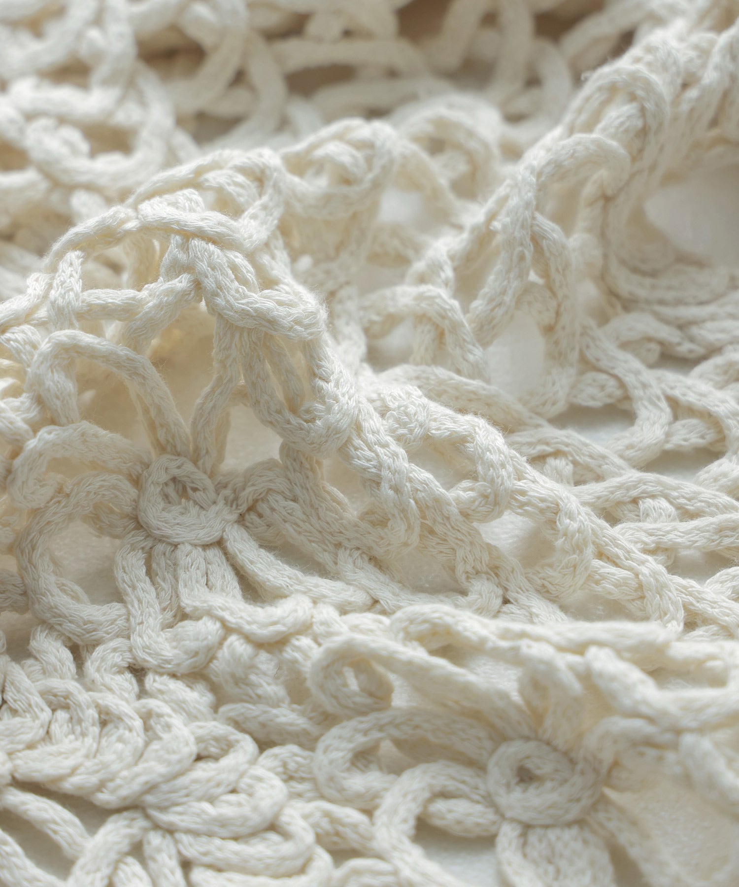 シンプルながらも花柄のかぎ針編みと裾のスカラップデザインでフェミニンな雰囲気。