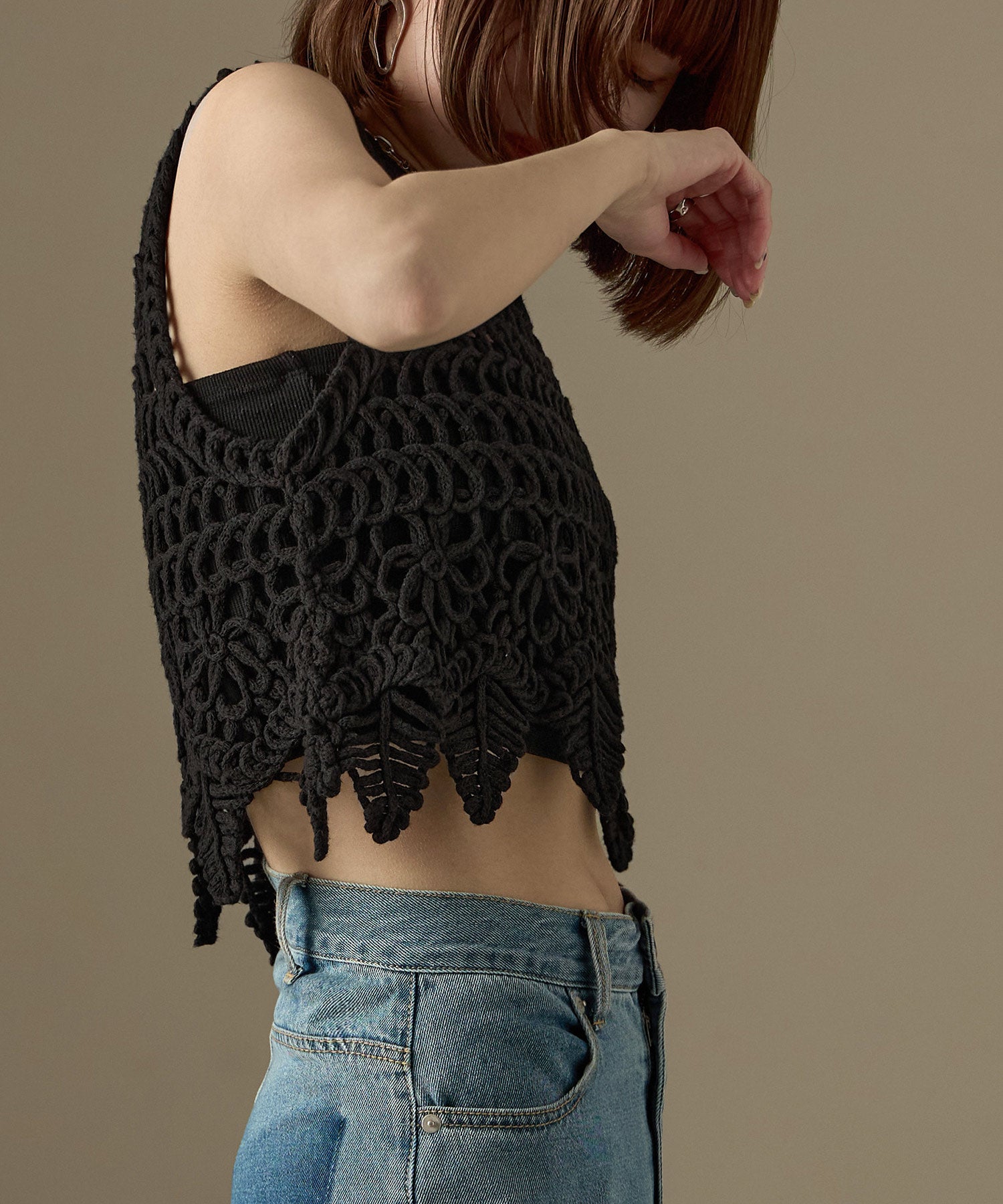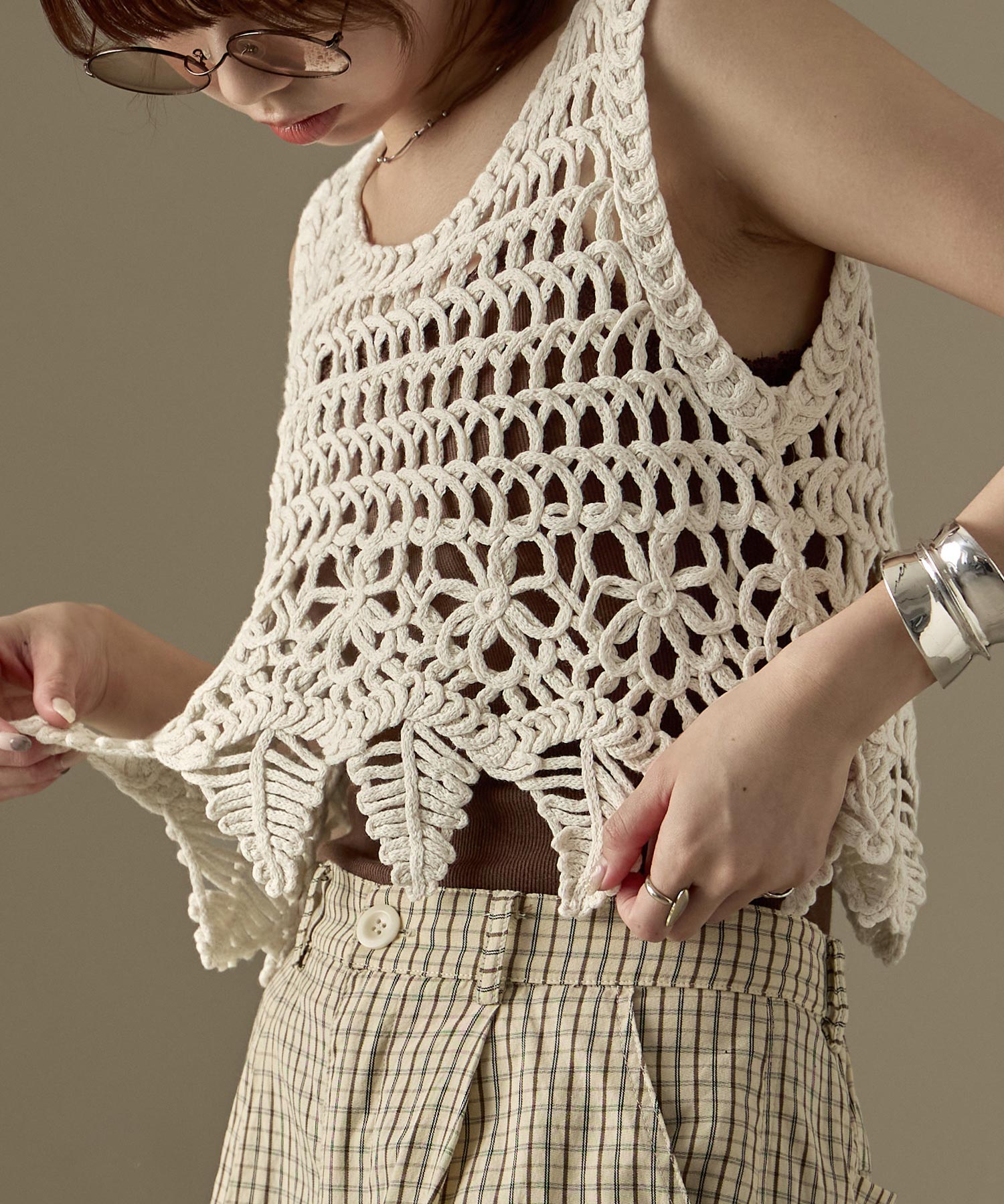 Rname かぎ針編みビスチェ ベスト ジレ クロシェレース タンクトップ キャミソール レディース ニット 春 夏 秋 冬 トップス ゆったり ショート丈 Tシャツ カットソー クロップド丈 レイヤード 低身長 高身長 大人 可愛い かわいい ママさんコーデ ママコーデ カジュアル シンプル