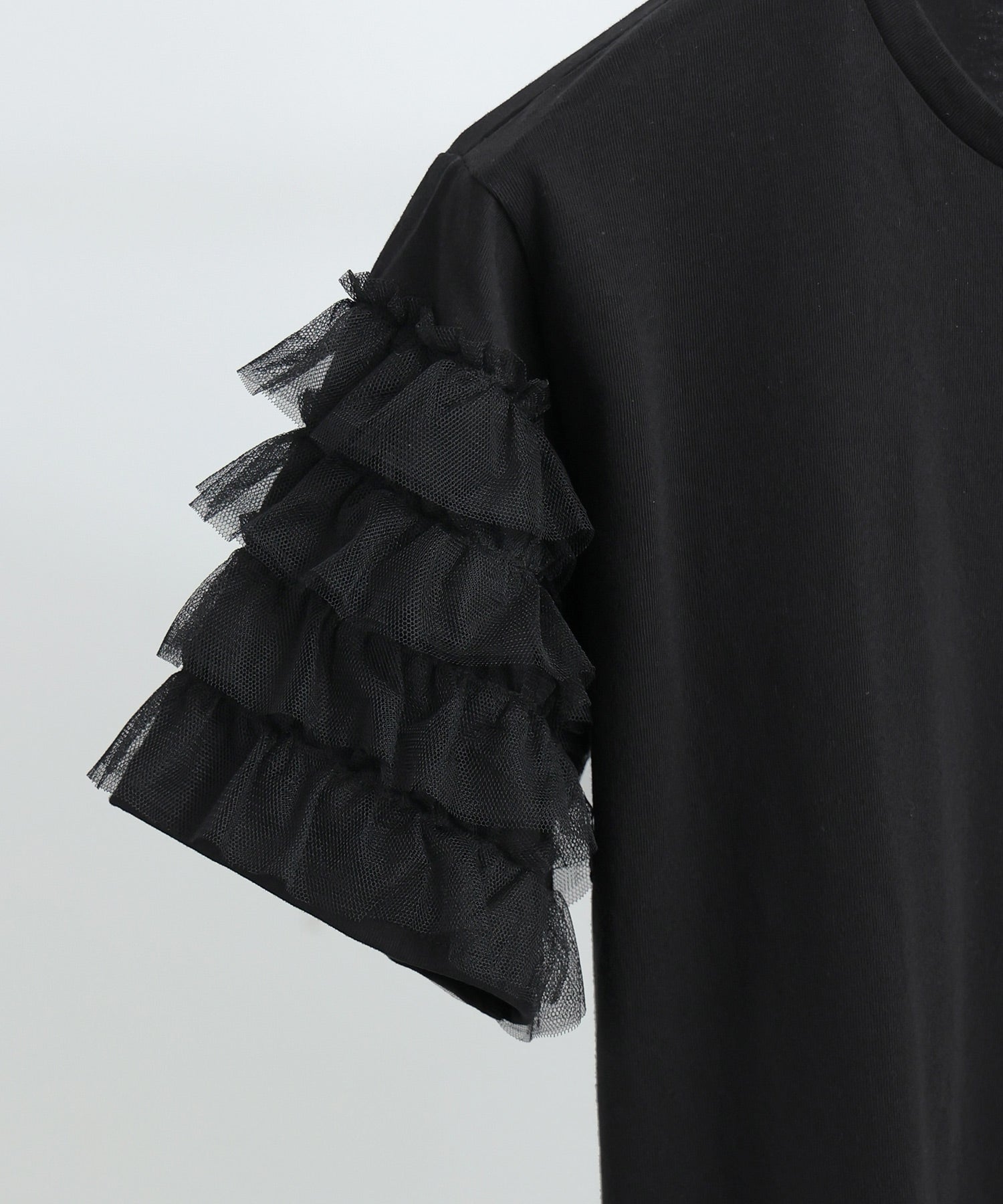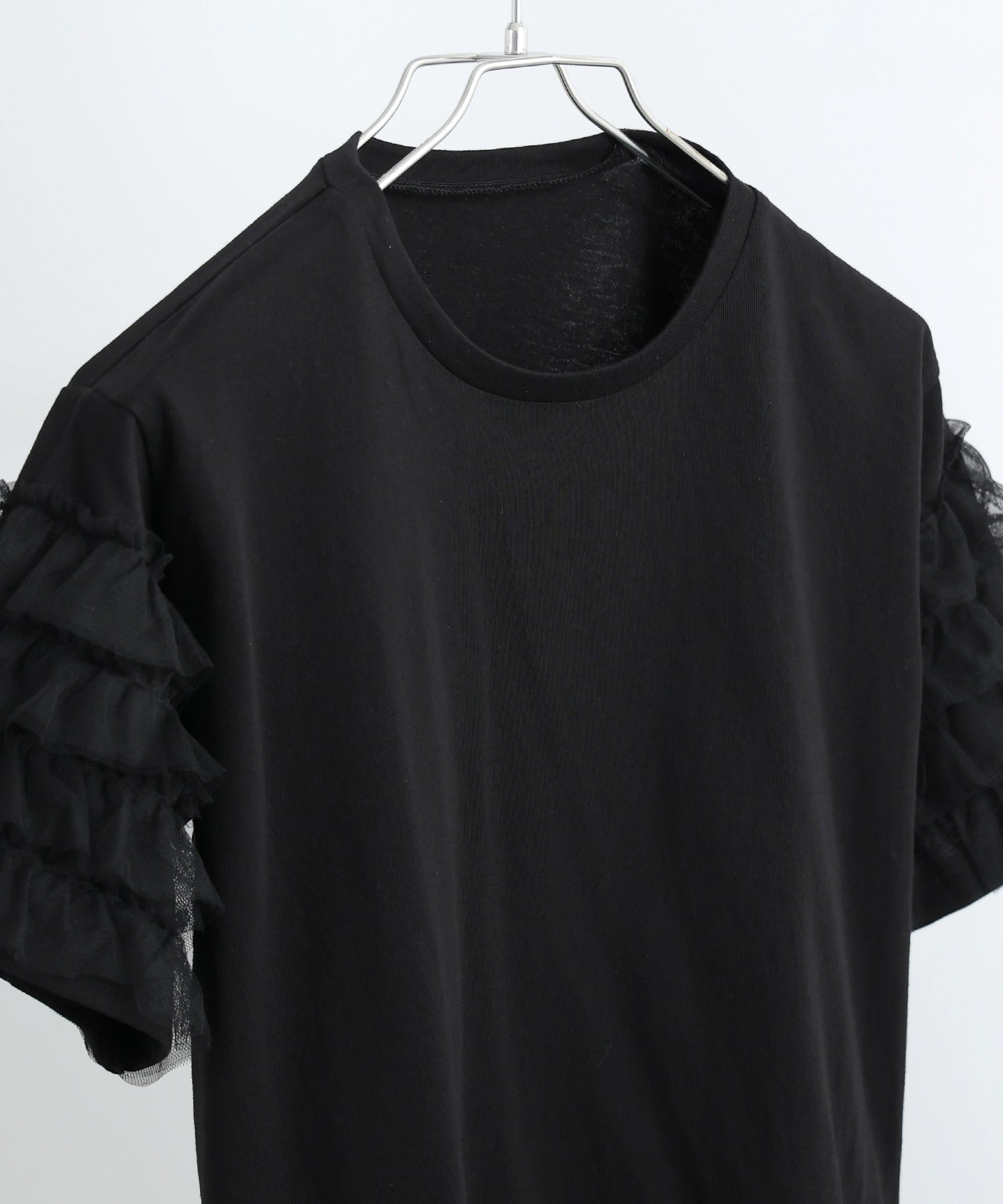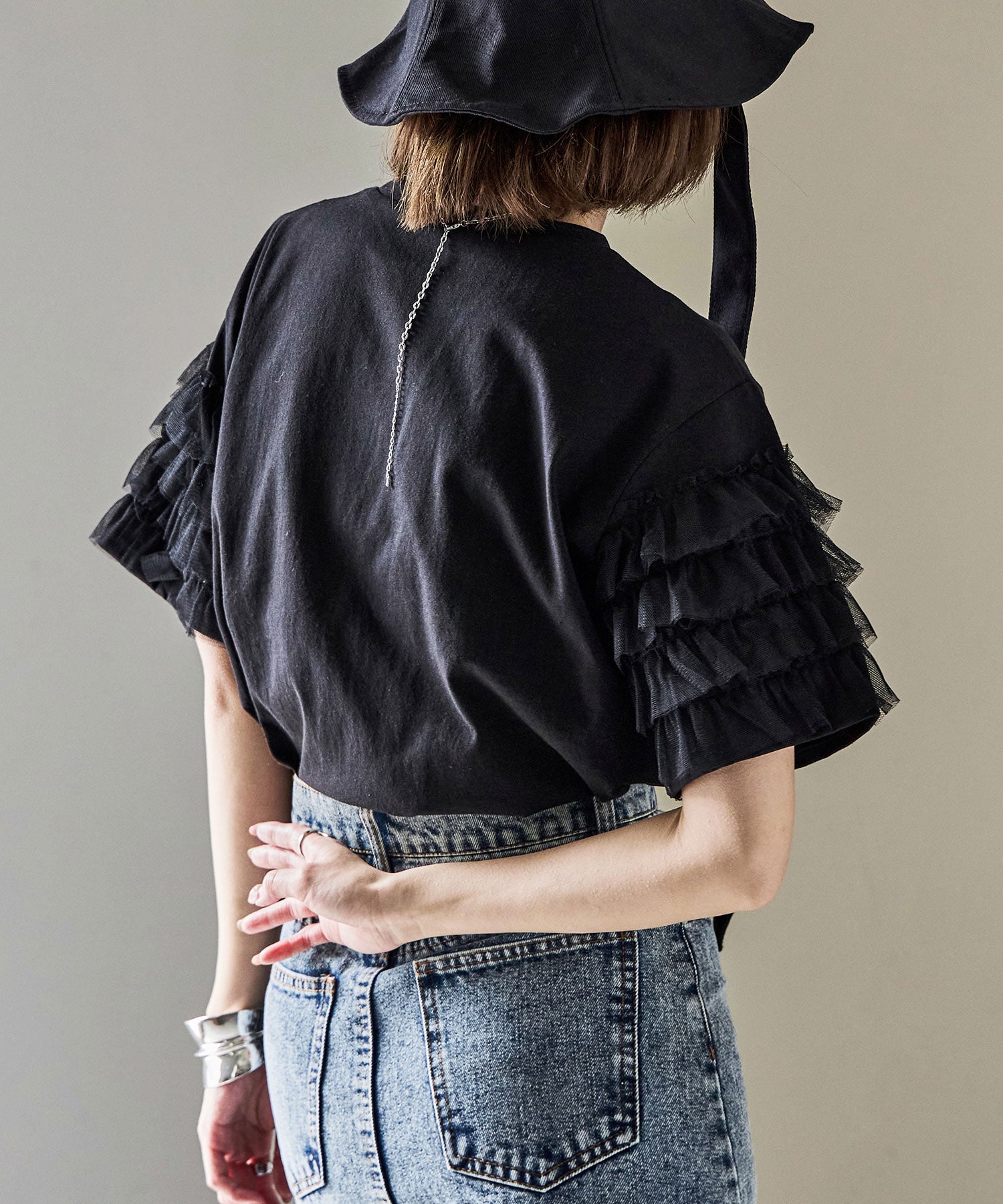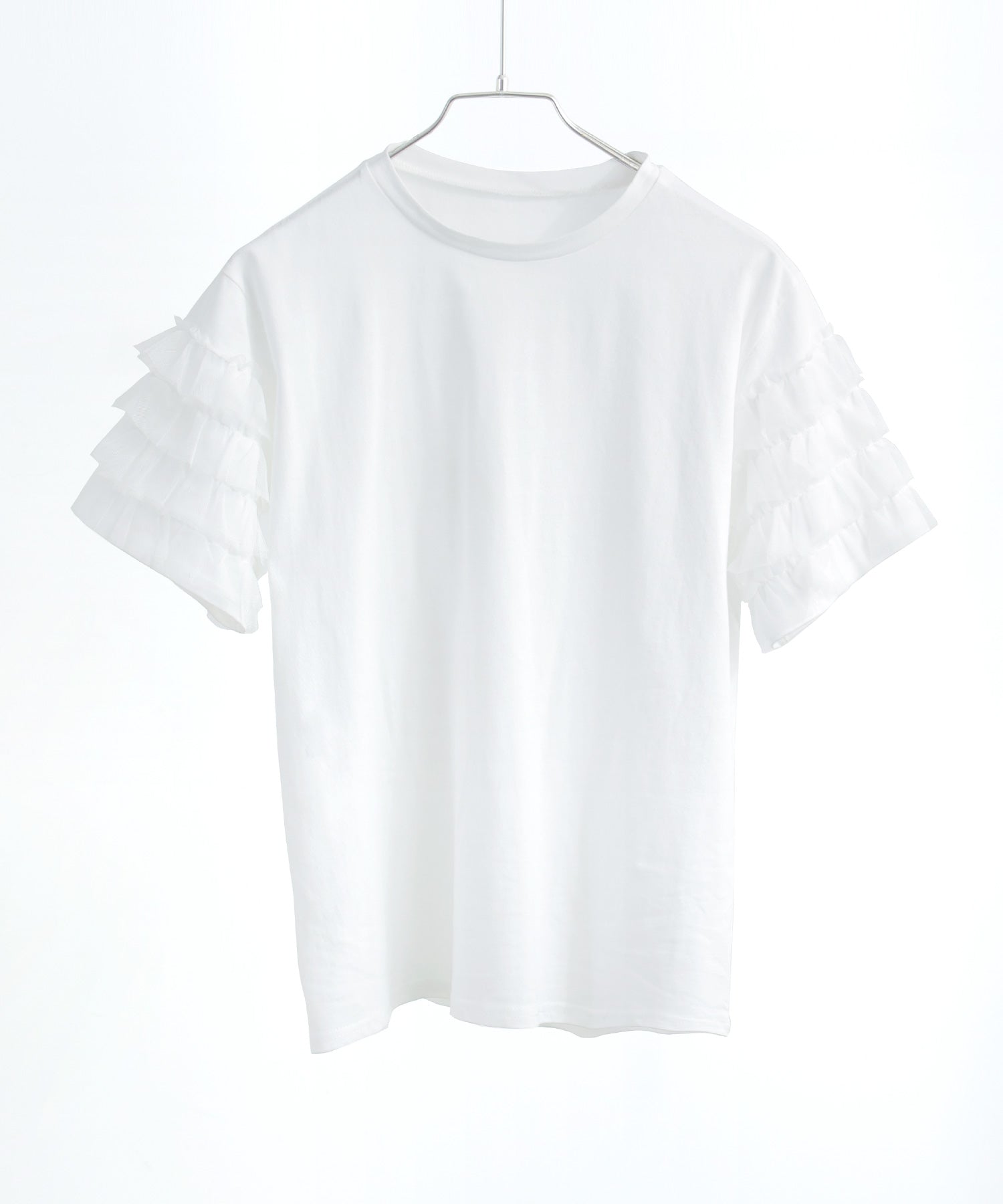 Rname ティアードフリル袖 ブラウスTシャツ カットソー トップス 半袖 Tシャツ ブラウス シャツ Tee フリル ホワイト ブラック 黒 レディース 夏 旅行 キャンプ フェス ゆったり 長め チュニック