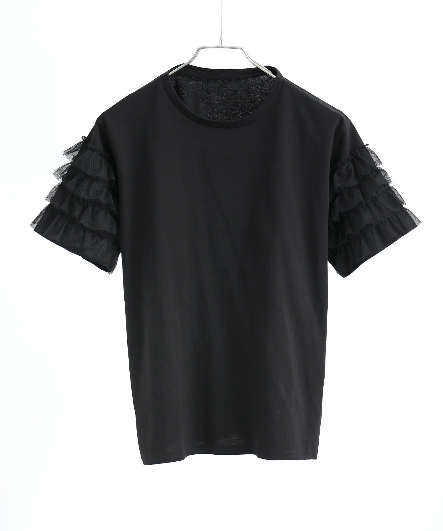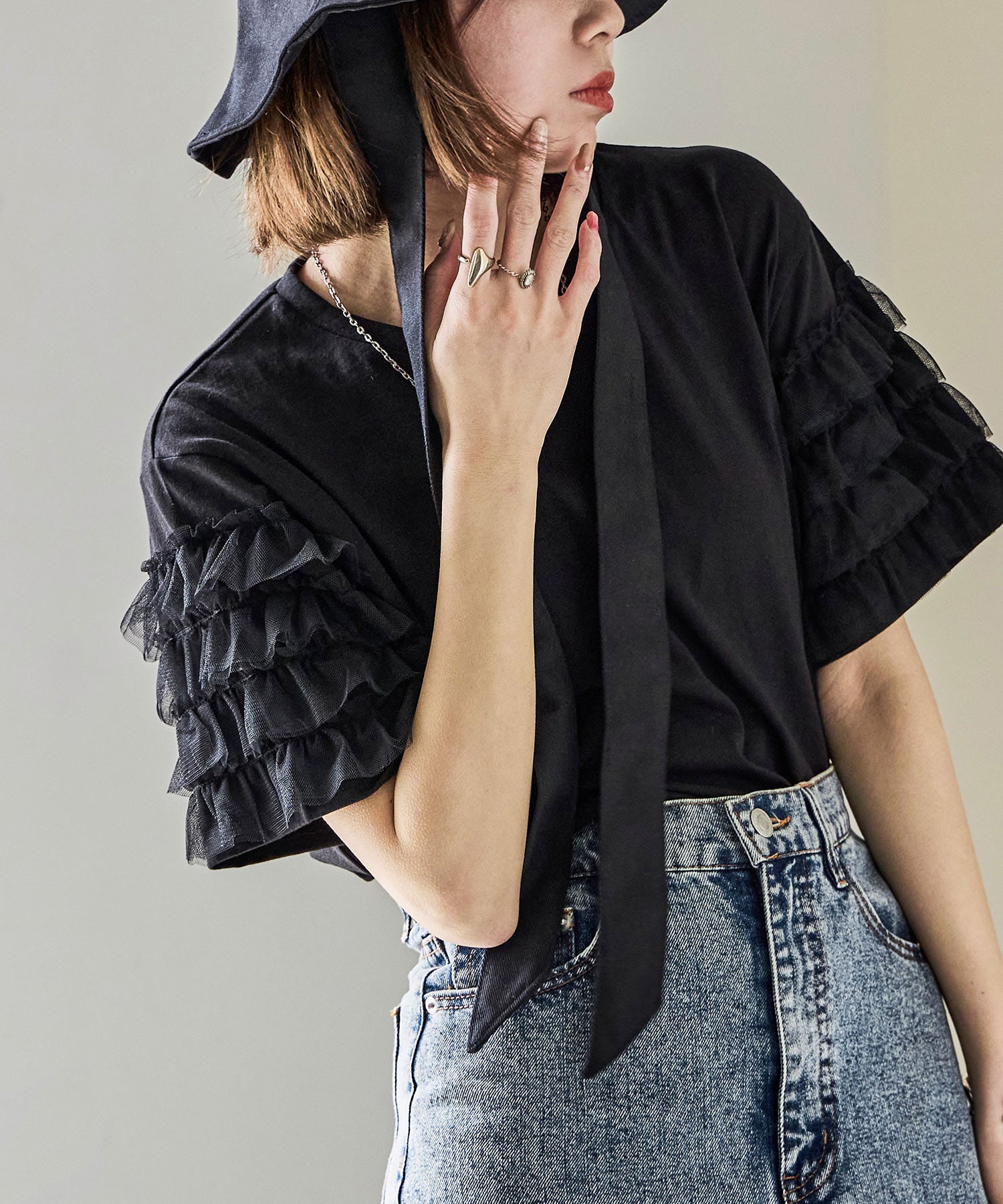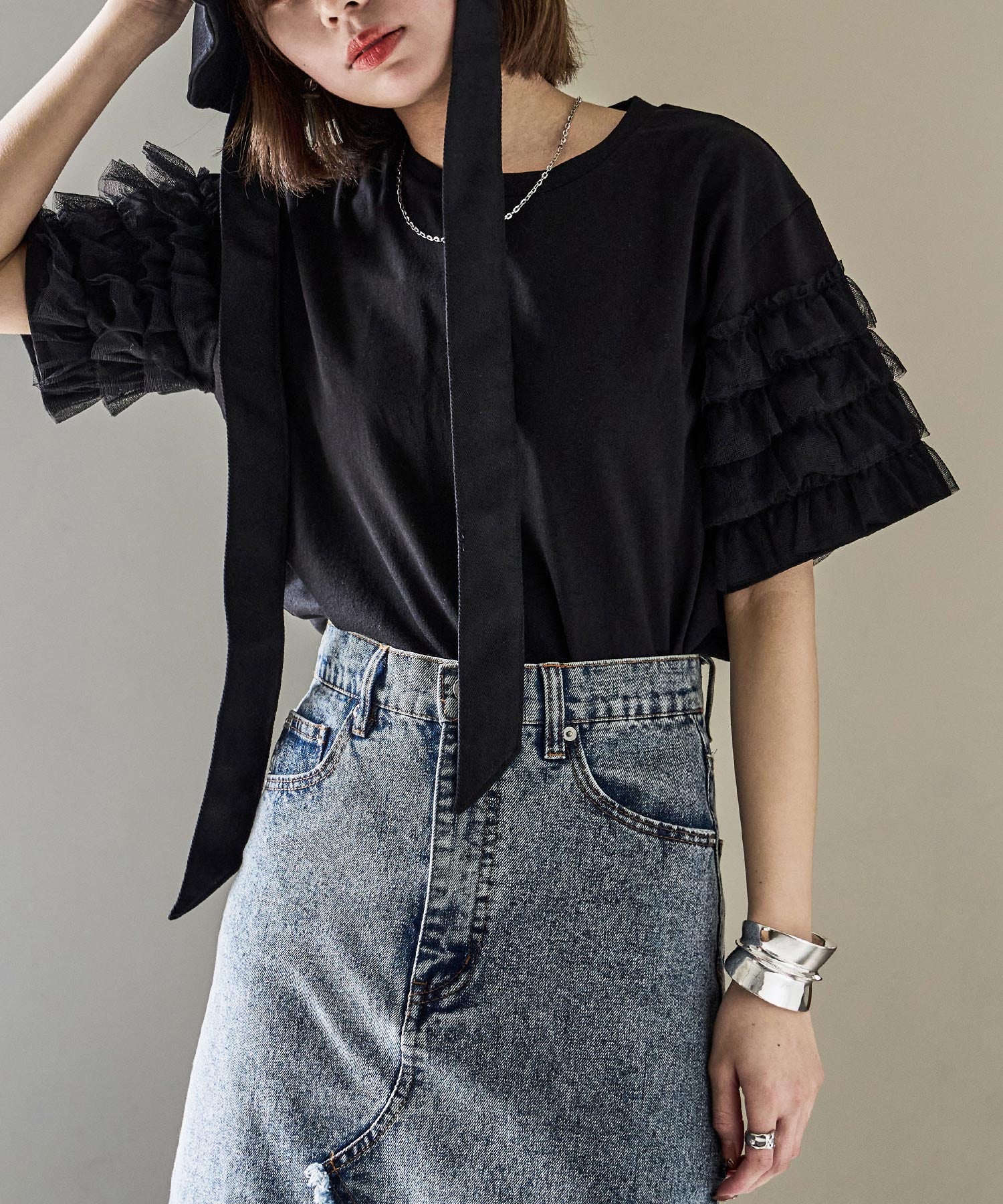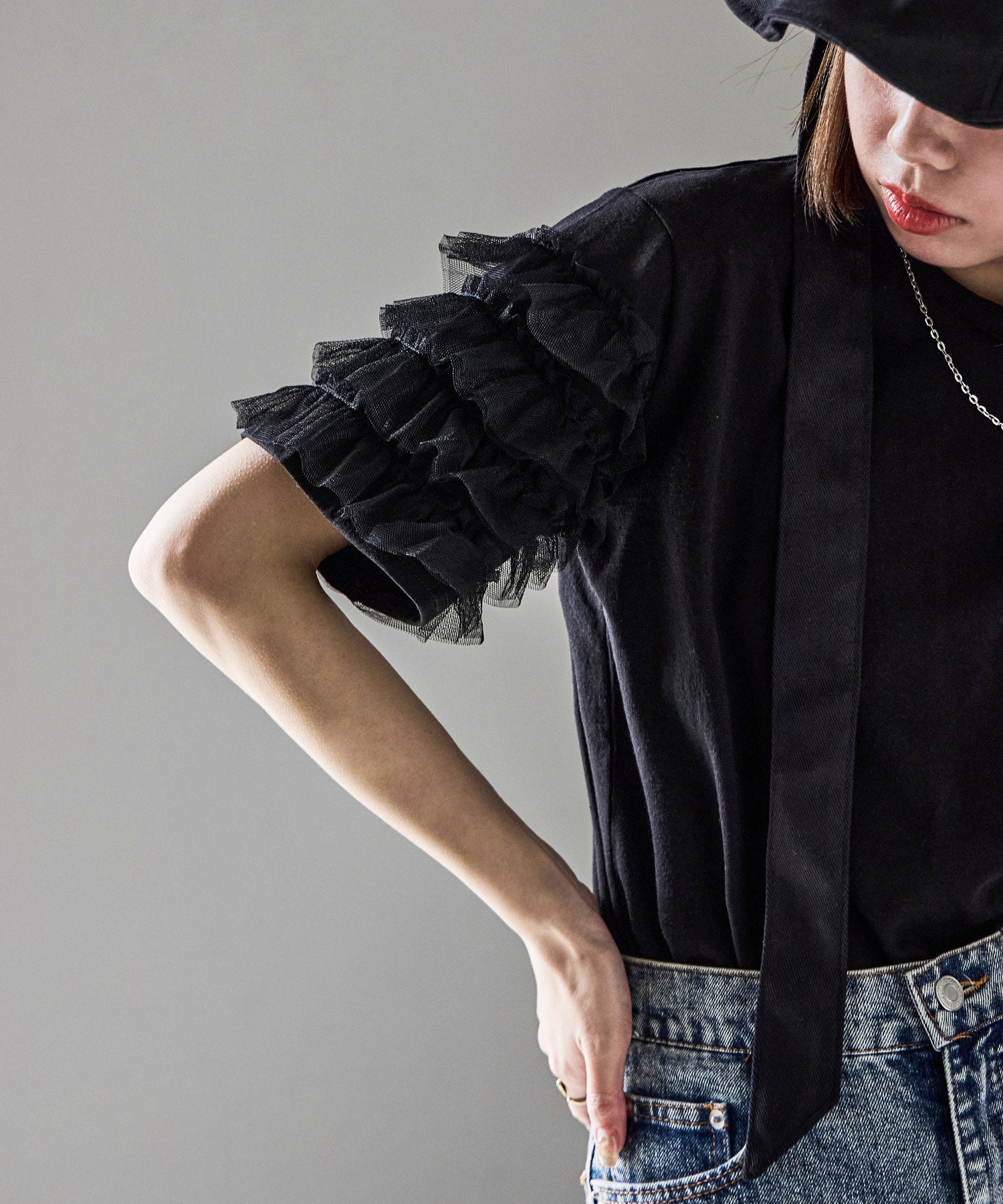 Rname ティアードフリル袖 ブラウスTシャツ カットソー トップス 半袖 Tシャツ ブラウス シャツ Tee フリル ホワイト ブラック 黒 レディース 夏 旅行 キャンプ フェス ゆったり 長め チュニック