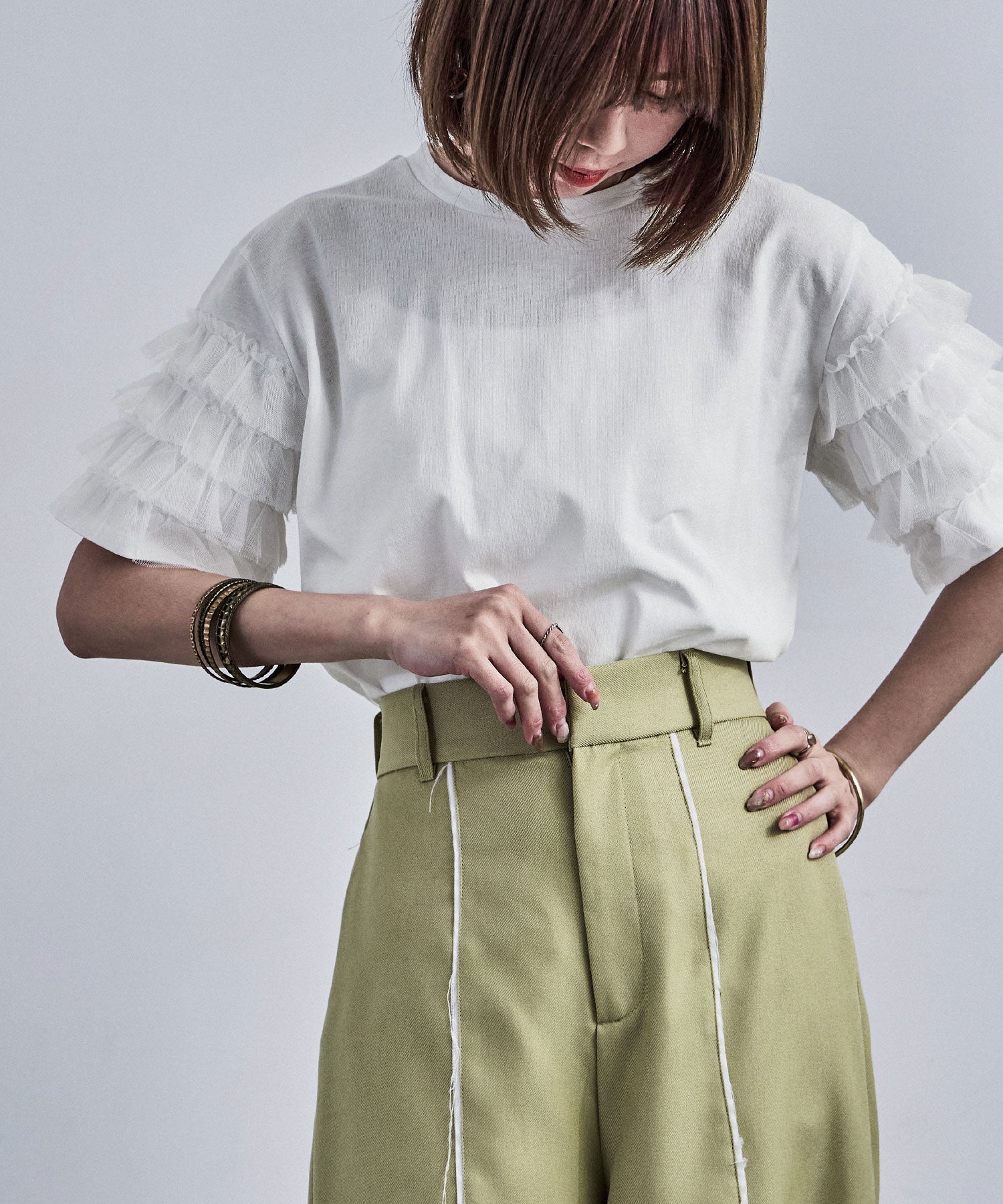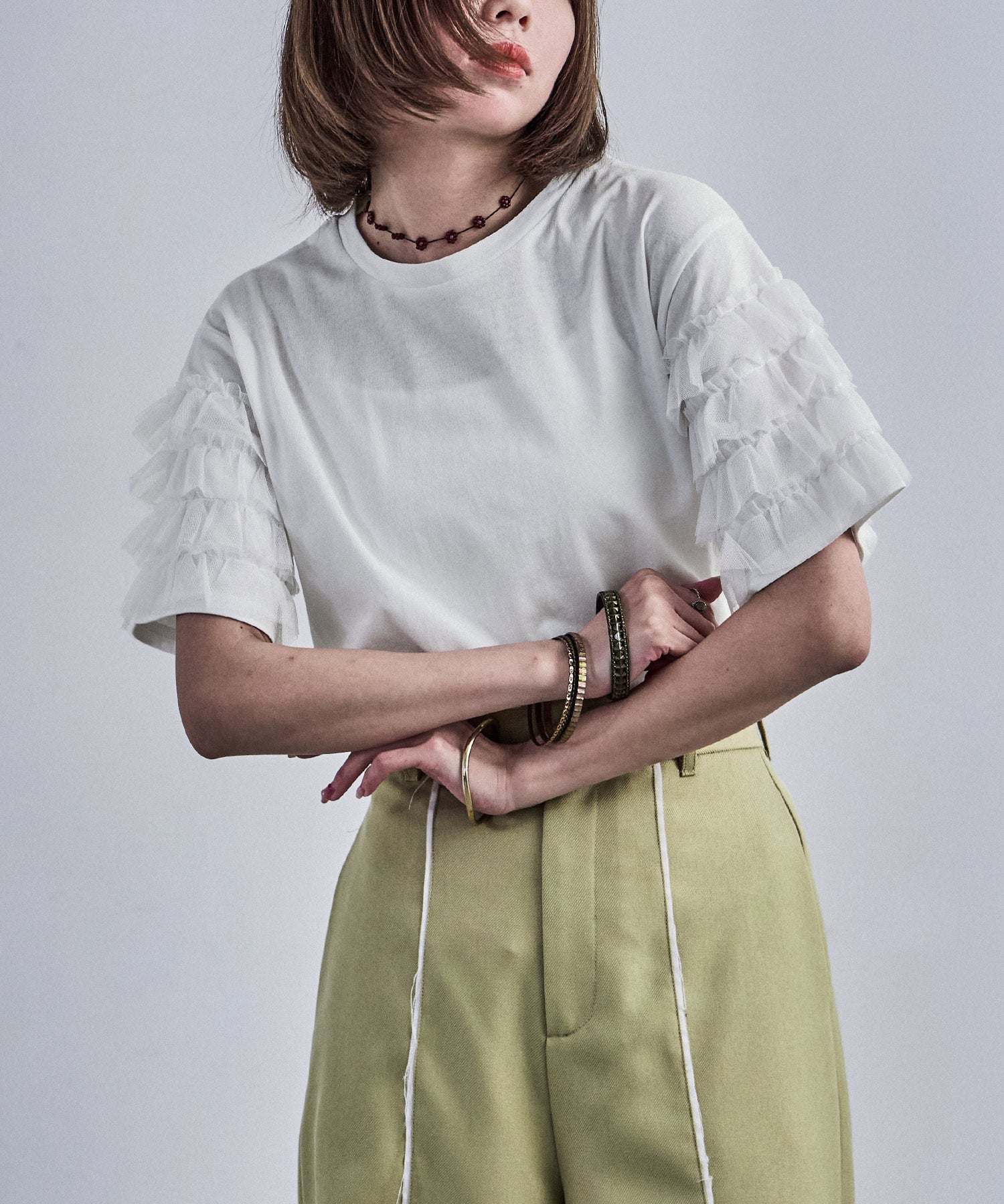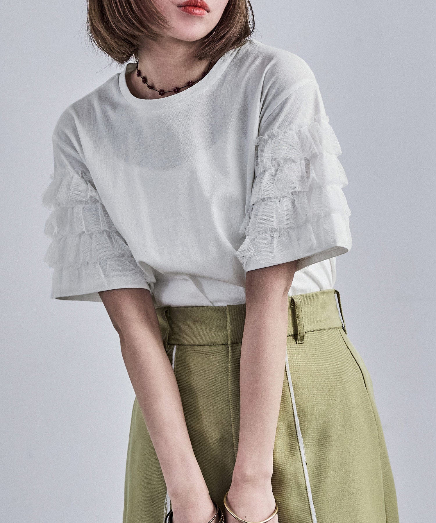 カジュアルすぎないフェミニンな雰囲気のTシャツは1枚で主役級。