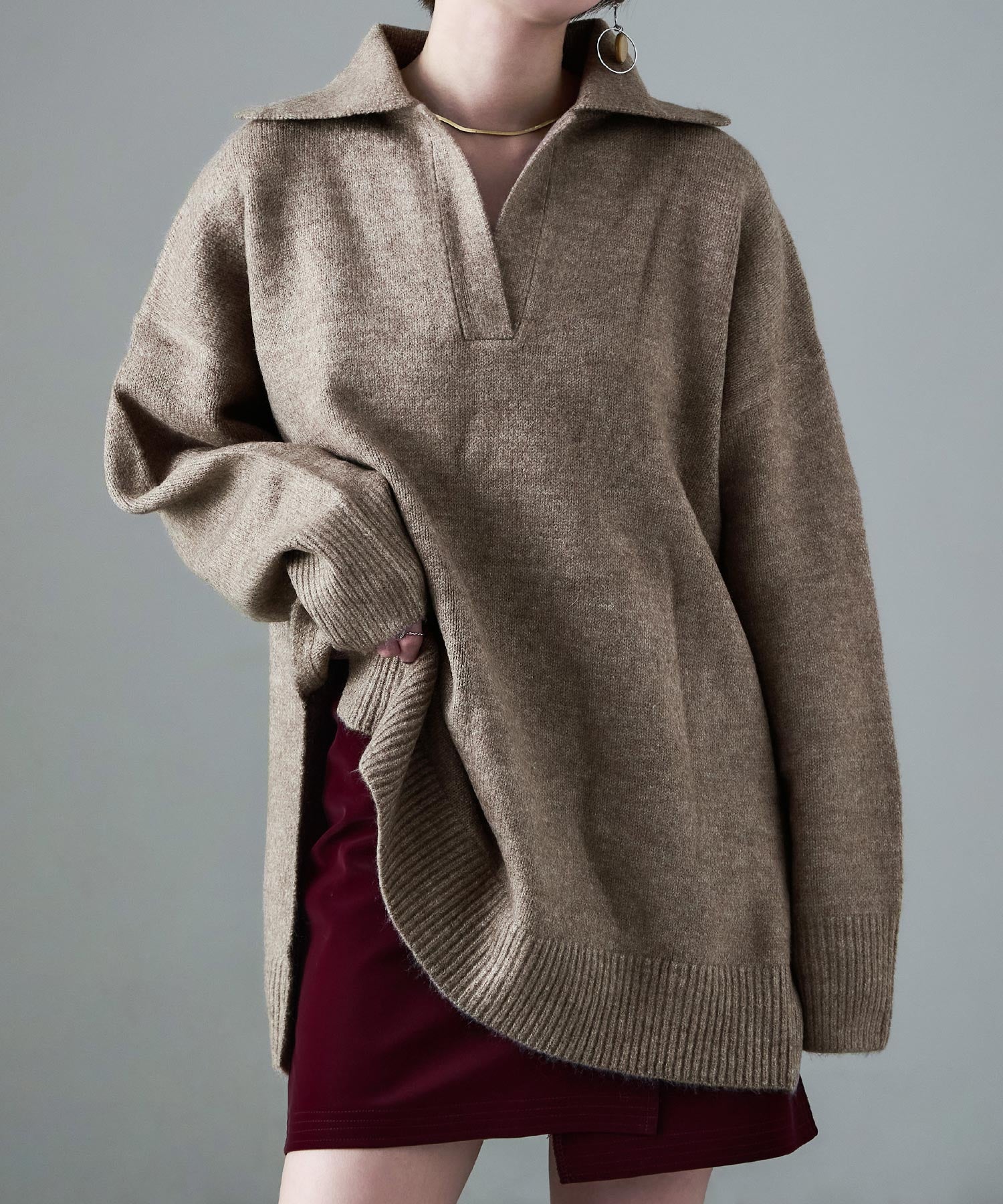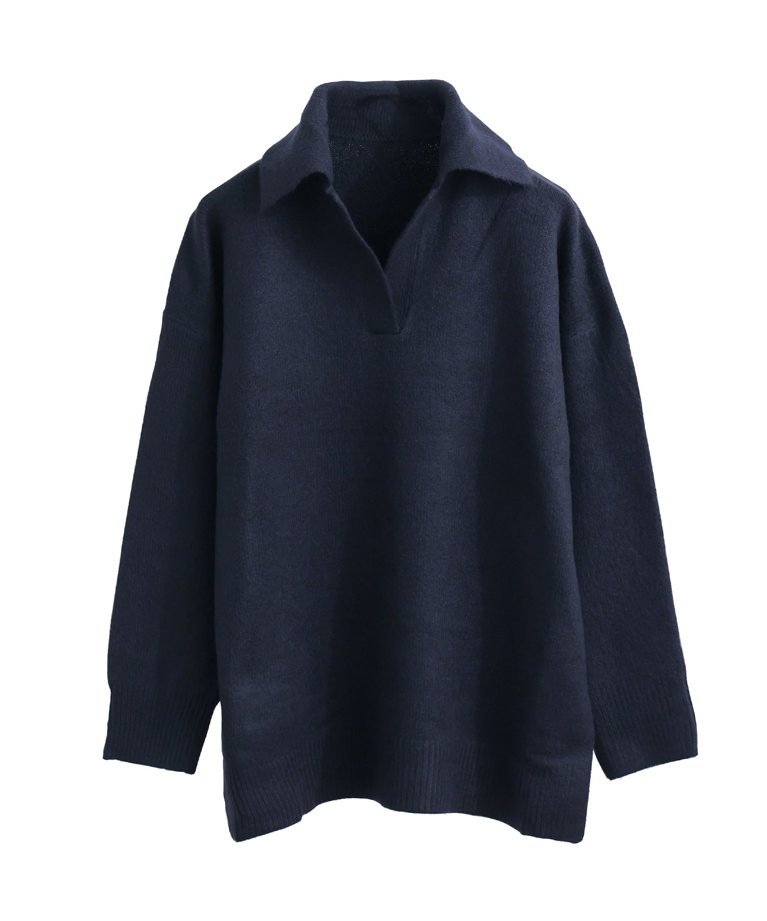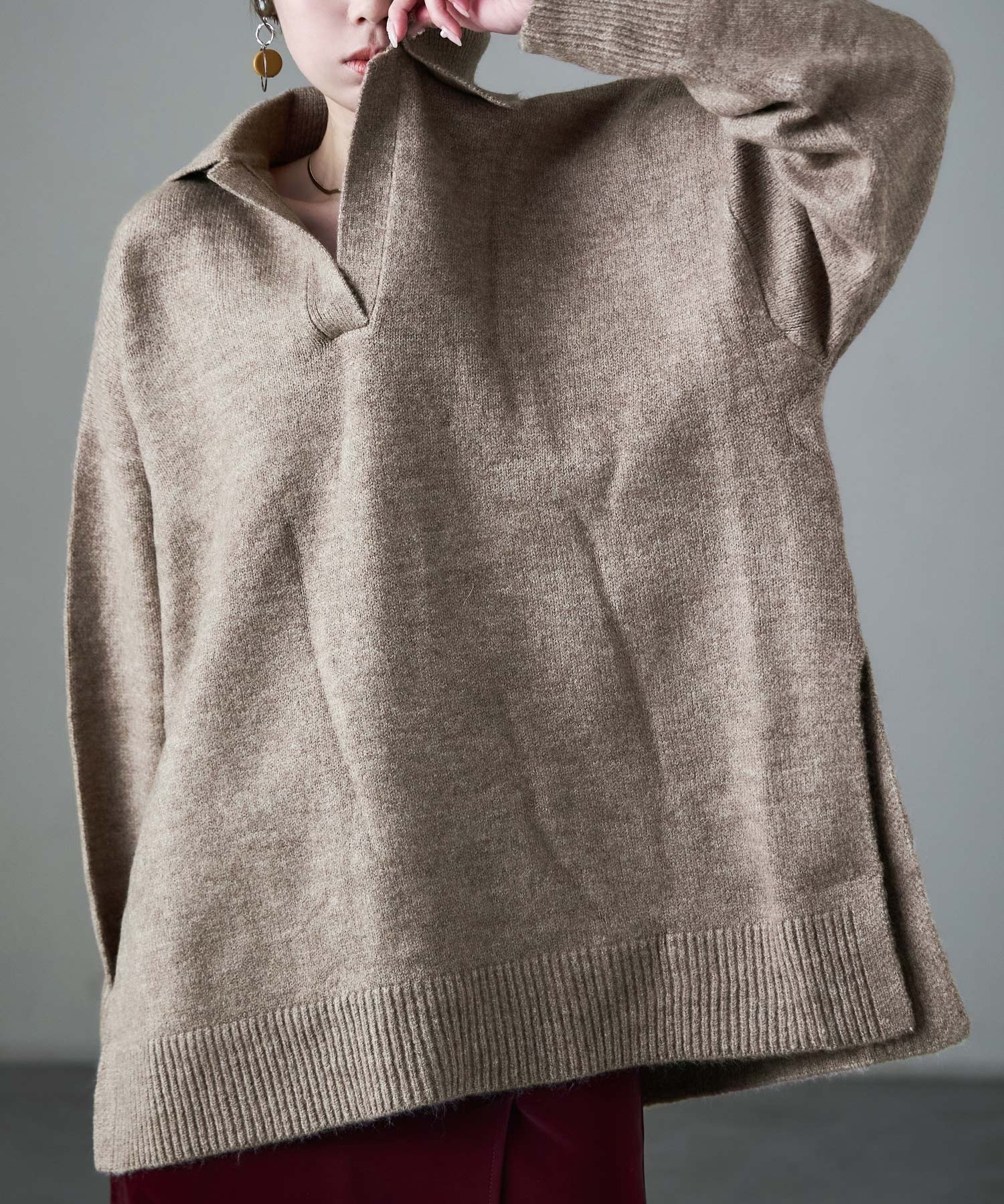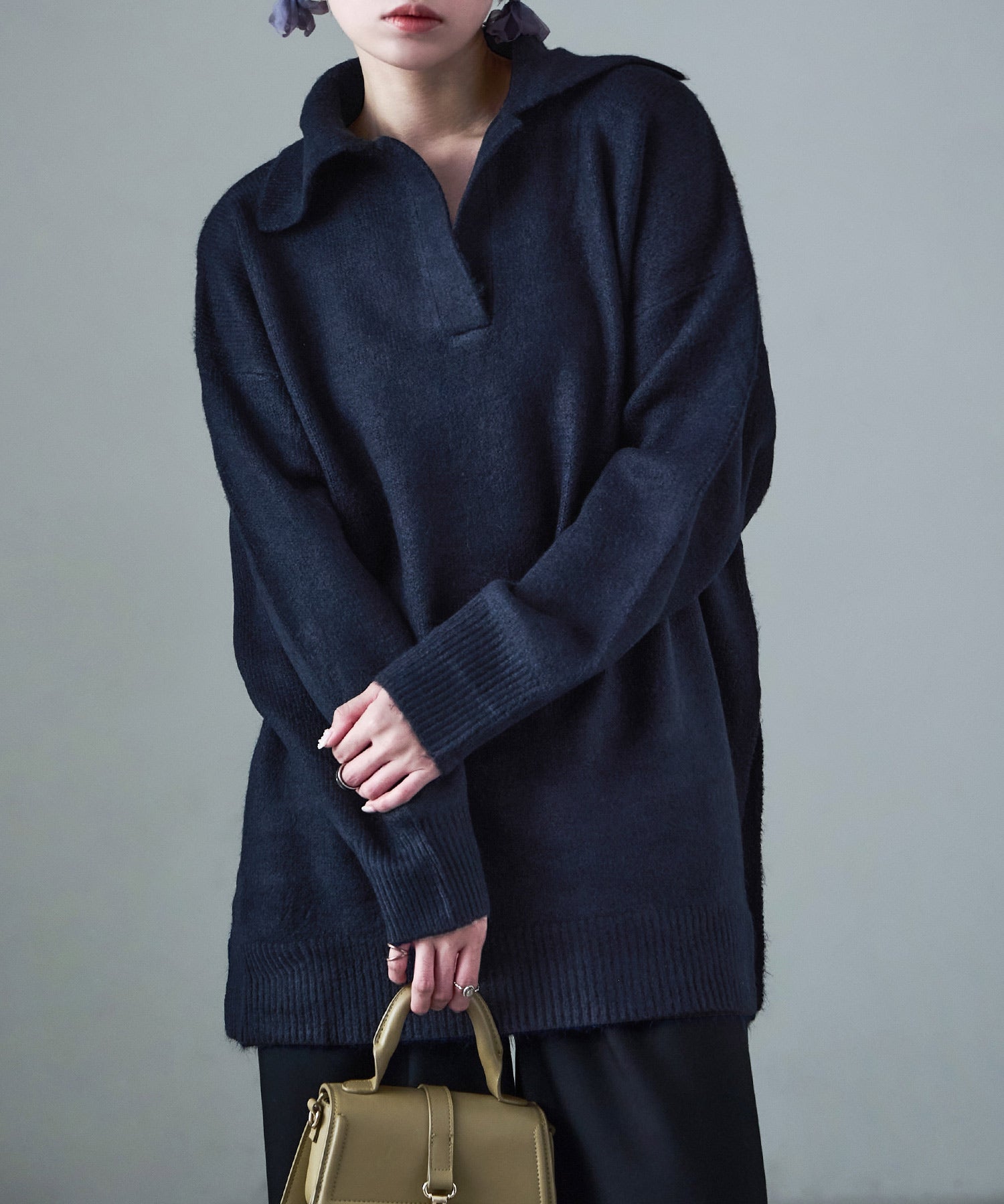 Rname 天竺ニット スキッパープルオーバー セーター ニット トップス ゆったり 大きめ スキッパーシャツ サイドスリット 長袖 オーバーサイズ ママコーデ 低身長 高身長 韓国ファッション 無地 ロング丈
