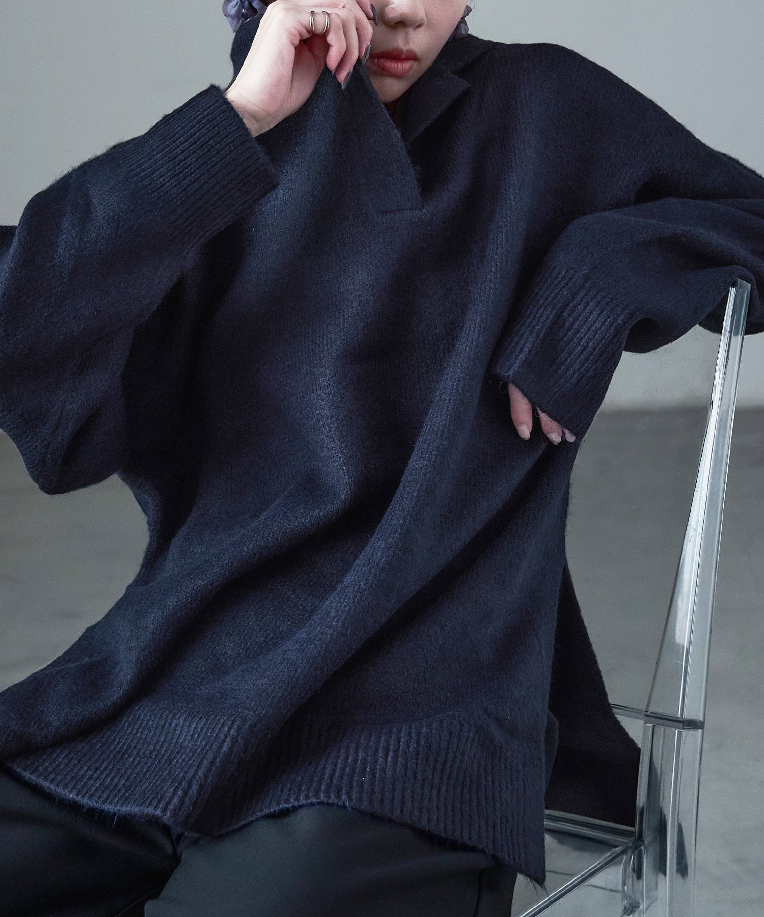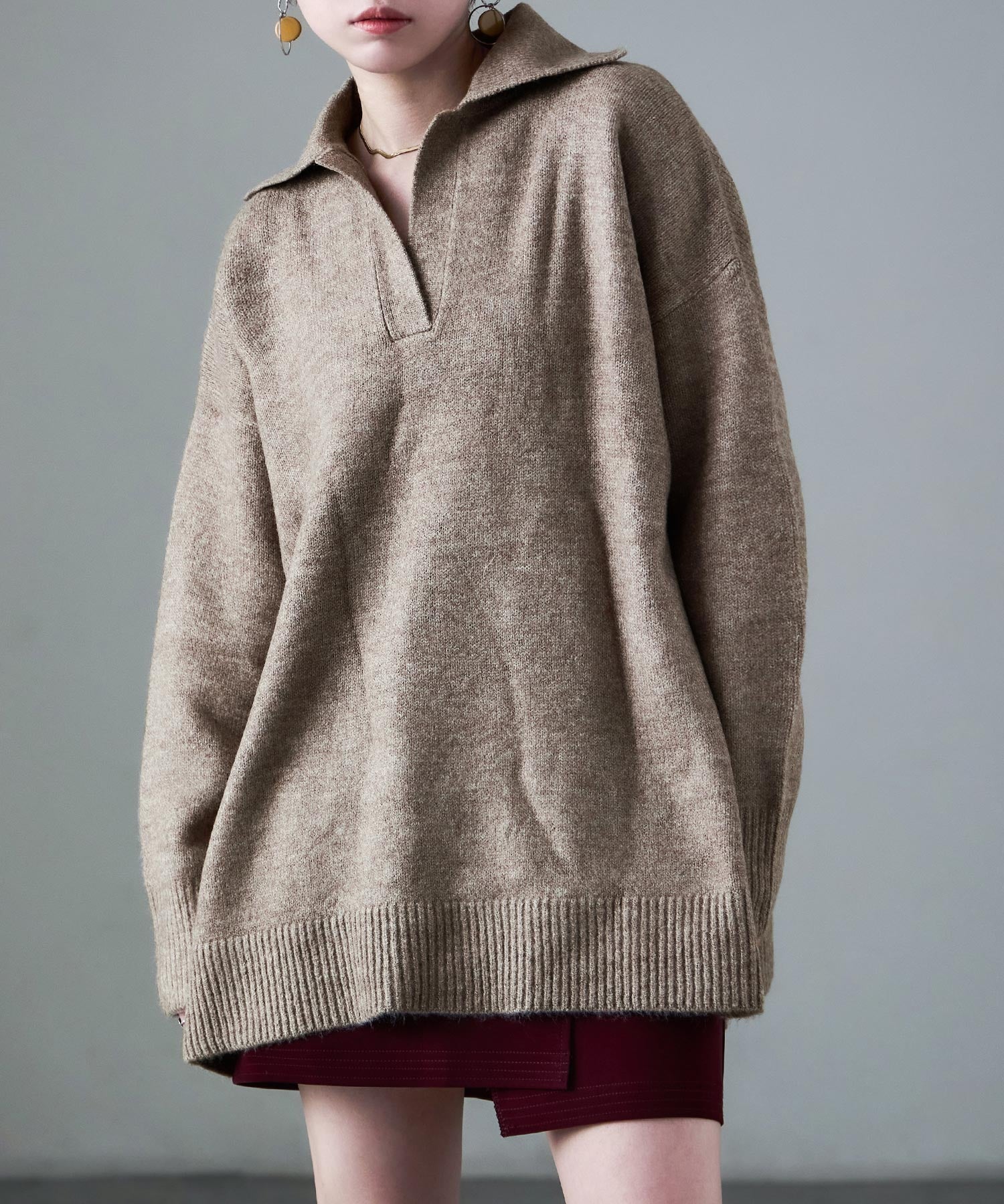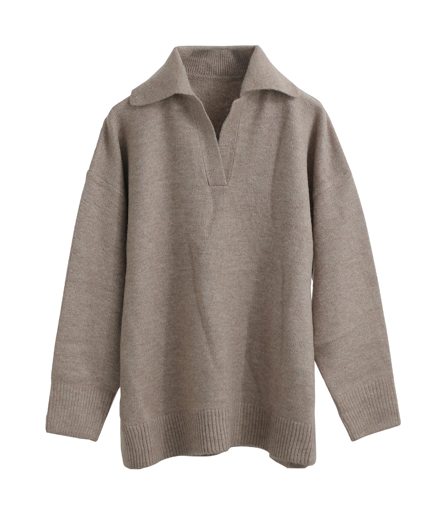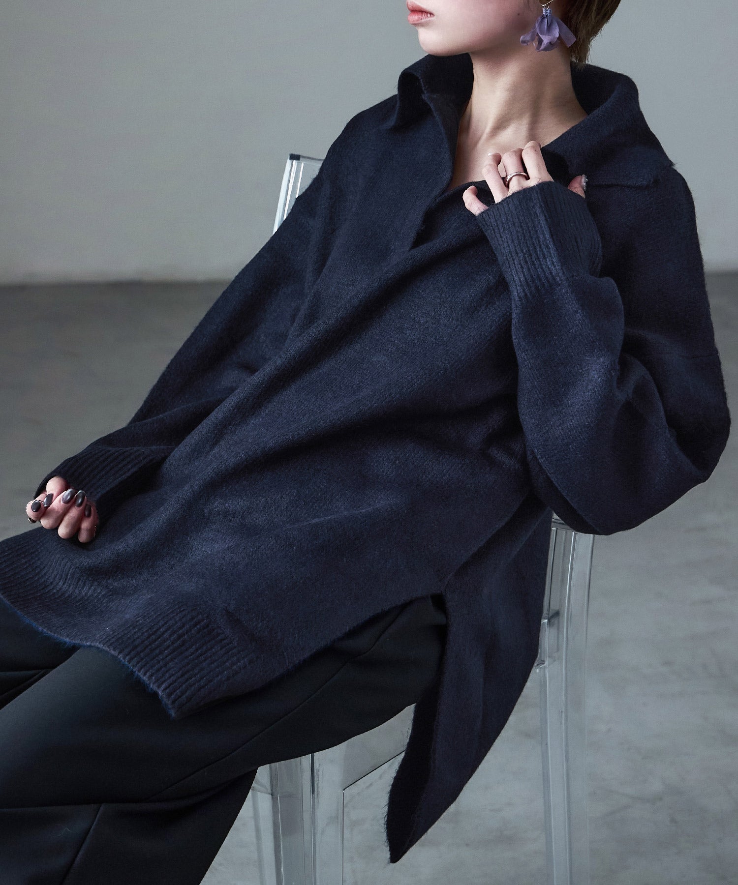 Rname 天竺ニット スキッパープルオーバー セーター ニット トップス ゆったり 大きめ スキッパーシャツ サイドスリット 長袖 オーバーサイズ ママコーデ 低身長 高身長 韓国ファッション 無地 ロング丈