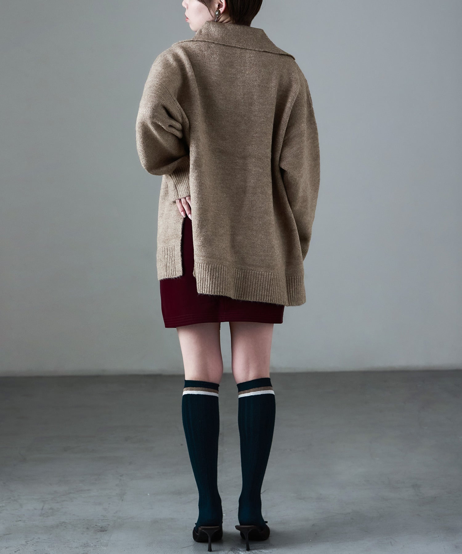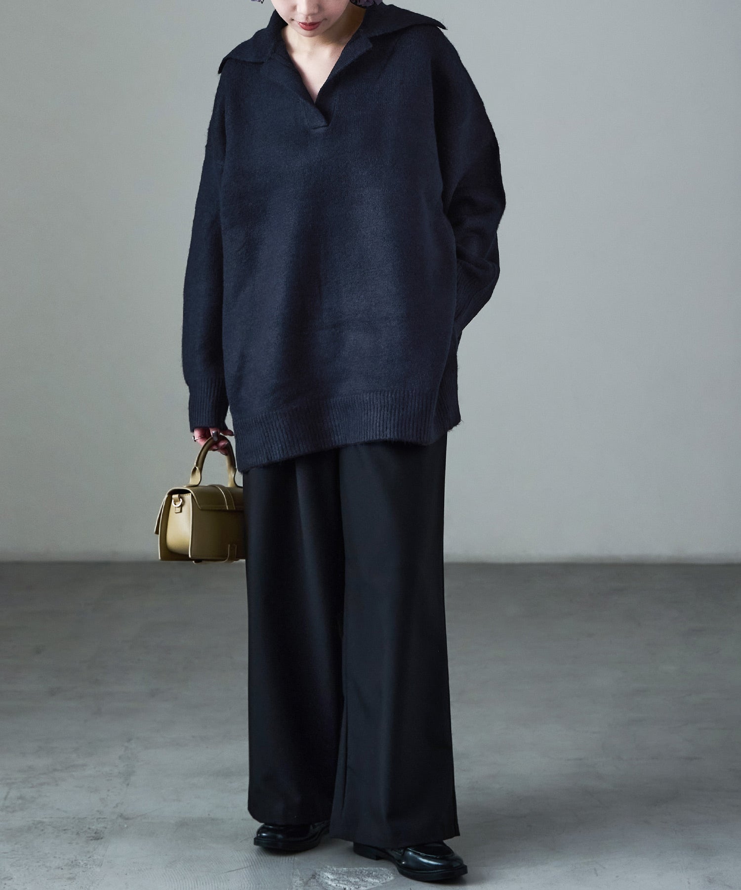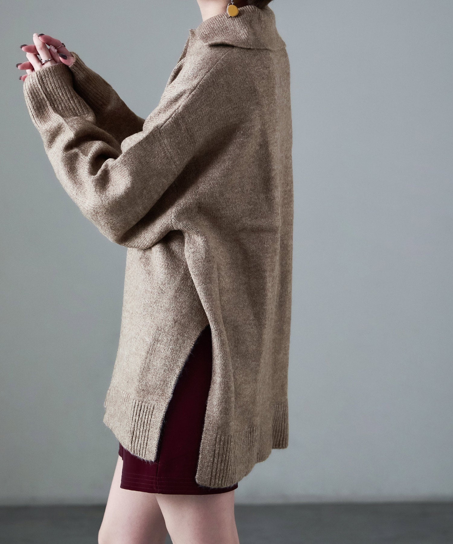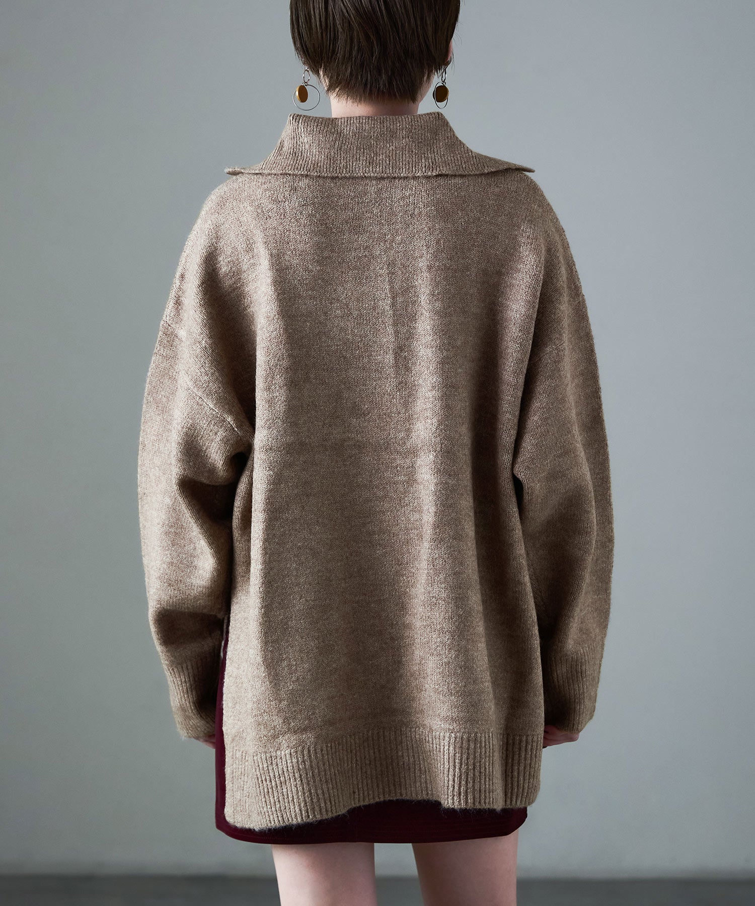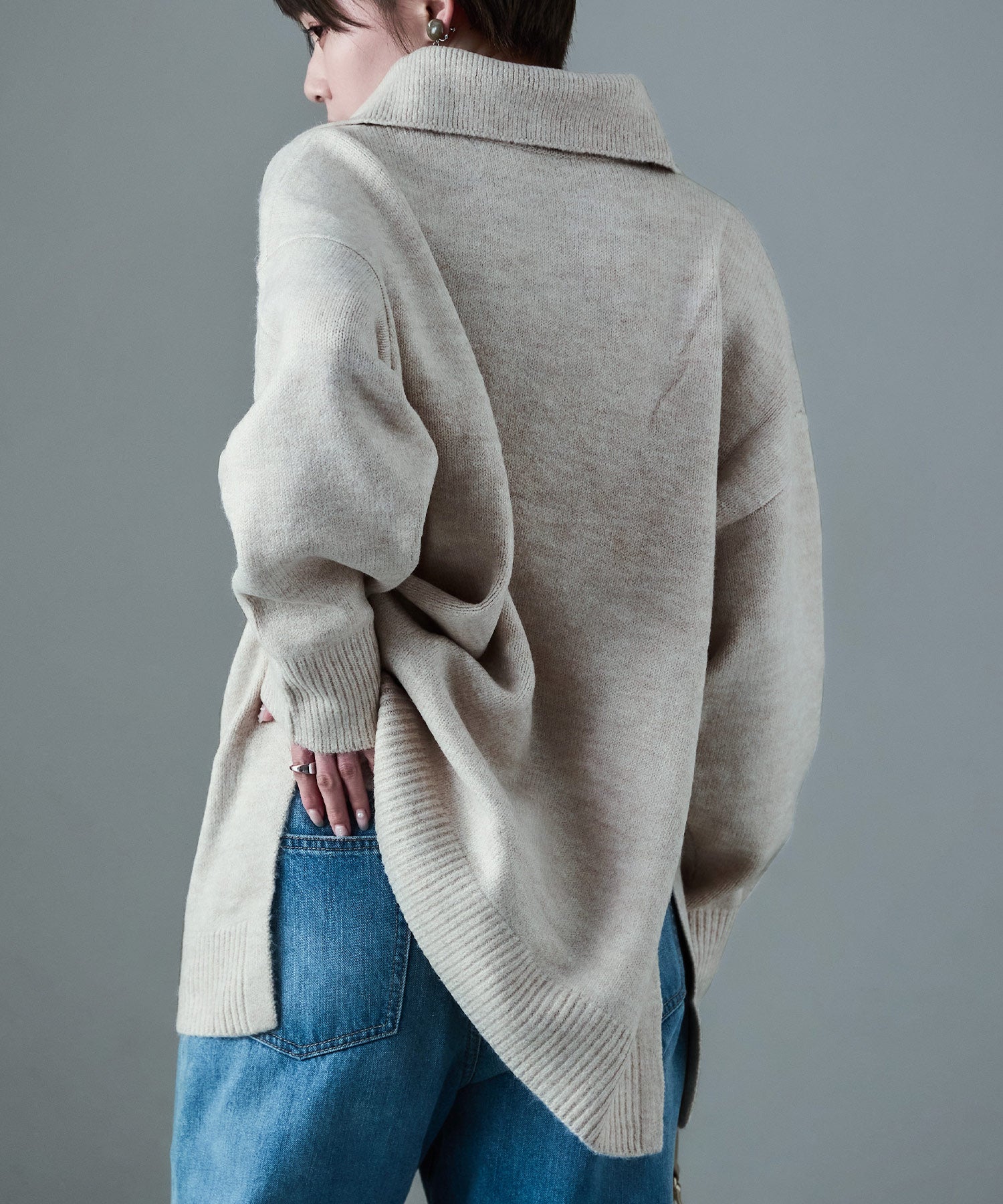 Rname 天竺ニット スキッパープルオーバー セーター ニット トップス ゆったり 大きめ スキッパーシャツ サイドスリット 長袖 オーバーサイズ ママコーデ 低身長 高身長 韓国ファッション 無地 ロング丈