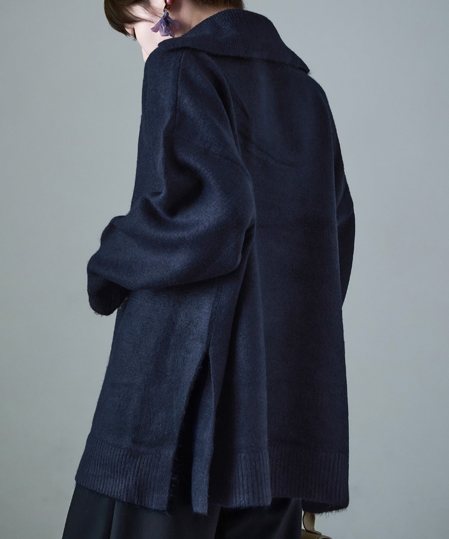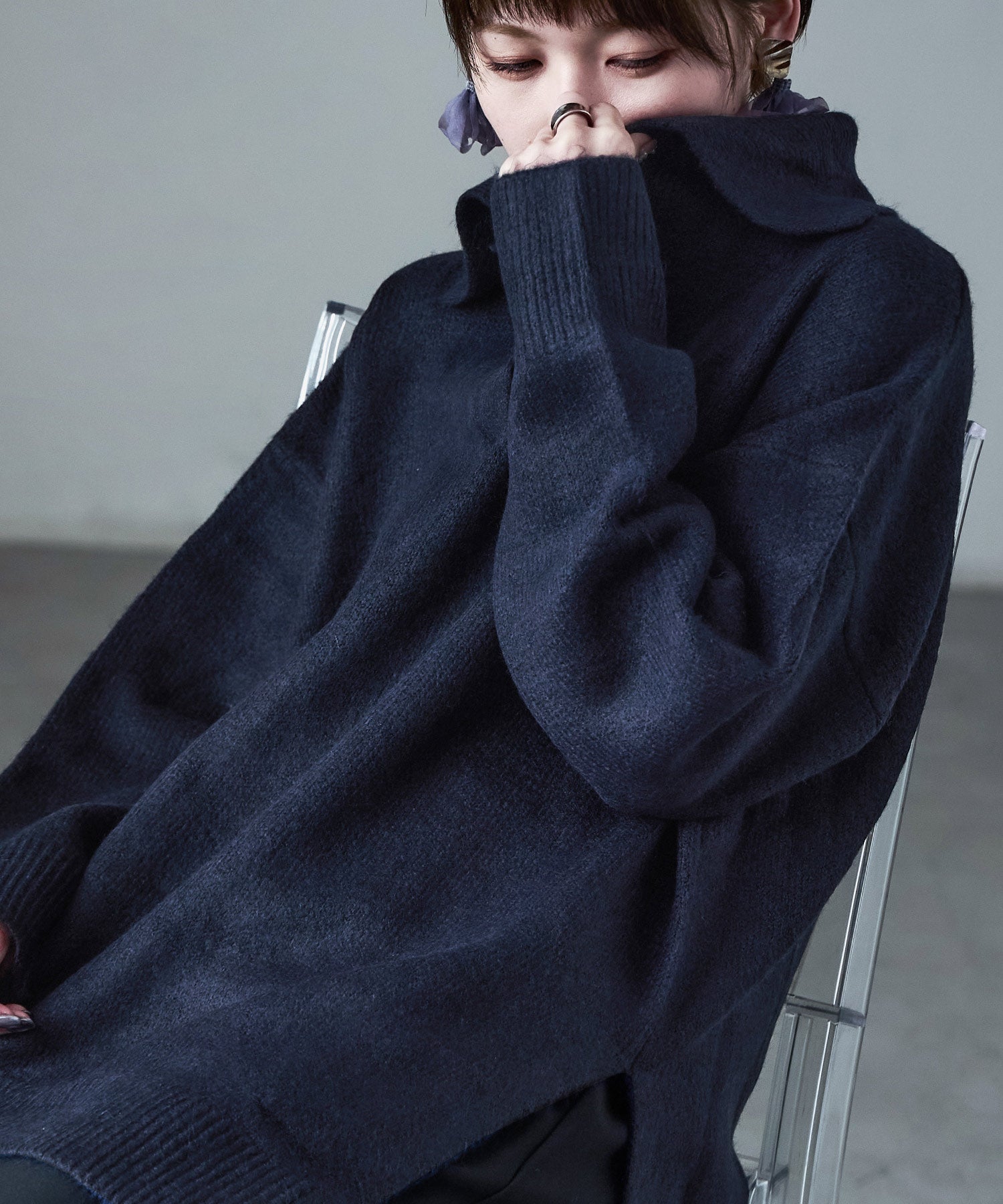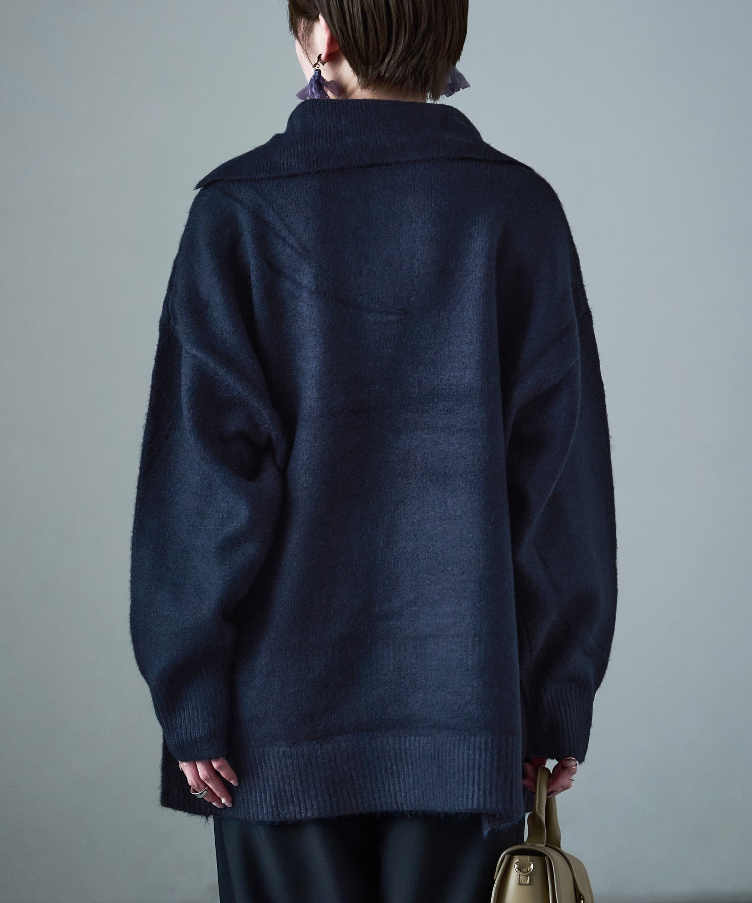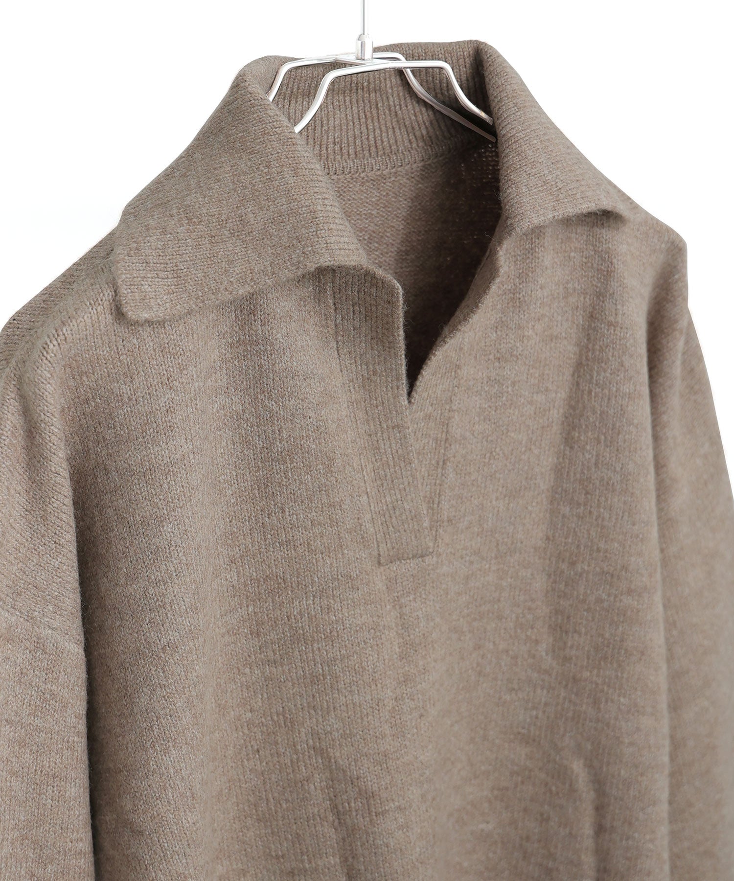Rname 天竺ニット スキッパープルオーバー セーター ニット トップス ゆったり 大きめ スキッパーシャツ サイドスリット 長袖 オーバーサイズ ママコーデ 低身長 高身長 韓国ファッション 無地 ロング丈