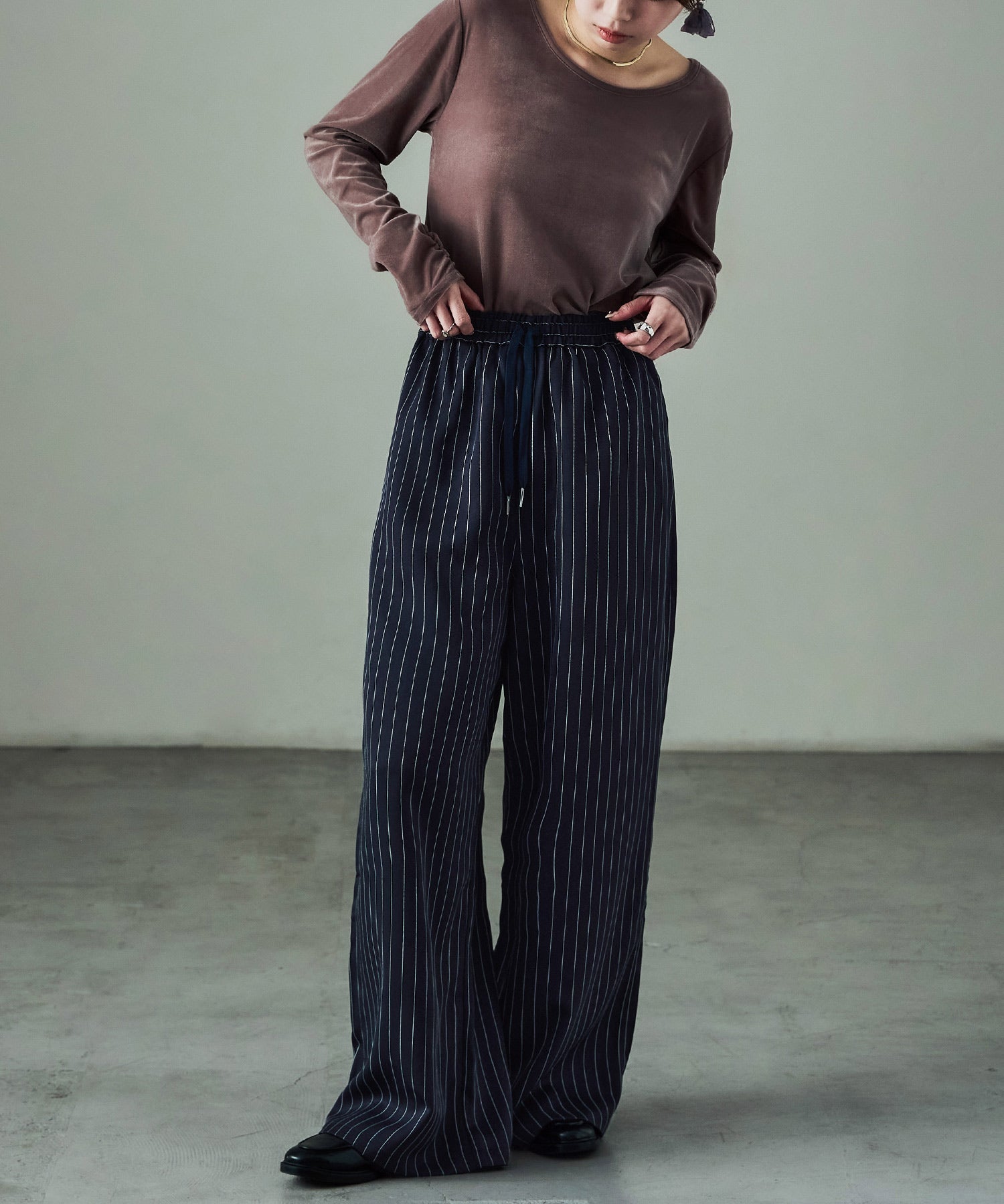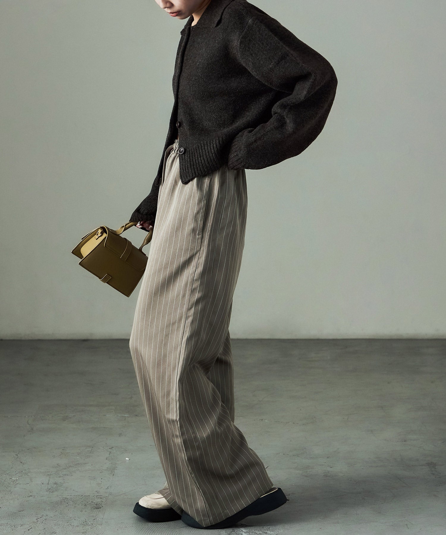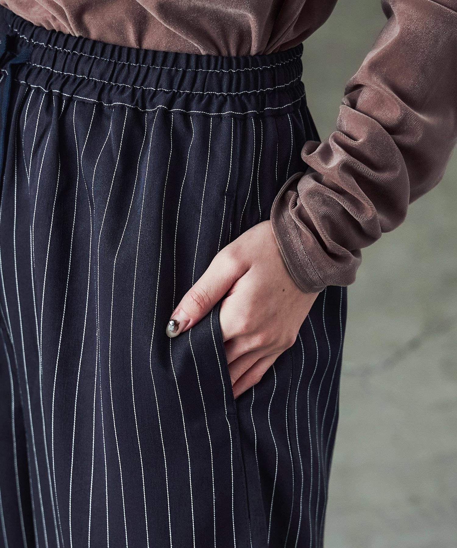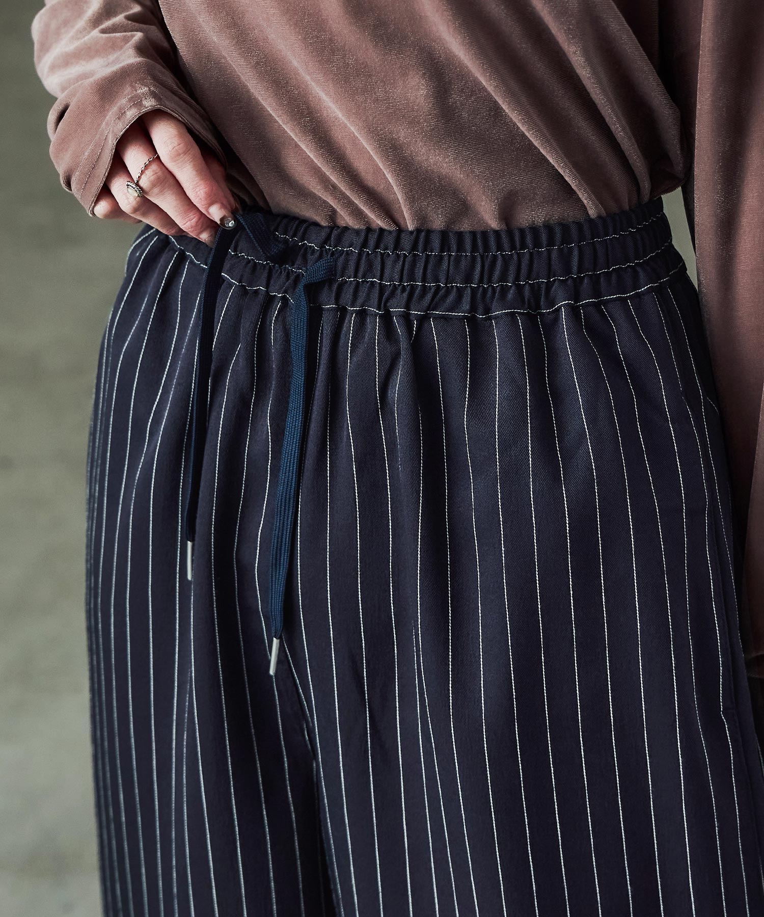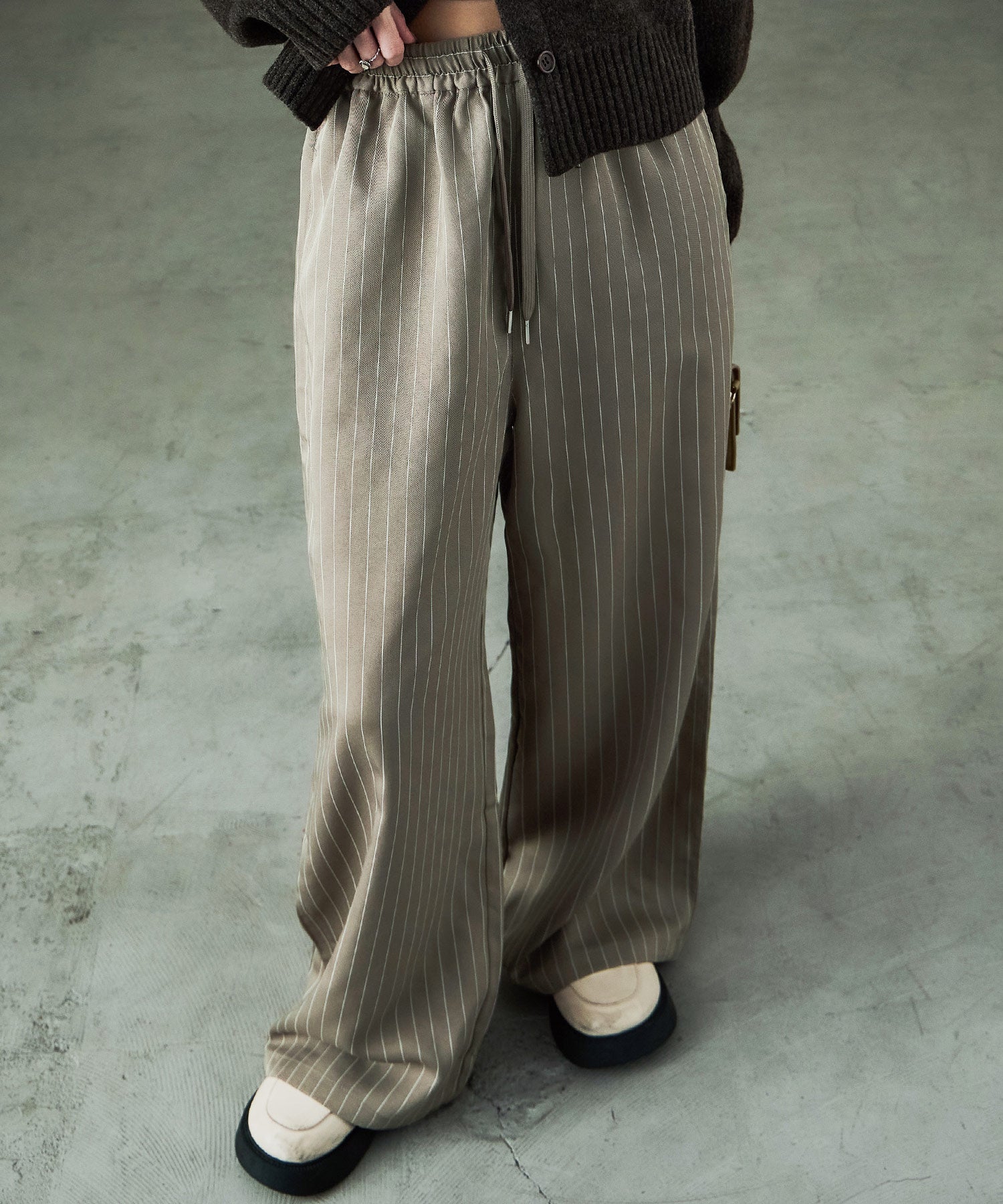 細めのストライプ柄がマニッシュな雰囲気をプラスしてくれるから、大人なコーデに。