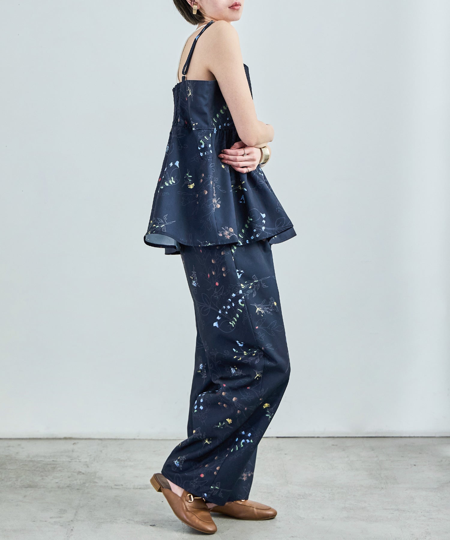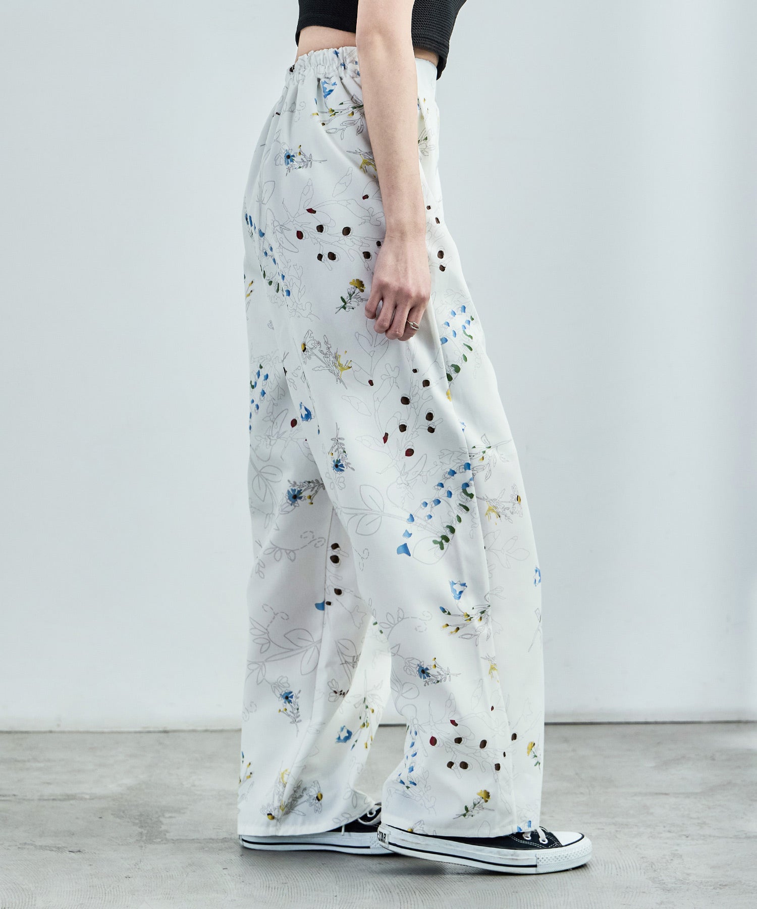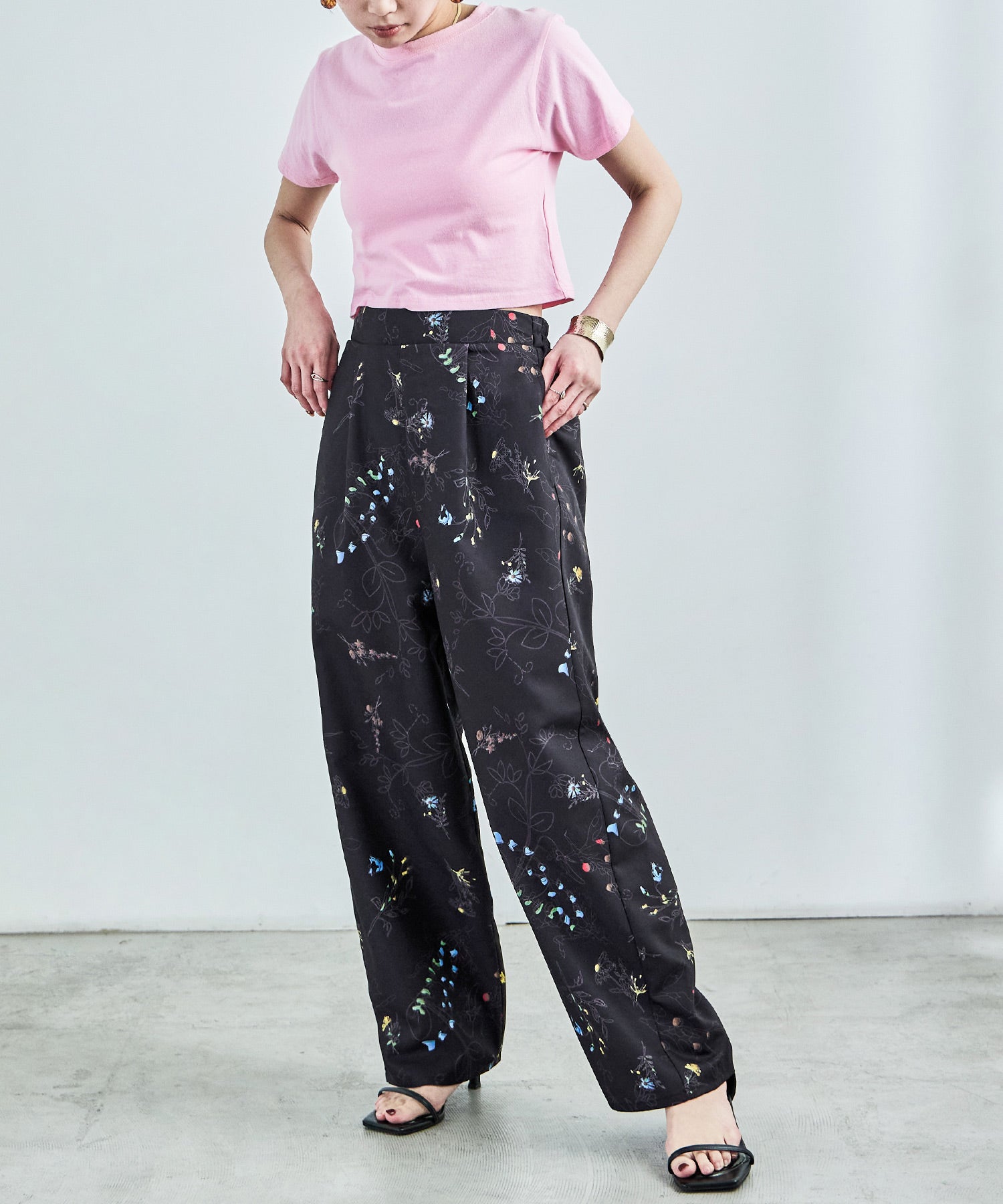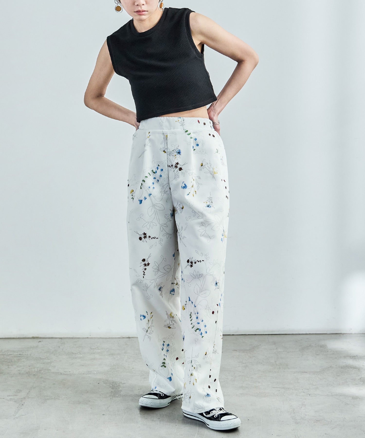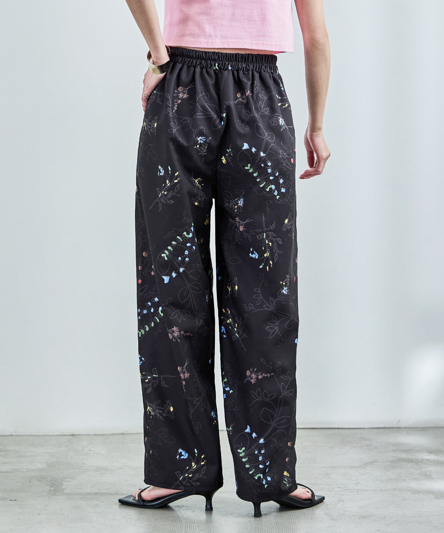 シンプルなワイドパンツもボタニカル柄でガーリー。