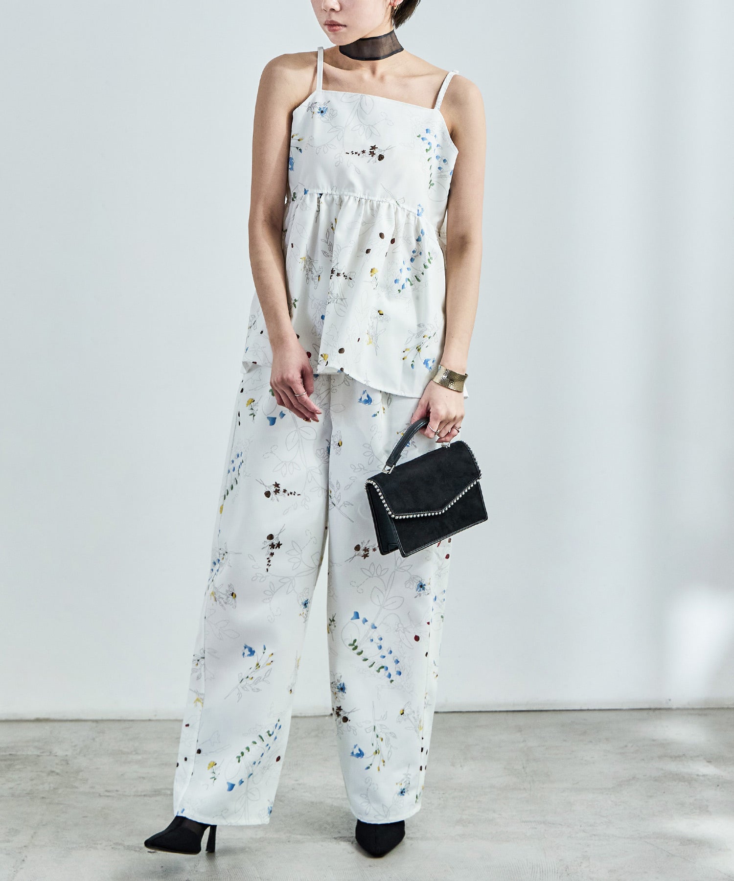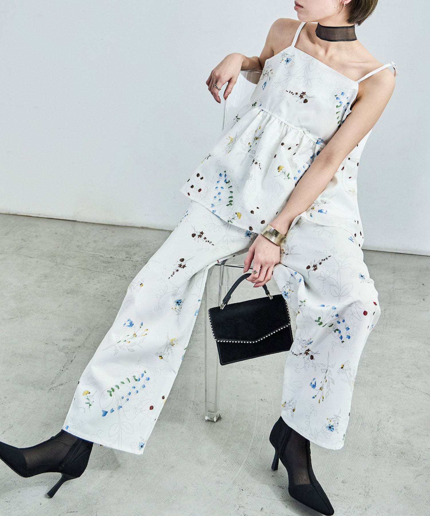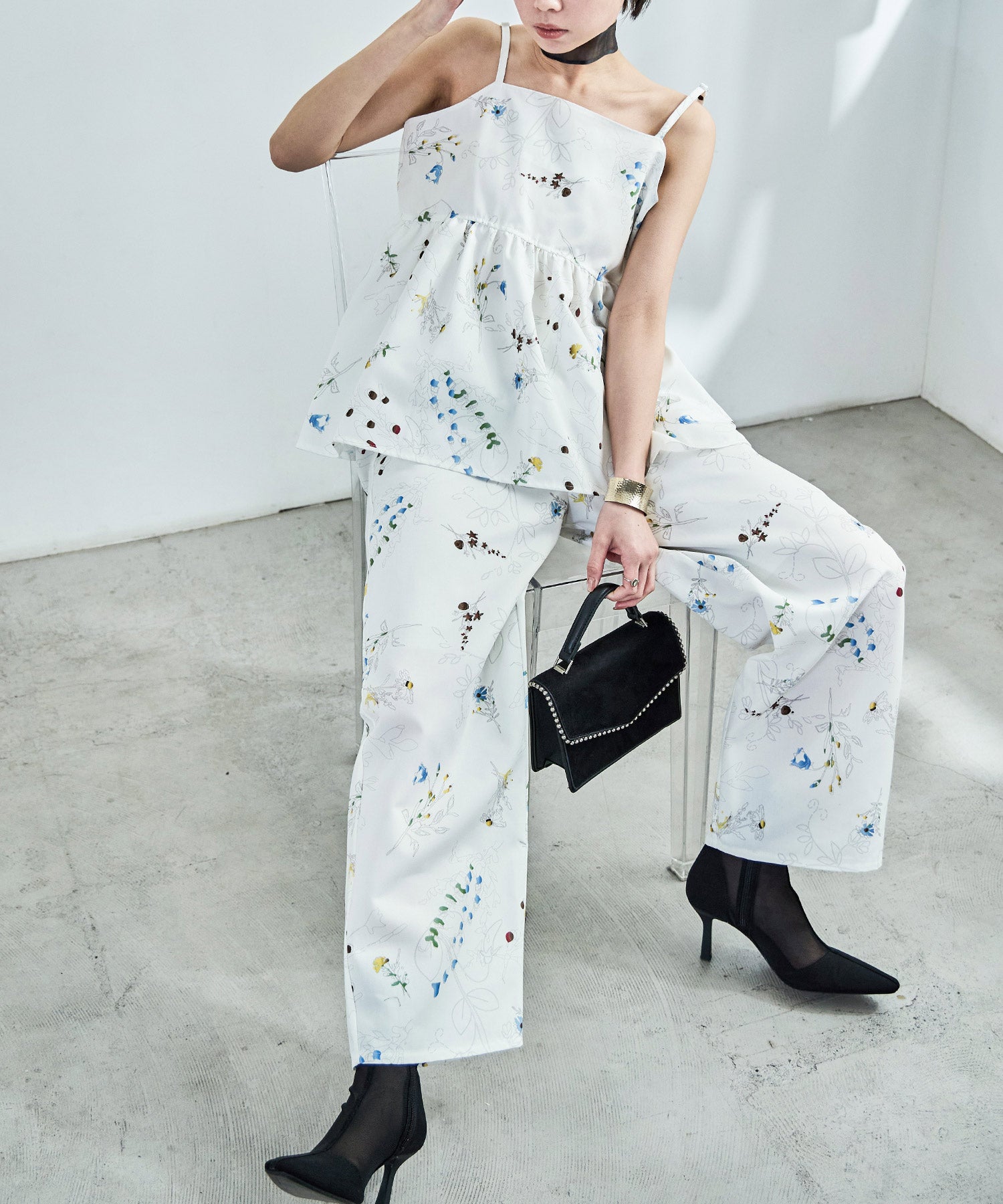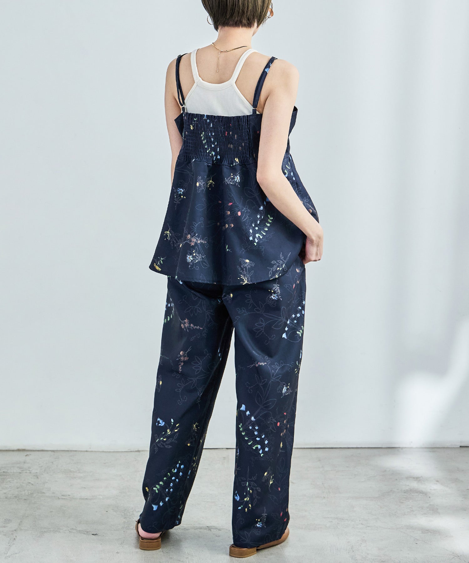 シンプルなワイドパンツもボタニカル柄でガーリー。