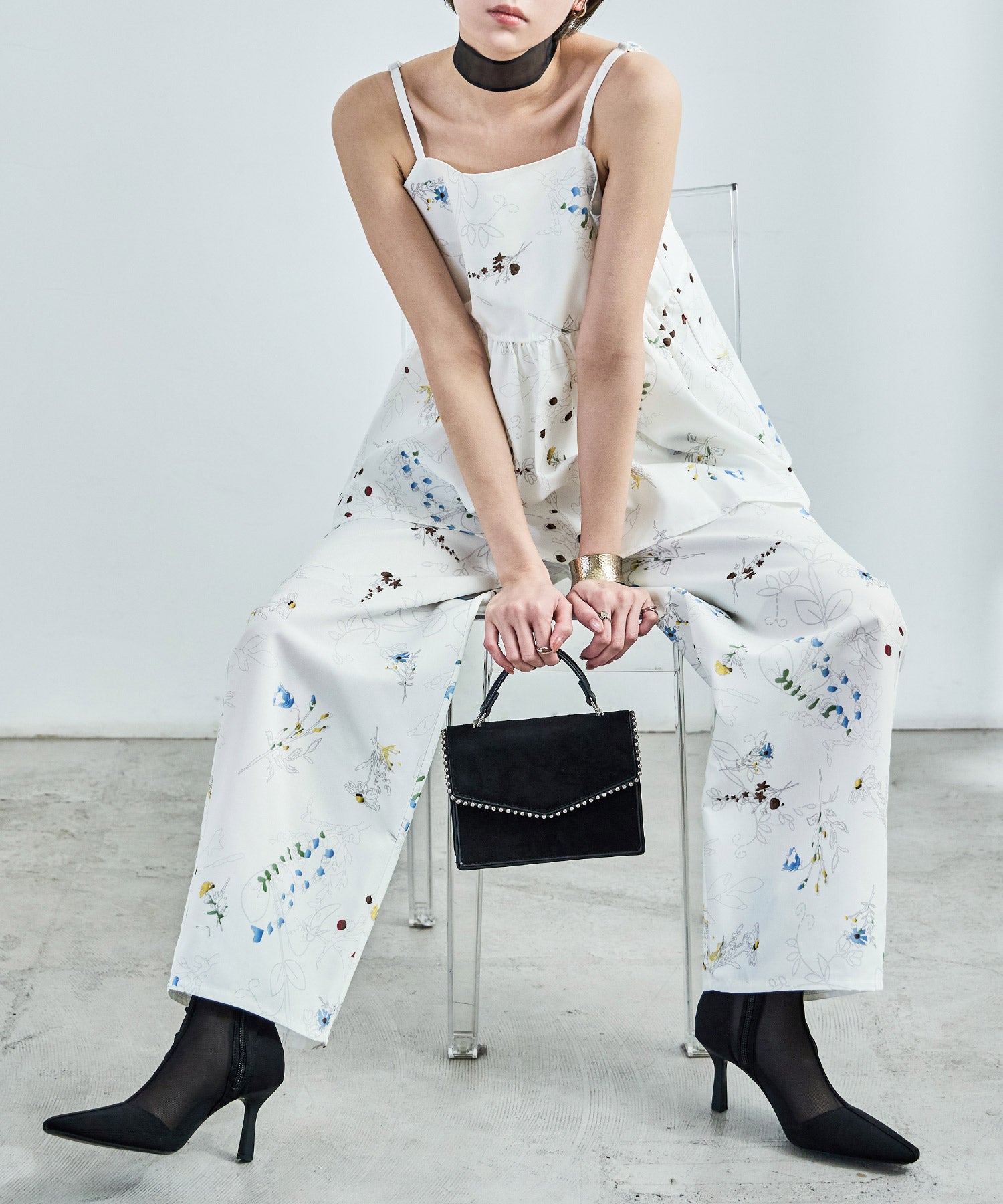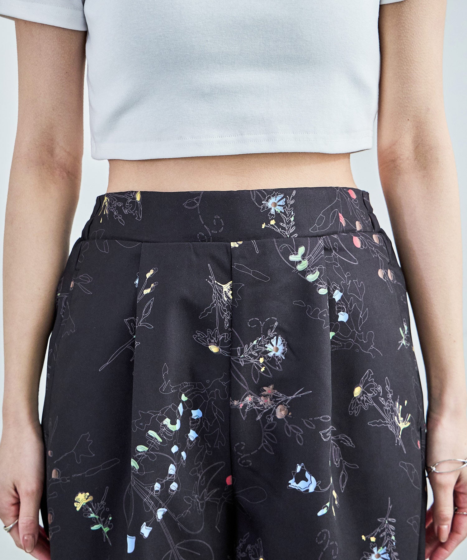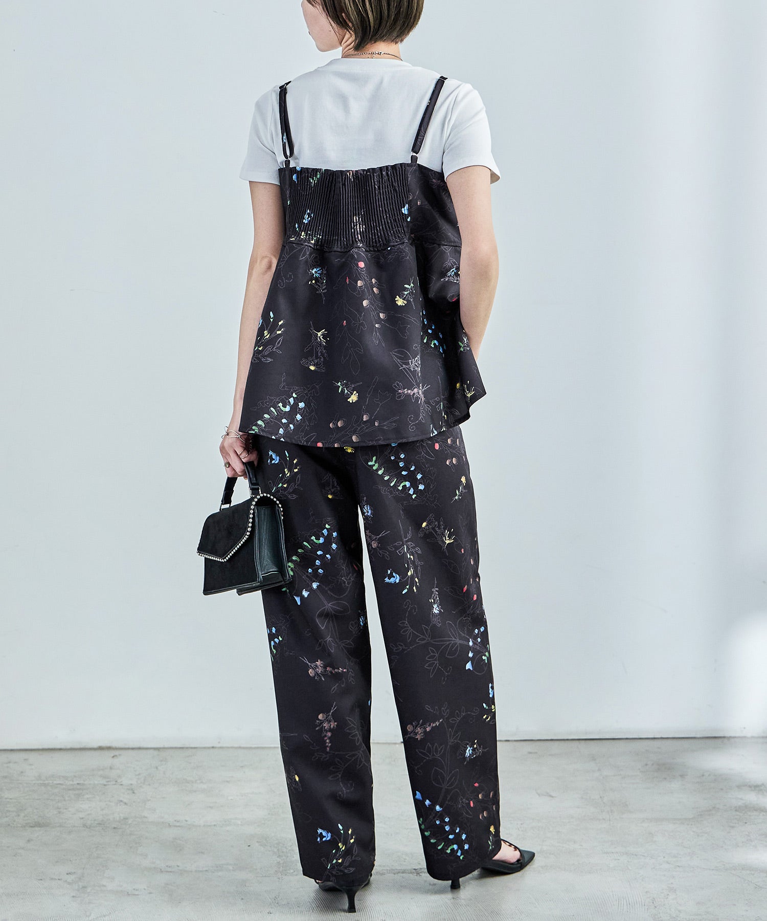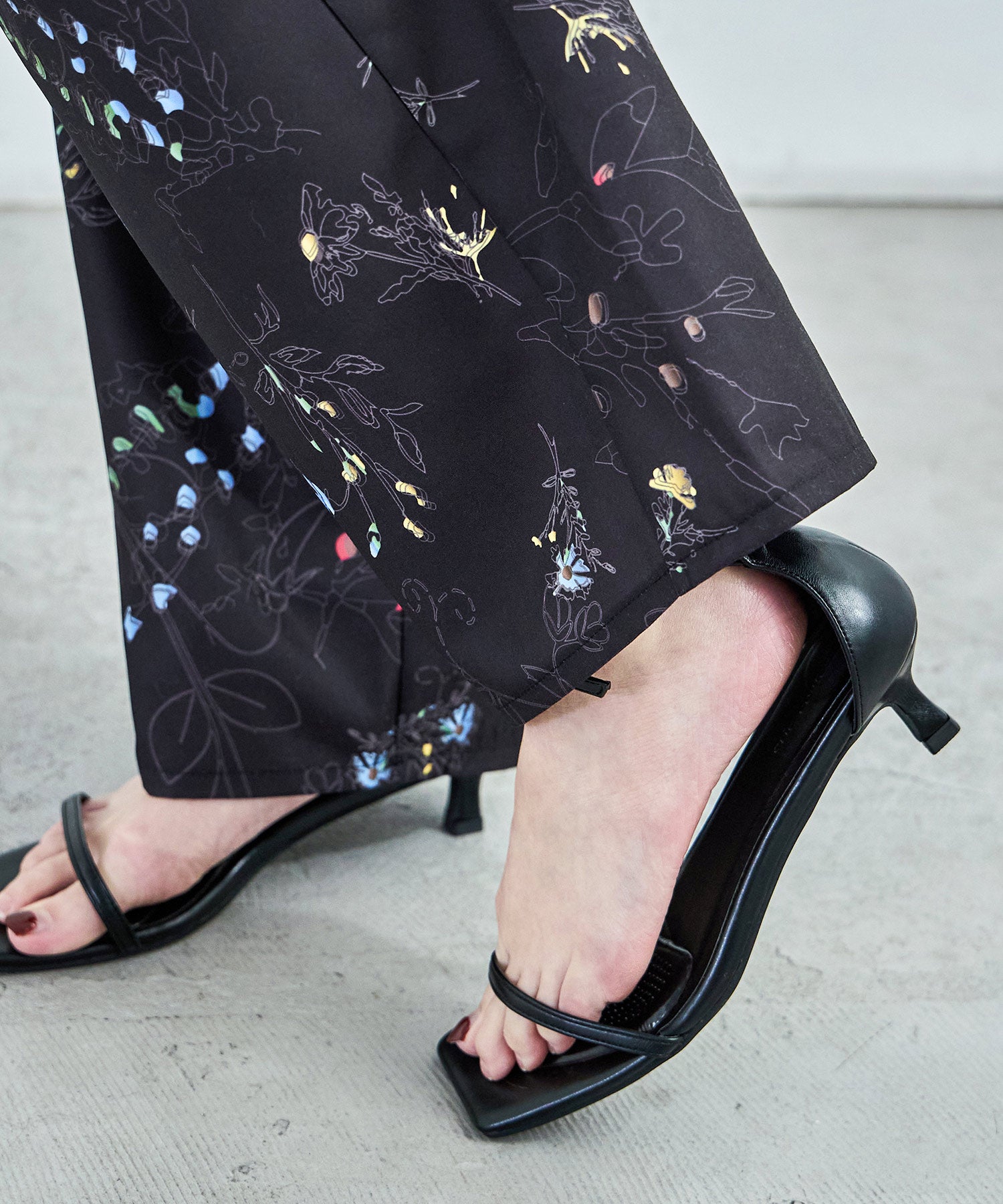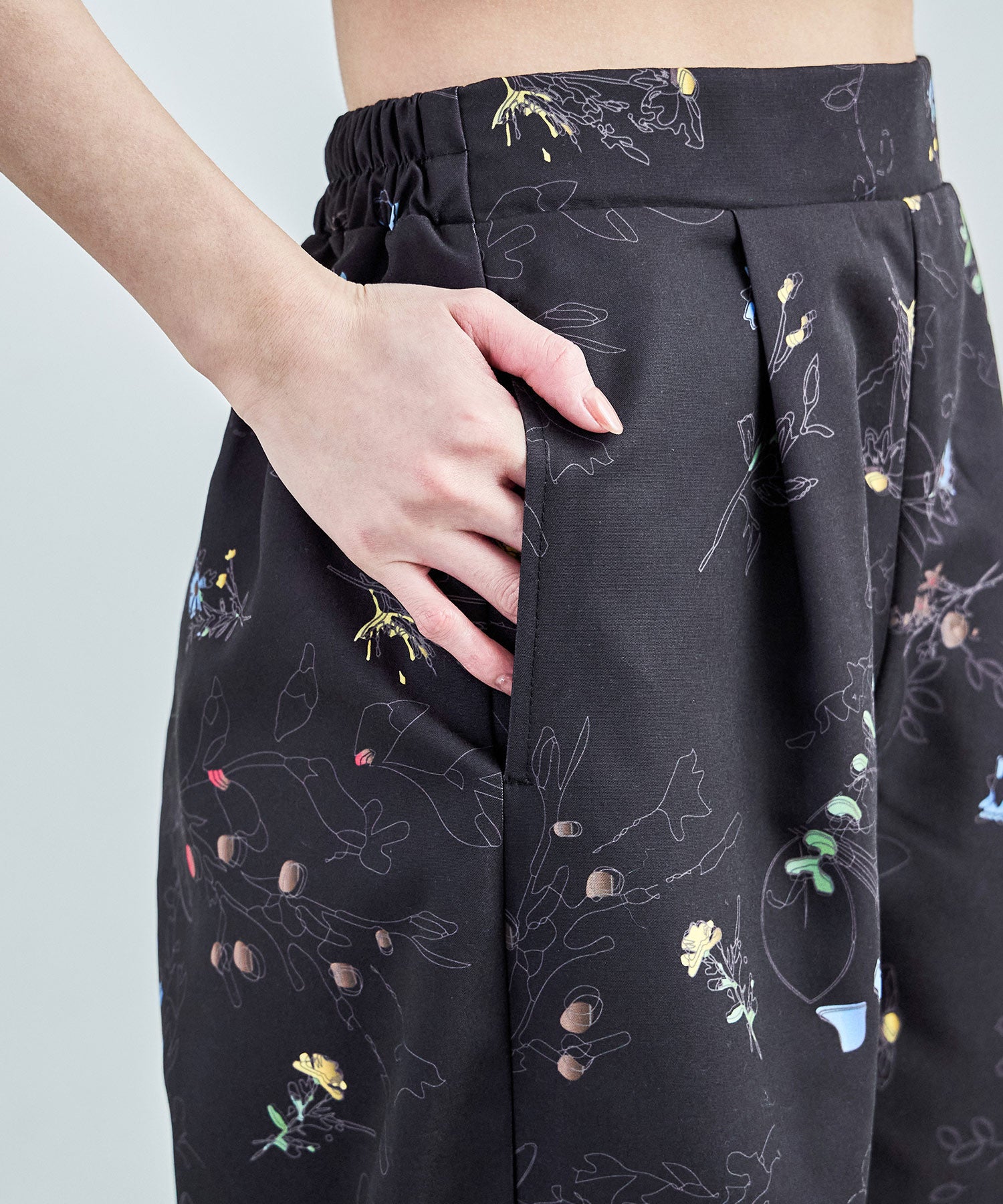 シンプルなワイドパンツもボタニカル柄でガーリー。