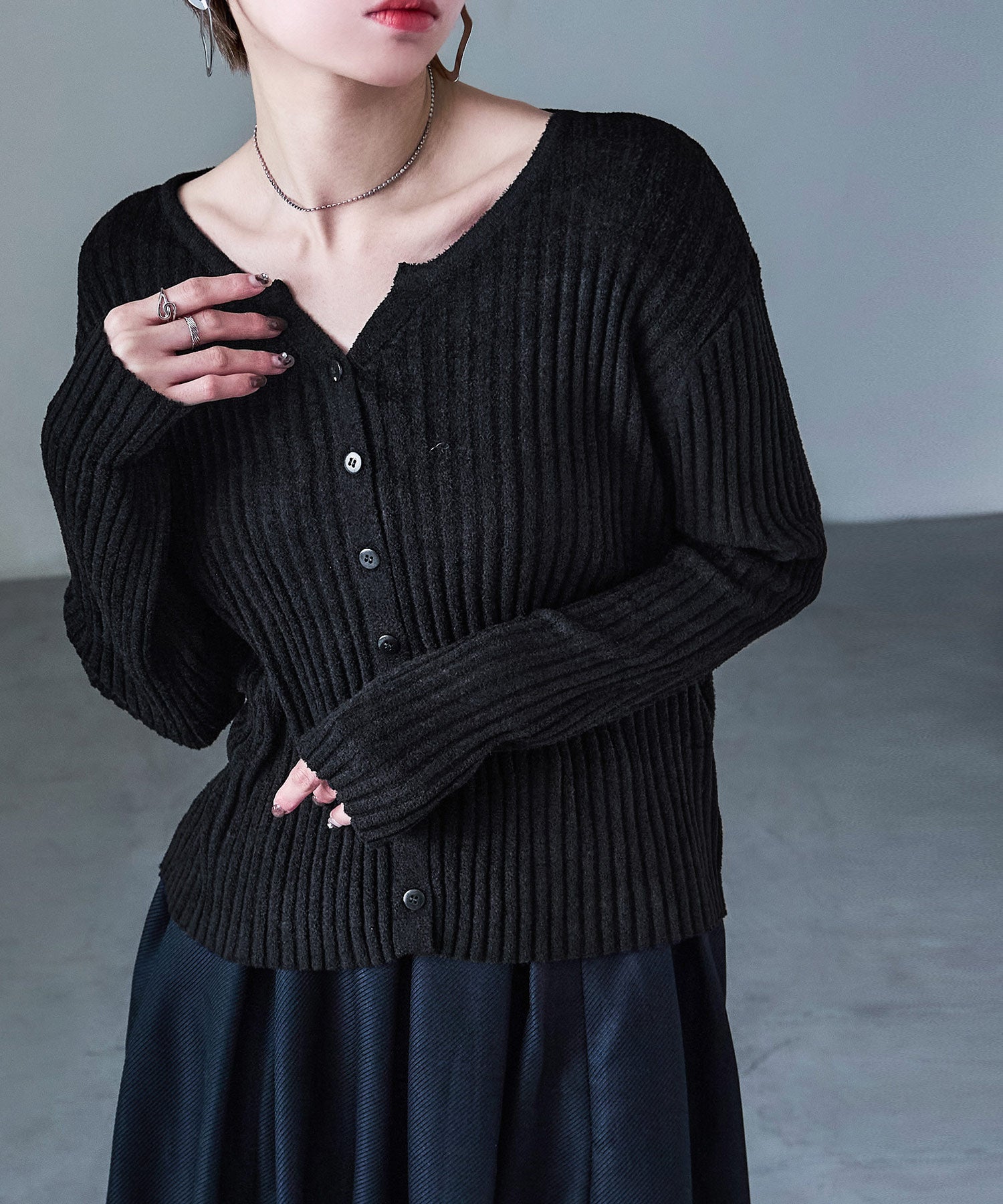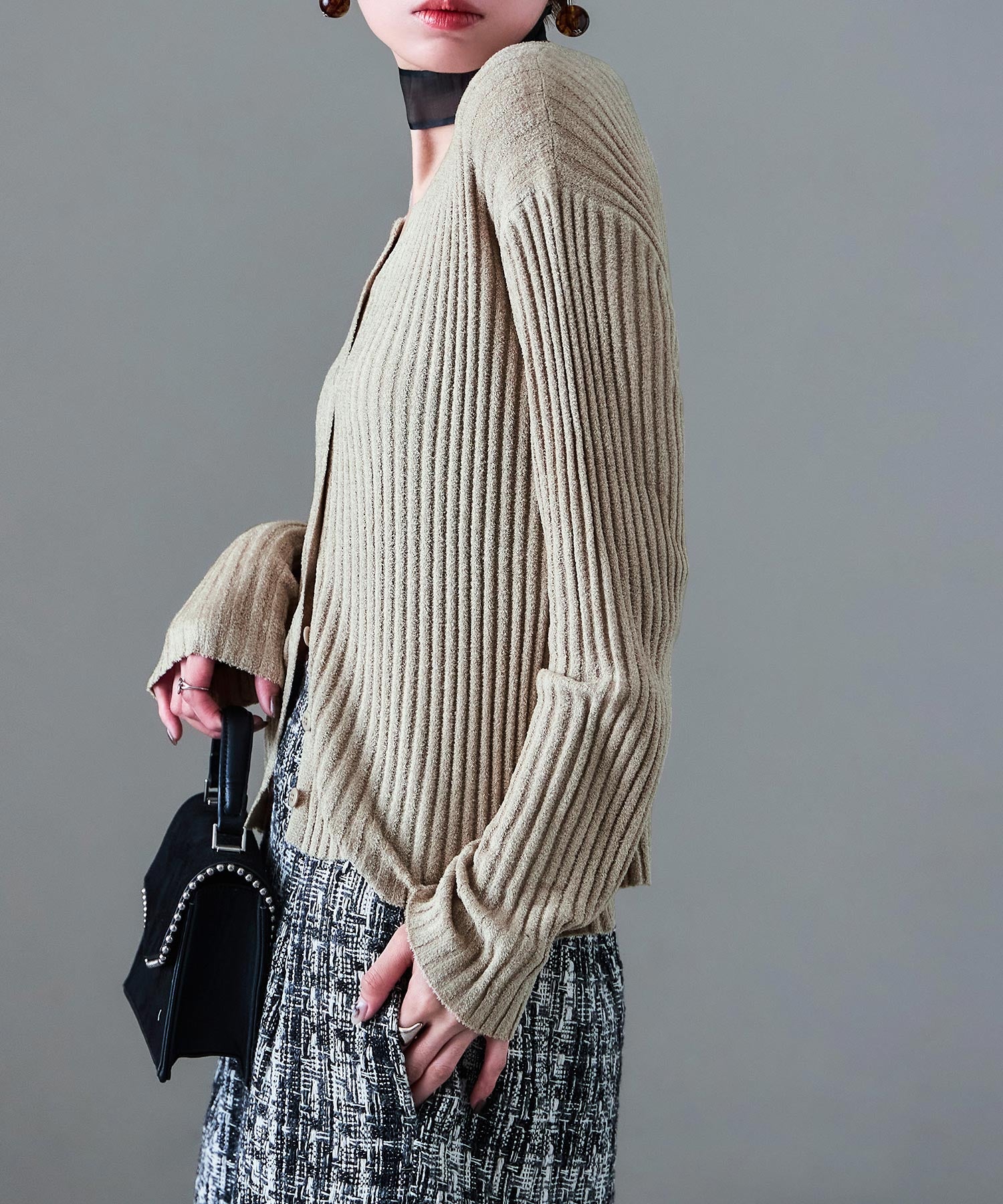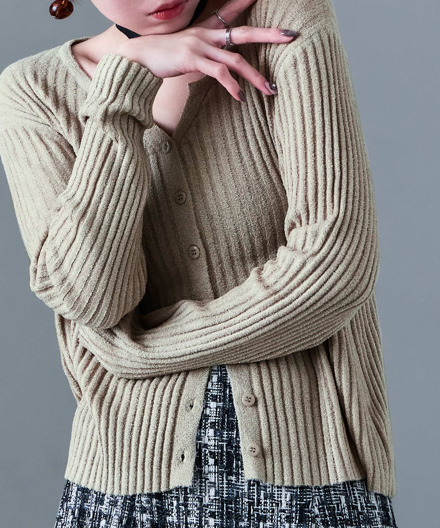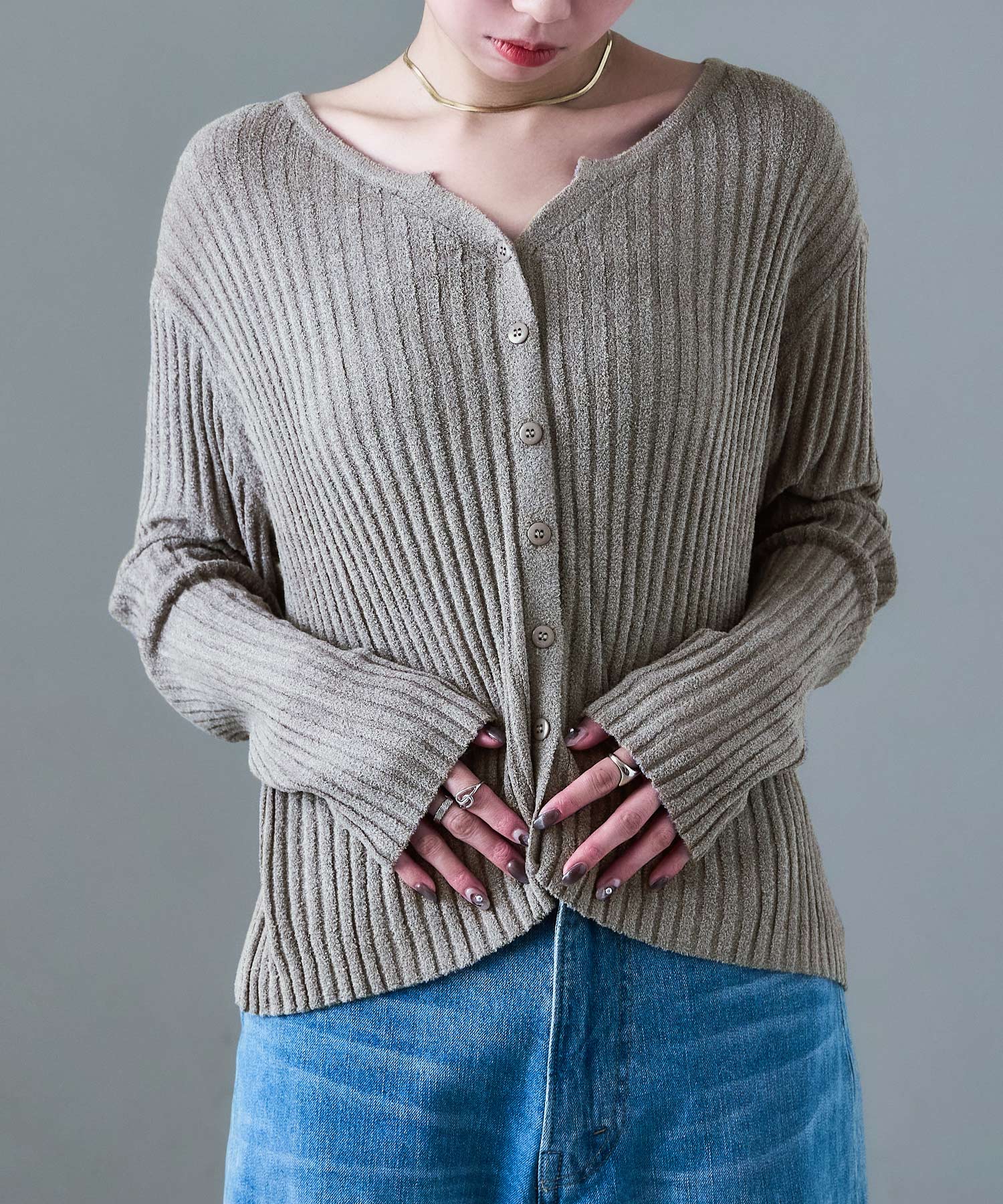 Rname ベロアモール リブニット キーネックカーディガン カーディガン アウター トップス 長袖 ニットカーデ ママコーデ 韓国ファッション 低身長 高身長 シンプル セーター プルオーバー