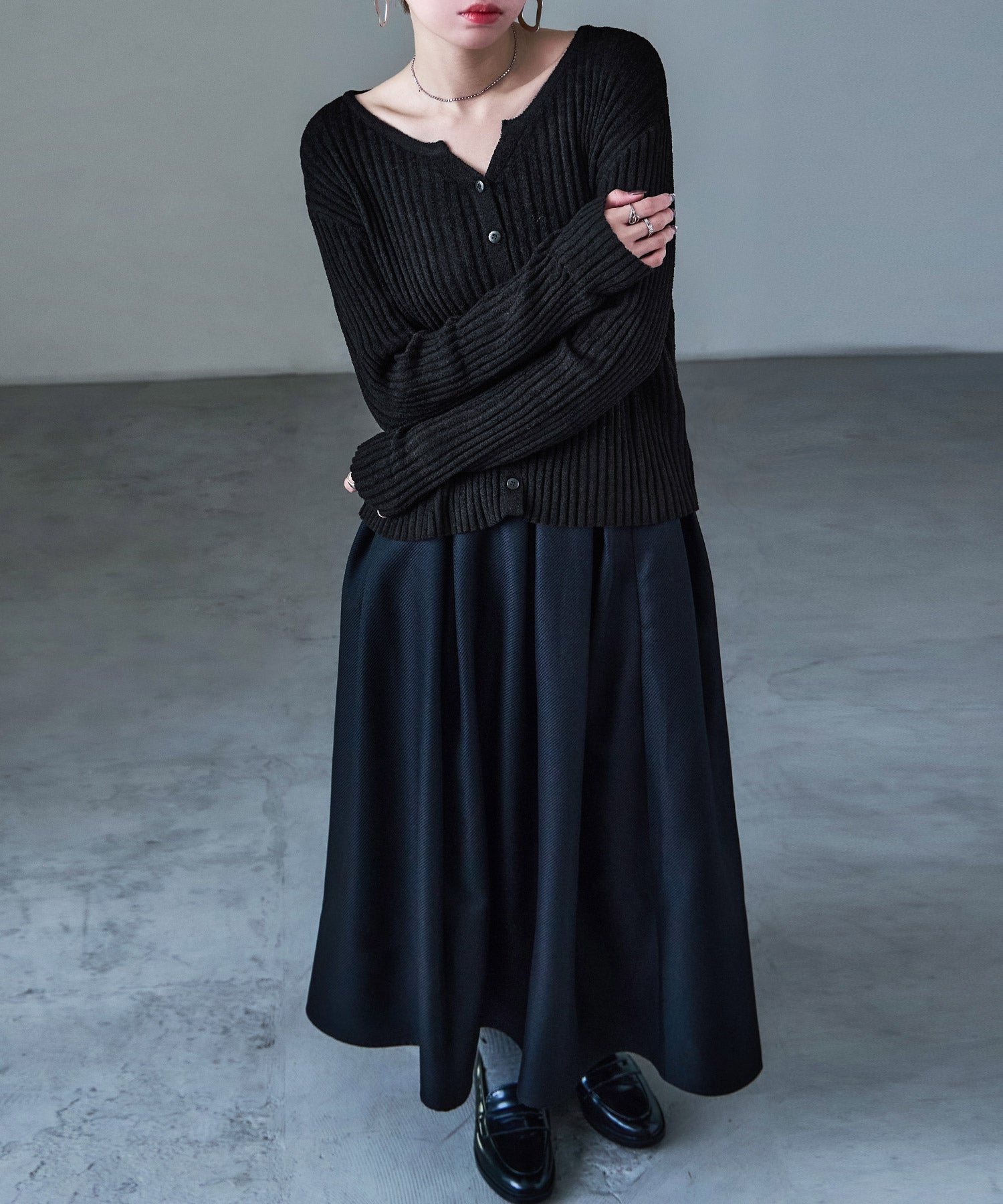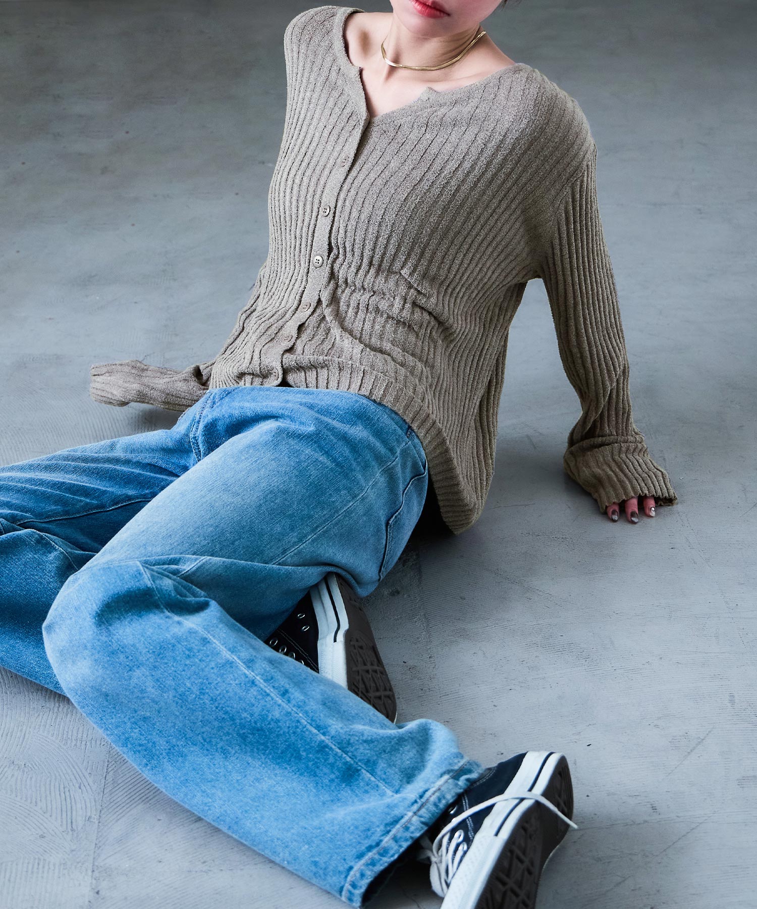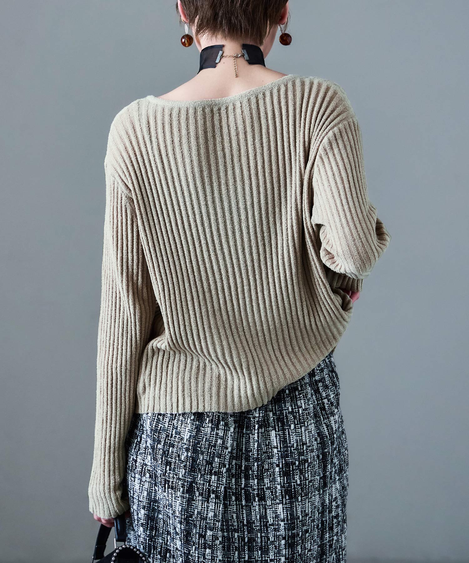 程よく肌見せしてくれるキーネック、モードな雰囲気のニュアンスカラーでさらに洒落る。