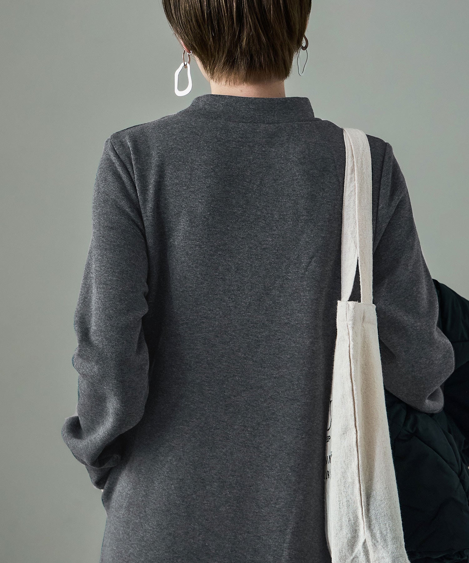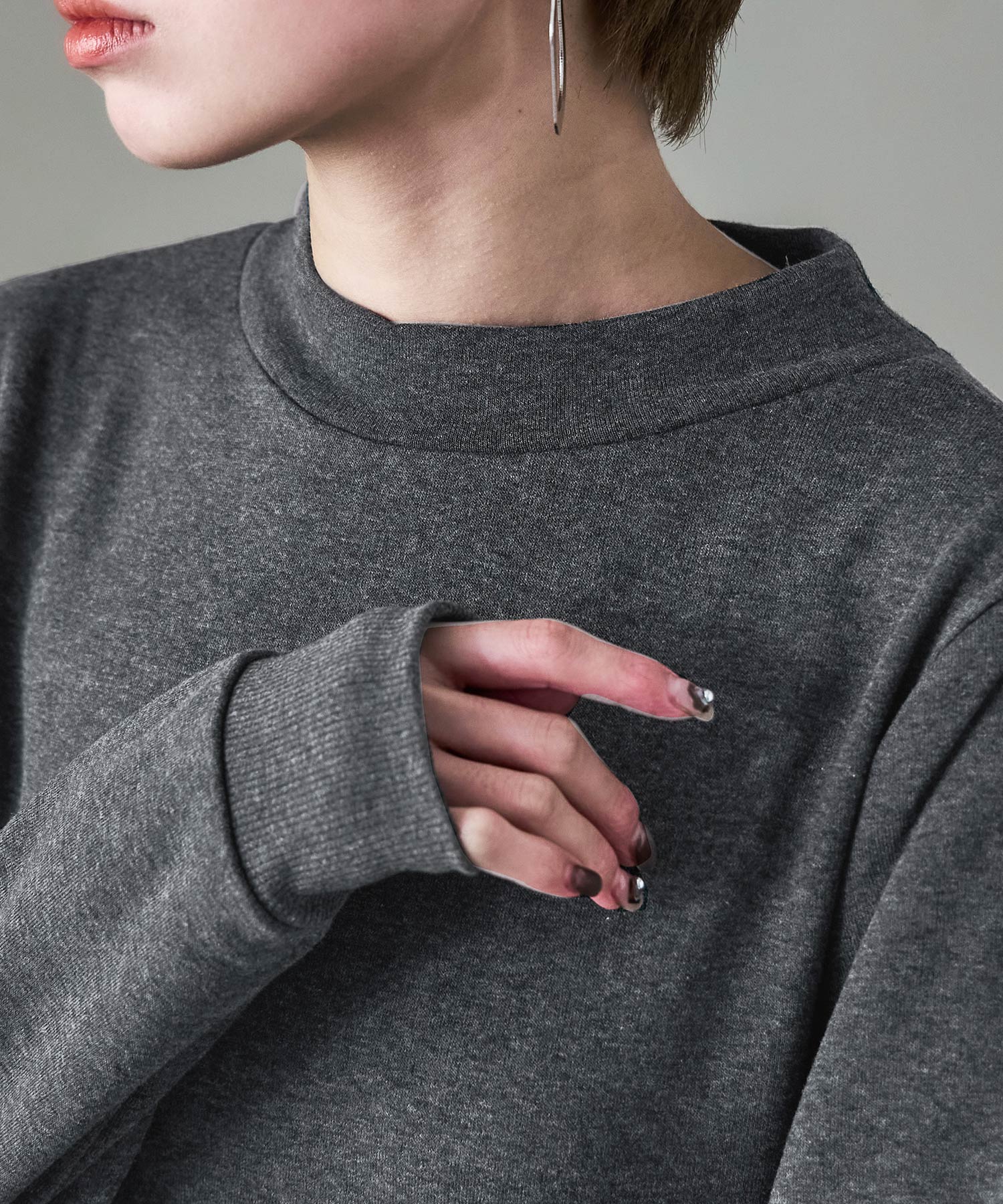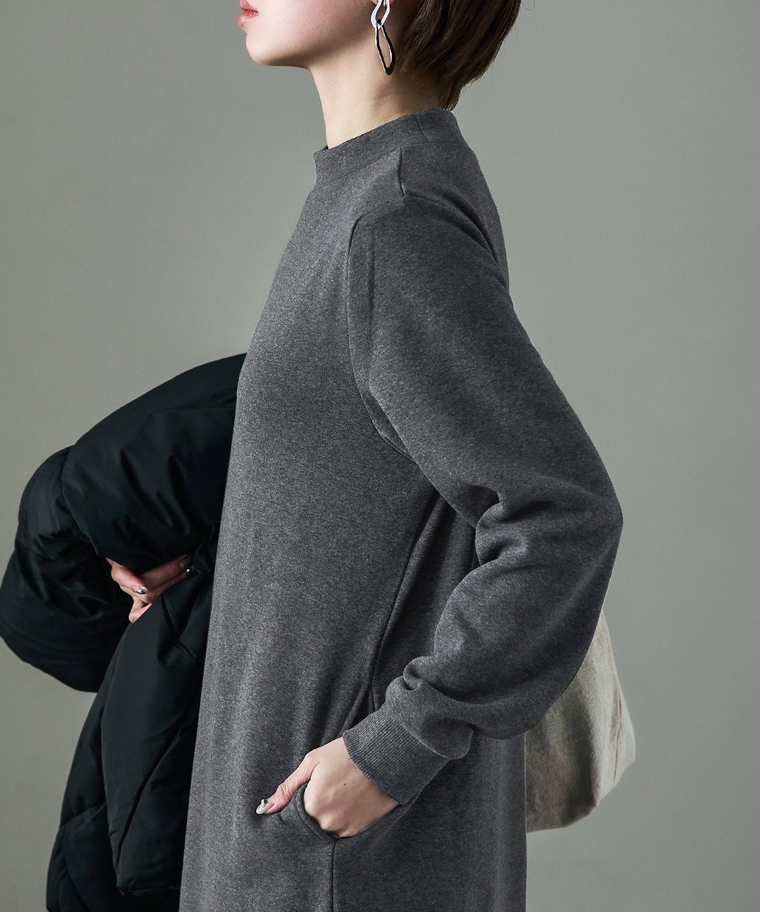 モックネックや袖口のリブがパジャマっぽくなく、ちょっとそこまでにもピッタリ。