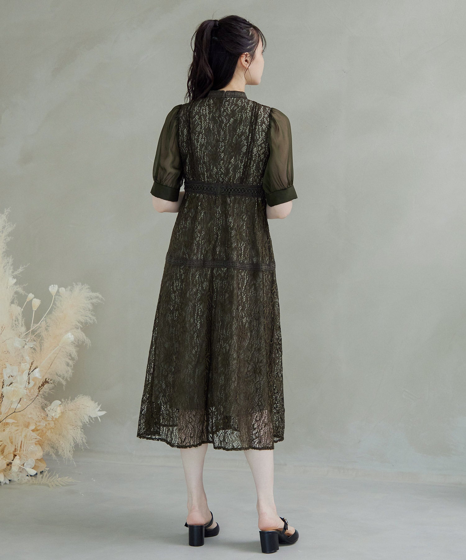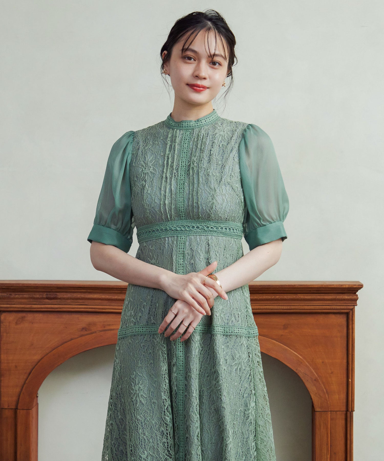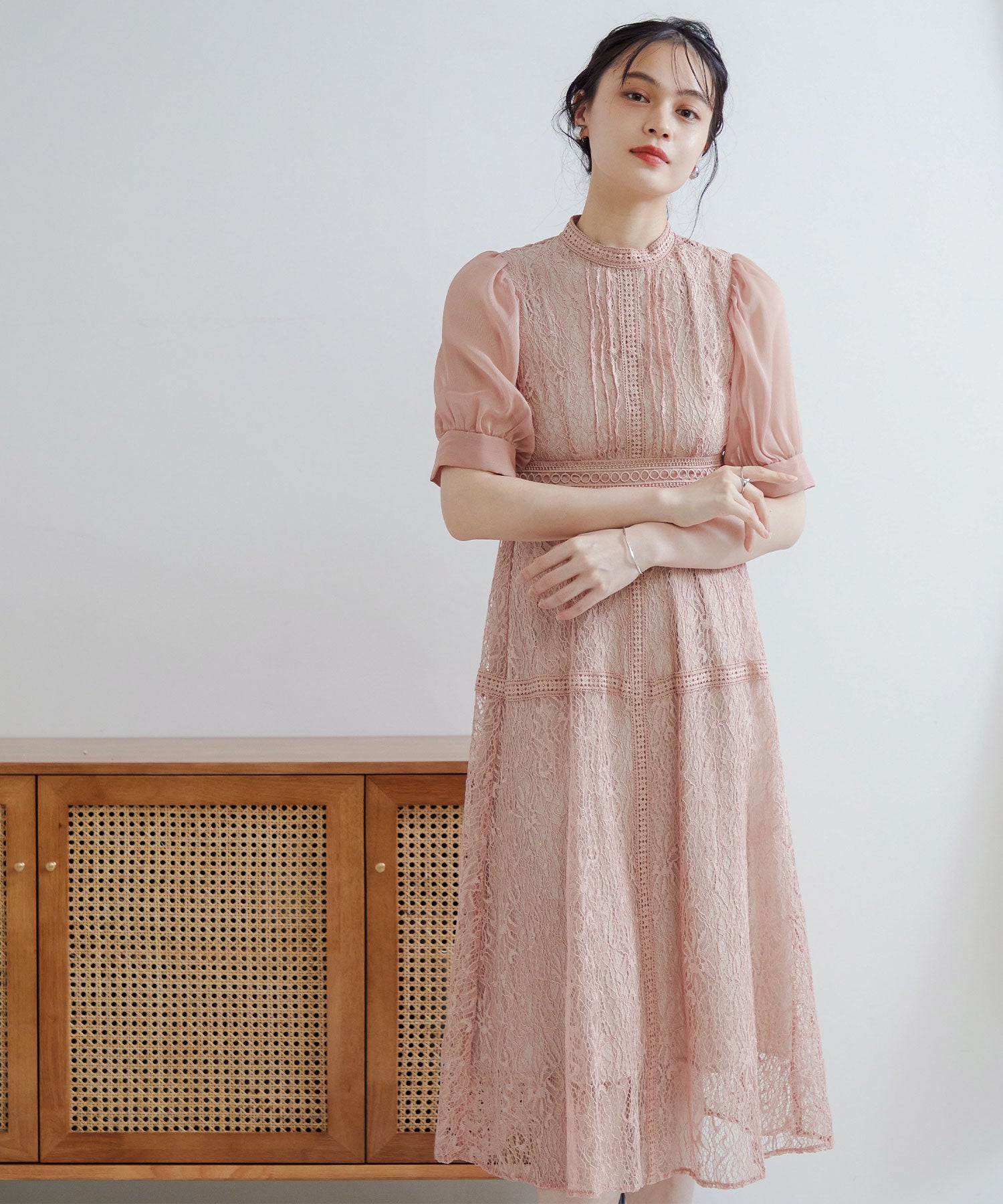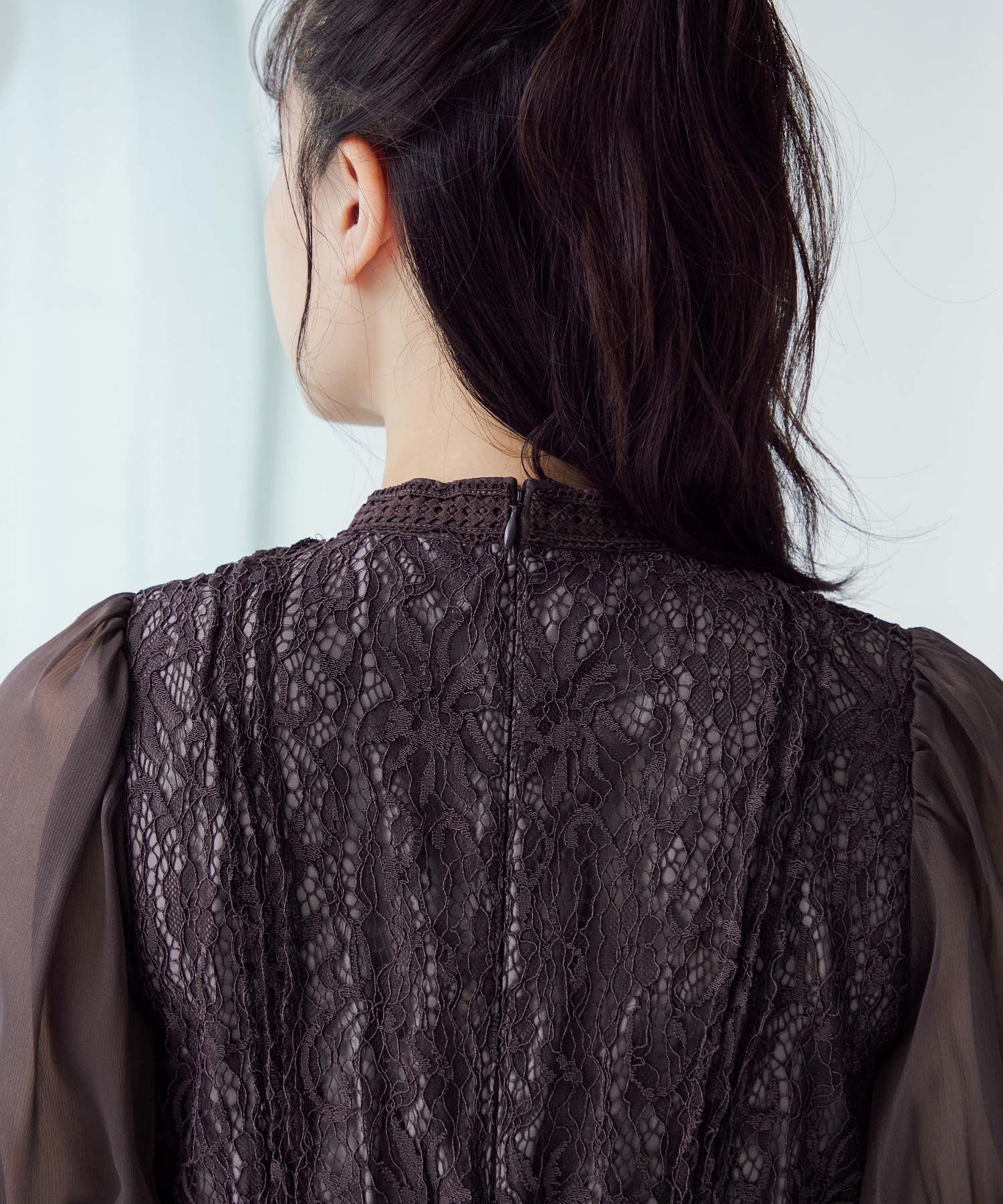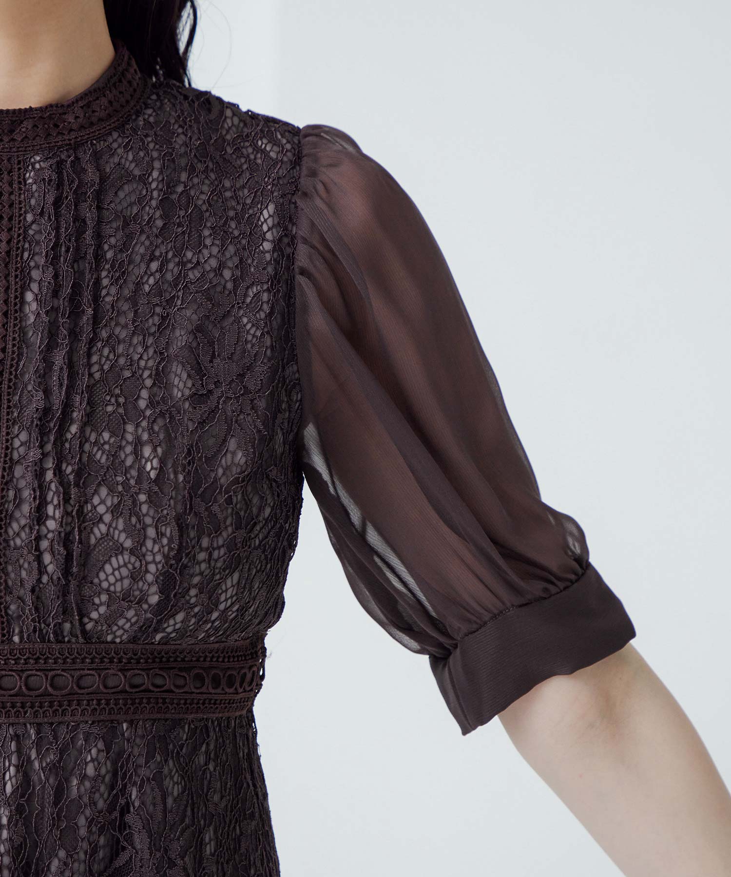 繊細な総レースにシアー素材のスリーブを組み合わせたワンピース。