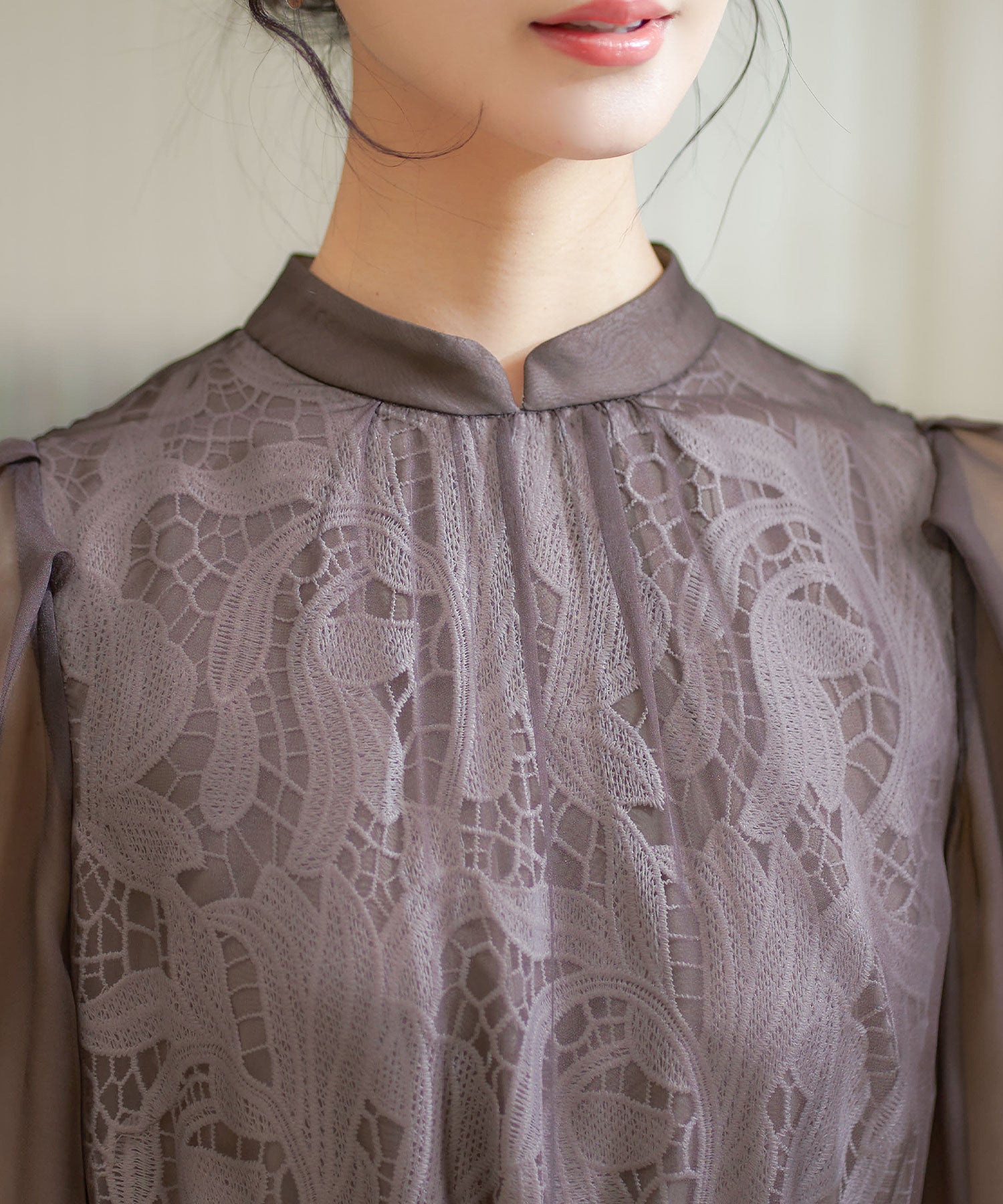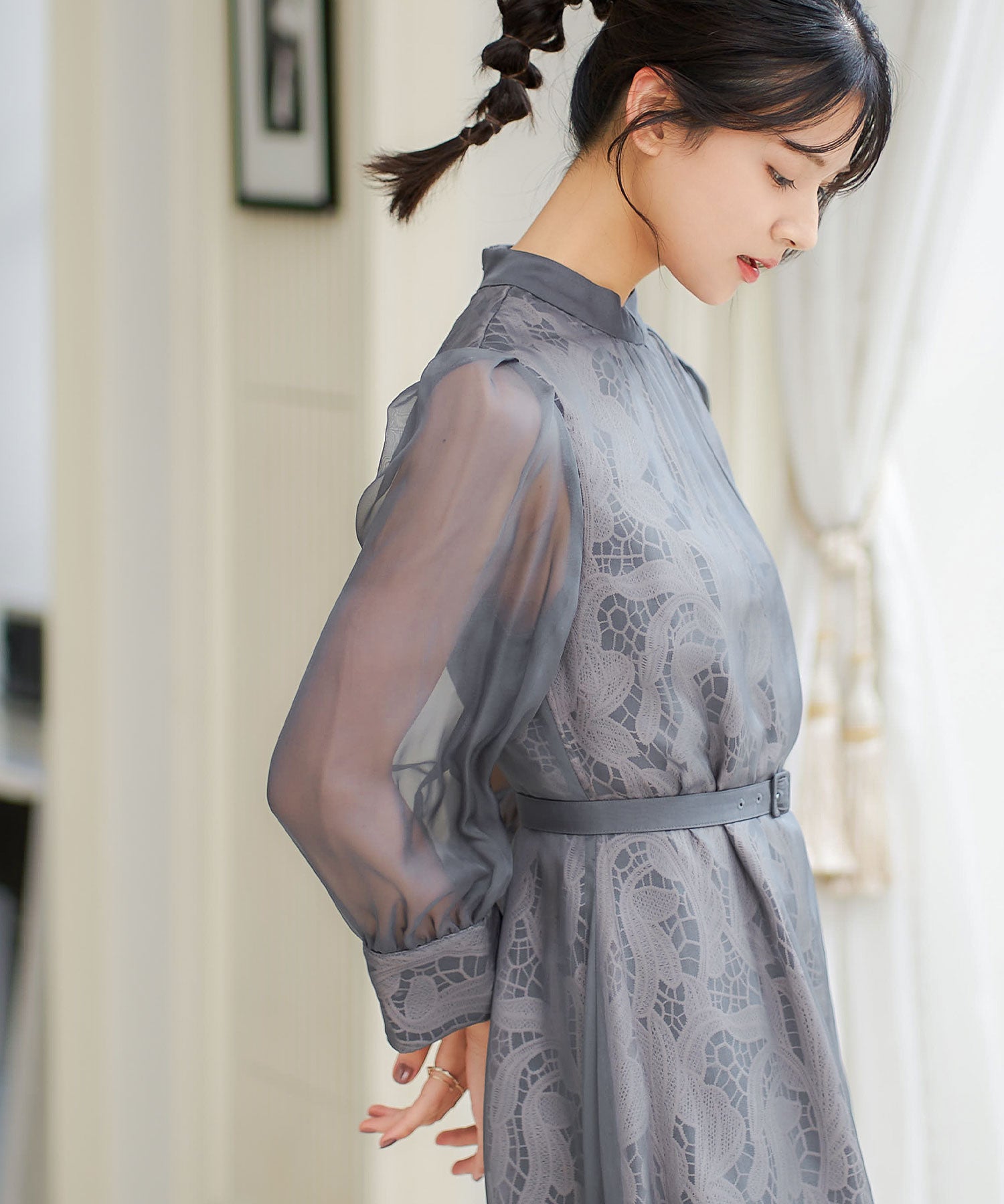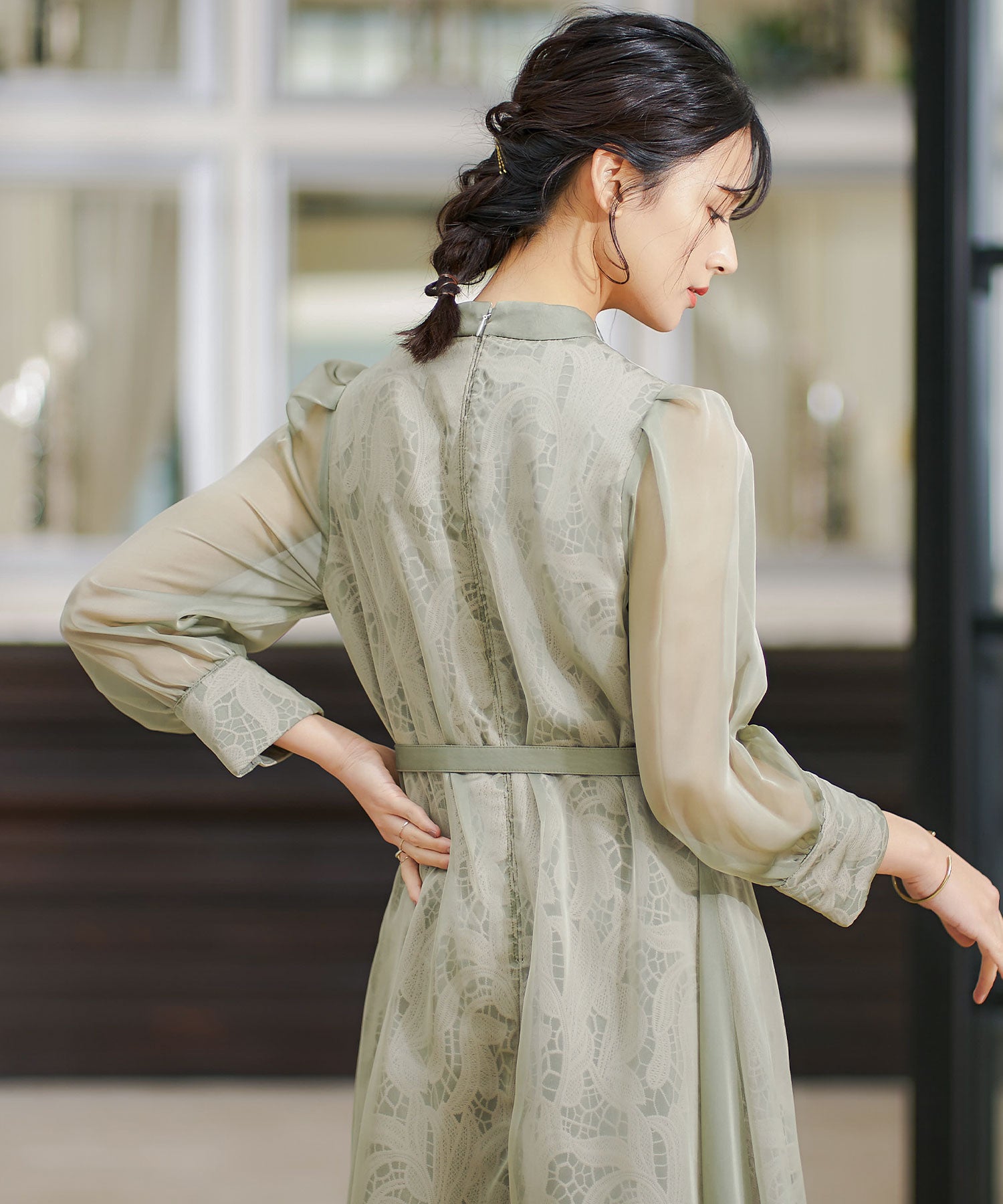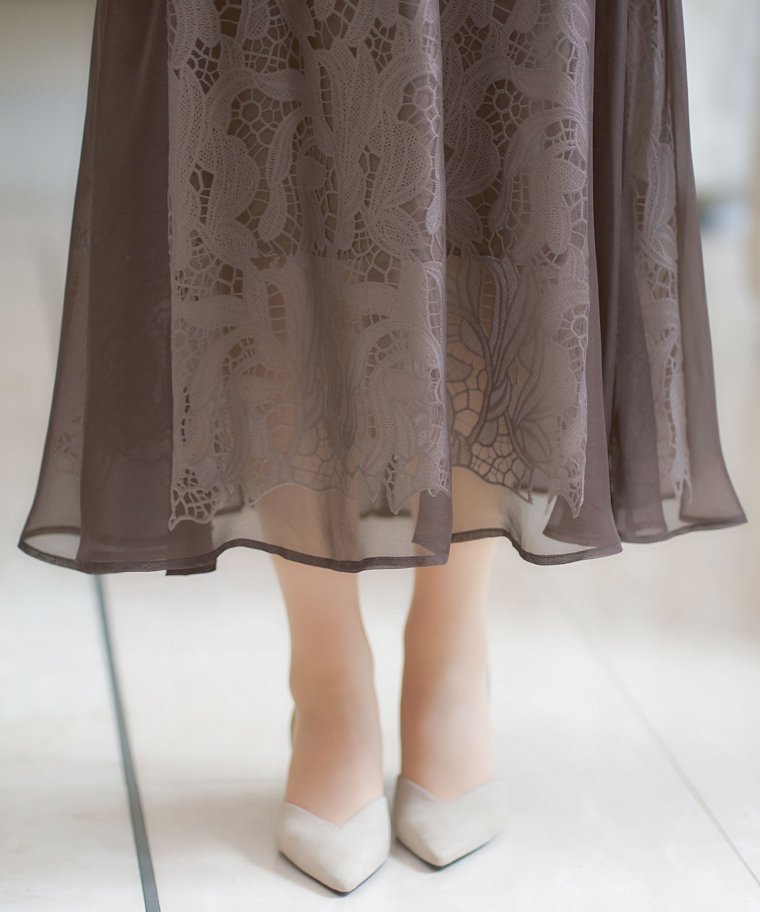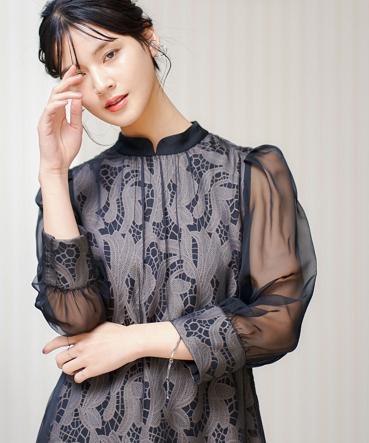 大きめな柄のレースにオーガンジー素材を重ねた魅力的なドレス。